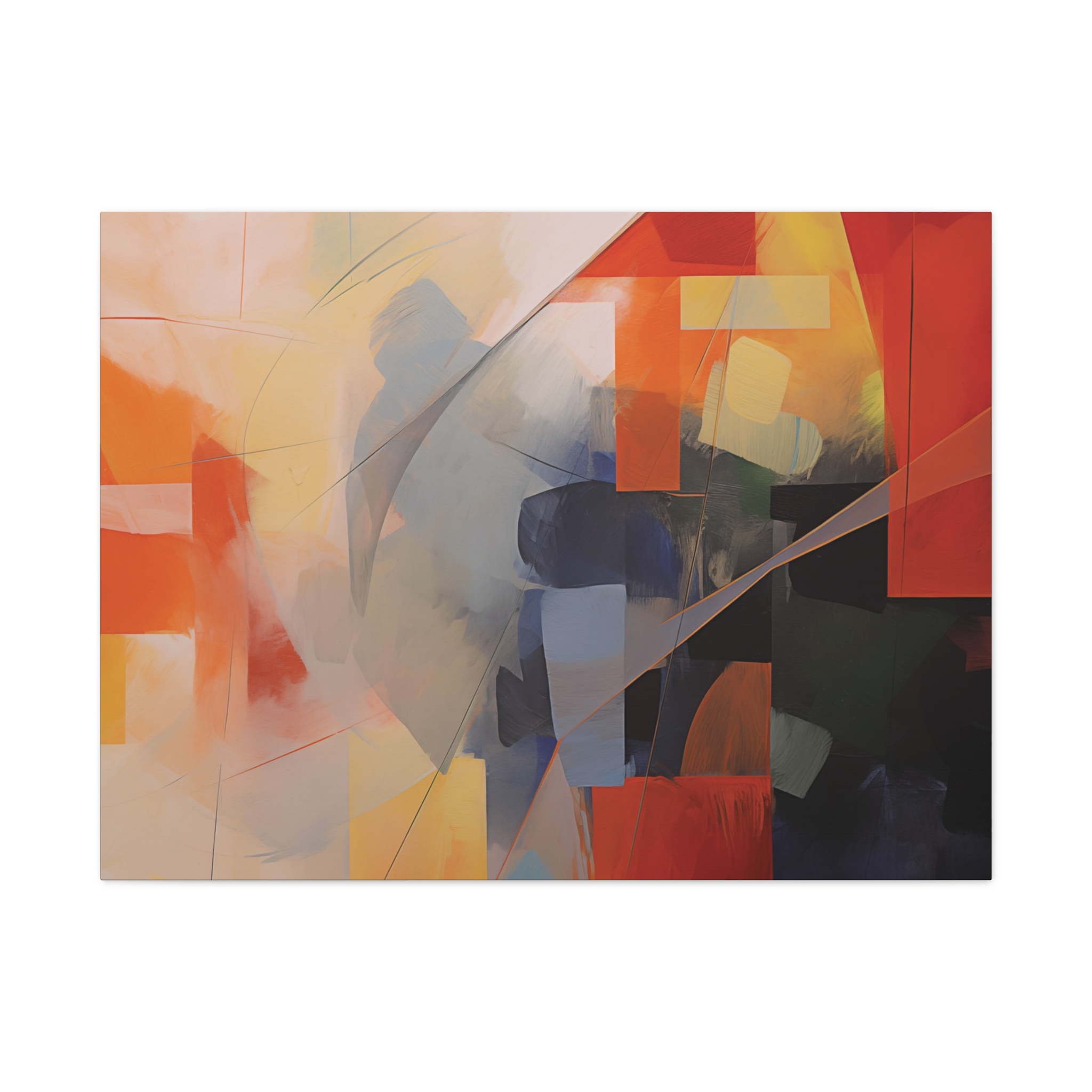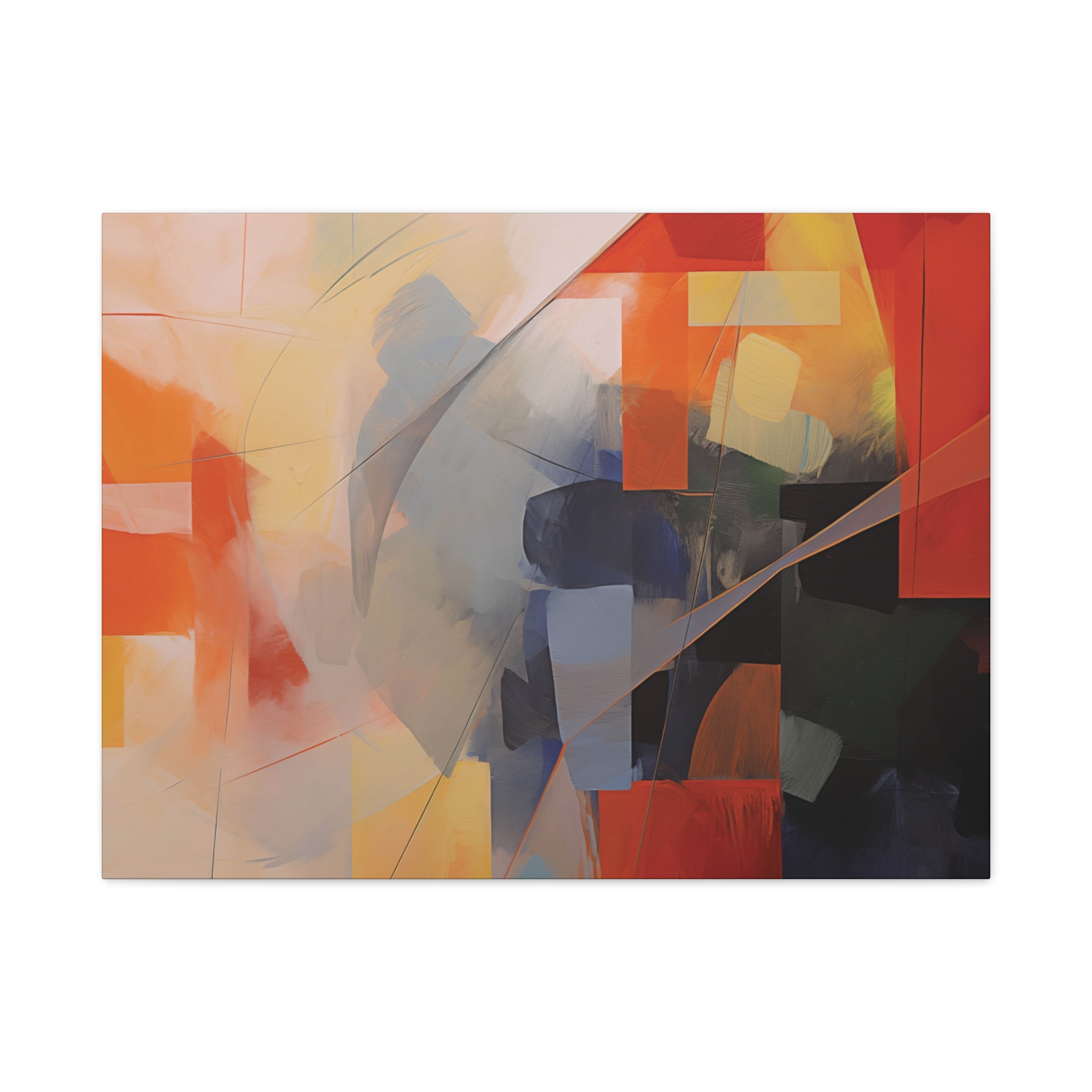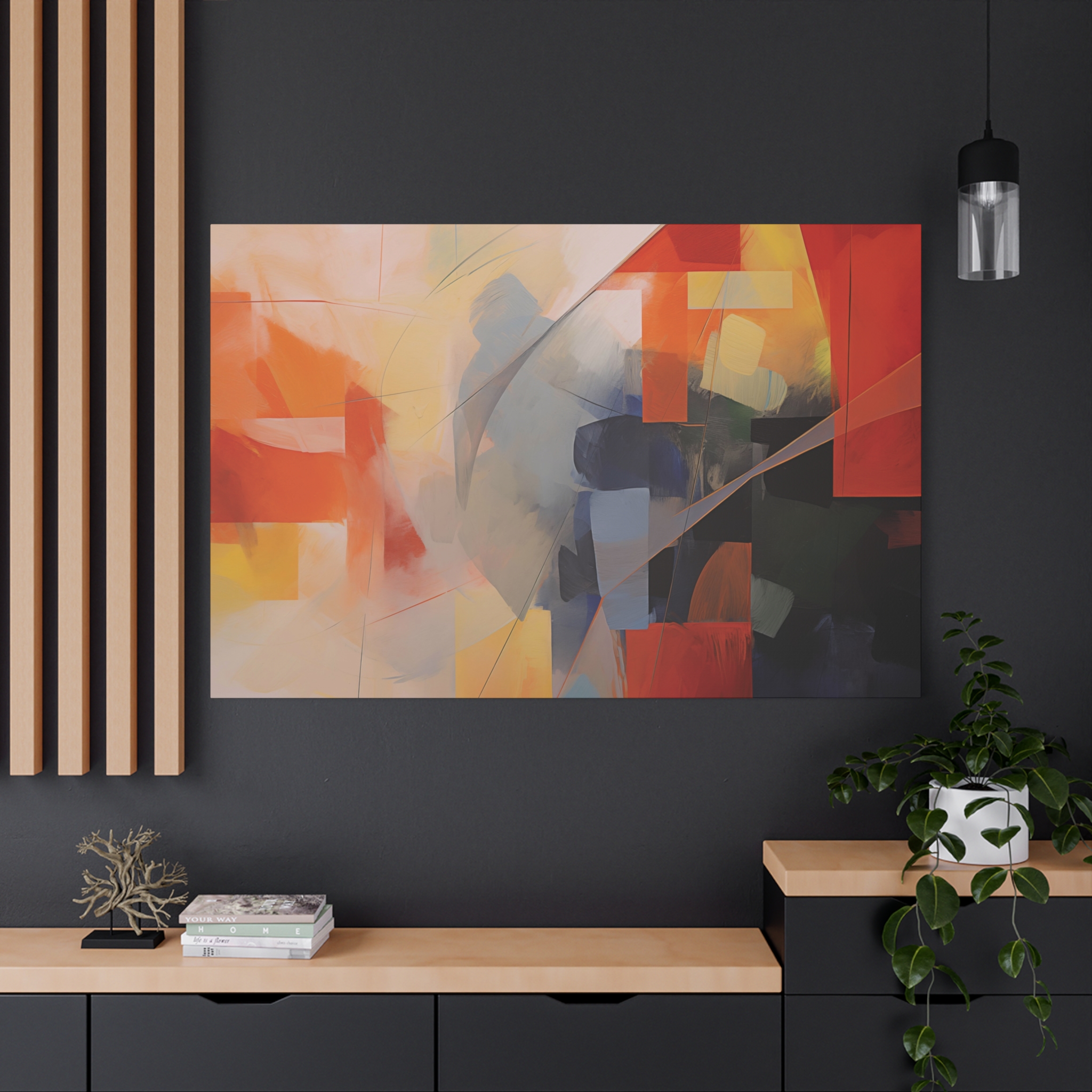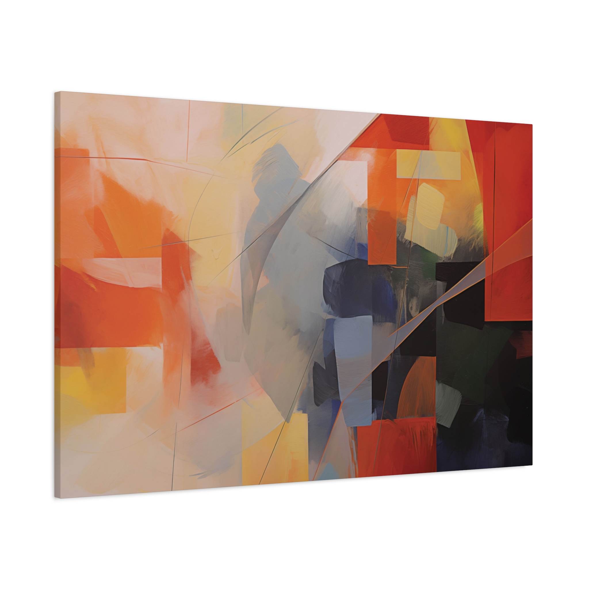 Bold patches of colour teamed with fin cut like line work . Available in different colour tones and formats to suit your interior project. The canvas can be rotated to suit portrait or landscape application.