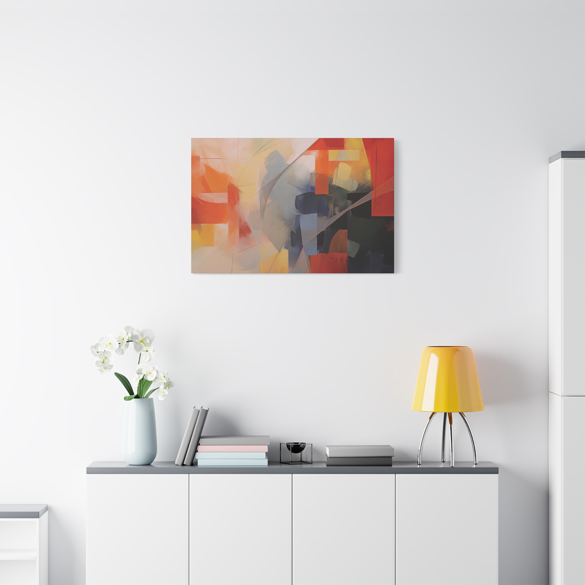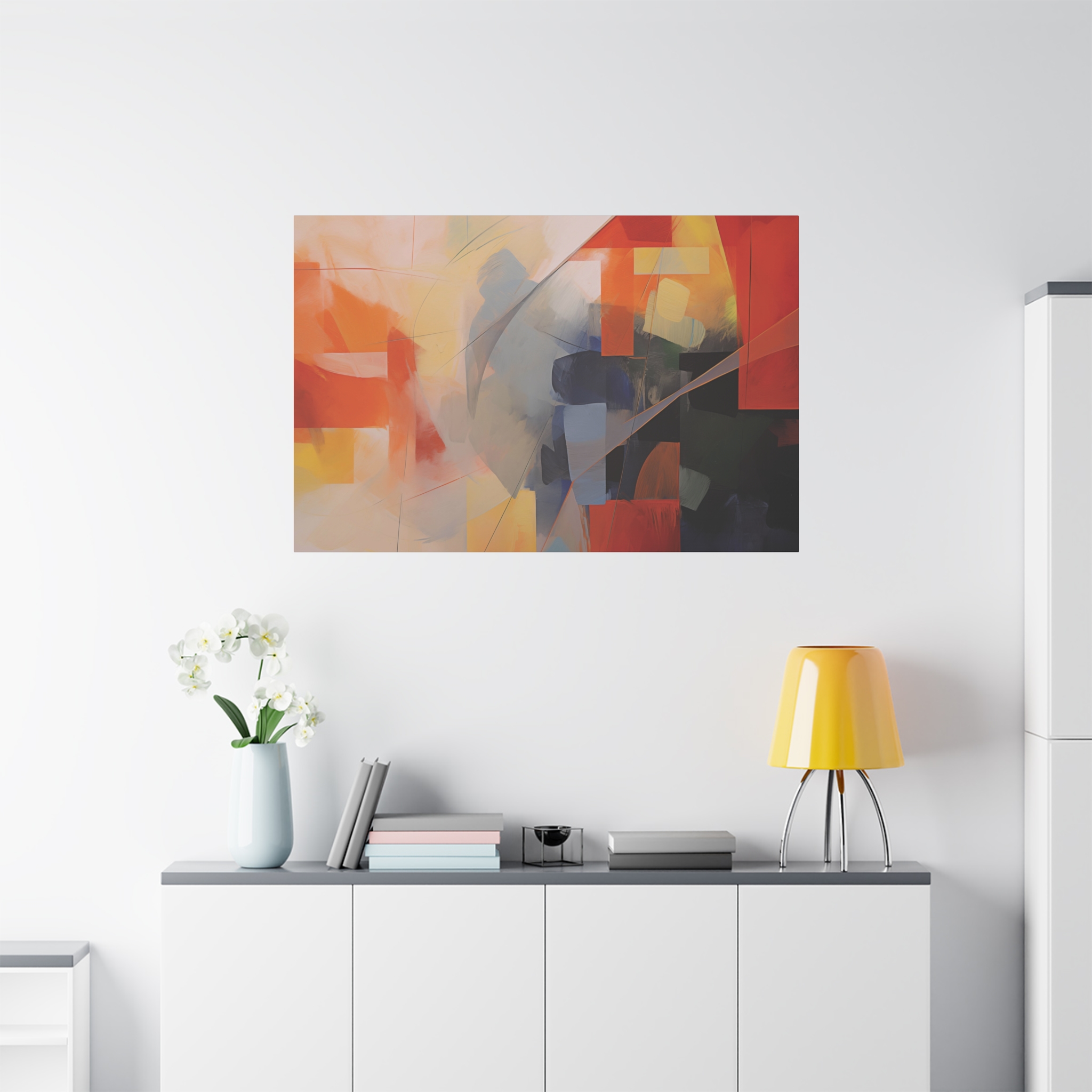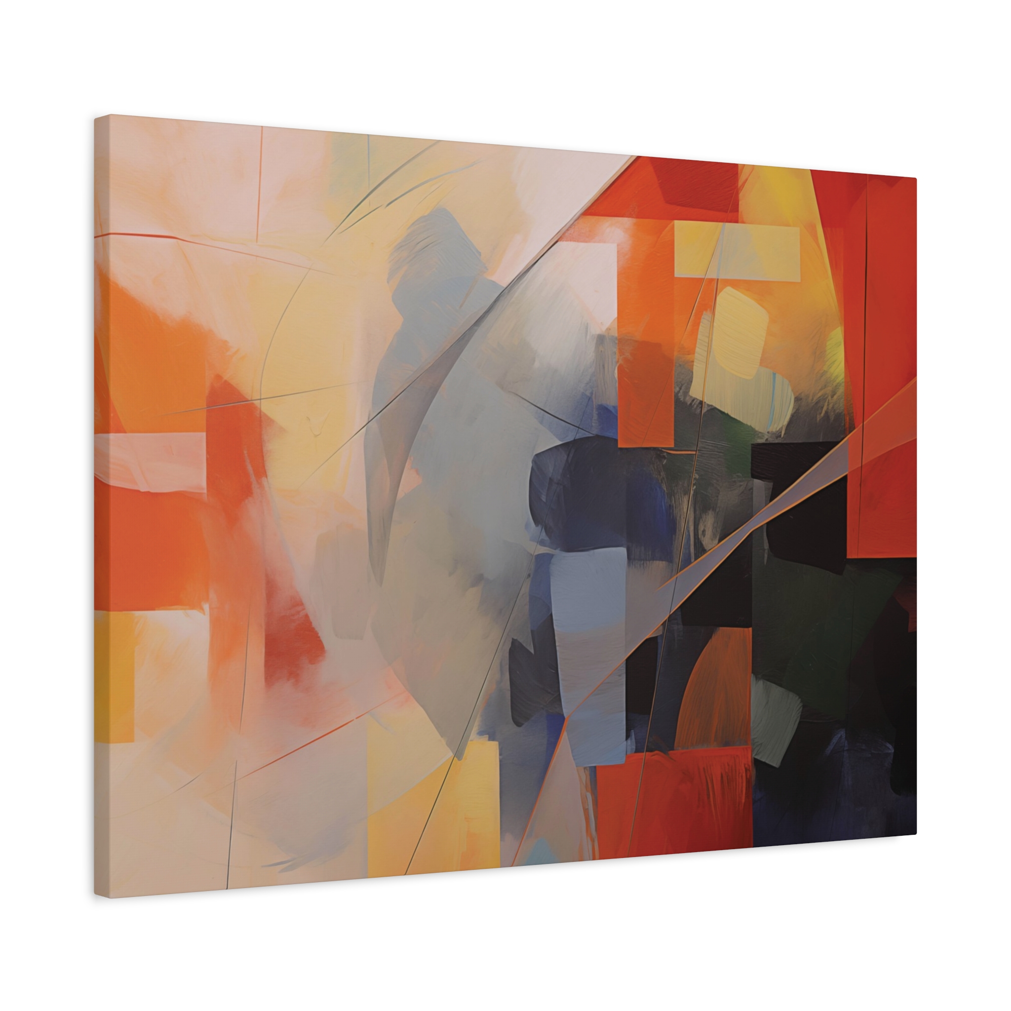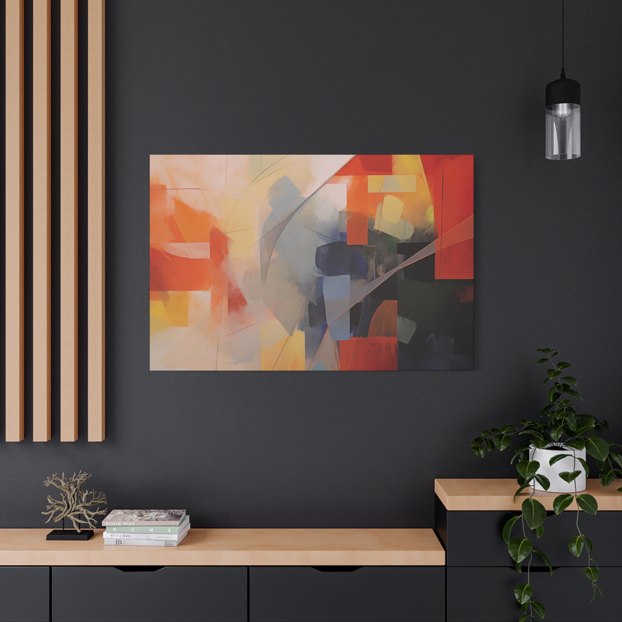 Bold patches of colour teamed with fin cut like line work . Available in different colour tones and formats to suit your interior project. The canvas can be rotated to suit portrait or landscape application.
