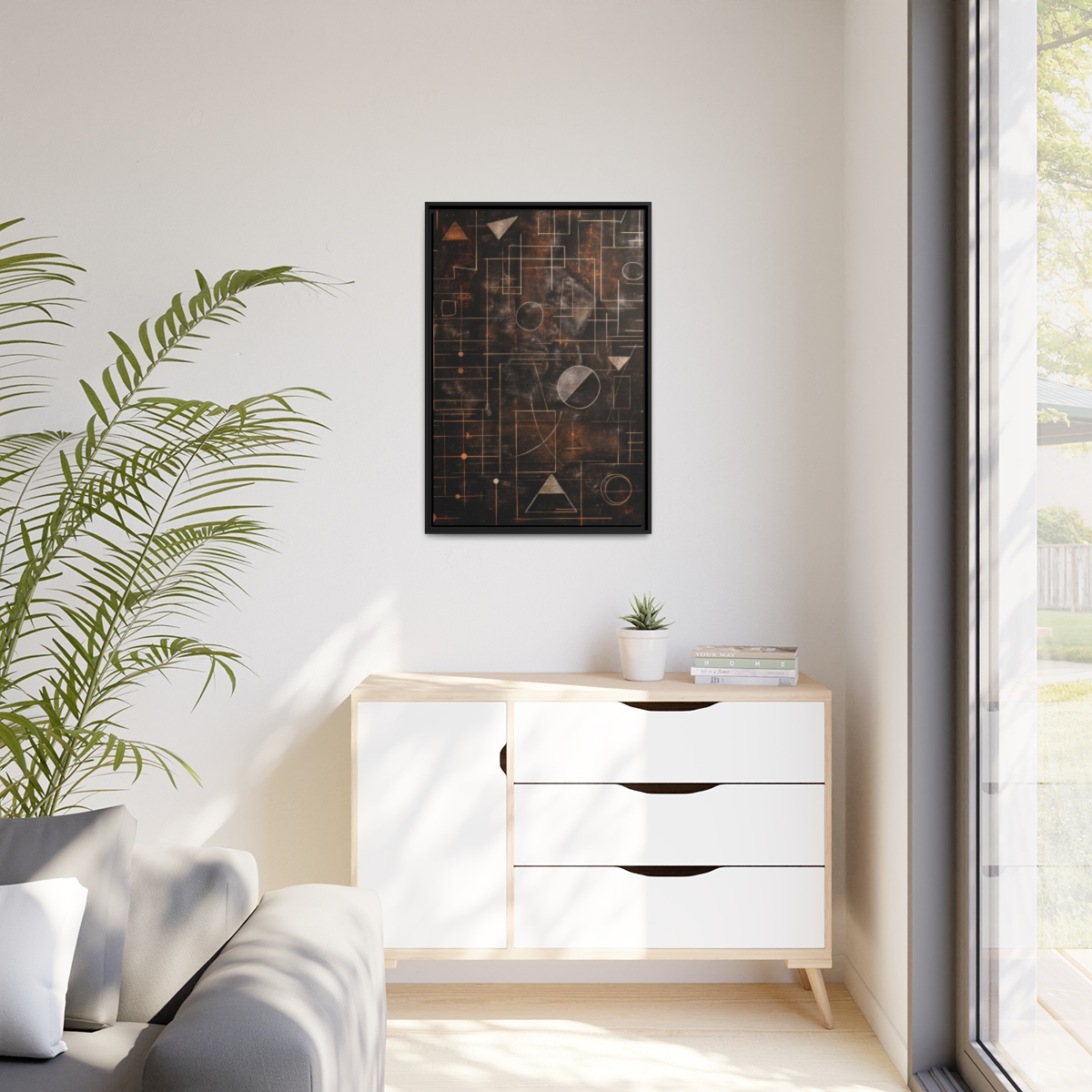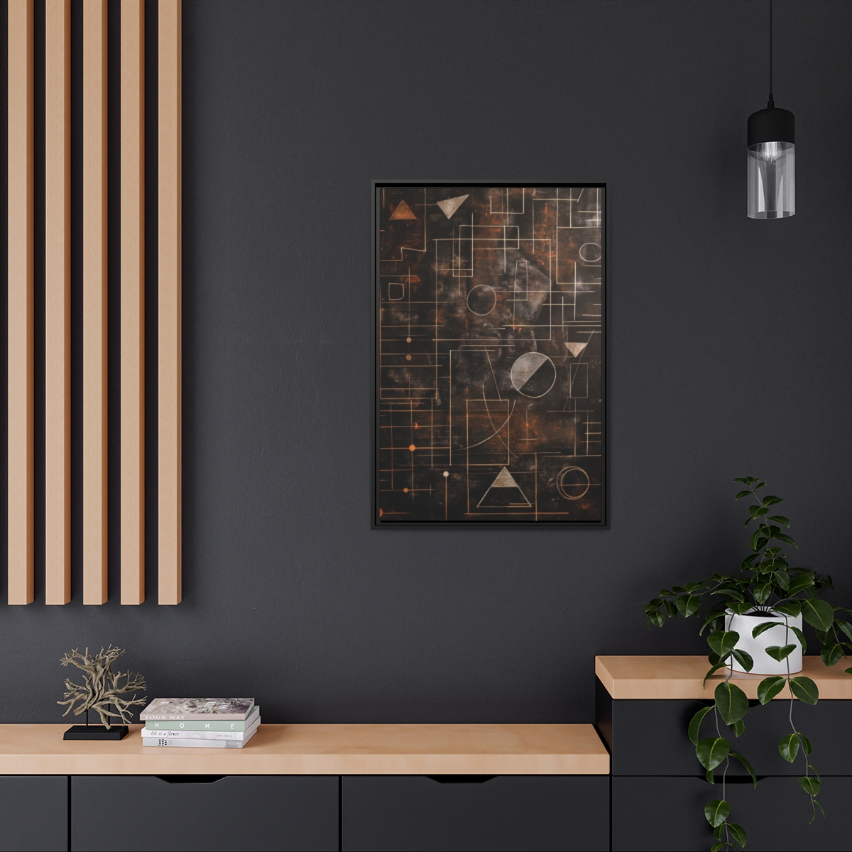 Custom digitally printed artwork on a quality canvas. .Every print in a black pinewood frame will look sleek and beautiful in any interior. The artwork will be printed on the cotton-polyester canvas with a special proprietary coating to make sure it stays vibrant for ages. Environmentally-conscious – it’s made from sustainably sourced materials (Forest Stewardship Council certified) and custom printed on demand no warehouse stocks and no waste. Choose between the designer specified sizes. The sawtooth hanging hardware is already attached.