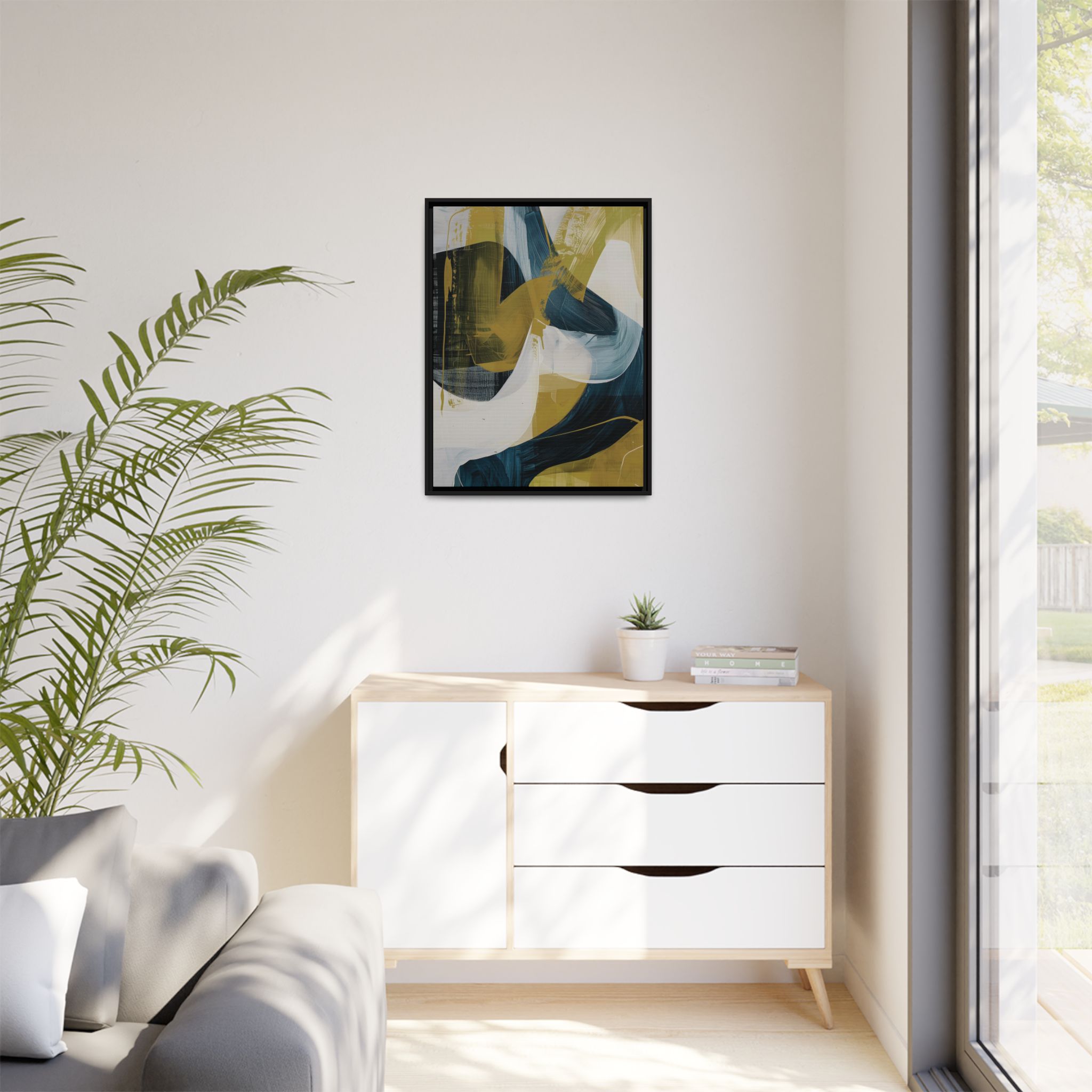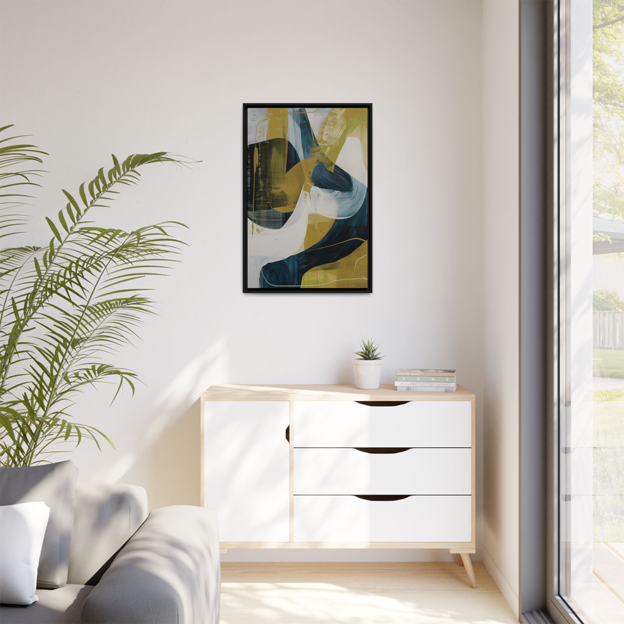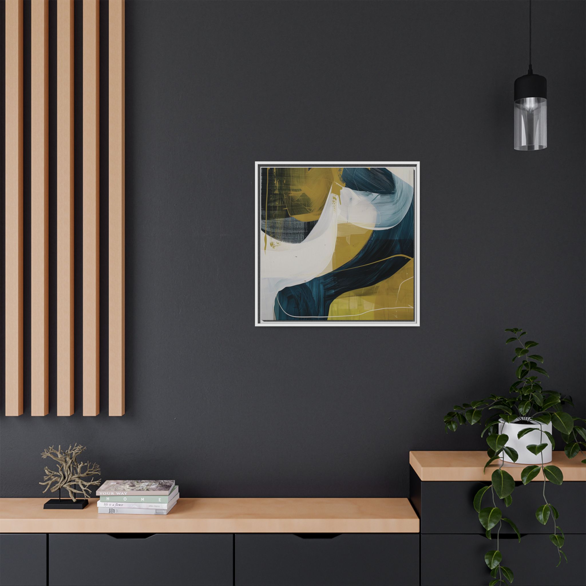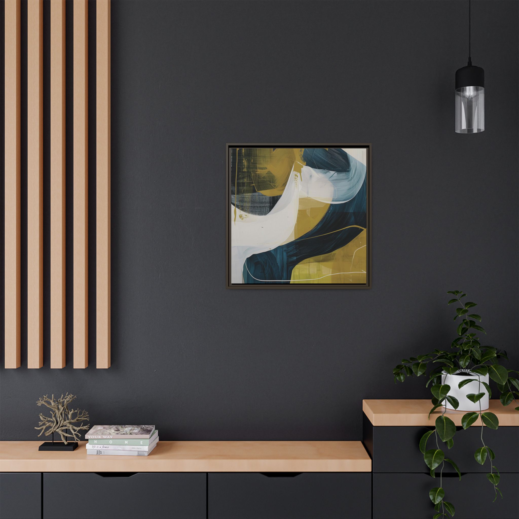 Custom digitally printed artwork on a quality canvas. .Every print in a black pinewood frame will look sleek and beautiful in any interior. The artwork will be printed on the cotton-polyester canvas with a special proprietary coating to make sure it stays vibrant for ages. Environmentally-conscious – it’s made from sustainably sourced materials (Forest Stewardship Council certified) and custom printed on demand no warehouse stocks and no waste. Choose between the designer specified sizes. The sawtooth hanging hardware is already attached.