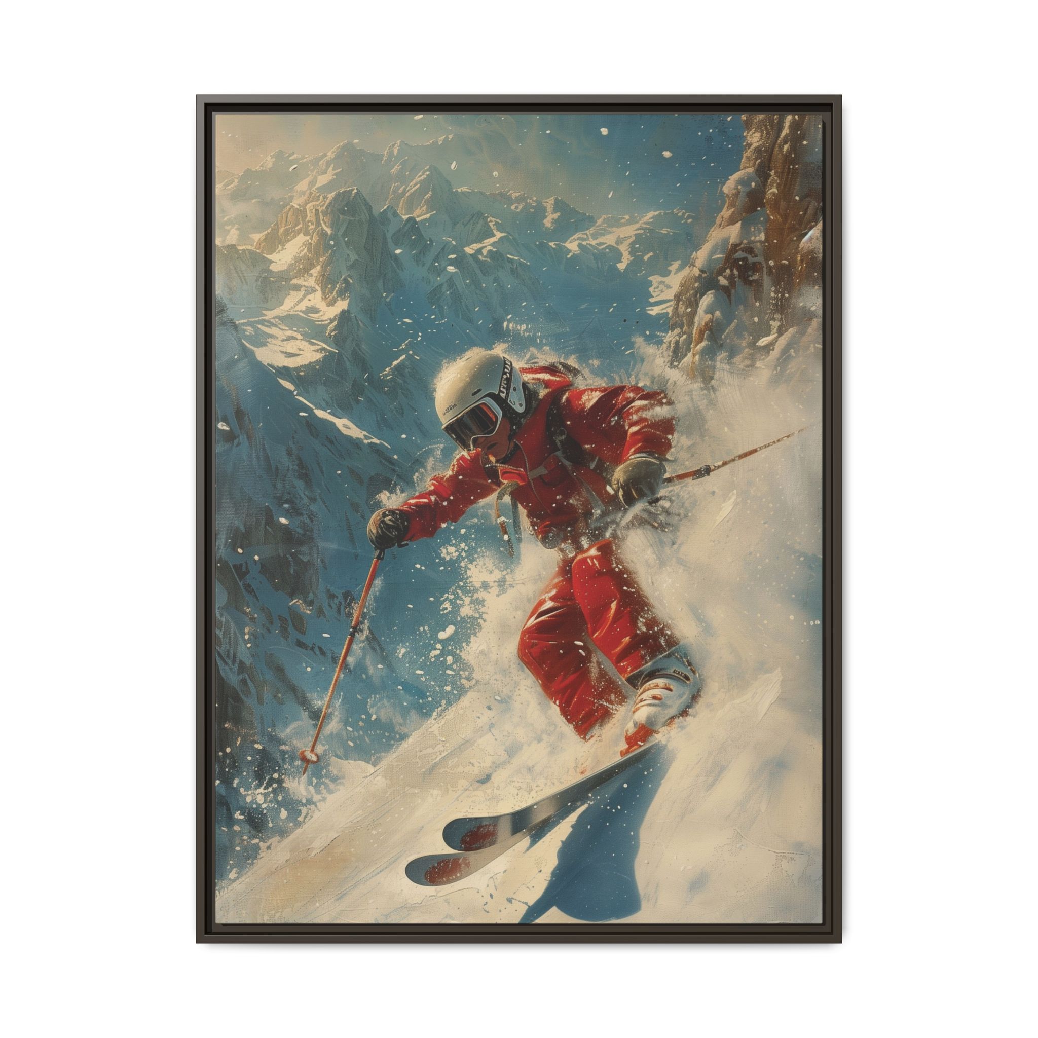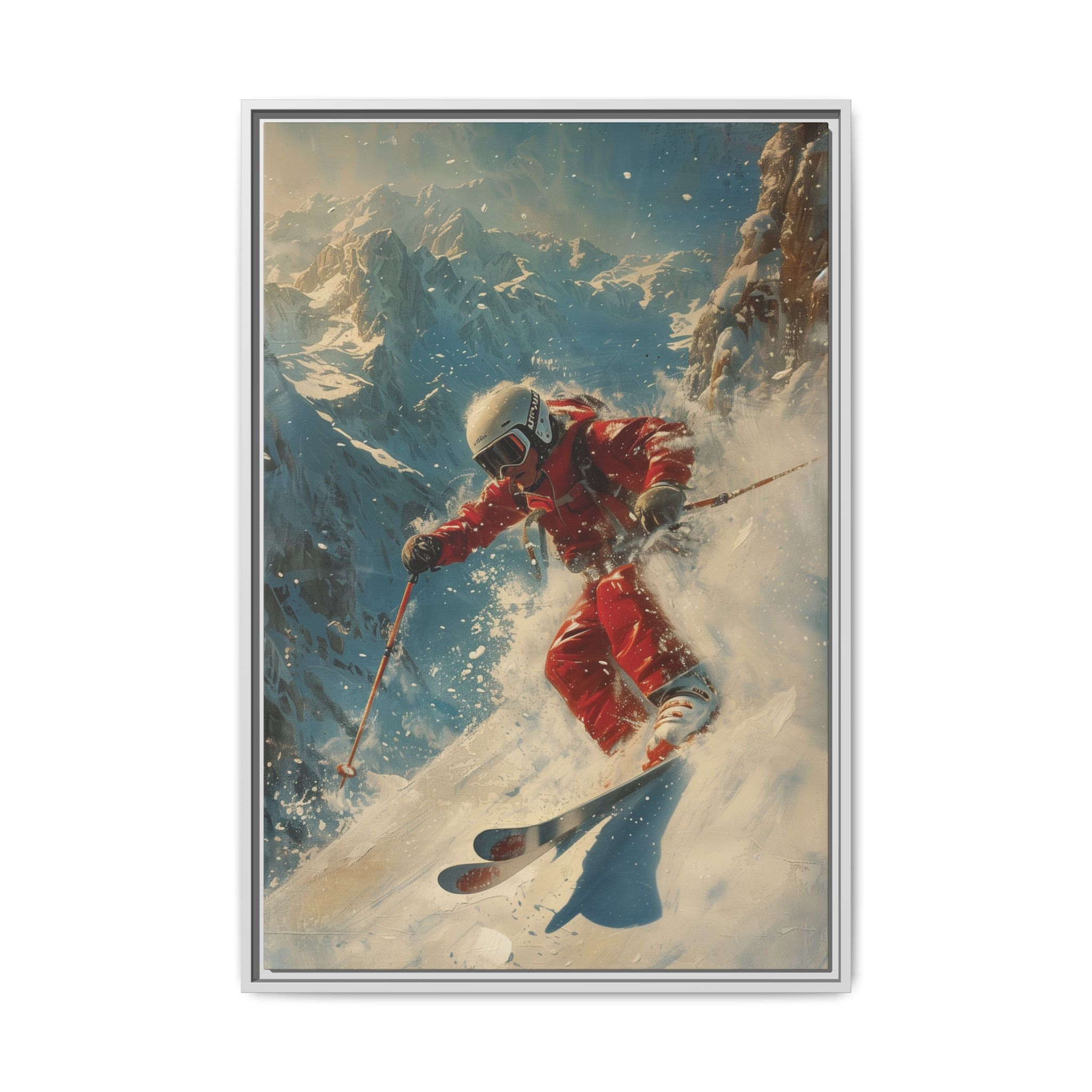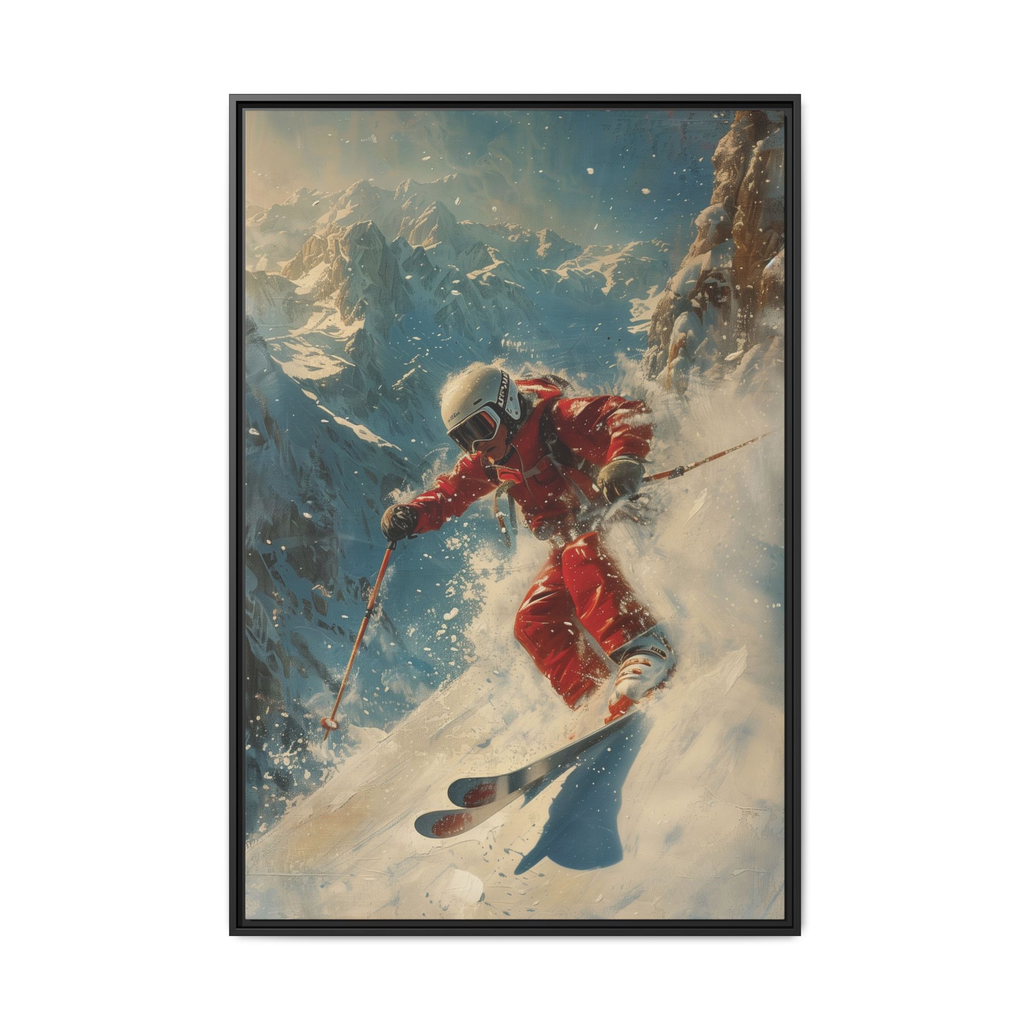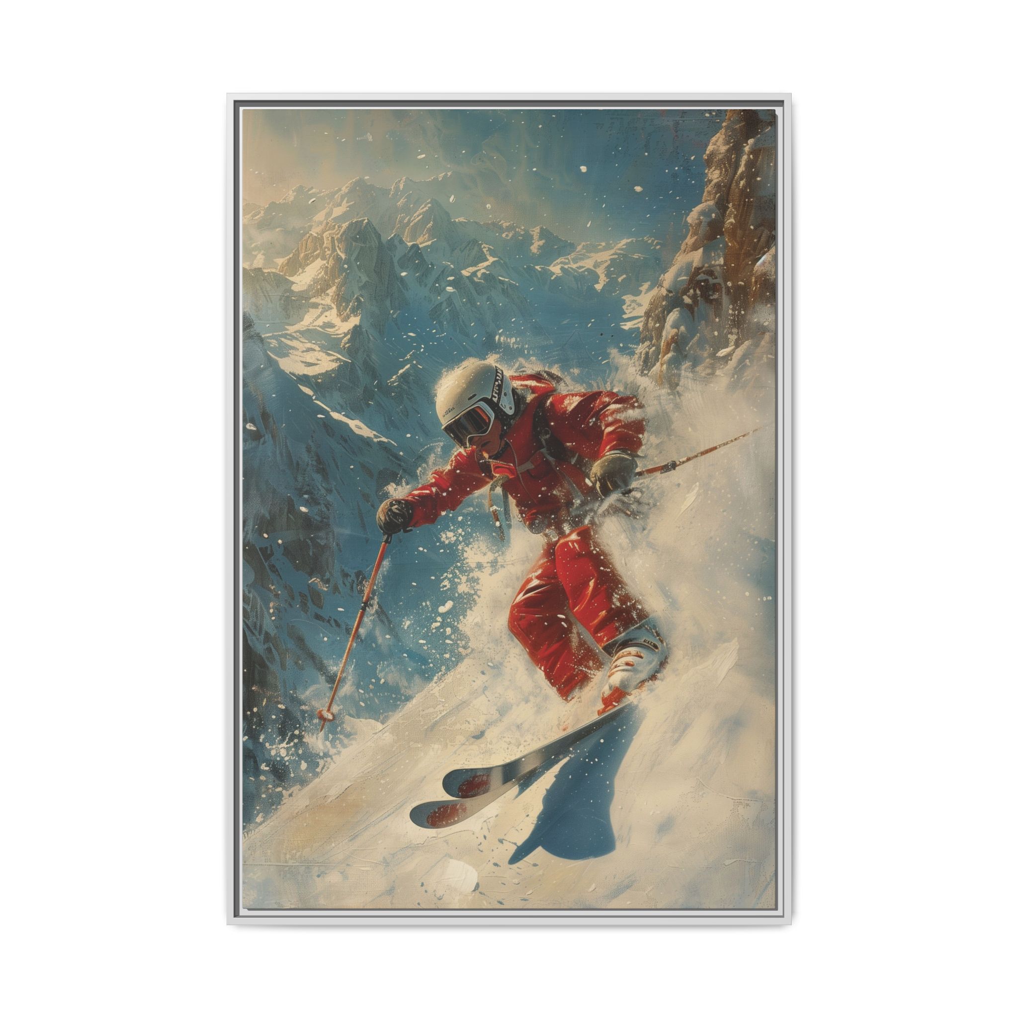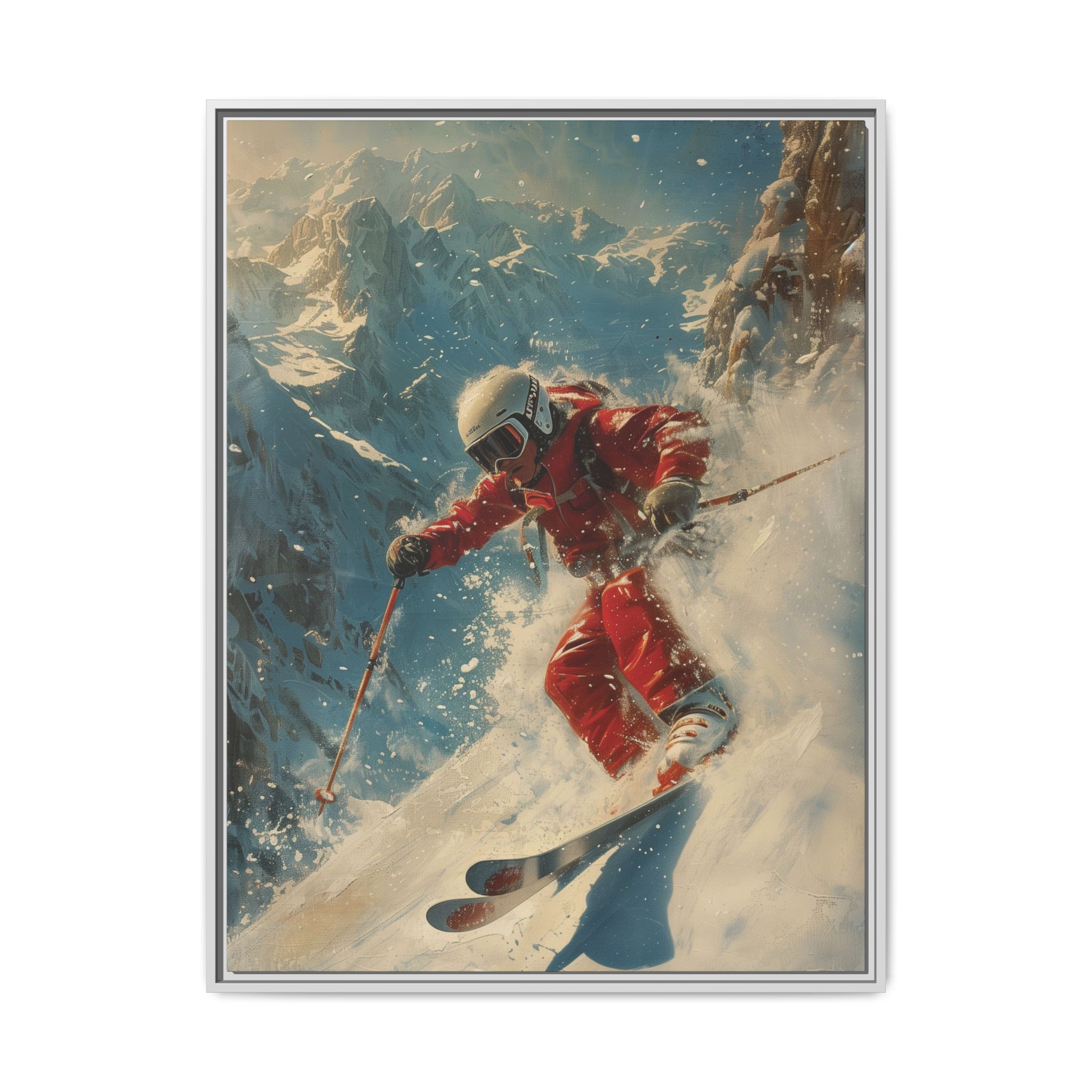 Vintage snow poster of skier heading down a very steep slope. Gives a nostalgic and adventurous vibe, perfect for winter sports enthusiasts and vintage decor lovers. Ideal for decorating homes during the winter season and great as a gift for skiers and snow sports fans.