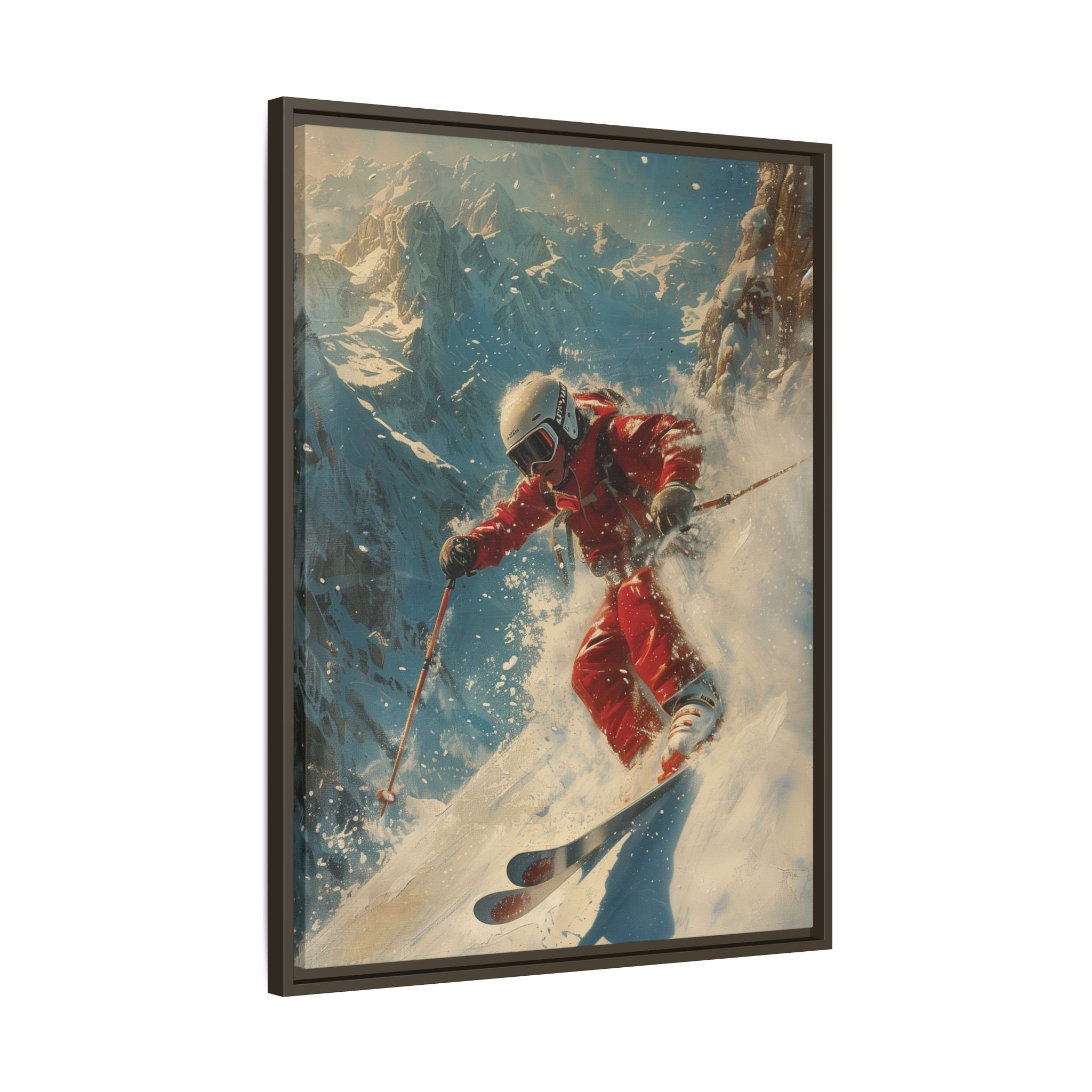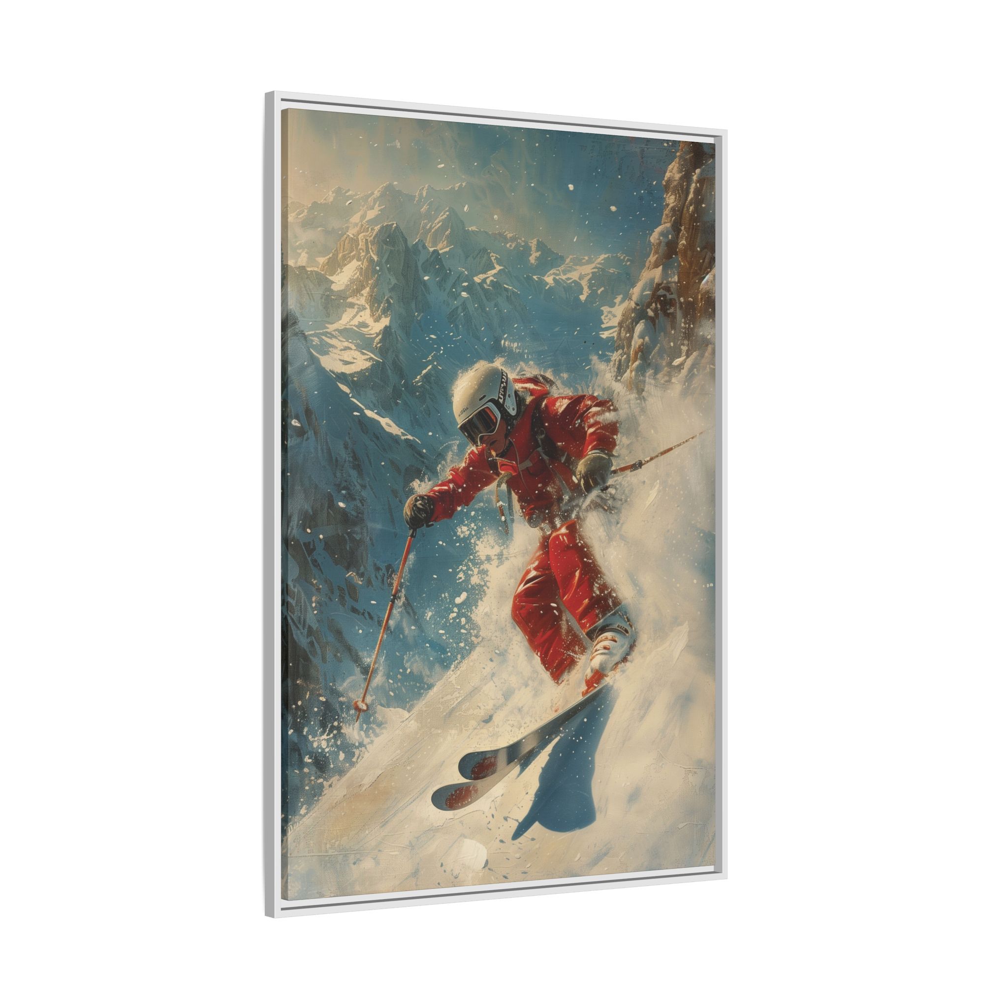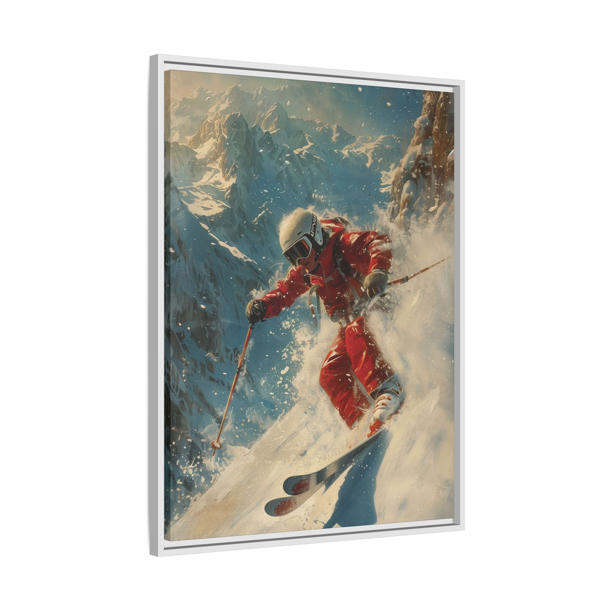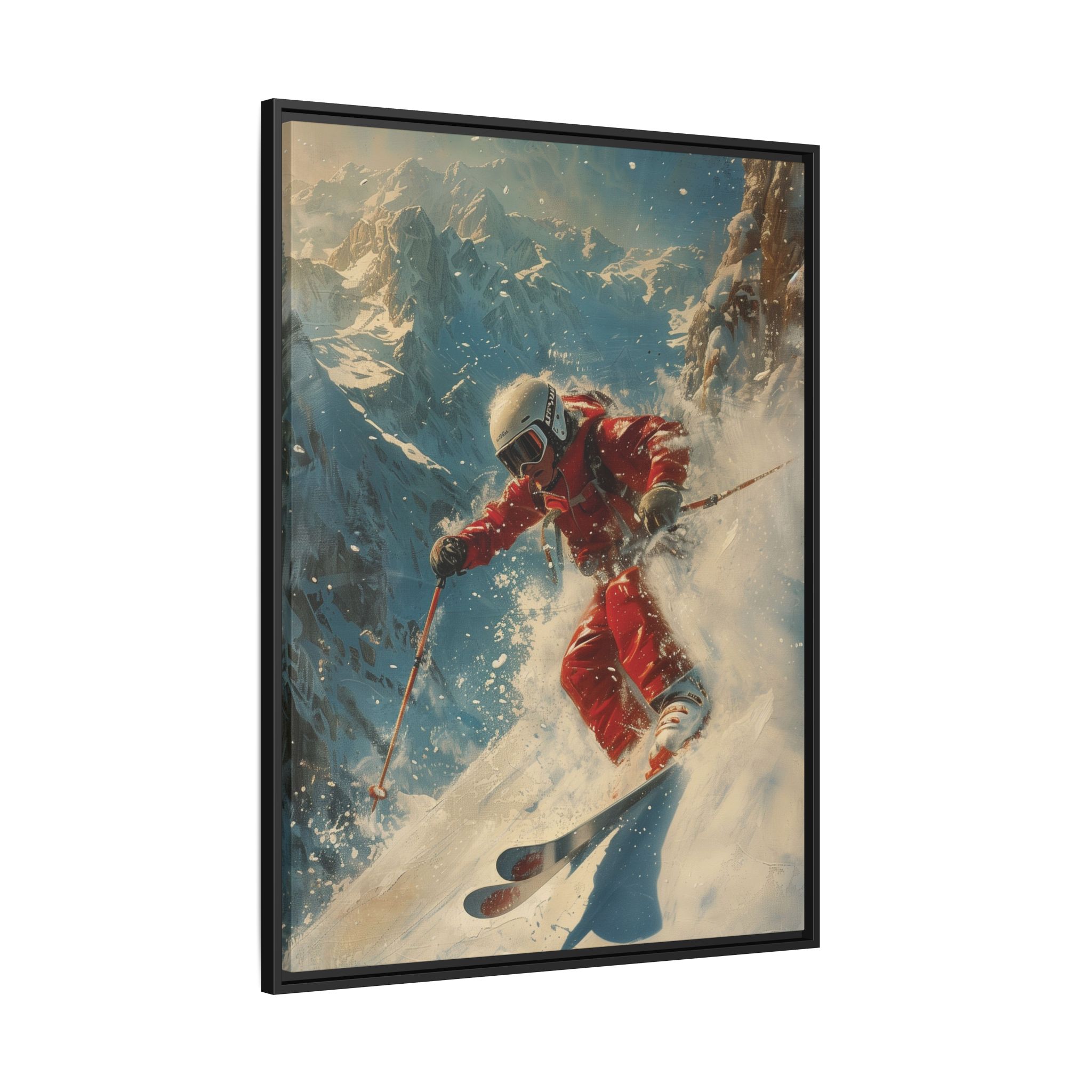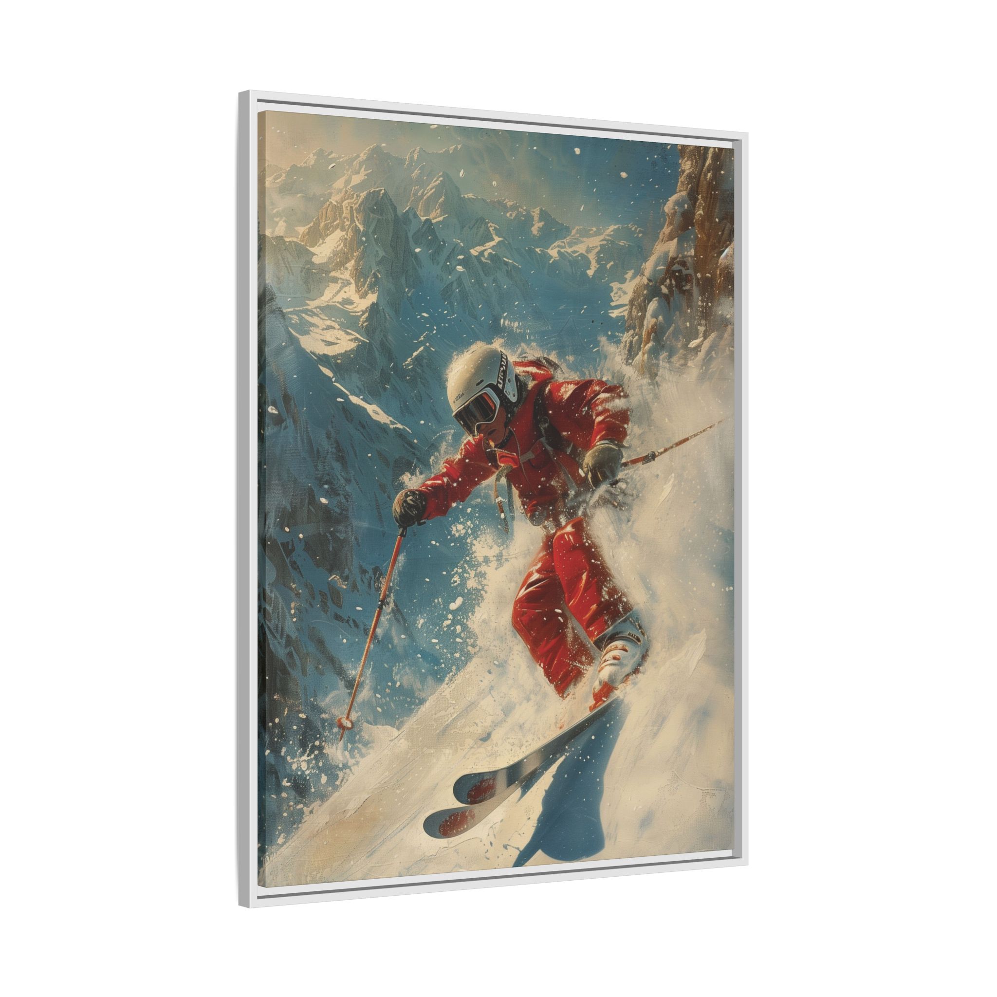 Vintage snow poster of skier heading down a very steep slope. Gives a nostalgic and adventurous vibe, perfect for winter sports enthusiasts and vintage decor lovers. Ideal for decorating homes during the winter season and great as a gift for skiers and snow sports fans.
