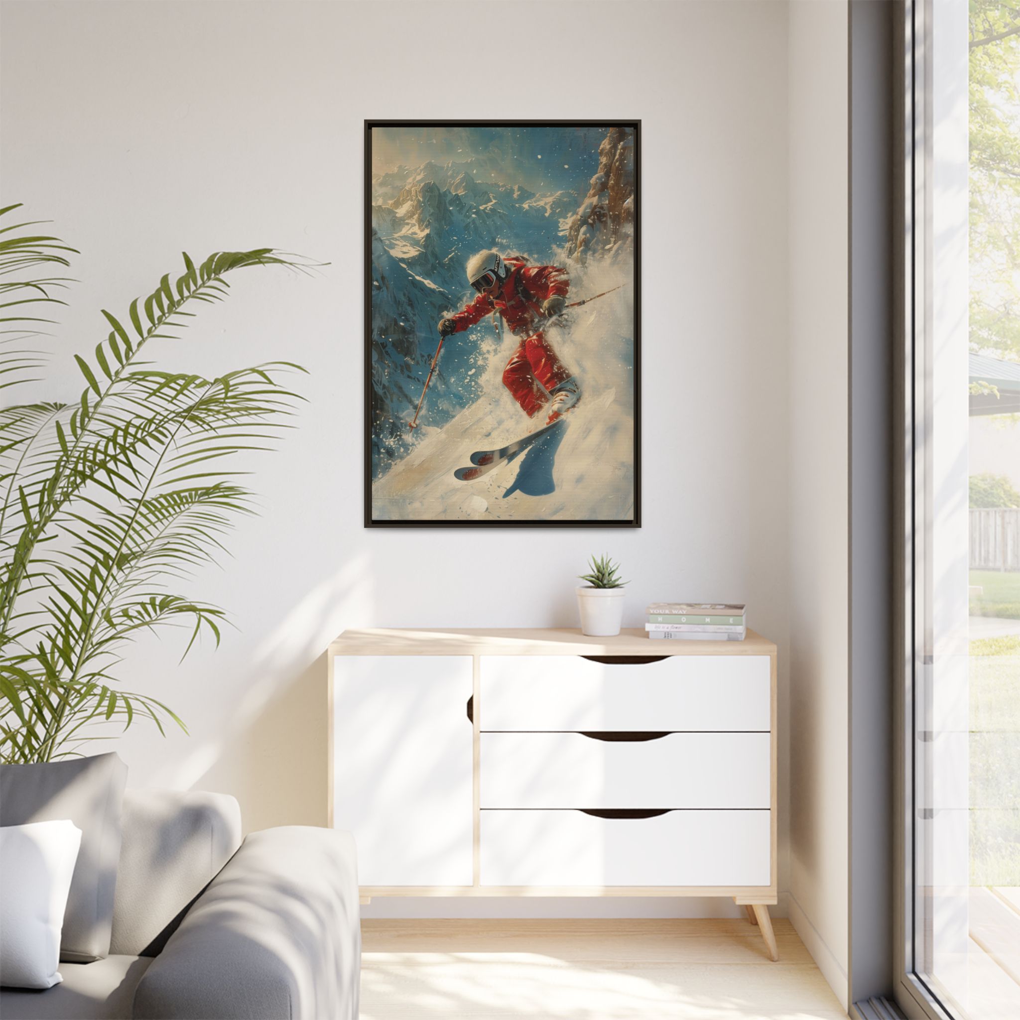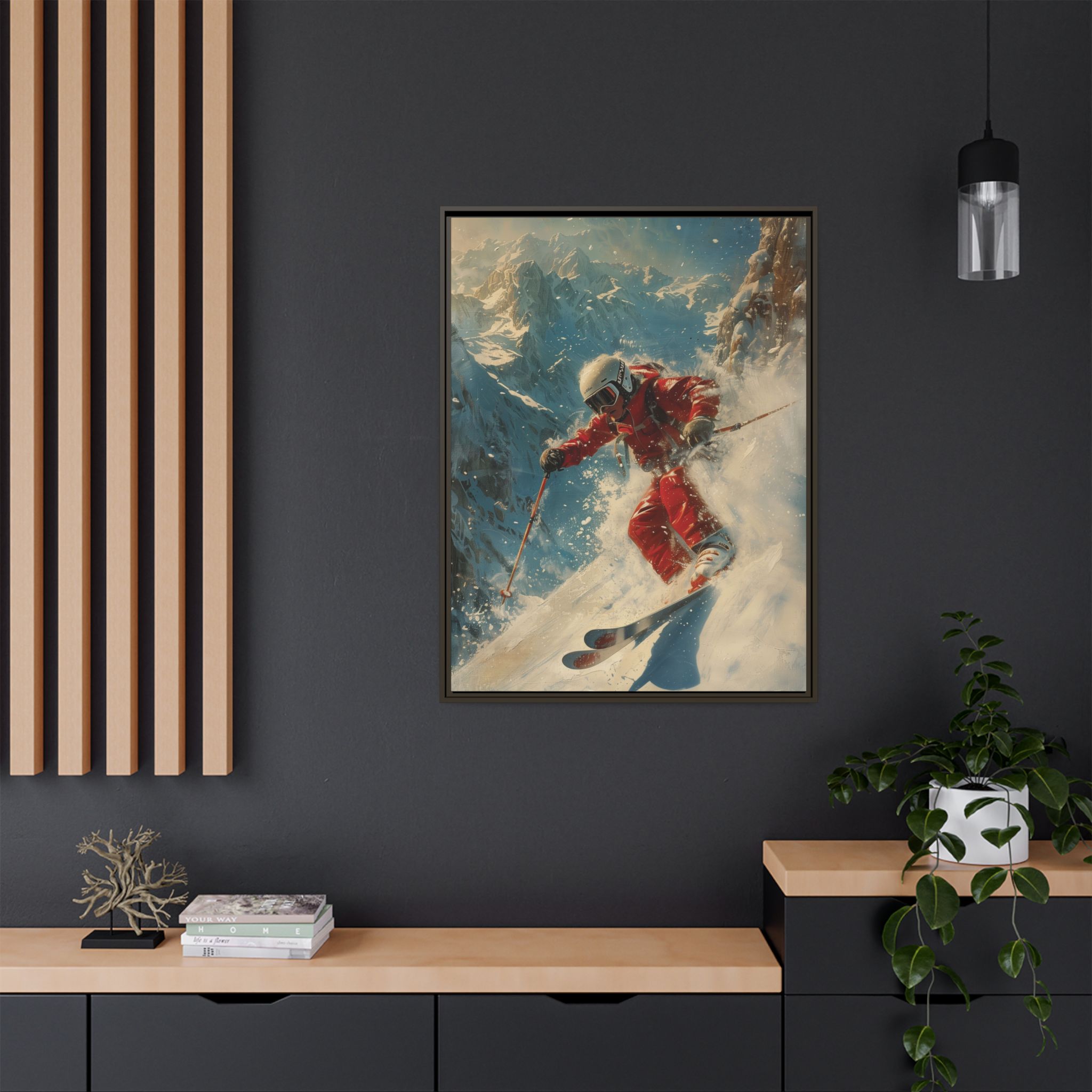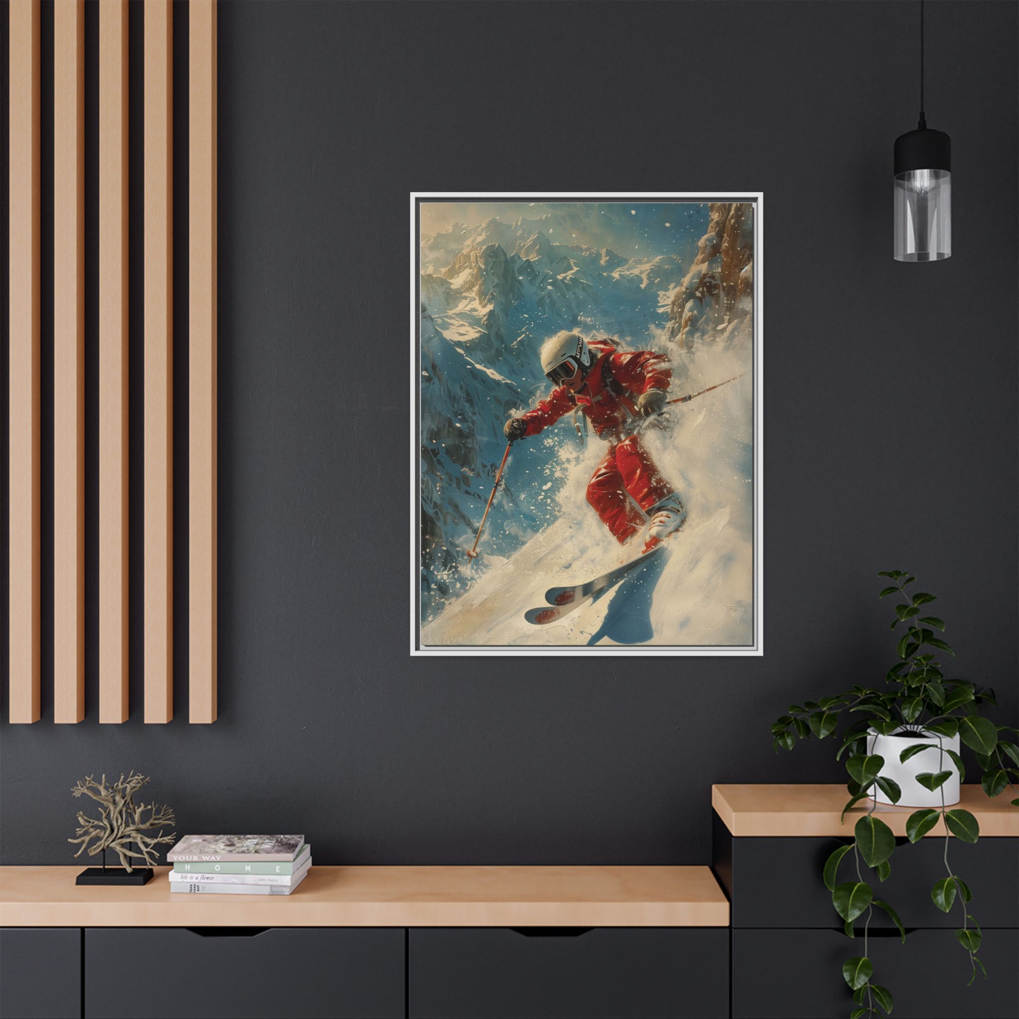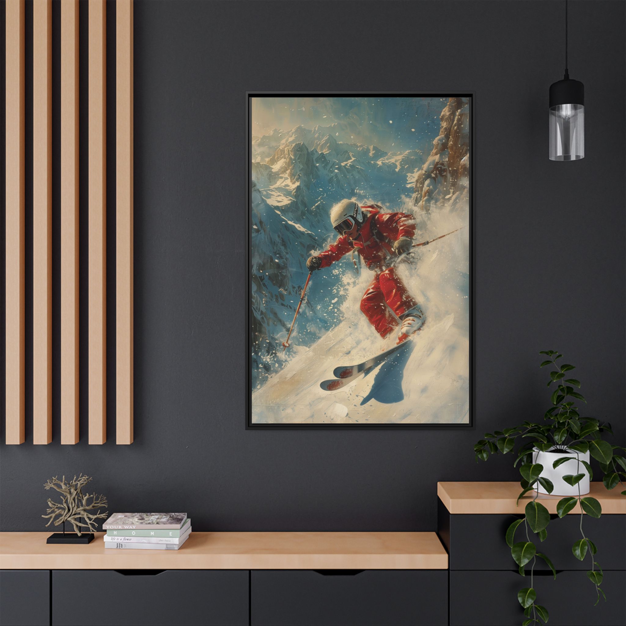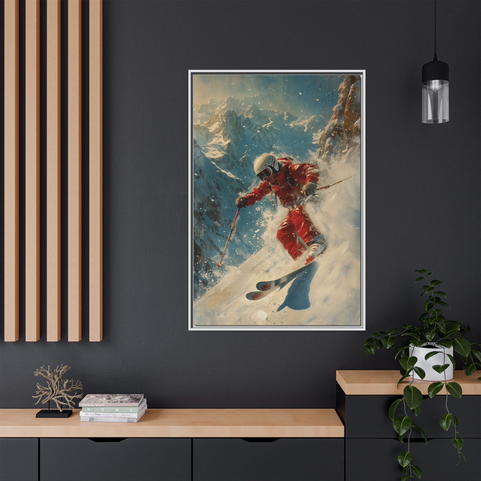Vintage snow poster of skier heading down a very steep slope. Gives a nostalgic and adventurous vibe, perfect for winter sports enthusiasts and vintage decor lovers. Ideal for decorating homes during the winter season and great as a gift for skiers and snow sports fans.