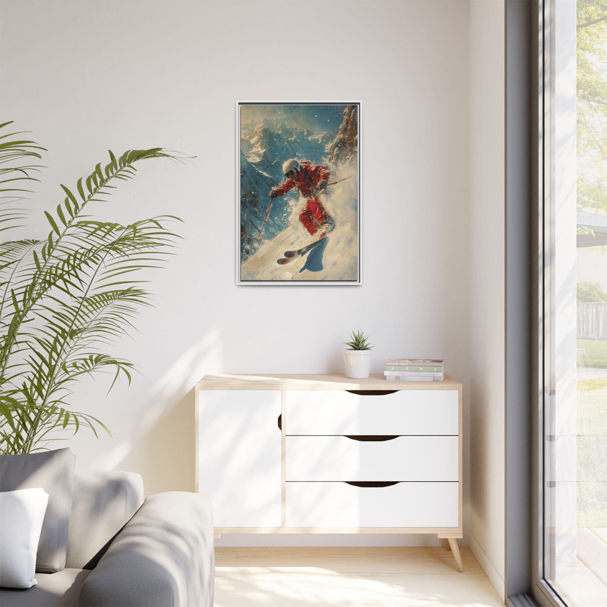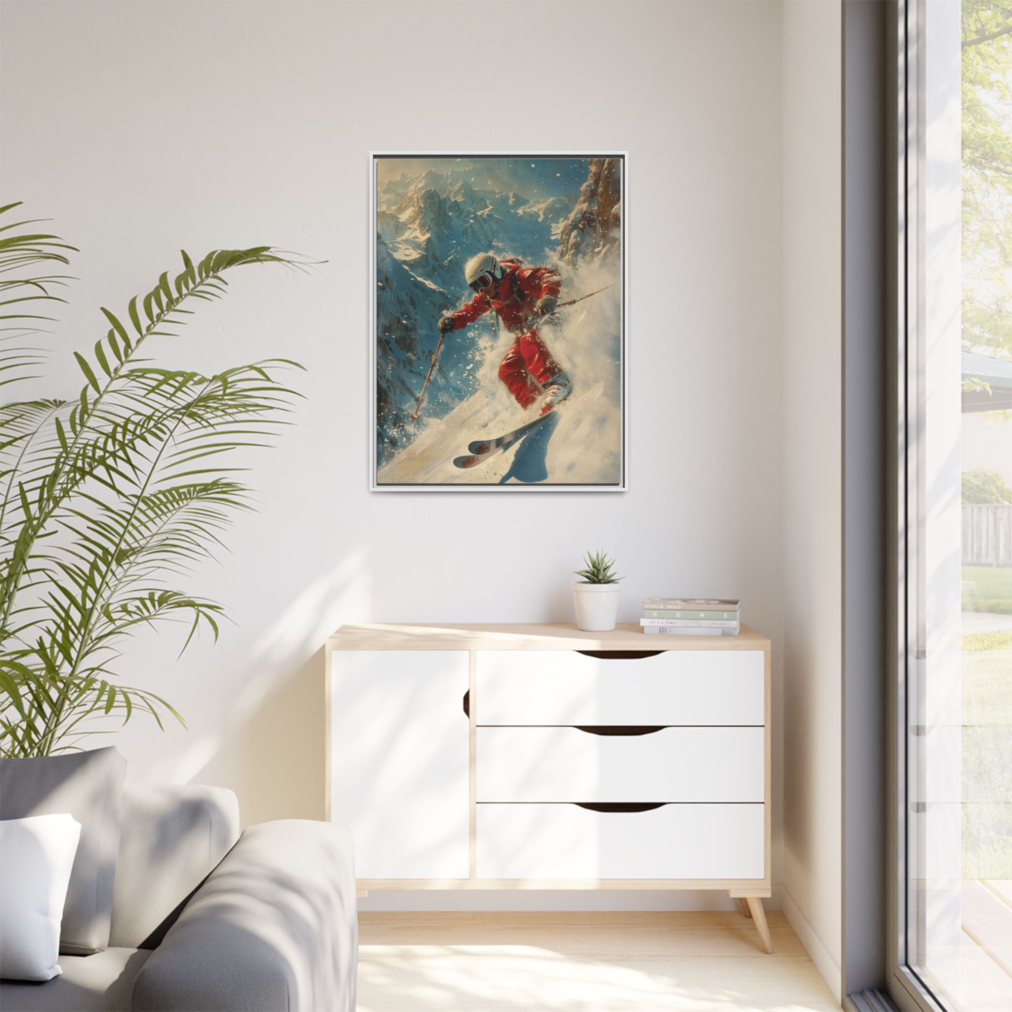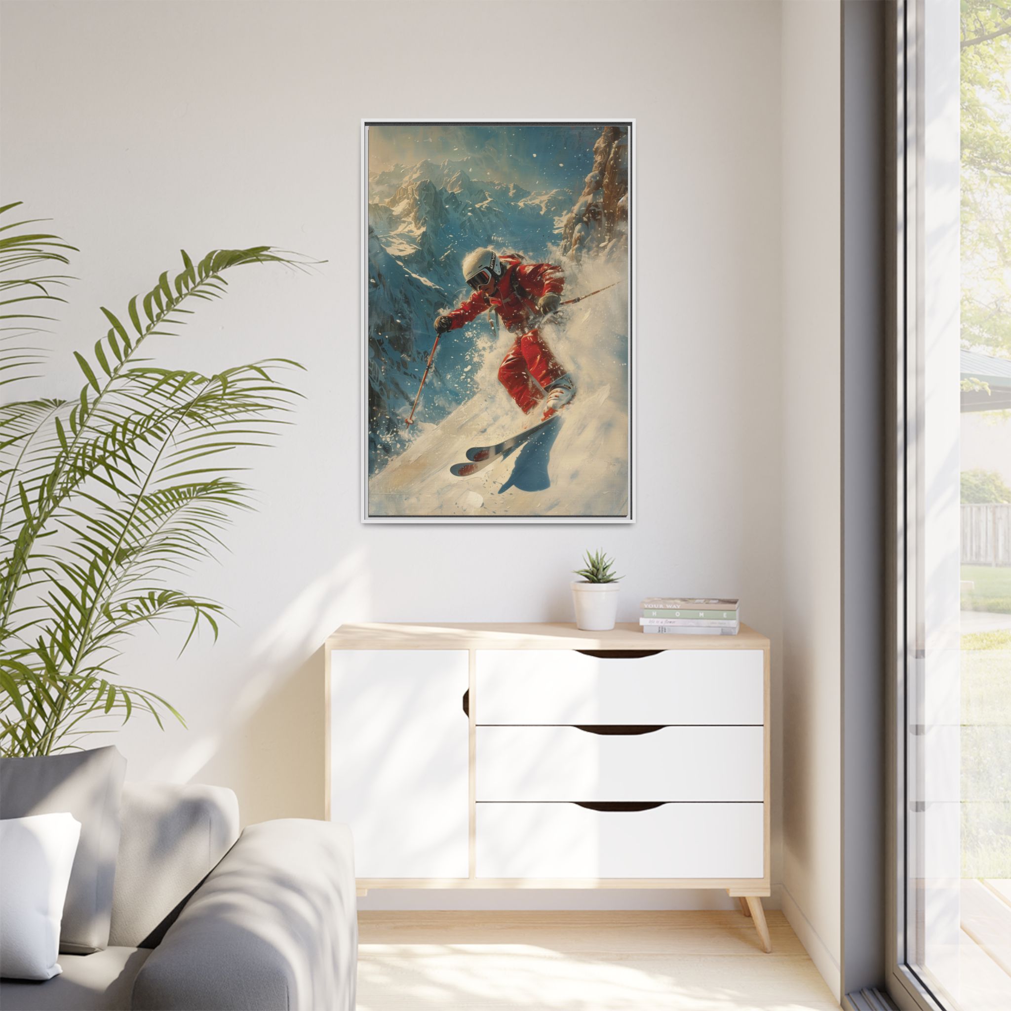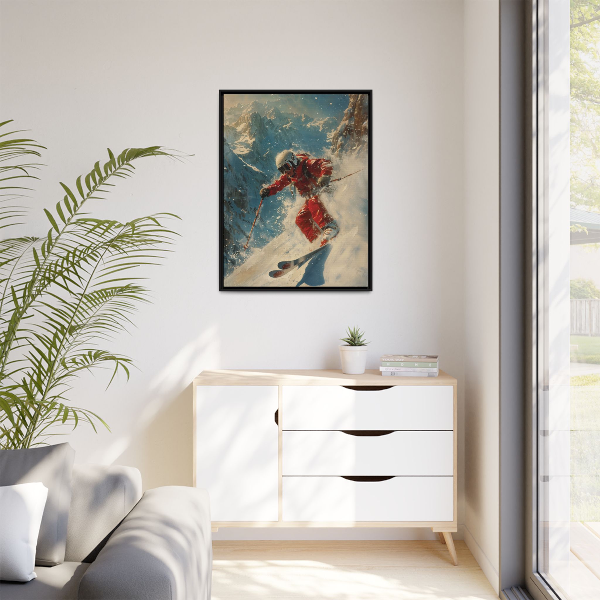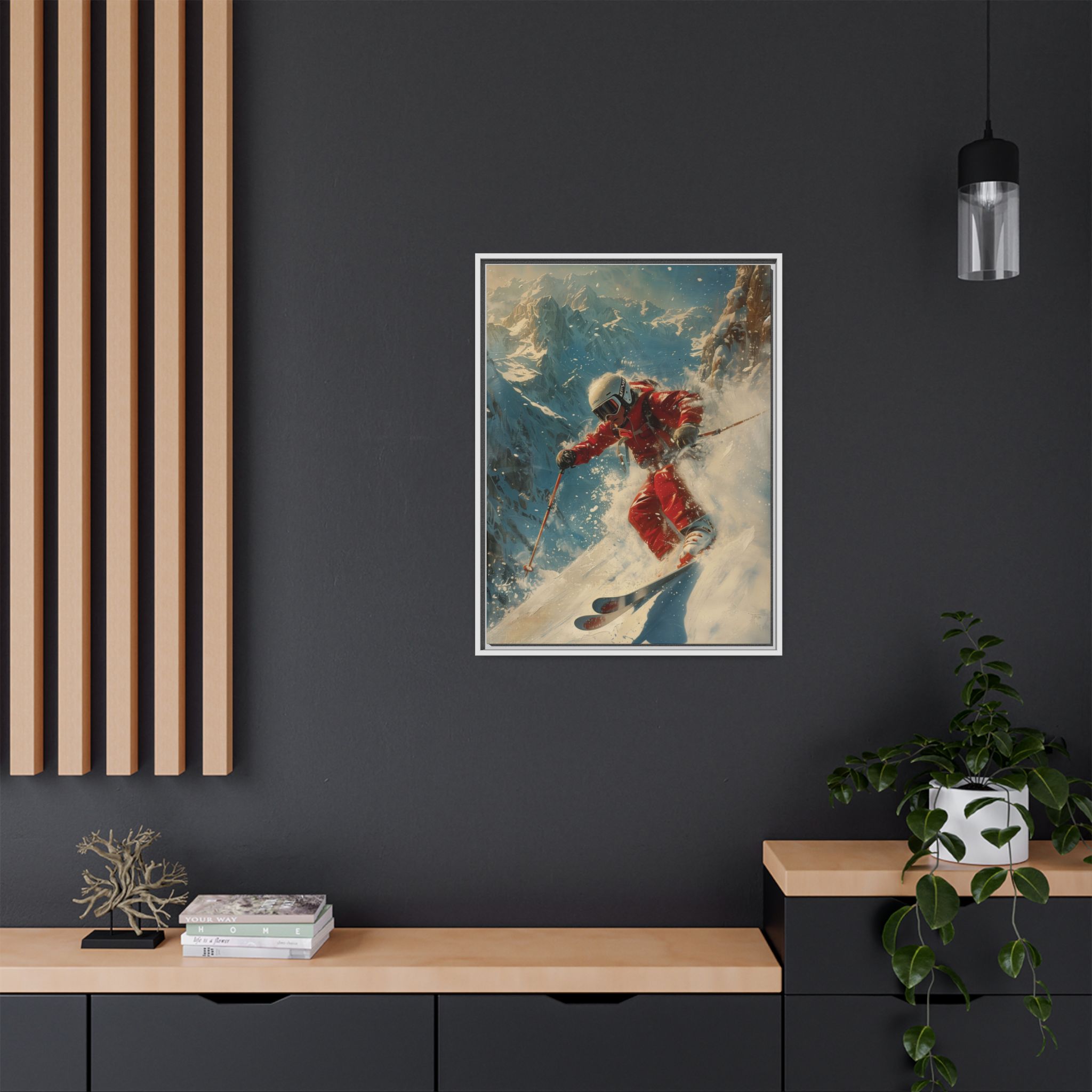 Vintage snow poster of skier heading down a very steep slope. Gives a nostalgic and adventurous vibe, perfect for winter sports enthusiasts and vintage decor lovers. Ideal for decorating homes during the winter season and great as a gift for skiers and snow sports fans.