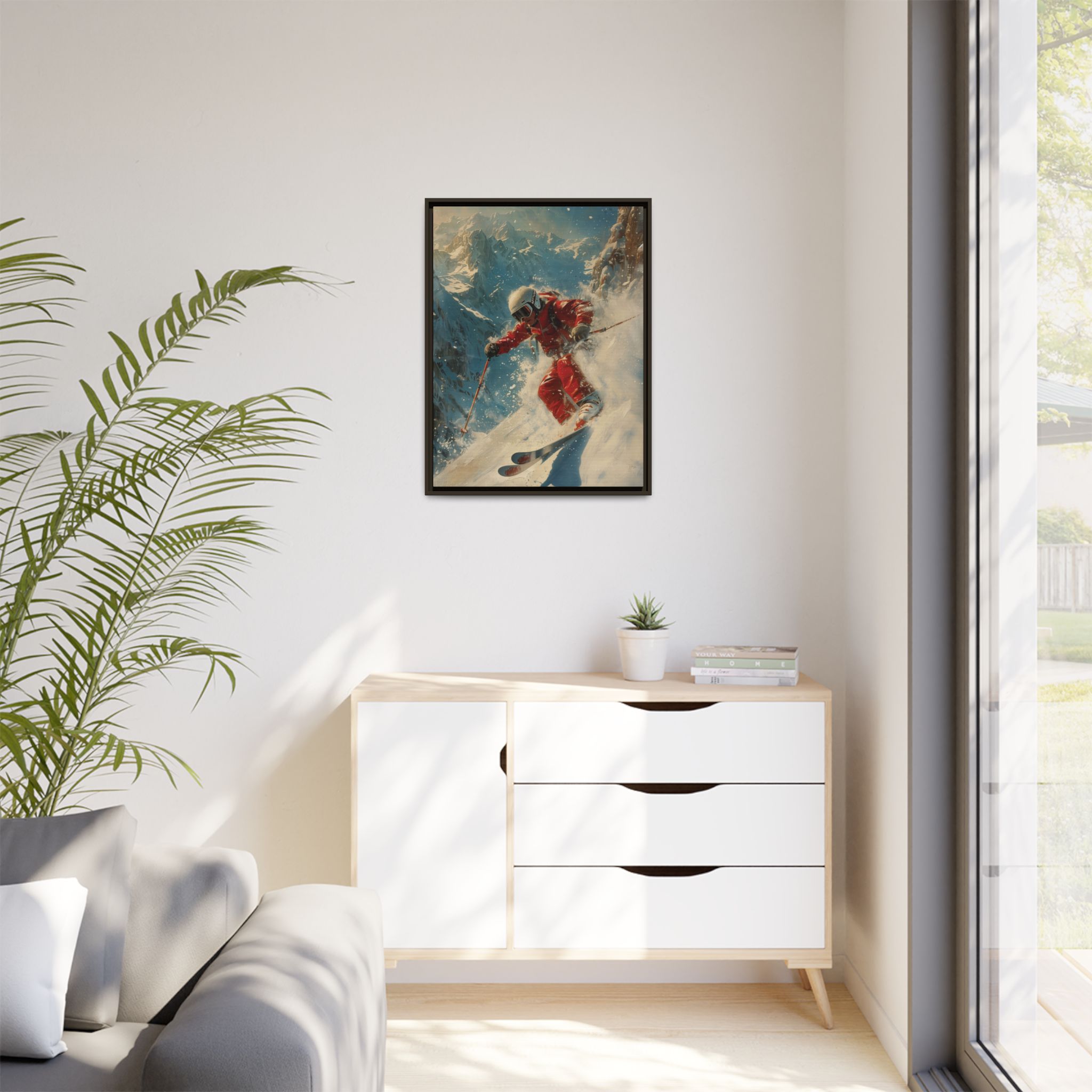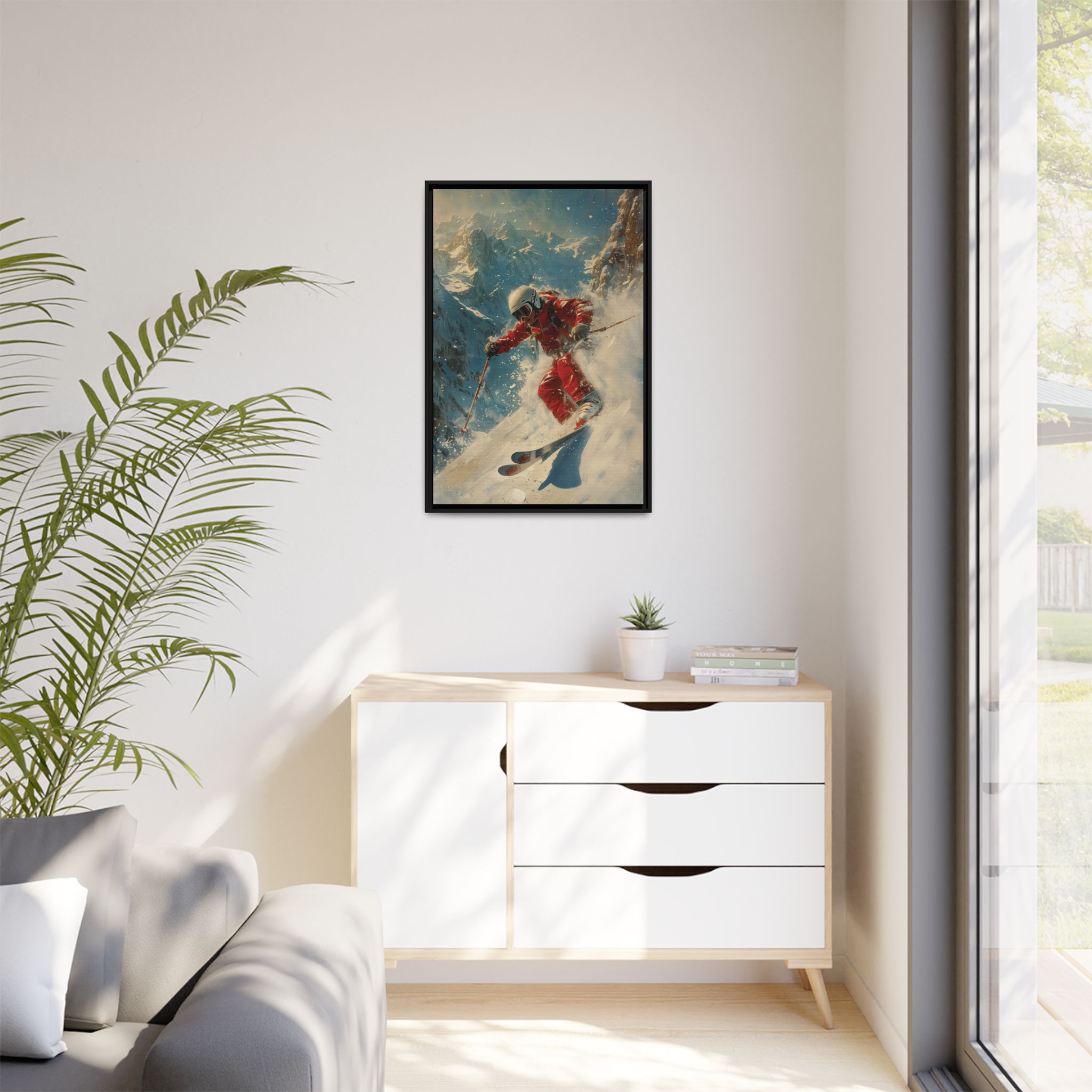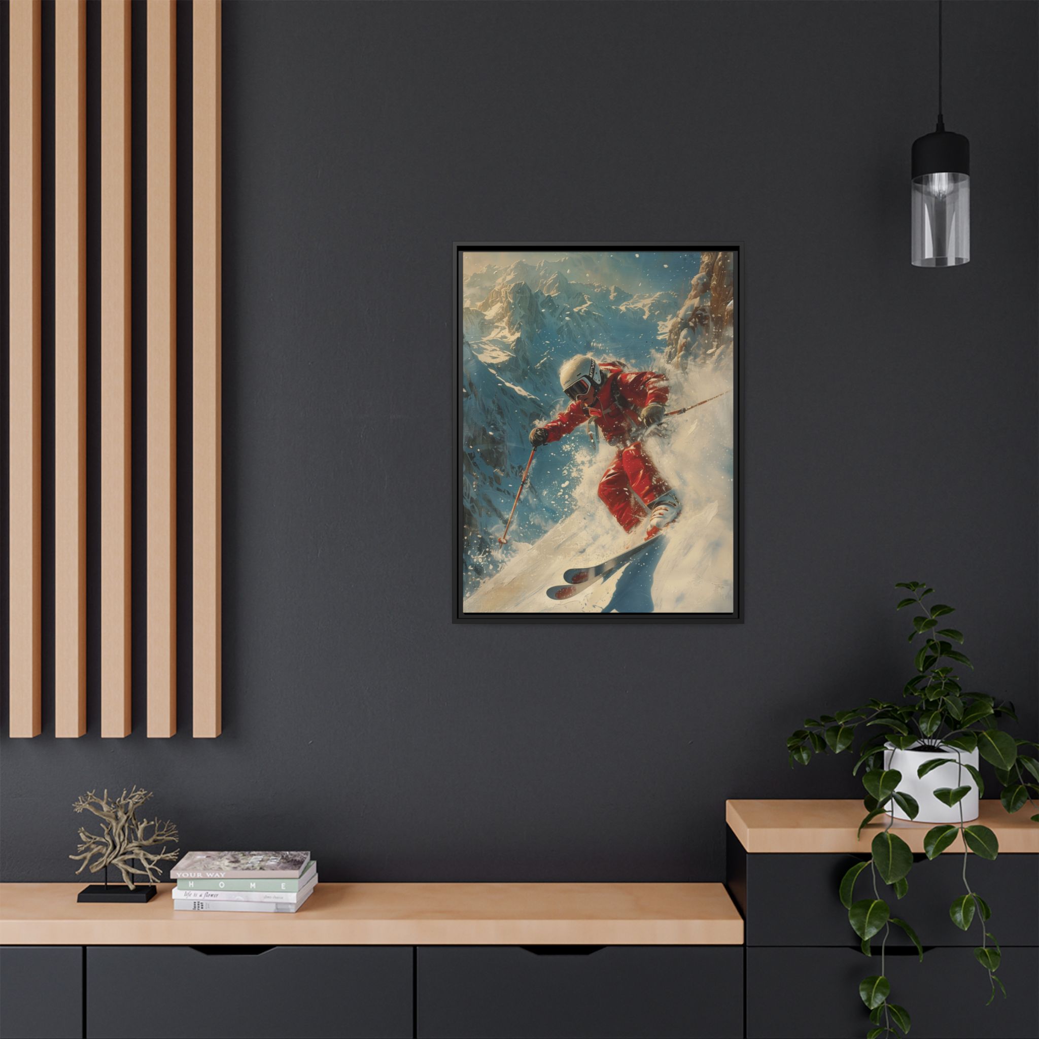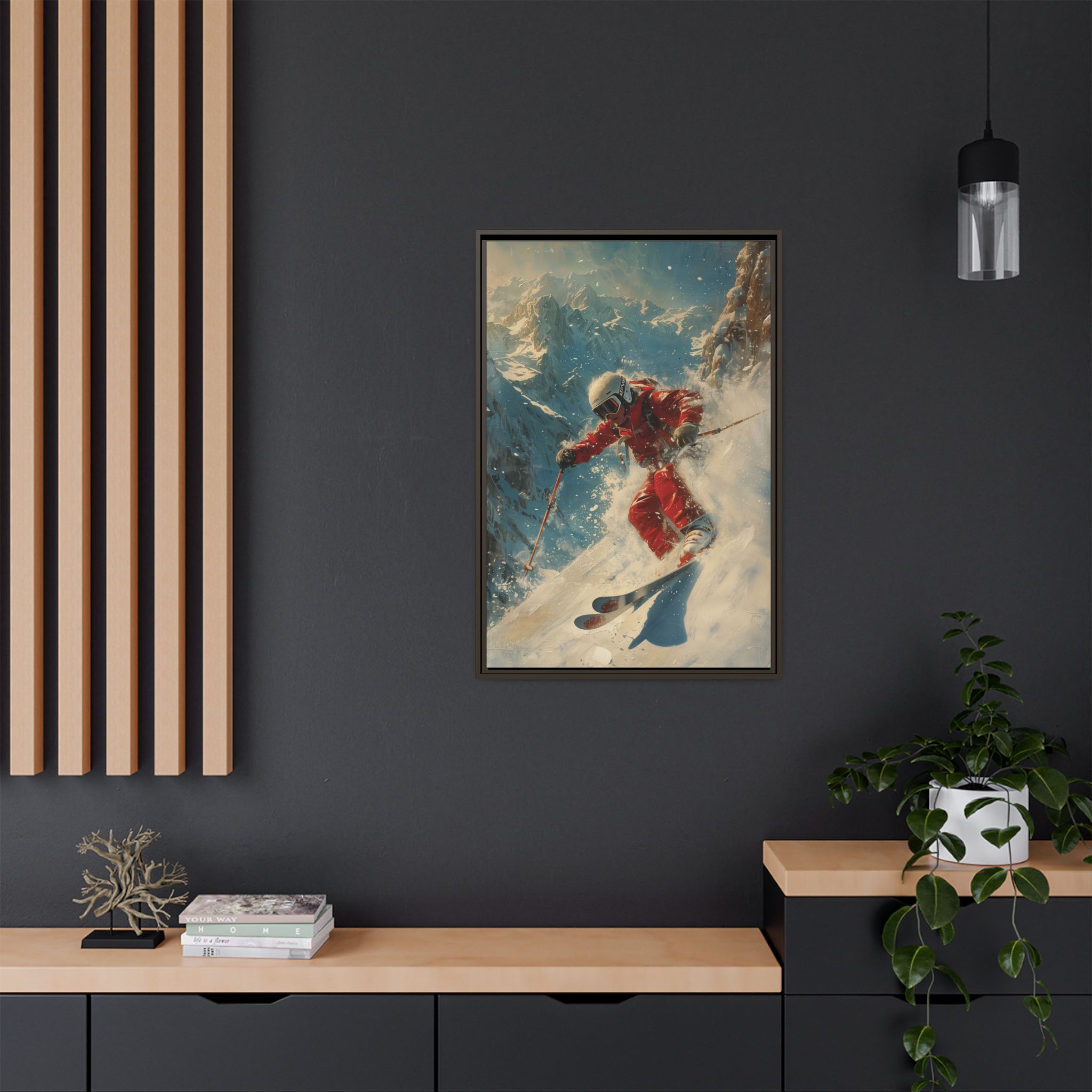 Custom digitally printed artwork on a quality canvas. .Every print in a black pinewood frame will look sleek and beautiful in any interior. The artwork will be printed on the cotton-polyester canvas with a special proprietary coating to make sure it stays vibrant for ages. Environmentally-conscious – it’s made from sustainably sourced materials (Forest Stewardship Council certified) and custom printed on demand no warehouse stocks and no waste. Choose between the designer specified sizes. The sawtooth hanging hardware is already attached.