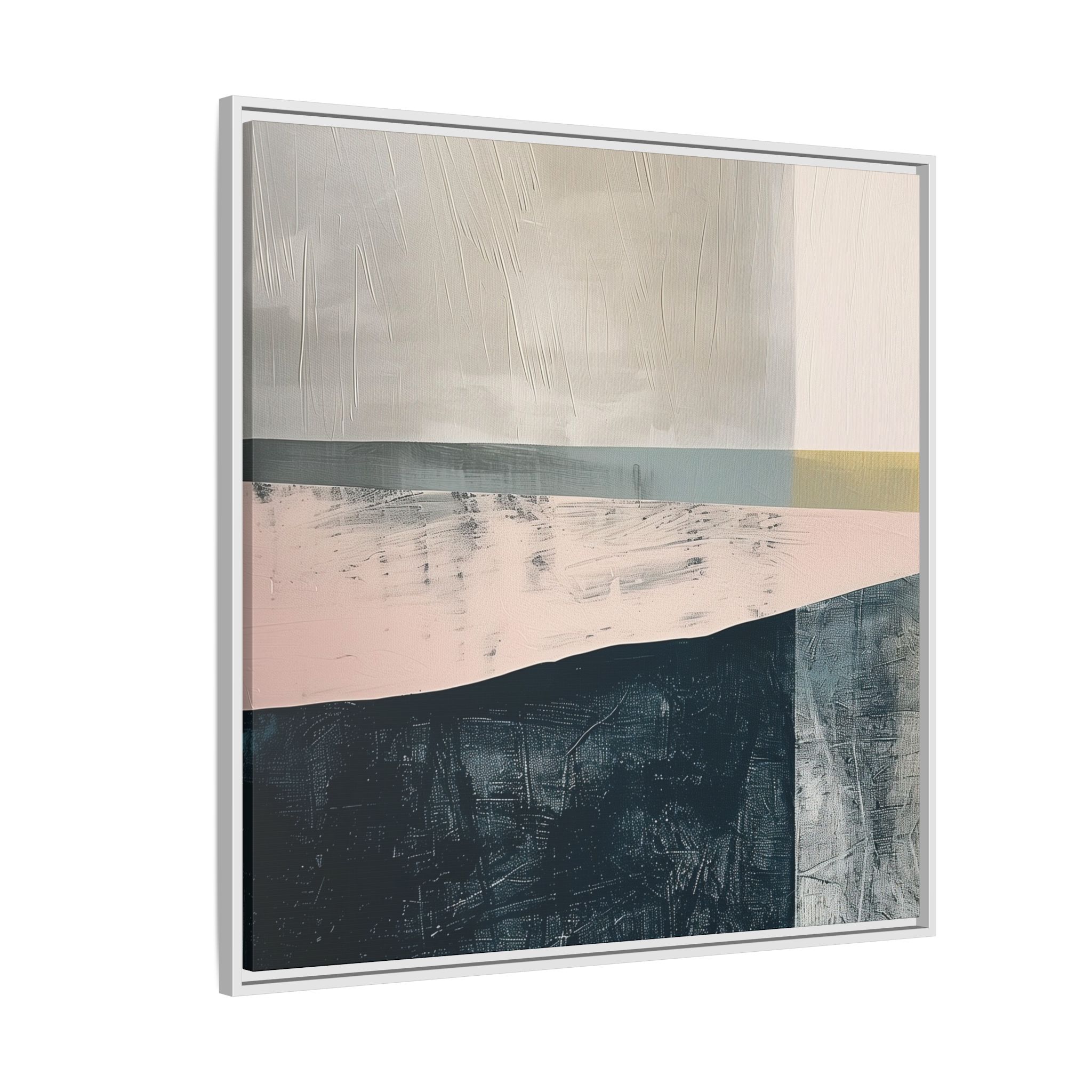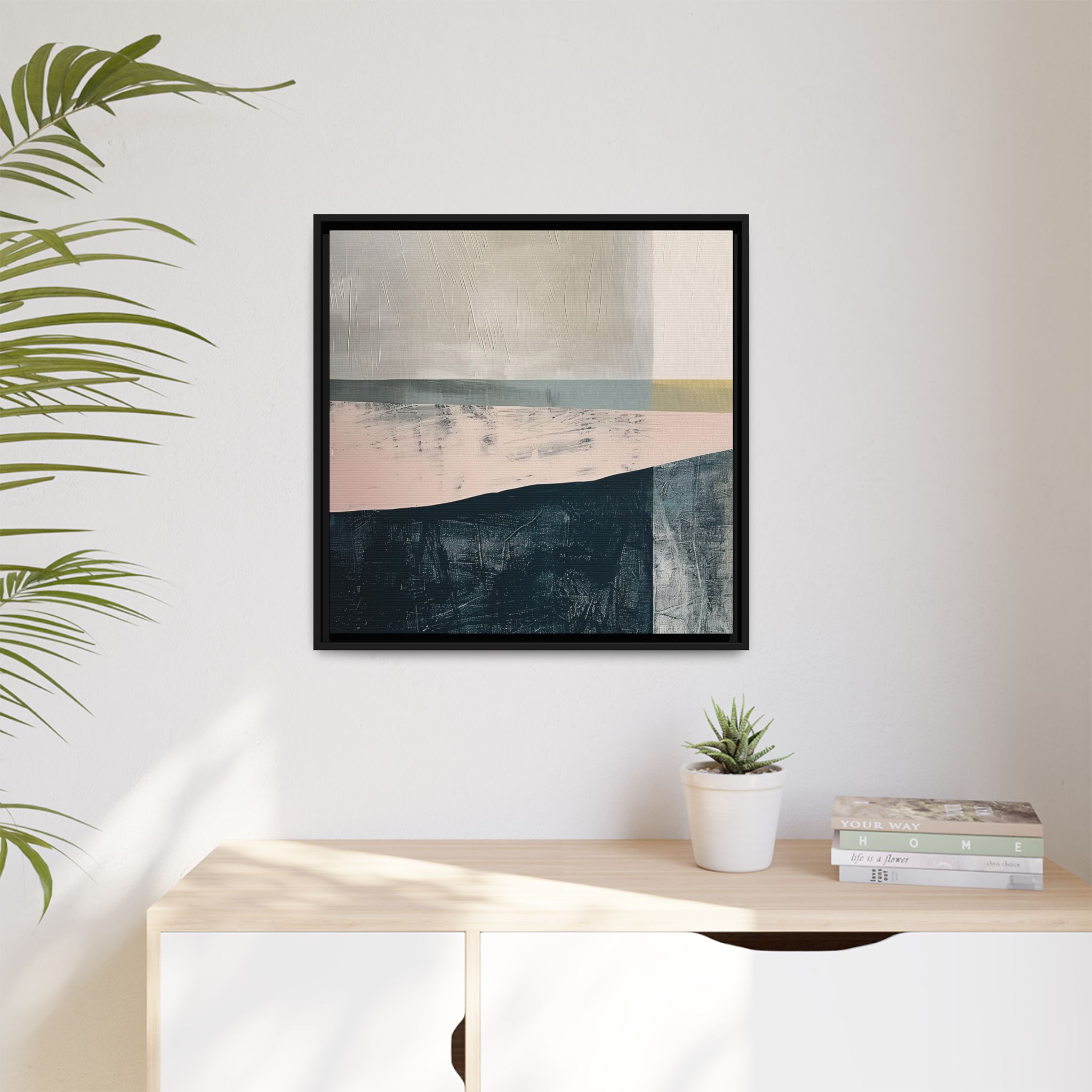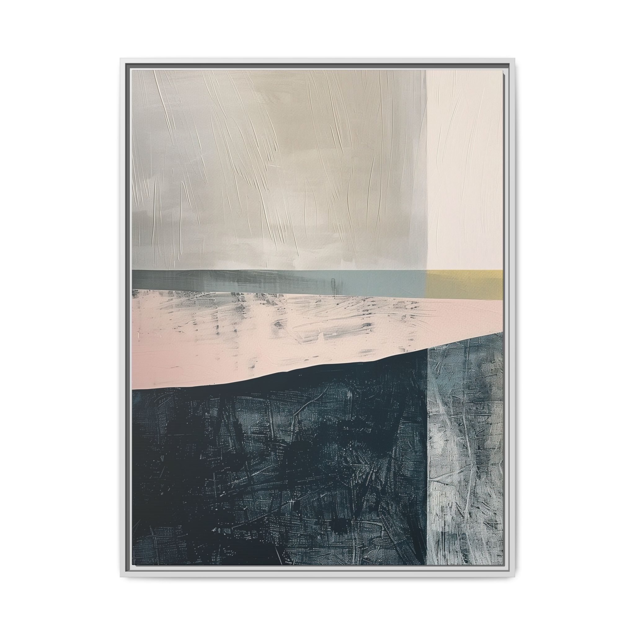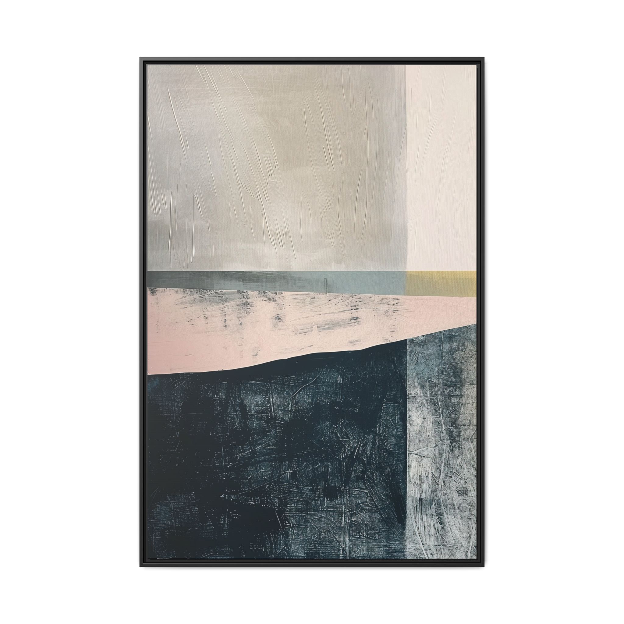 A minimalist art canvas featuring shapes and lines in a palette of pink, grey, navy blue, and white, creating a serene and modern abstract vibe. Perfect for adding a touch of sophistication to any room, this canvas is relevant for home decor enthusiasts, art lovers, and those looking to elevate their space. Ideal for gifting during birthdays, housewarmings, or as a special treat for yourself.