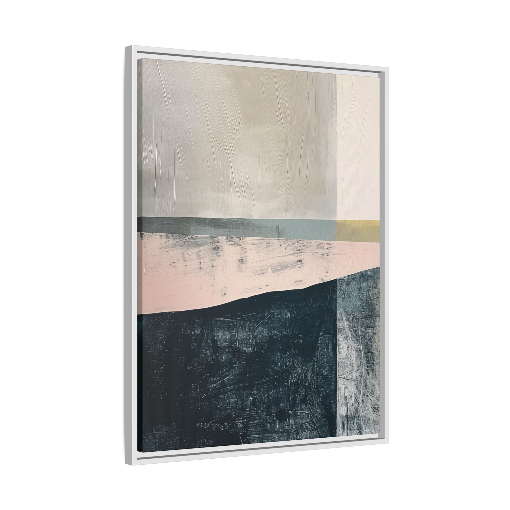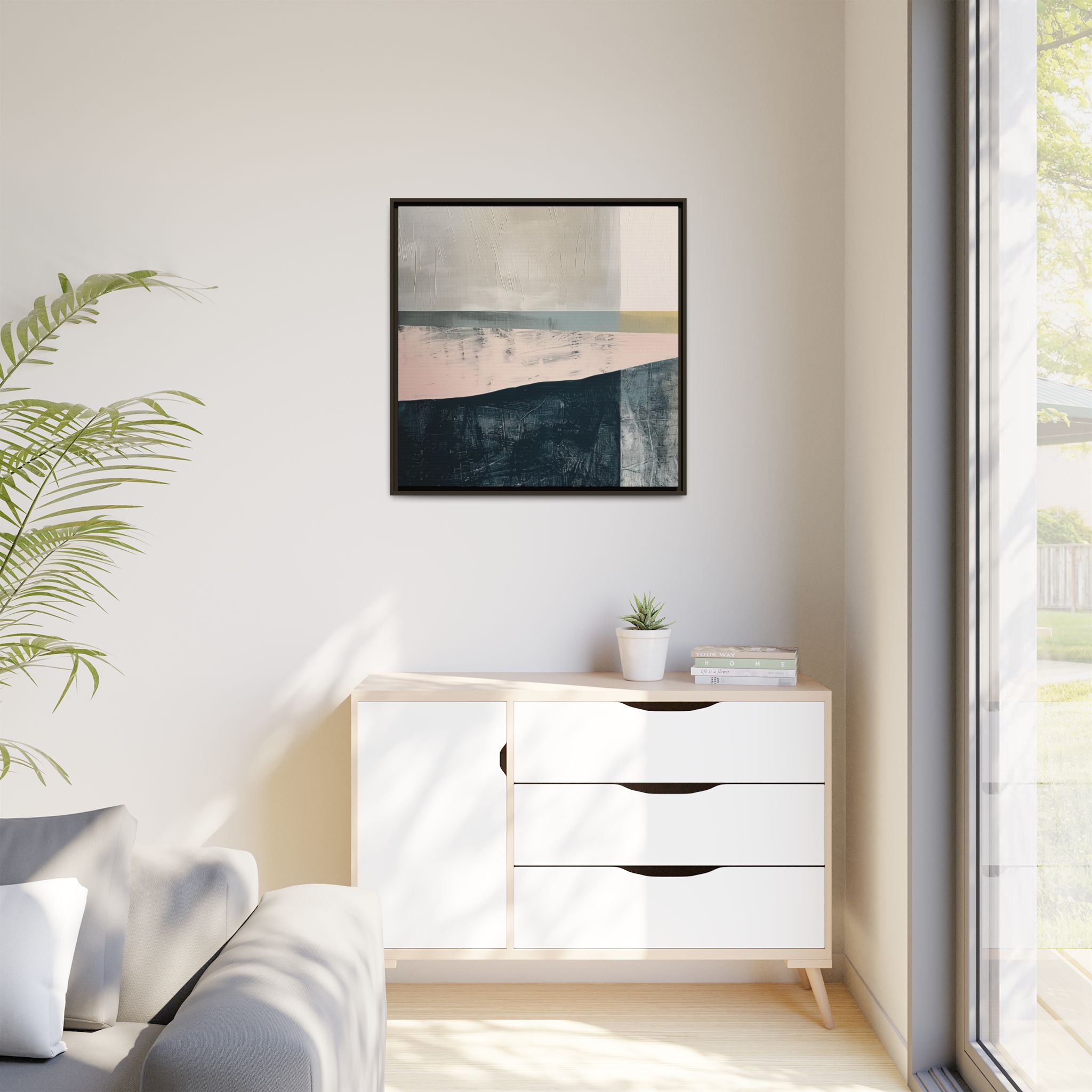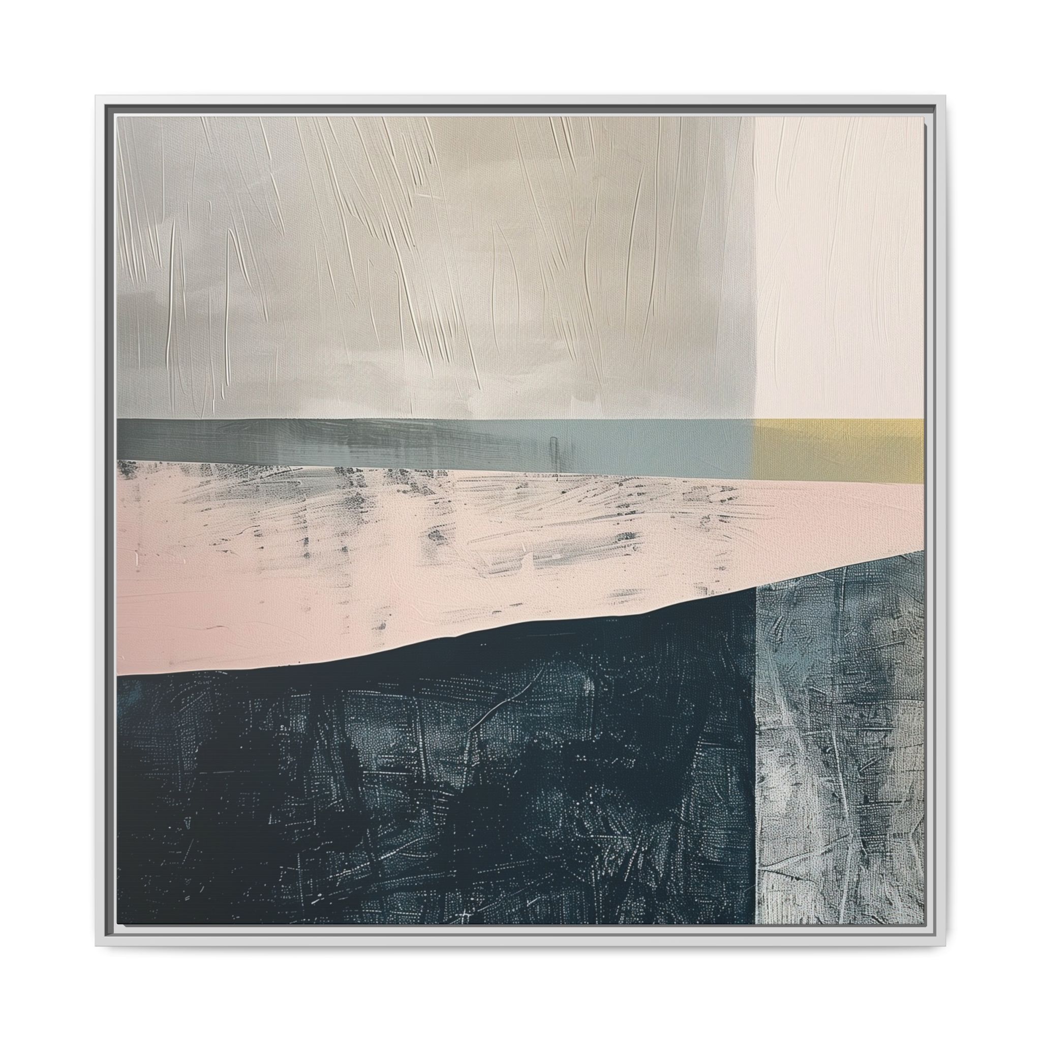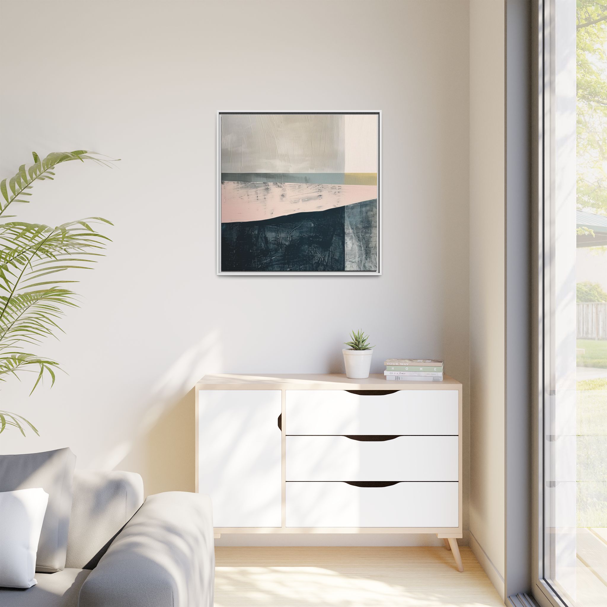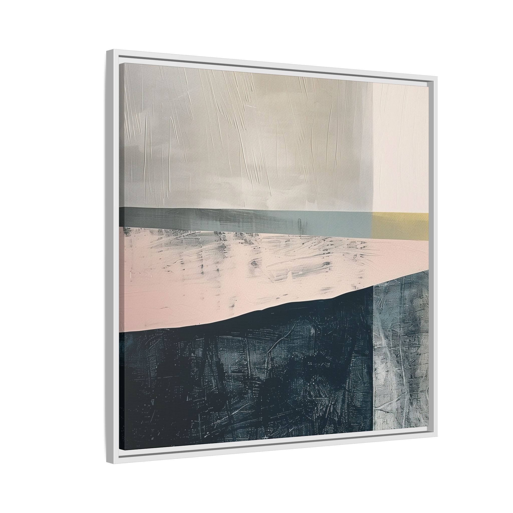 A minimalist art canvas featuring shapes and lines in a palette of pink, grey, navy blue, and white, creating a serene and modern abstract vibe. Perfect for adding a touch of sophistication to any room, this canvas is relevant for home decor enthusiasts, art lovers, and those looking to elevate their space. Ideal for gifting during birthdays, housewarmings, or as a special treat for yourself.