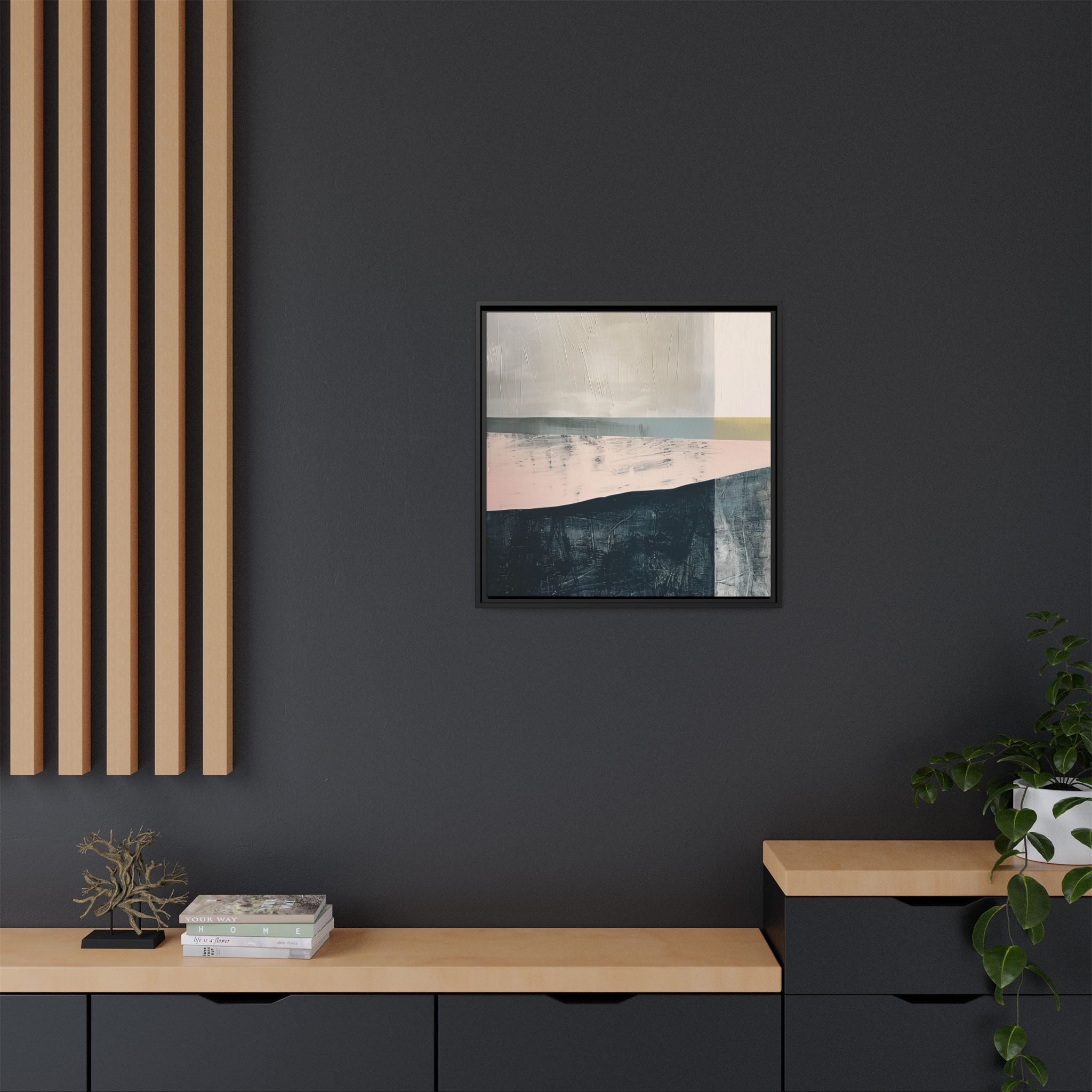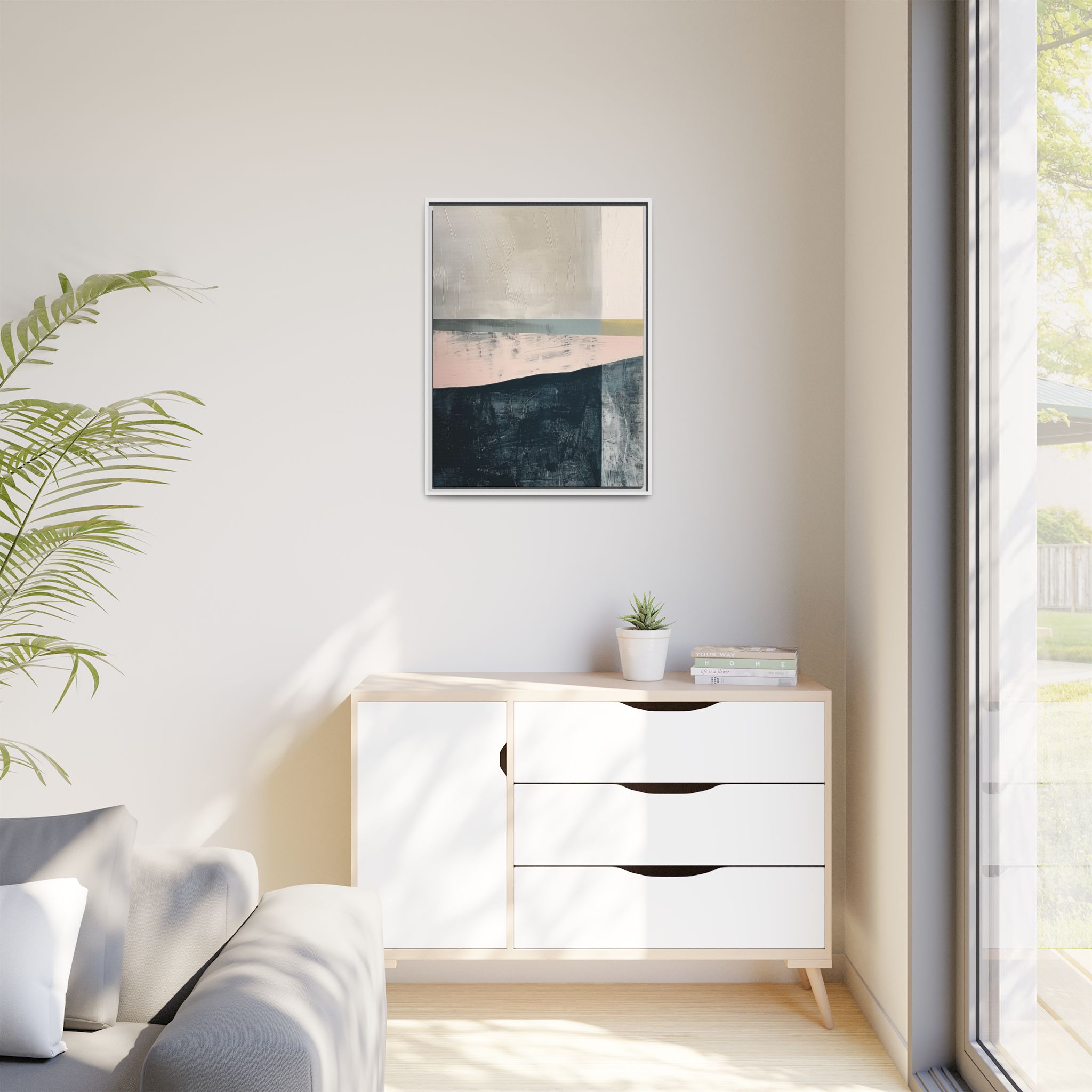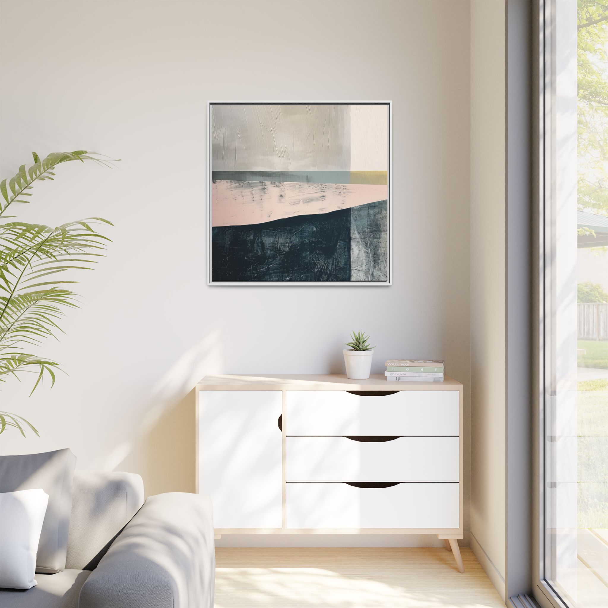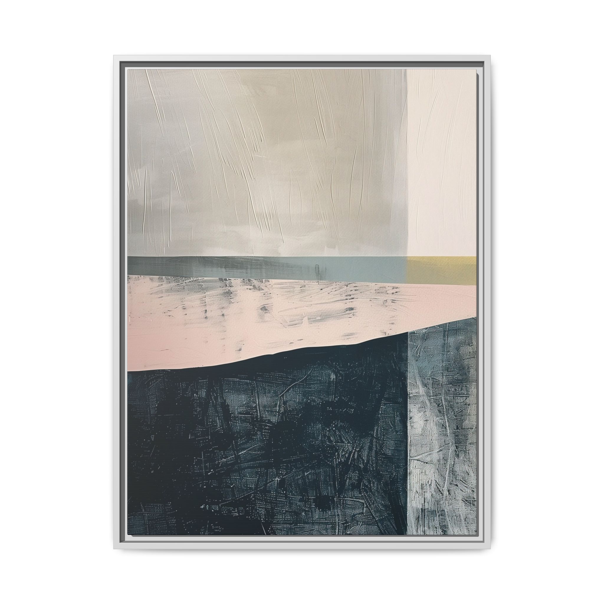 A minimalist art canvas featuring shapes and lines in a palette of pink, grey, navy blue, and white, creating a serene and modern abstract vibe. Perfect for adding a touch of sophistication to any room, this canvas is relevant for home decor enthusiasts, art lovers, and those looking to elevate their space. Ideal for gifting during birthdays, housewarmings, or as a special treat for yourself.