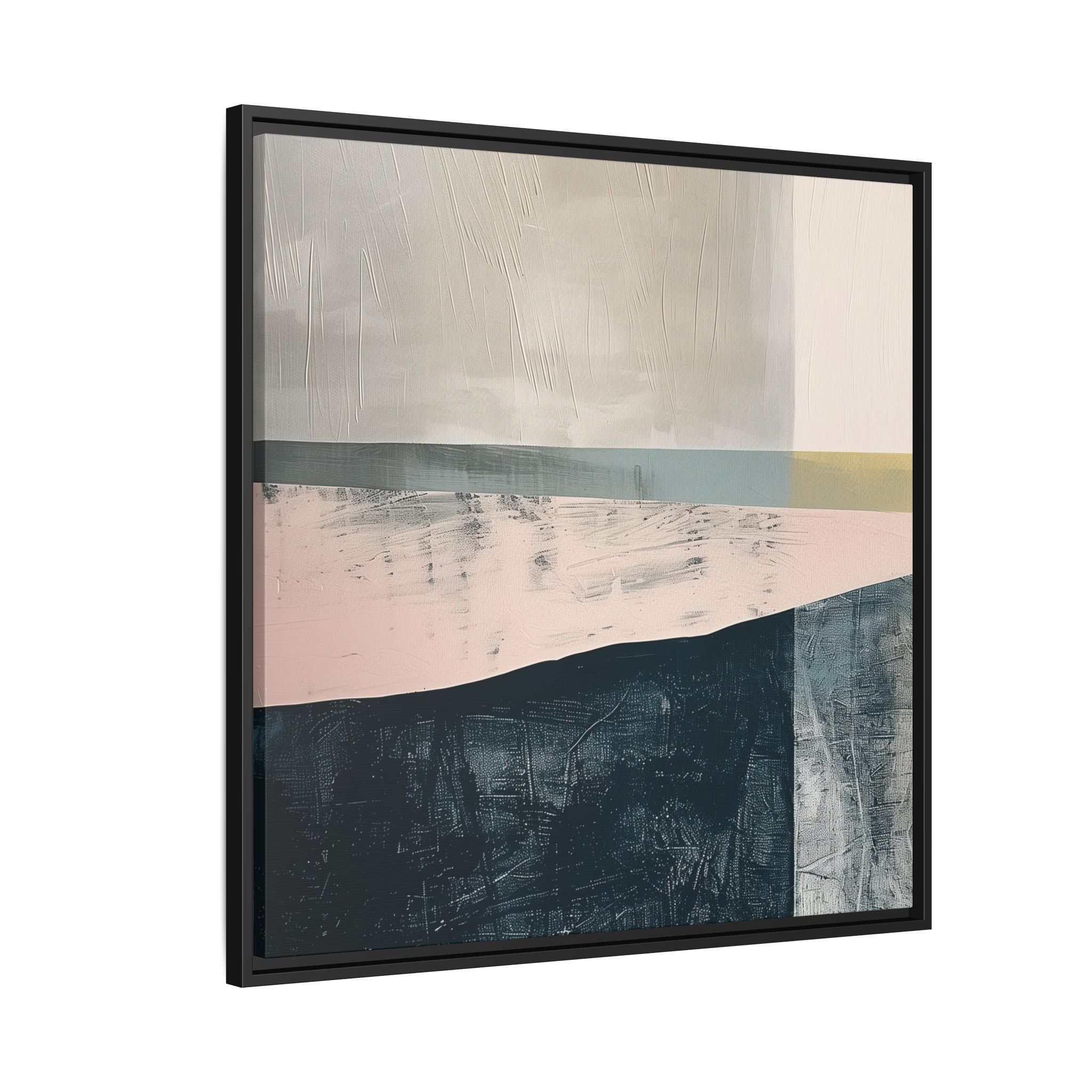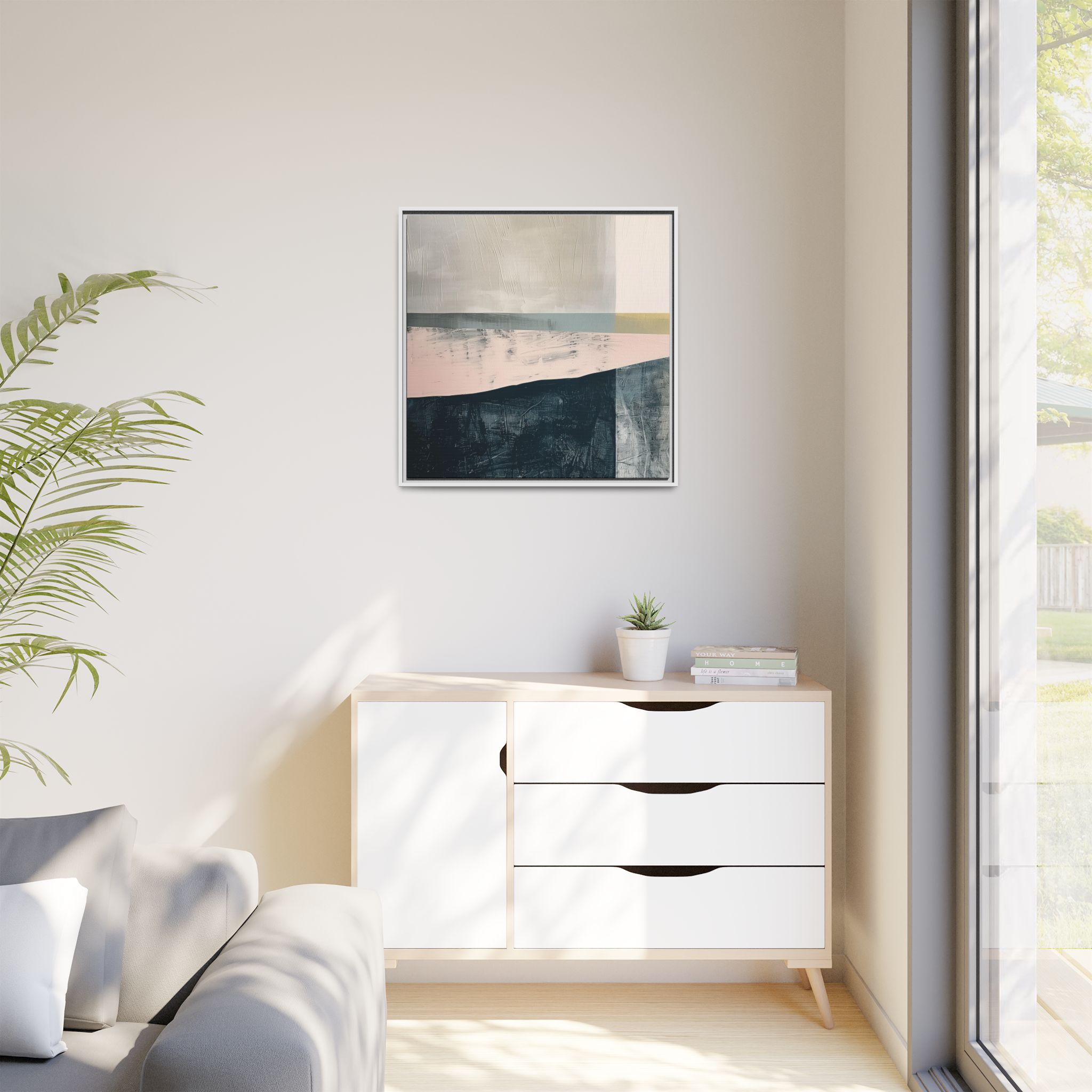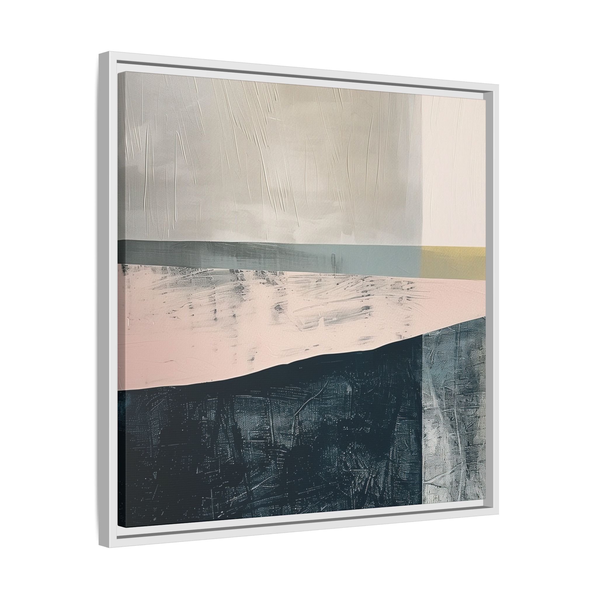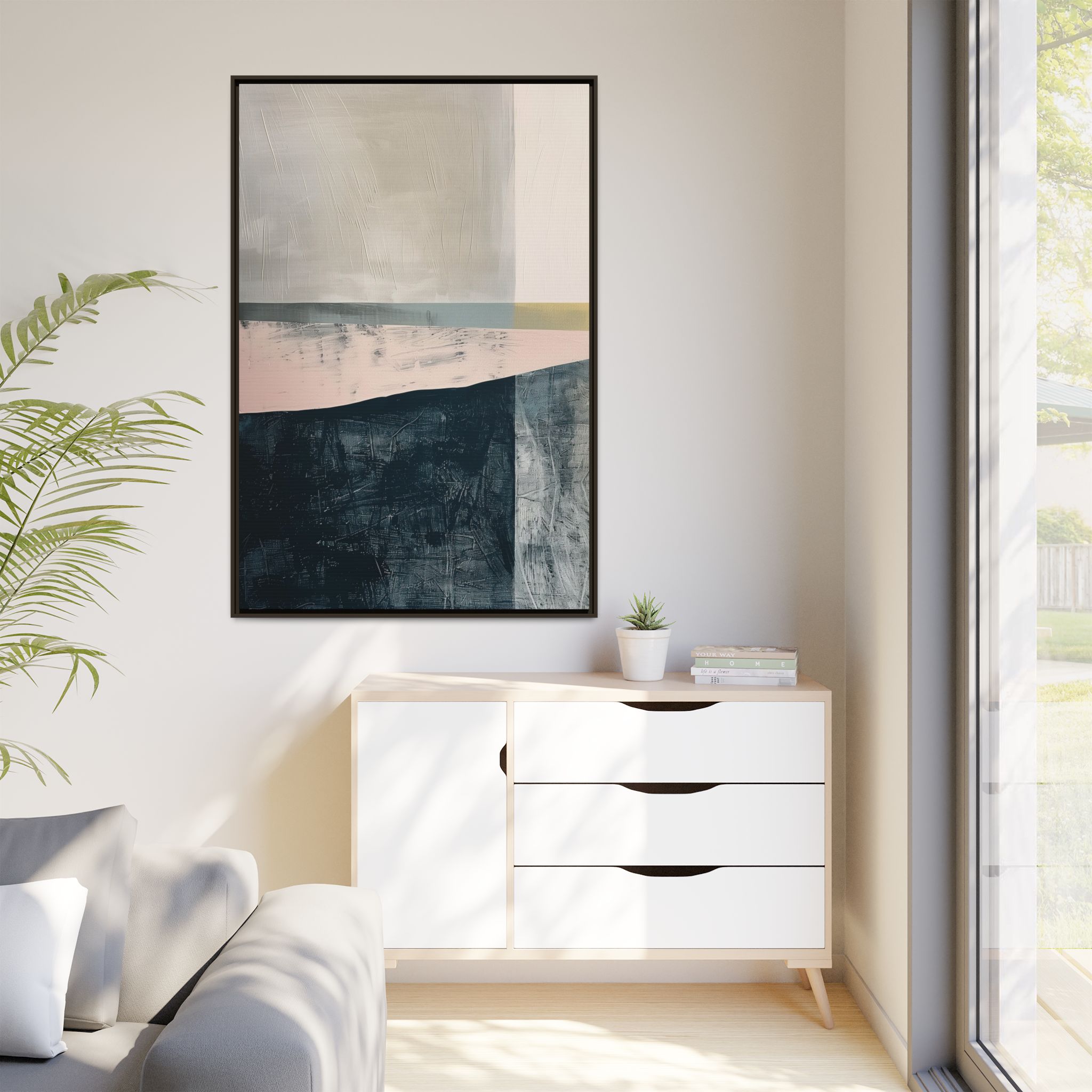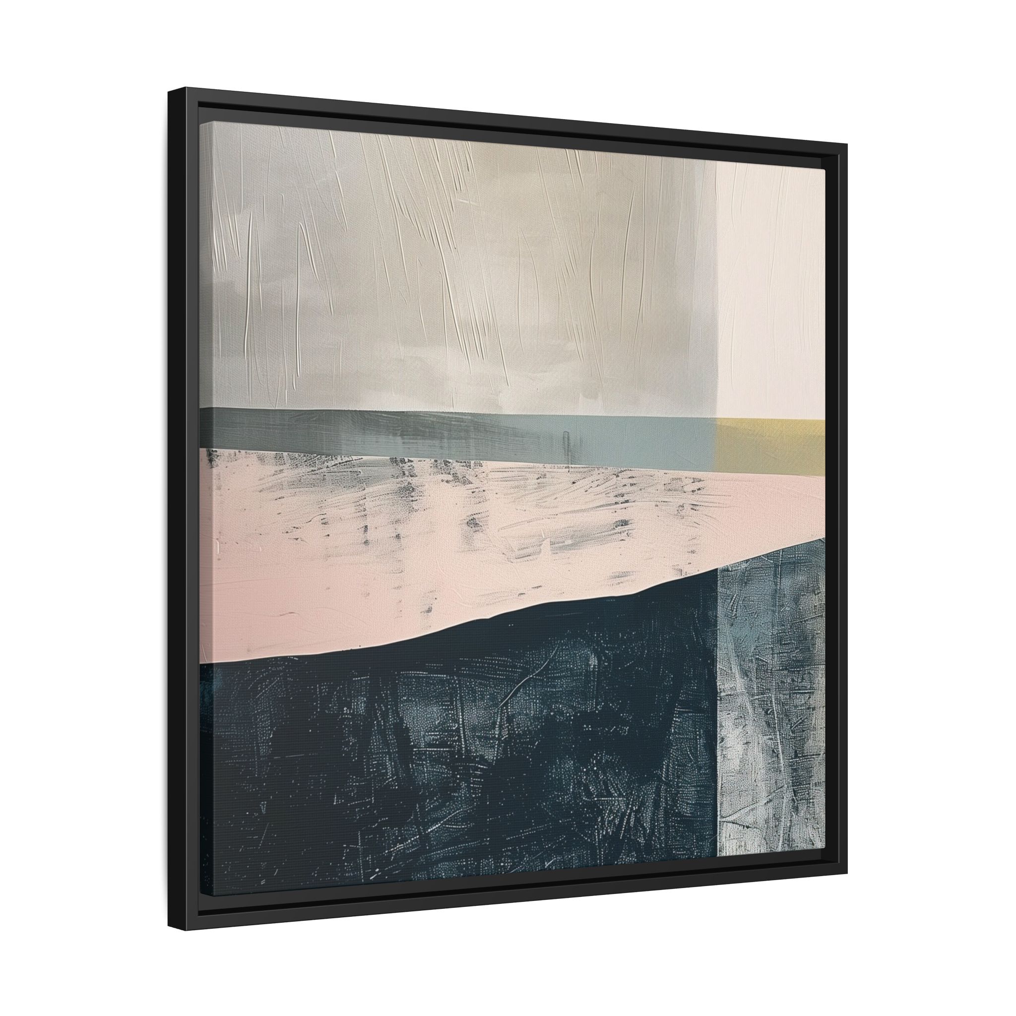 A minimalist art canvas featuring shapes and lines in a palette of pink, grey, navy blue, and white, creating a serene and modern abstract vibe. Perfect for adding a touch of sophistication to any room, this canvas is relevant for home decor enthusiasts, art lovers, and those looking to elevate their space. Ideal for gifting during birthdays, housewarmings, or as a special treat for yourself.