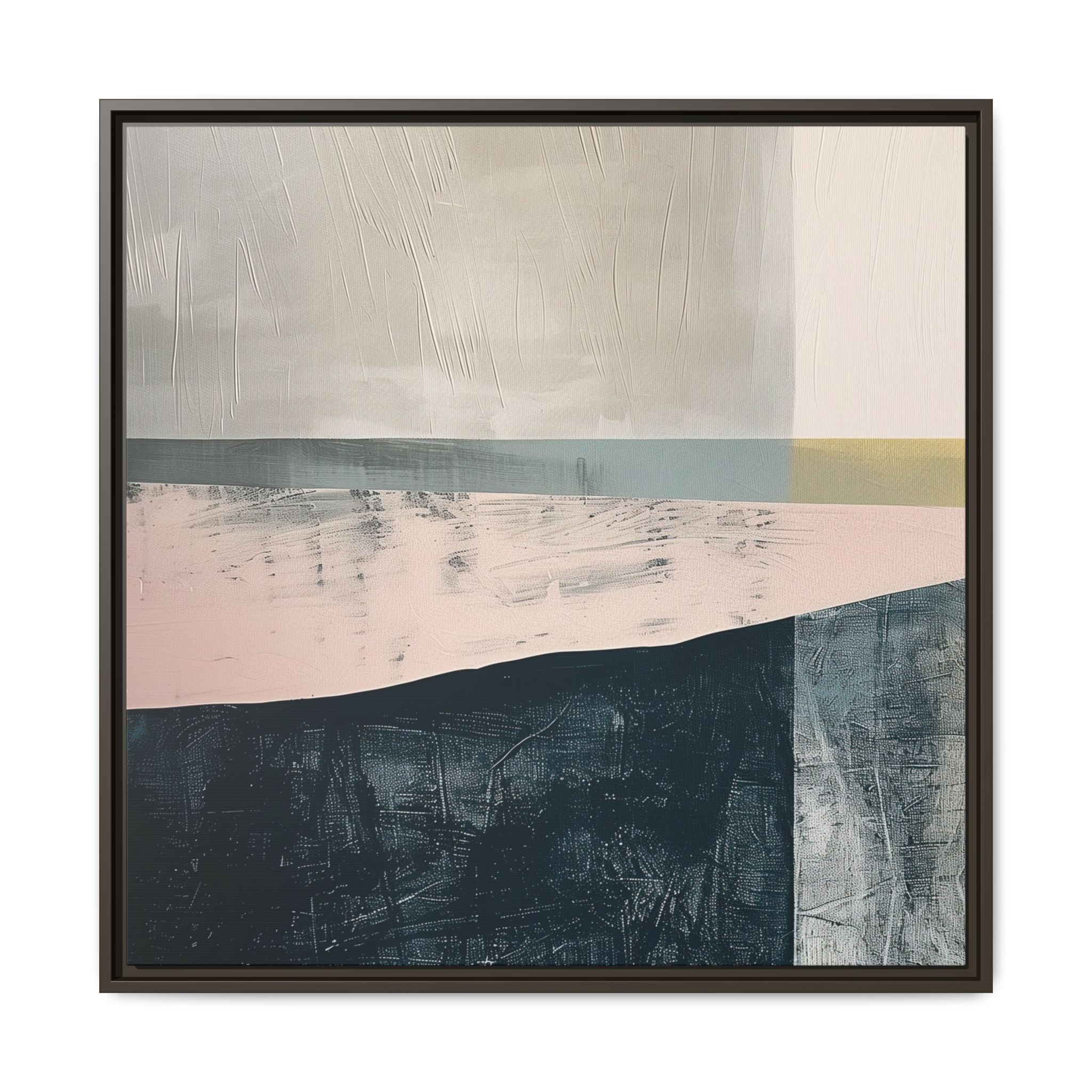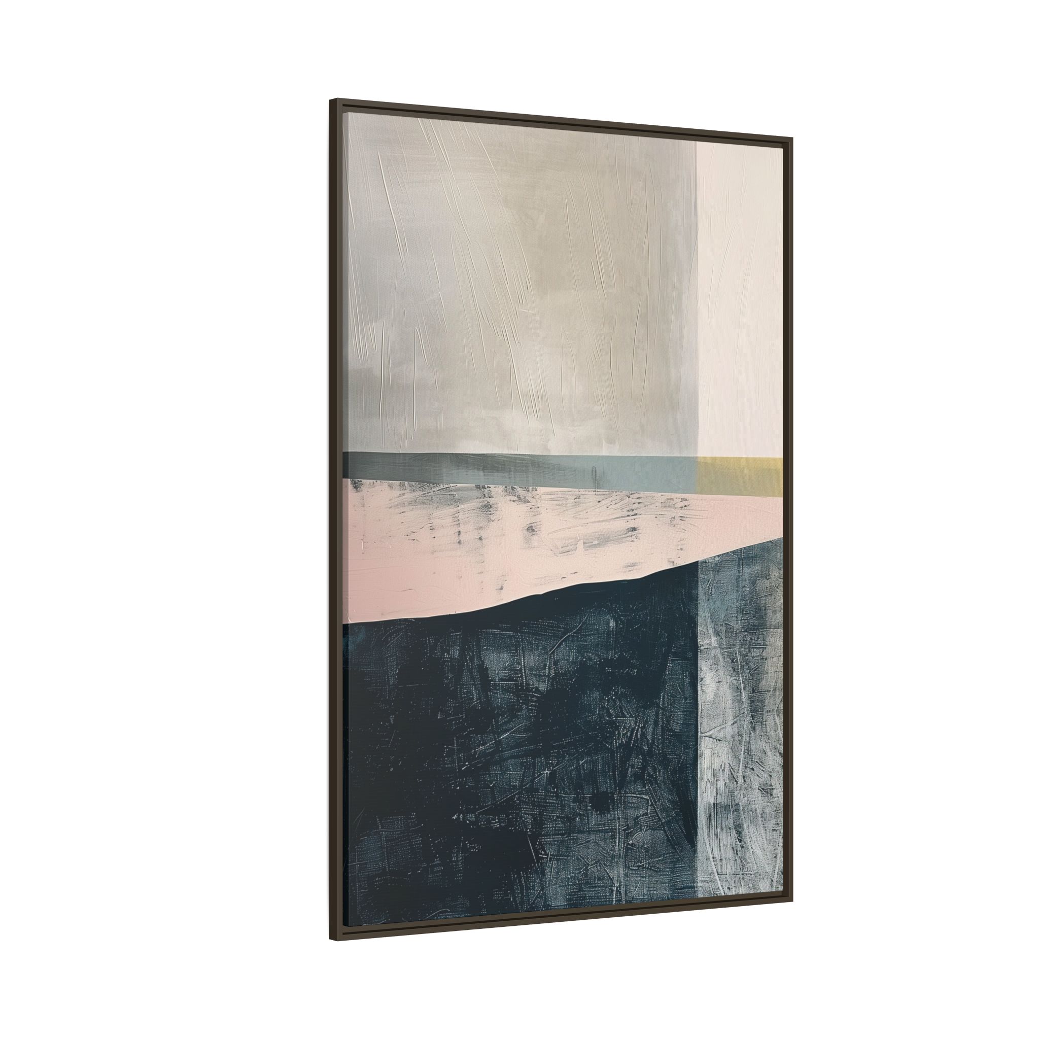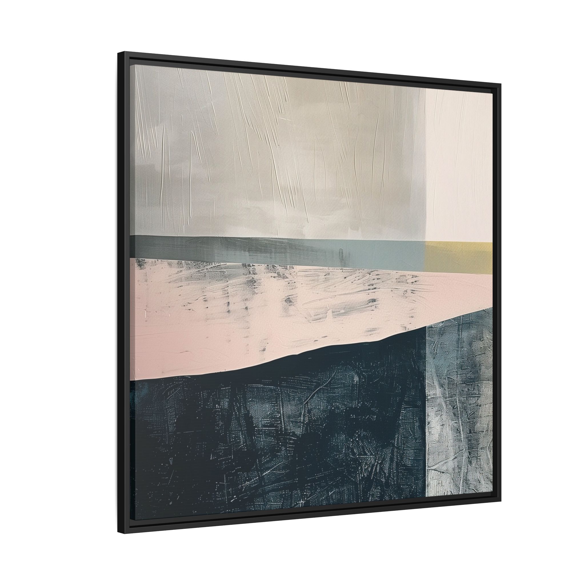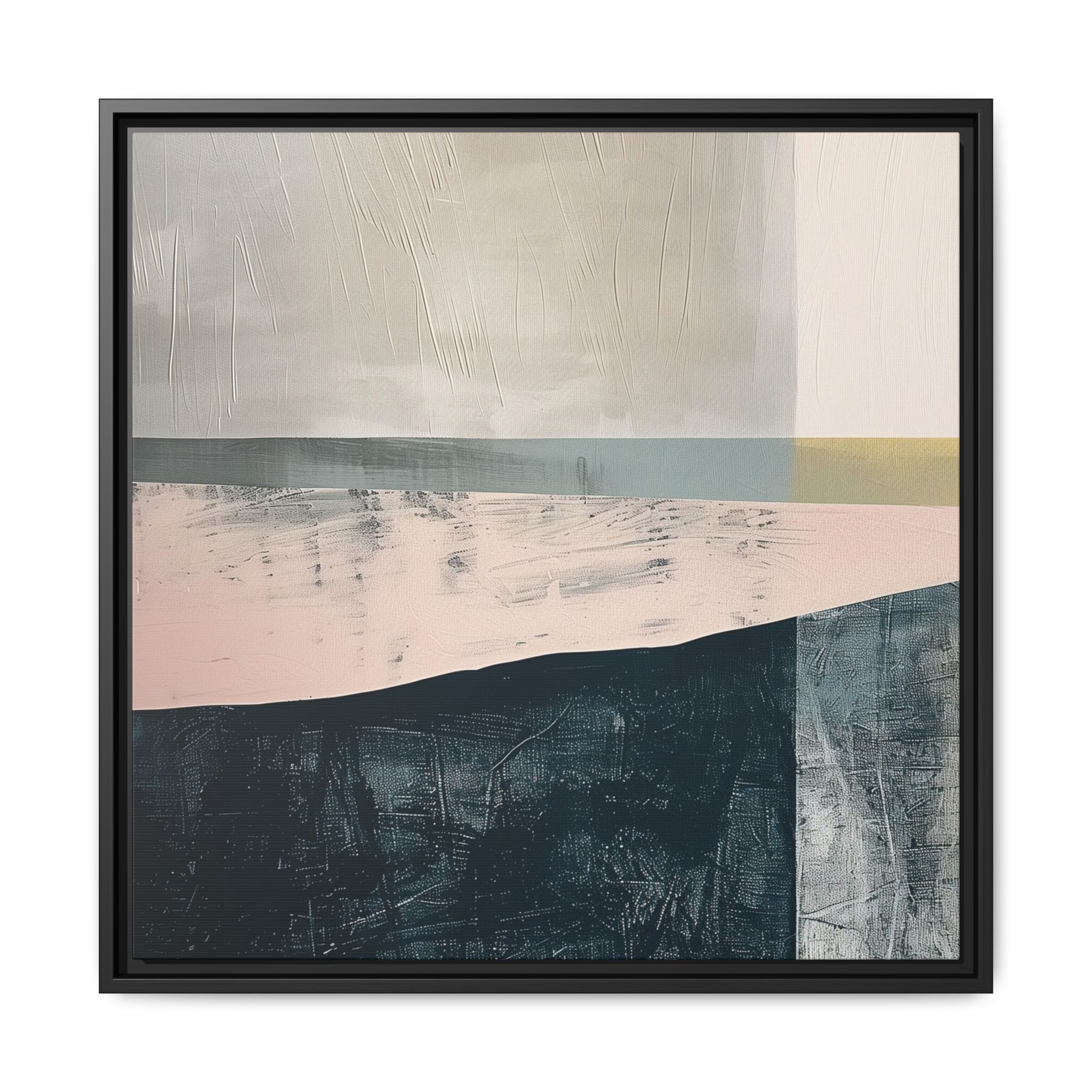 A minimalist art canvas featuring shapes and lines in a palette of pink, grey, navy blue, and white, creating a serene and modern abstract vibe. Perfect for adding a touch of sophistication to any room, this canvas is relevant for home decor enthusiasts, art lovers, and those looking to elevate their space. Ideal for gifting during birthdays, housewarmings, or as a special treat for yourself.