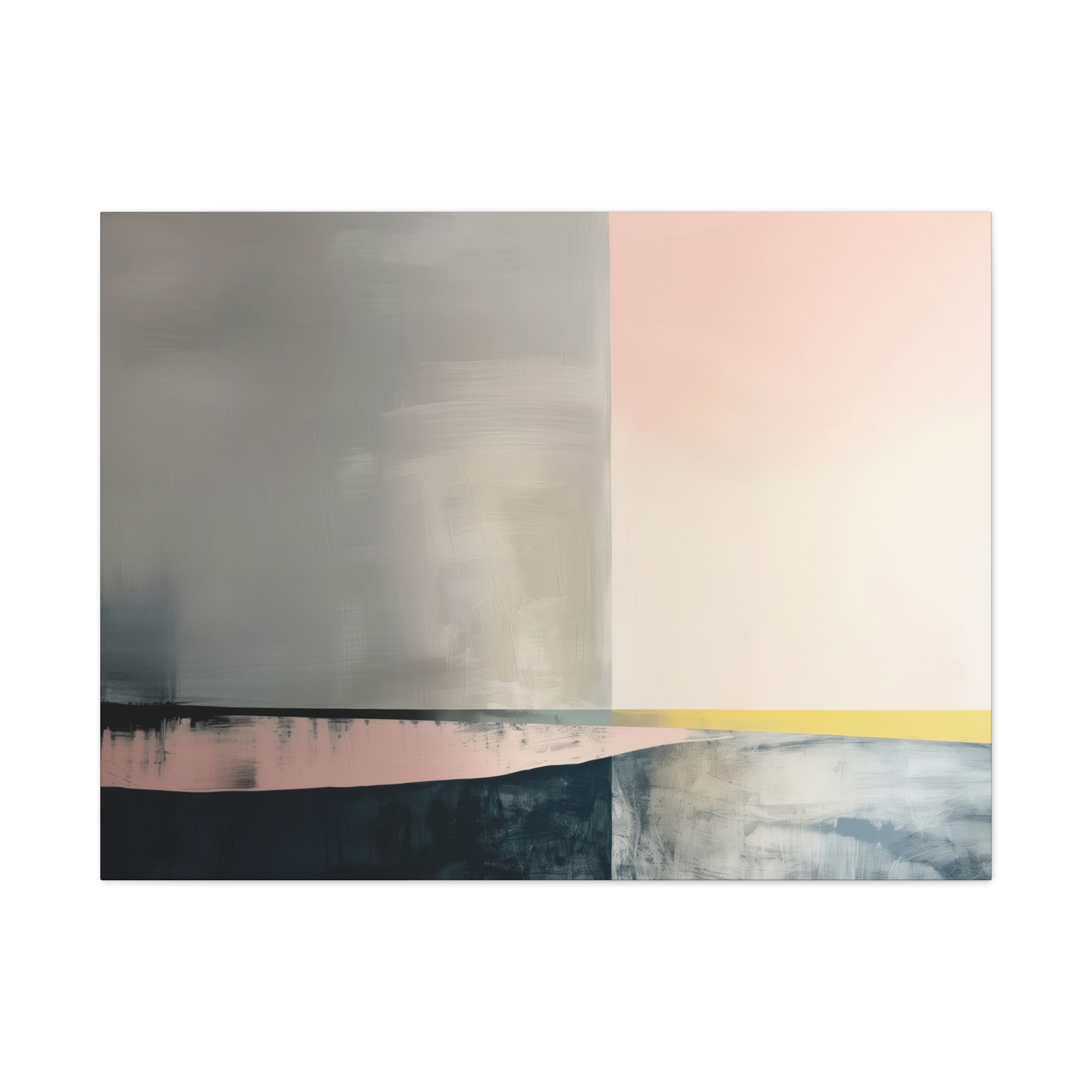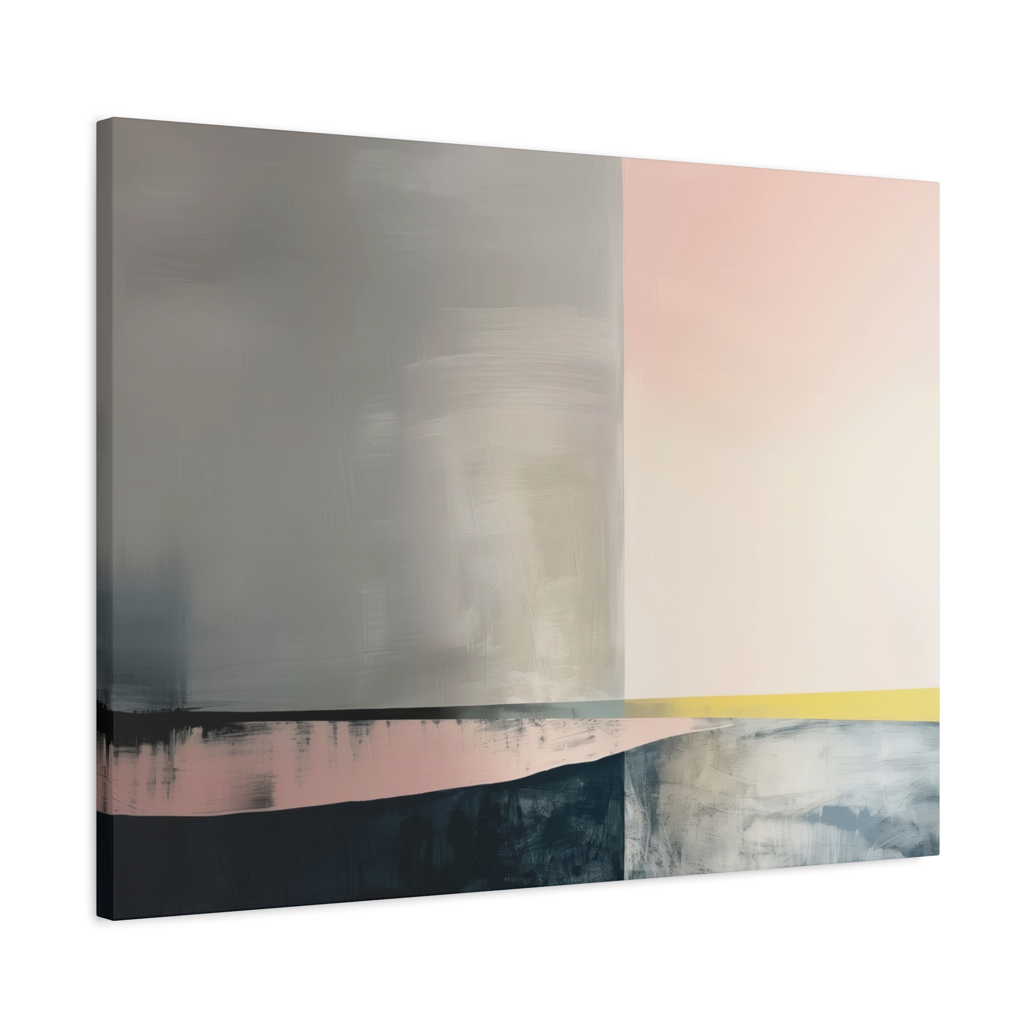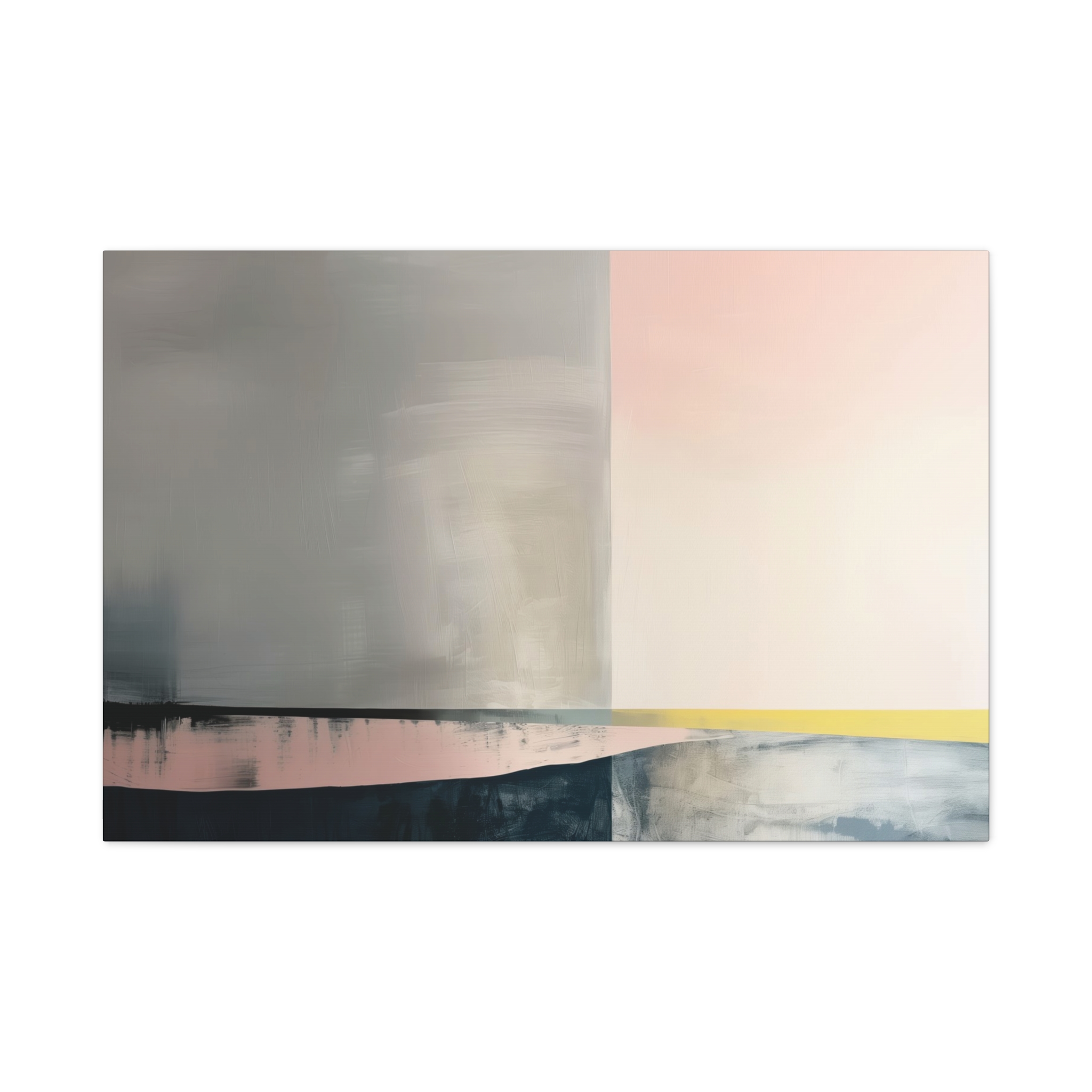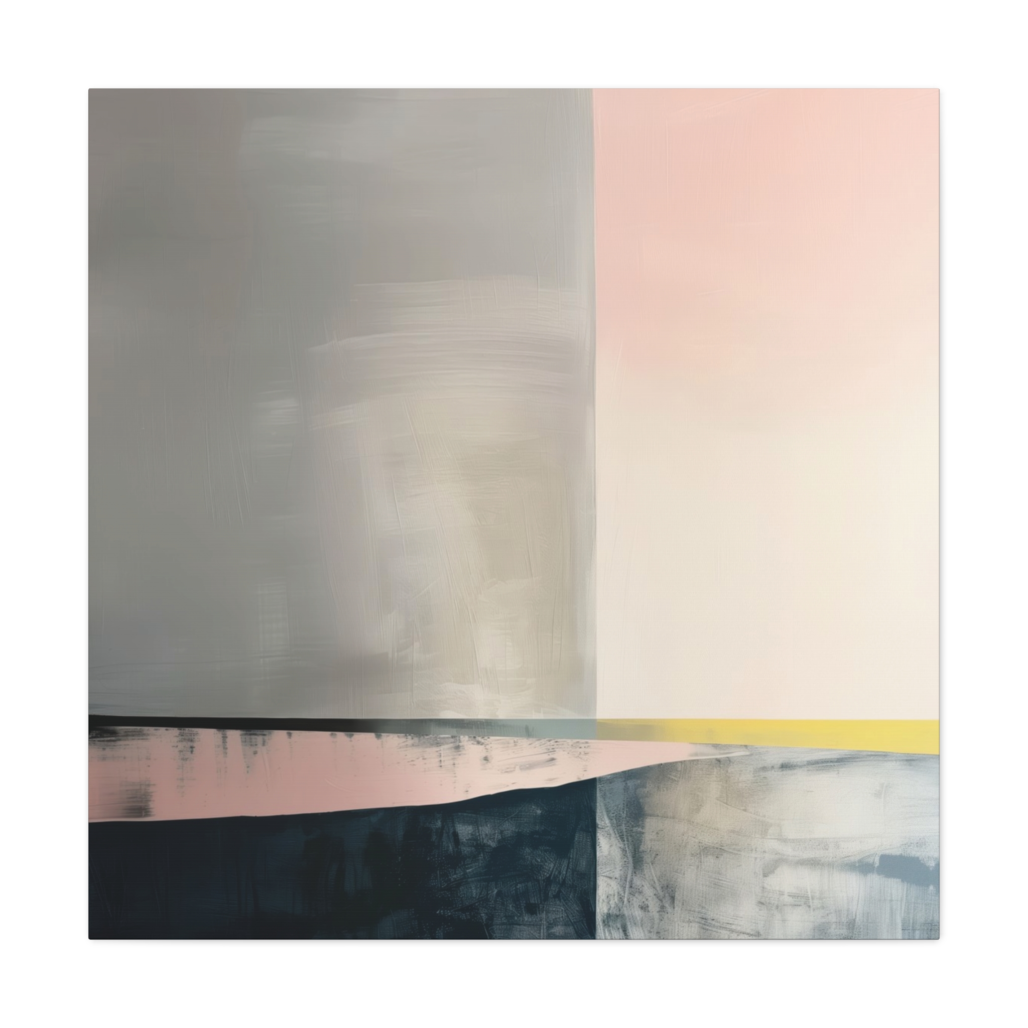 A minimalist art canvas featuring shapes and lines in a palette of pink, grey, navy blue, and white, creating a serene and modern abstract vibe. Perfect for adding a touch of sophistication to any room, this canvas is relevant for home decor enthusiasts, art lovers, and those looking to elevate their space. Ideal for gifting during birthdays, housewarmings, or as a special treat for yourself.