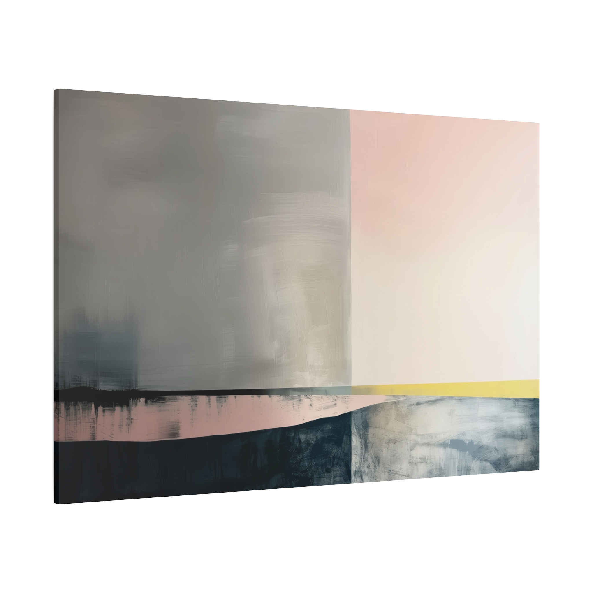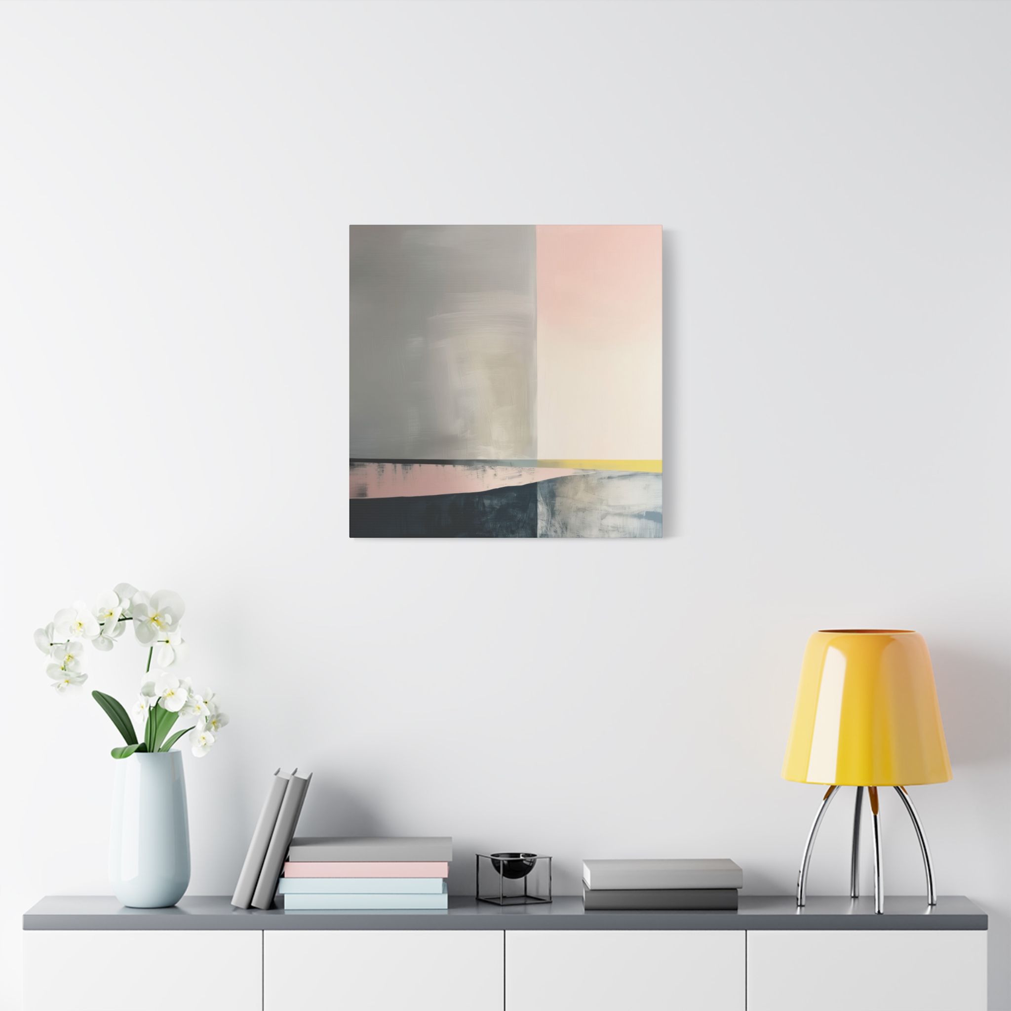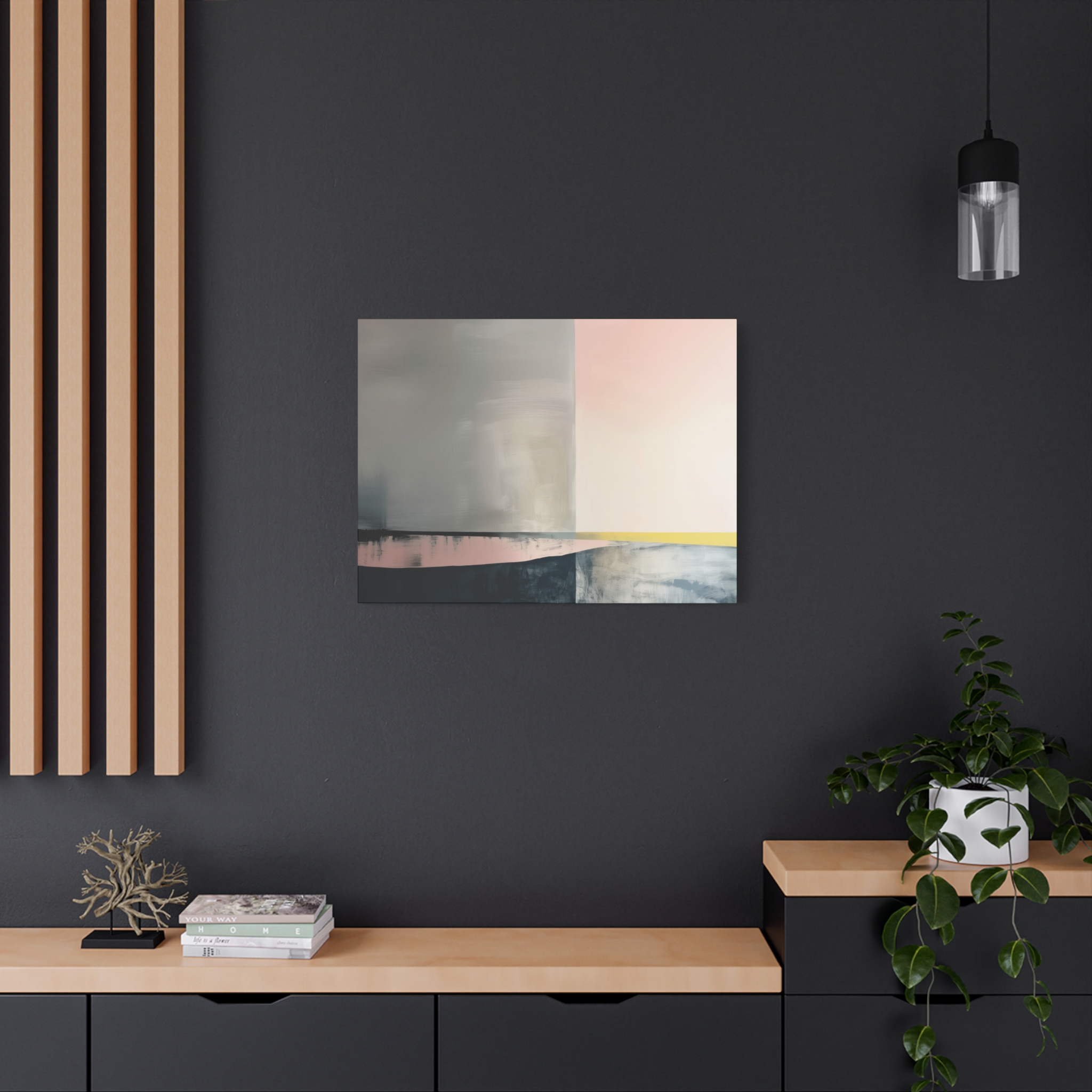 A minimalist art canvas featuring shapes and lines in a palette of pink, grey, navy blue, and white, creating a serene and modern abstract vibe. Perfect for adding a touch of sophistication to any room, this canvas is relevant for home decor enthusiasts, art lovers, and those looking to elevate their space. Ideal for gifting during birthdays, housewarmings, or as a special treat for yourself.