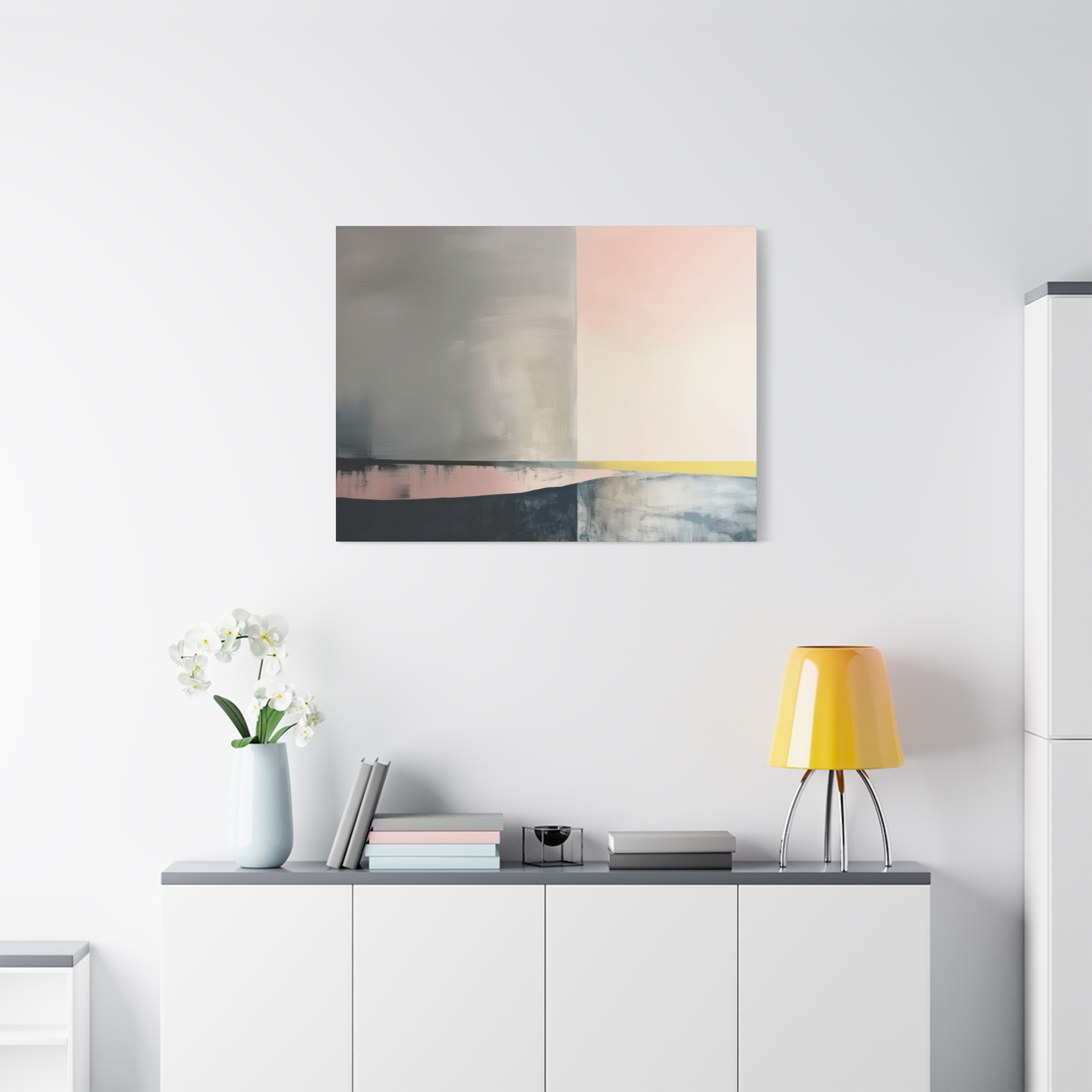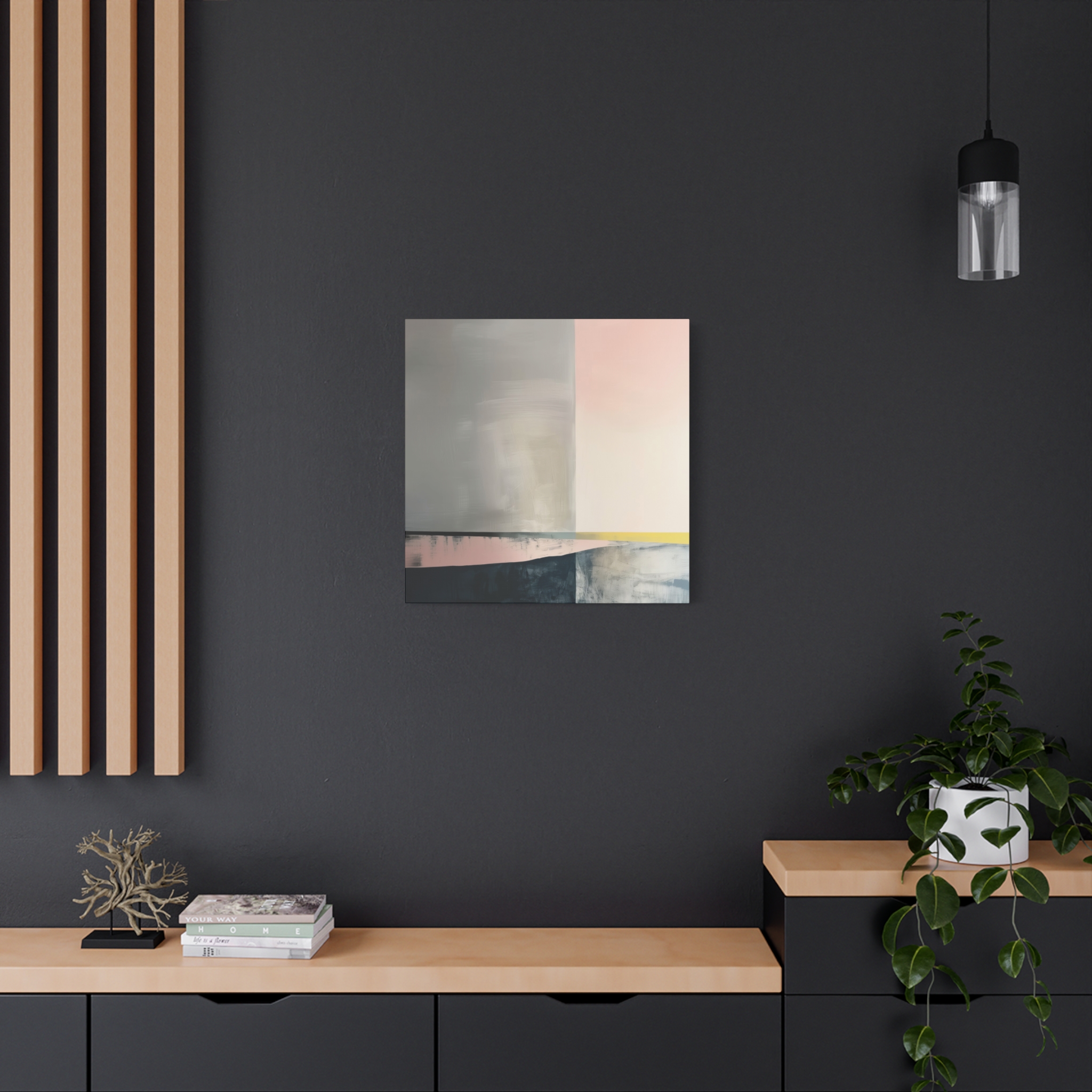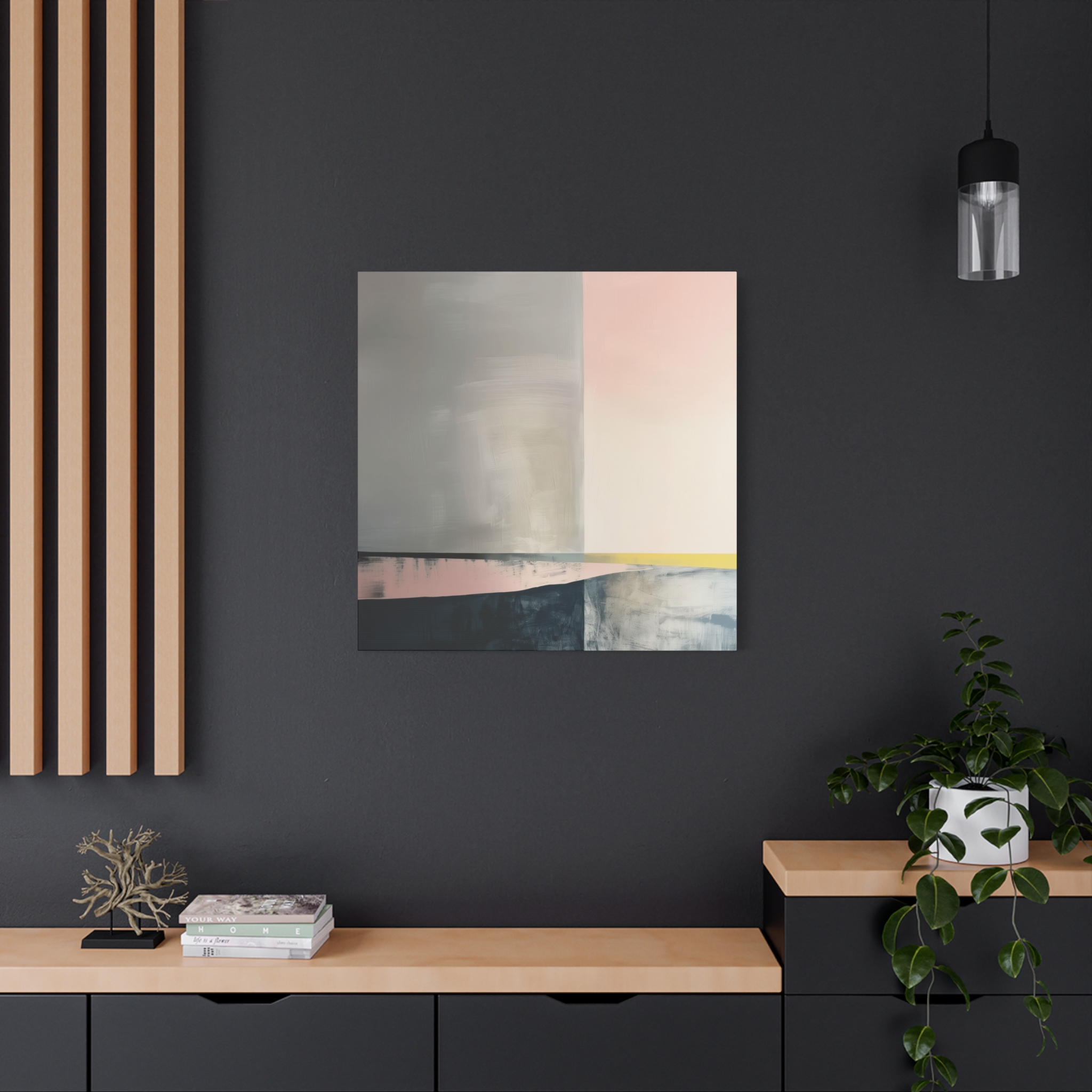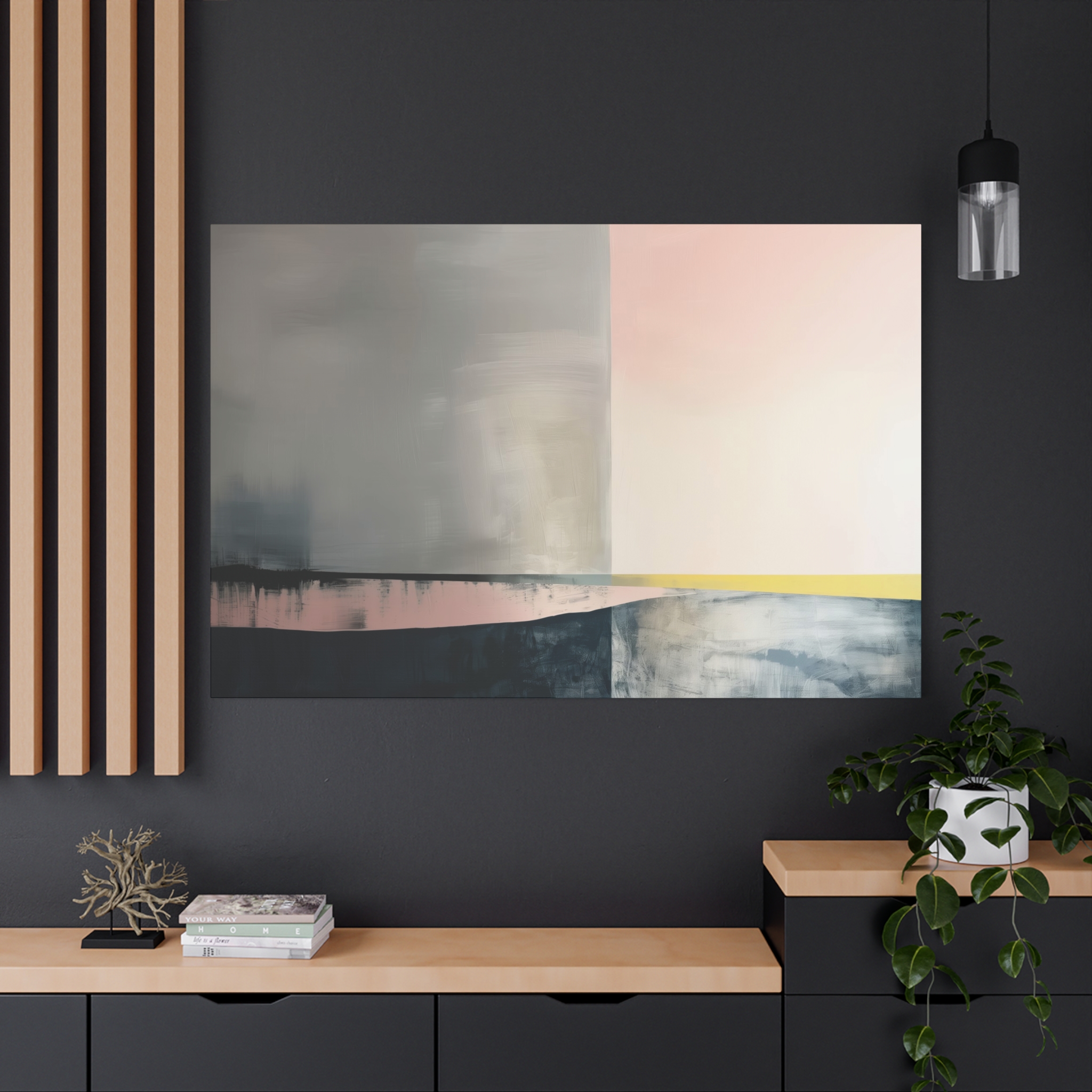 A minimalist art canvas featuring shapes and lines in a palette of pink, grey, navy blue, and white, creating a serene and modern abstract vibe. Perfect for adding a touch of sophistication to any room, this canvas is relevant for home decor enthusiasts, art lovers, and those looking to elevate their space. Ideal for gifting during birthdays, housewarmings, or as a special treat for yourself.
