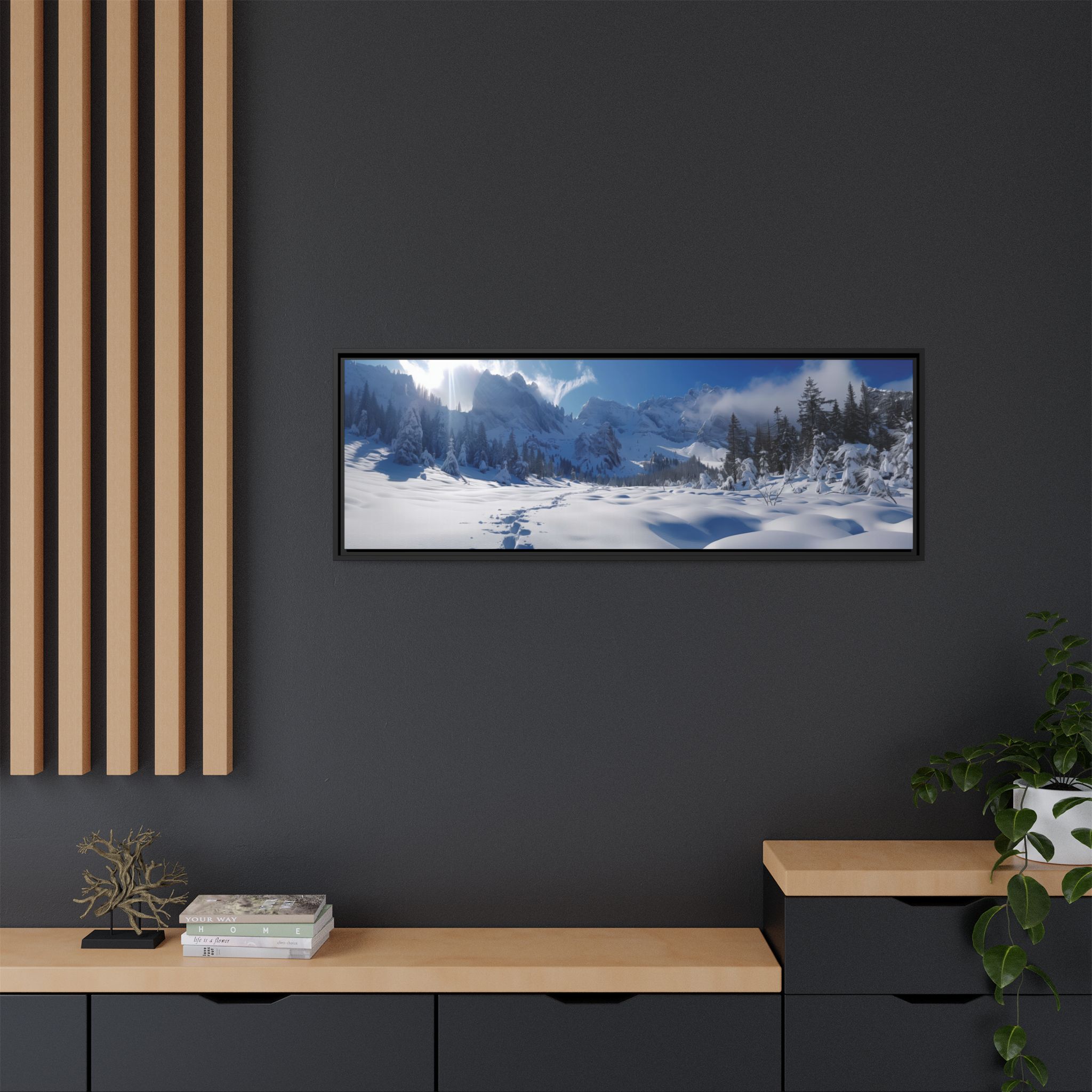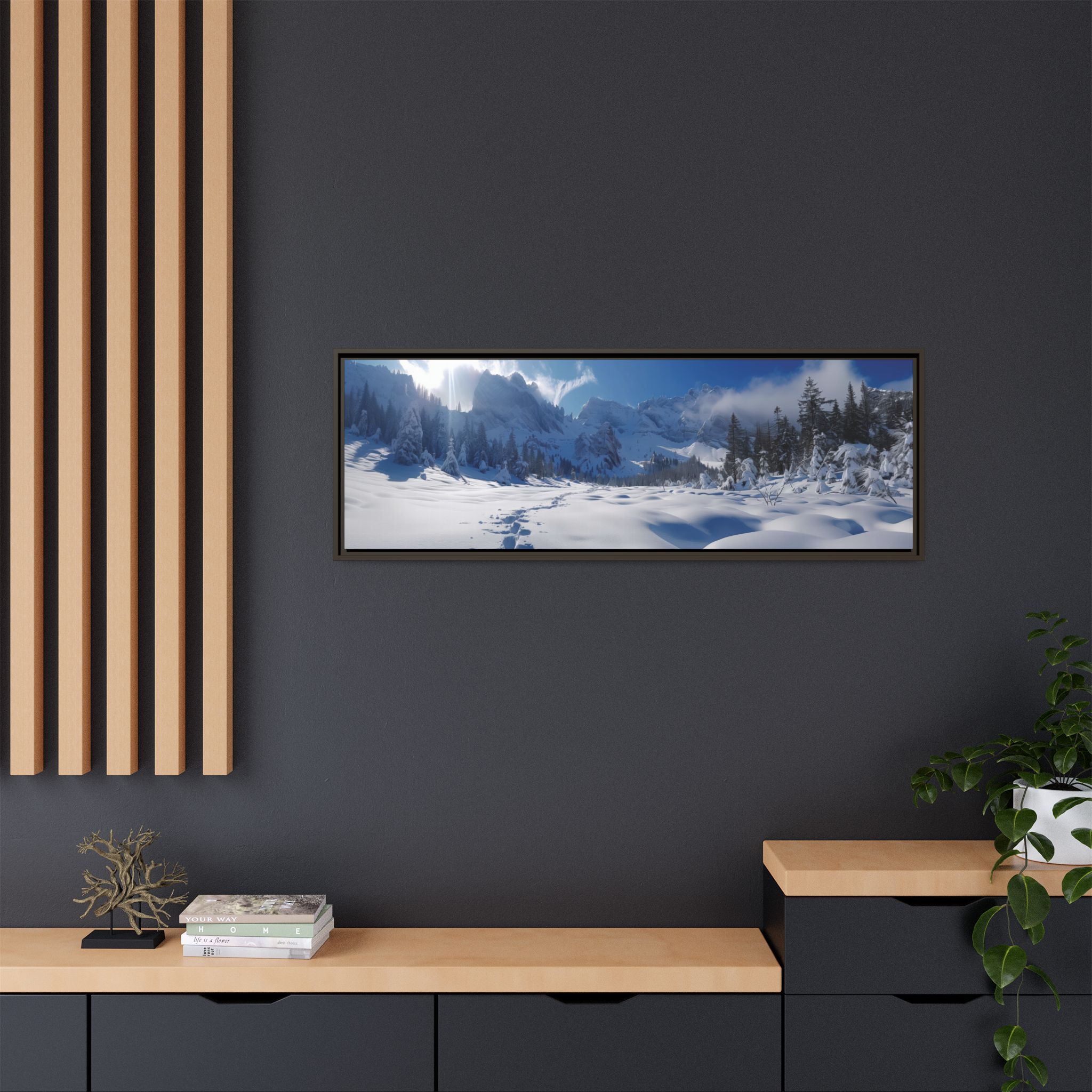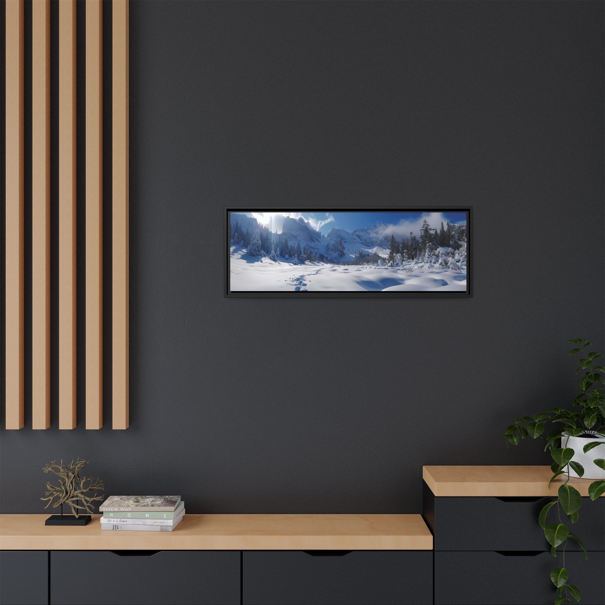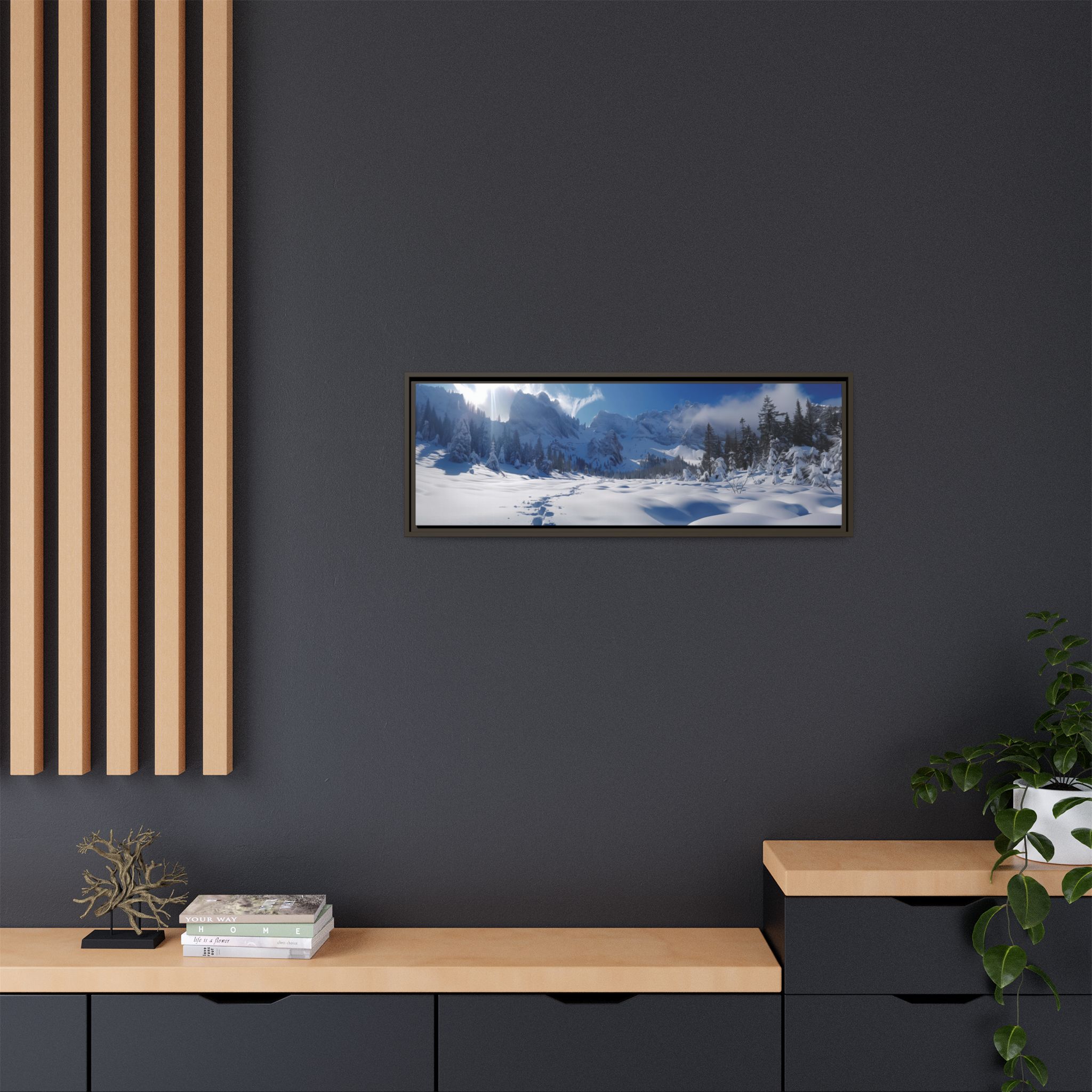 Custom digitally printed artwork on a quality canvas. .Every print in a black pinewood frame will look sleek and beautiful in any interior. The artwork will be printed on the cotton-polyester canvas with a special proprietary coating to make sure it stays vibrant for ages. Environmentally-conscious – it’s made from sustainably sourced materials (Forest Stewardship Council certified) and custom printed on demand no warehouse stocks and no waste. Choose between the designer specified sizes. The sawtooth hanging hardware is already attached.