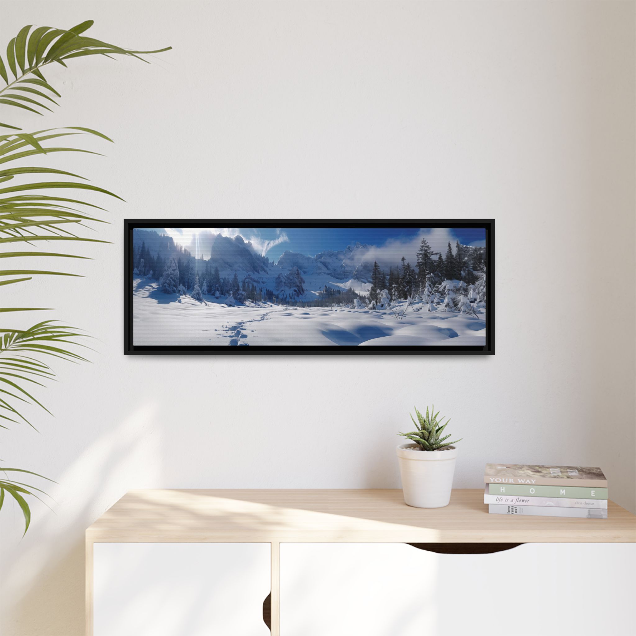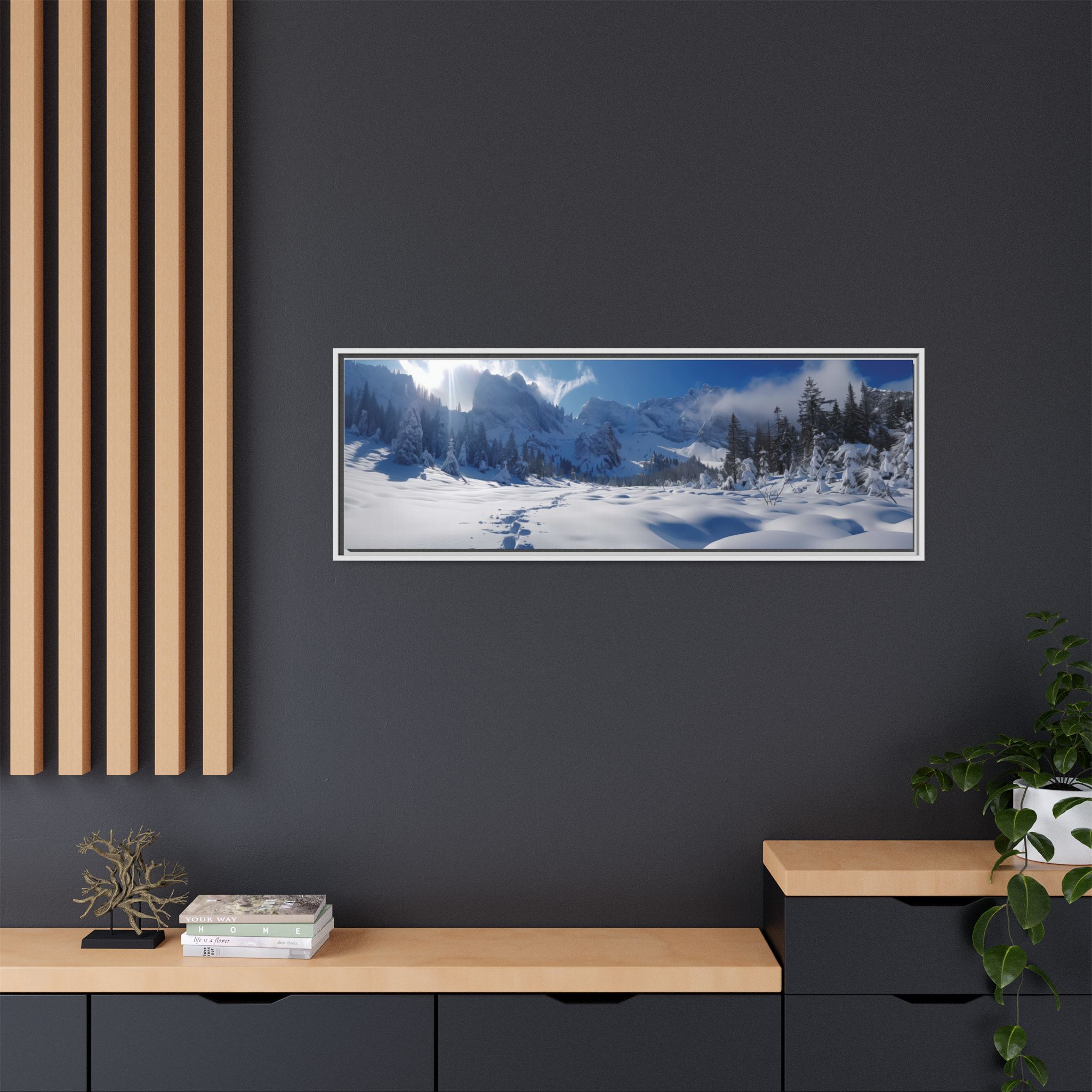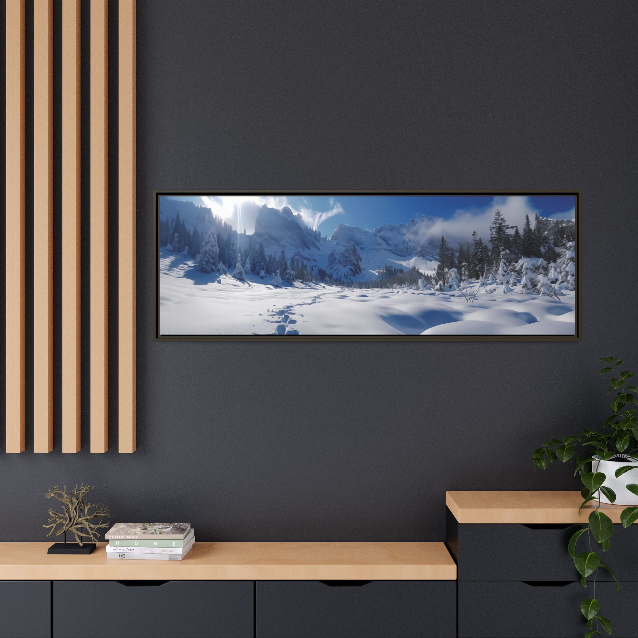 Custom digitally printed artwork on a quality canvas. .Every print in a black pinewood frame will look sleek and beautiful in any interior. The artwork will be printed on the cotton-polyester canvas with a special proprietary coating to make sure it stays vibrant for ages. Environmentally-conscious – it’s made from sustainably sourced materials (Forest Stewardship Council certified) and custom printed on demand no warehouse stocks and no waste. Choose between the designer specified sizes. The sawtooth hanging hardware is already attached.