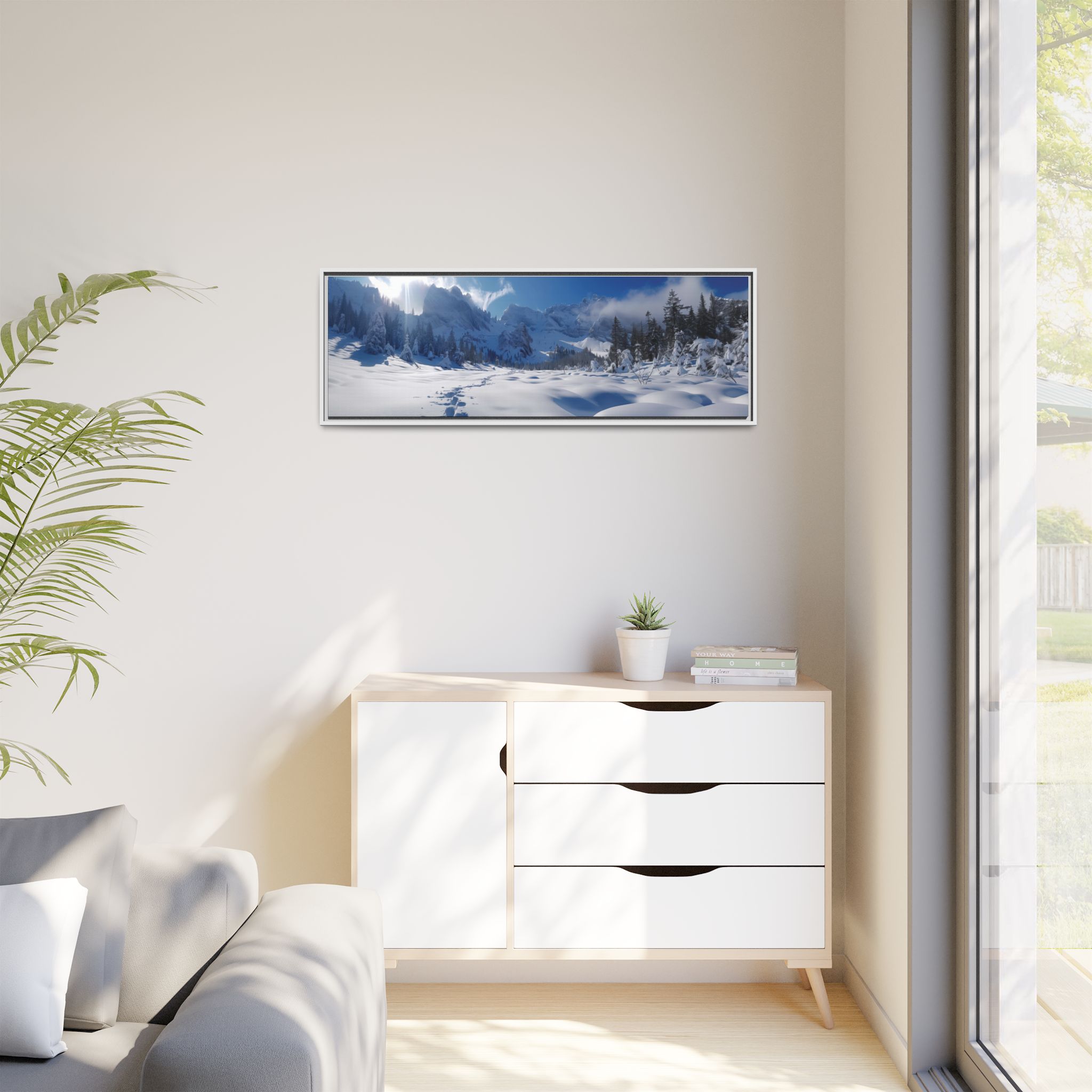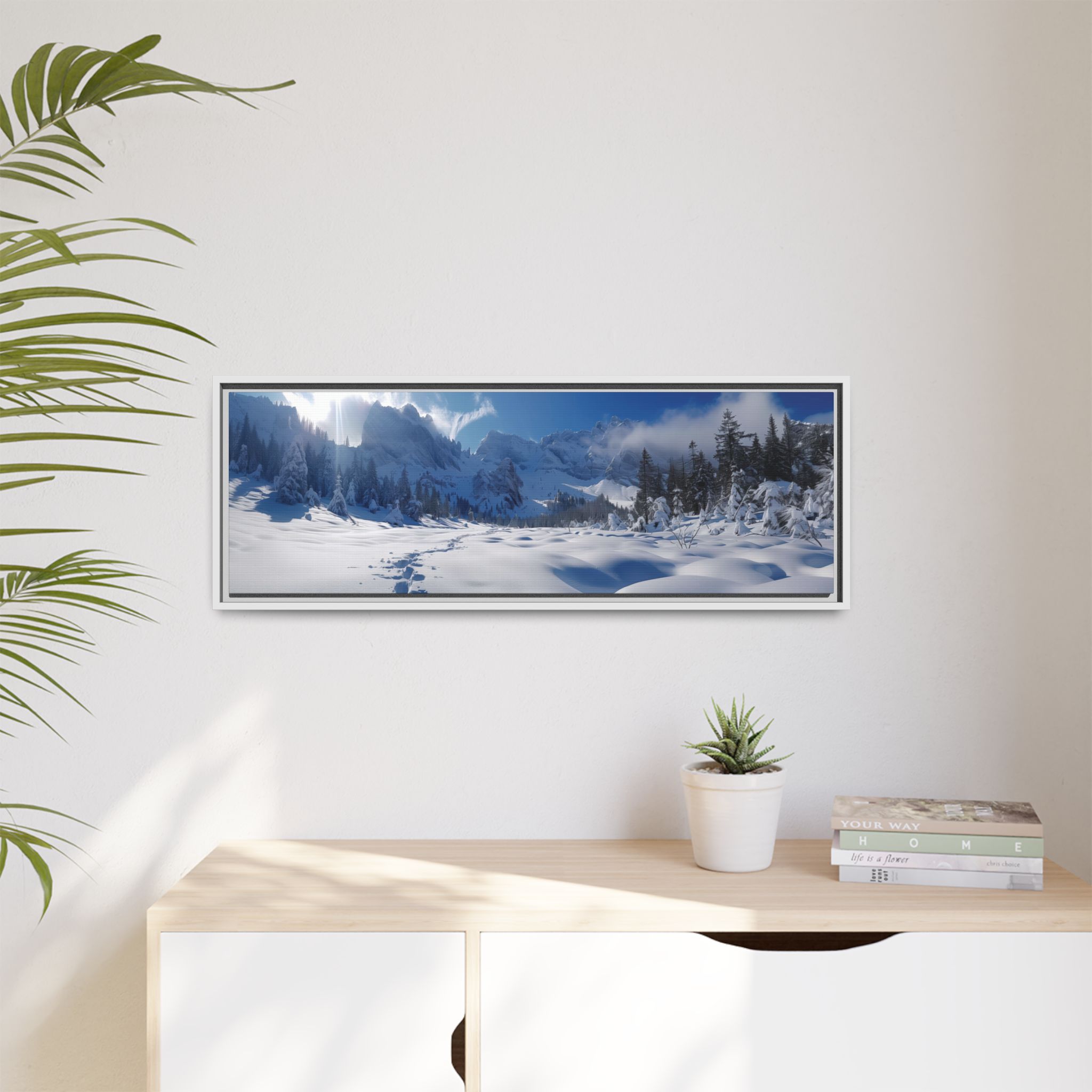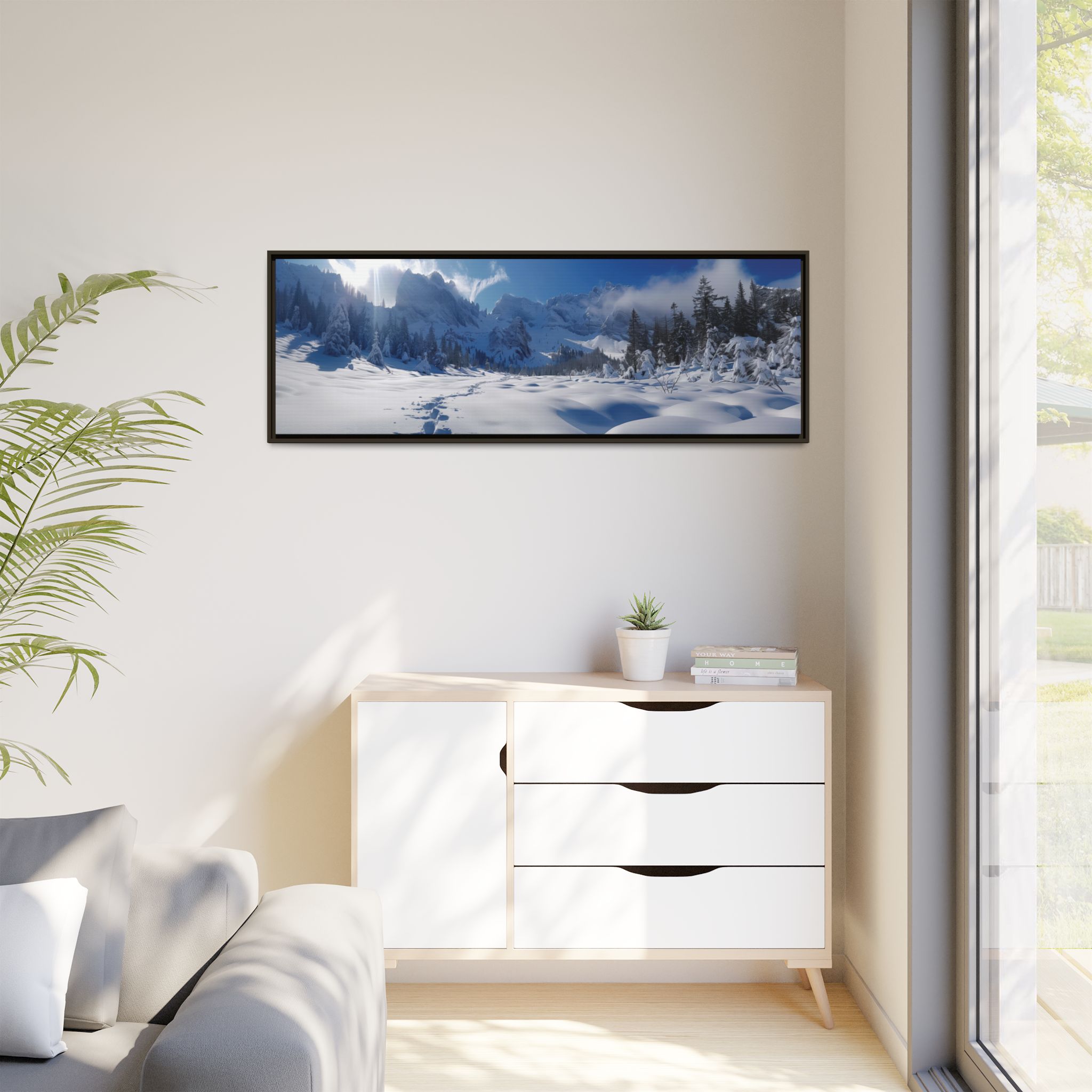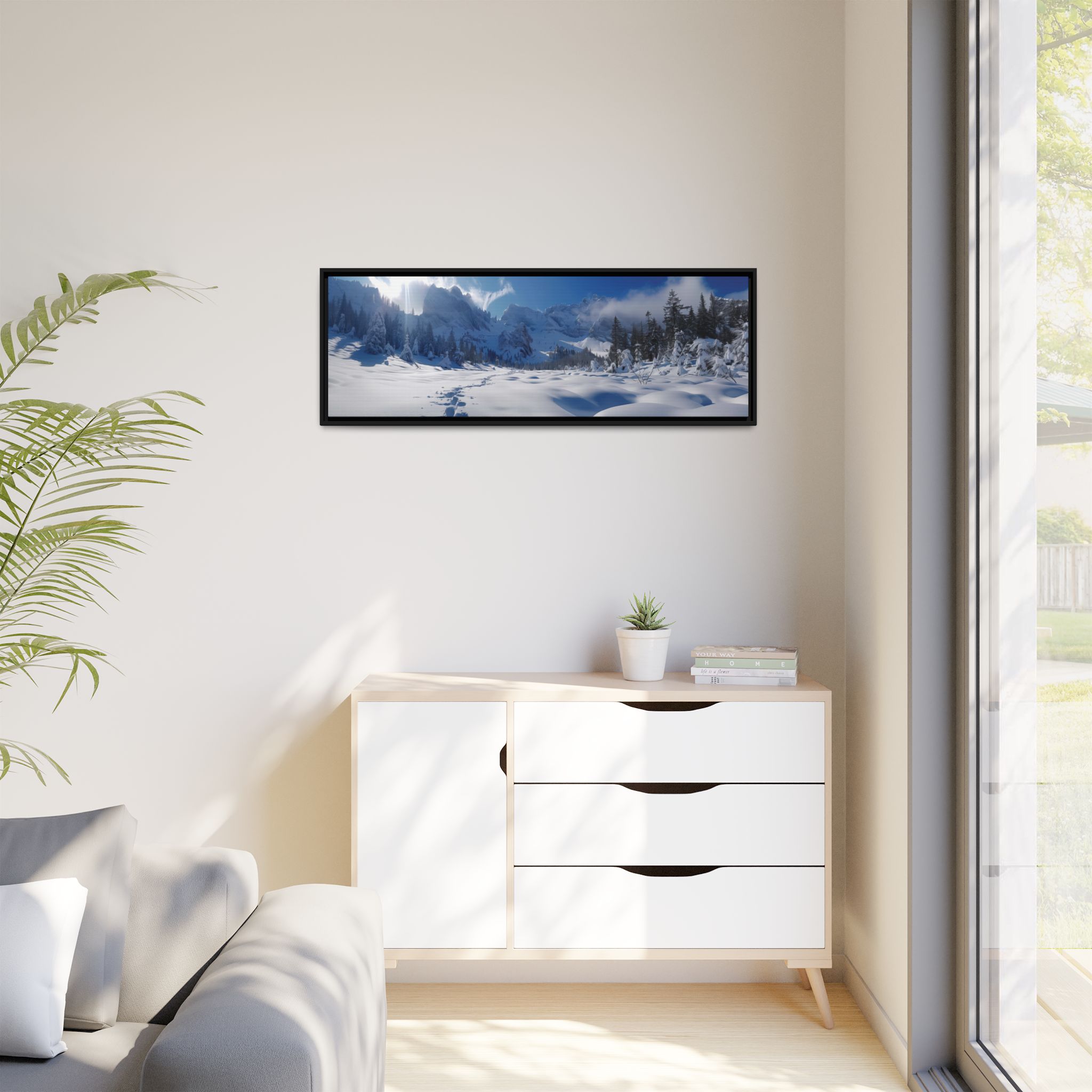 Custom digitally printed artwork on a quality canvas. .Every print in a black pinewood frame will look sleek and beautiful in any interior. The artwork will be printed on the cotton-polyester canvas with a special proprietary coating to make sure it stays vibrant for ages. Environmentally-conscious – it’s made from sustainably sourced materials (Forest Stewardship Council certified) and custom printed on demand no warehouse stocks and no waste. Choose between the designer specified sizes. The sawtooth hanging hardware is already attached.
