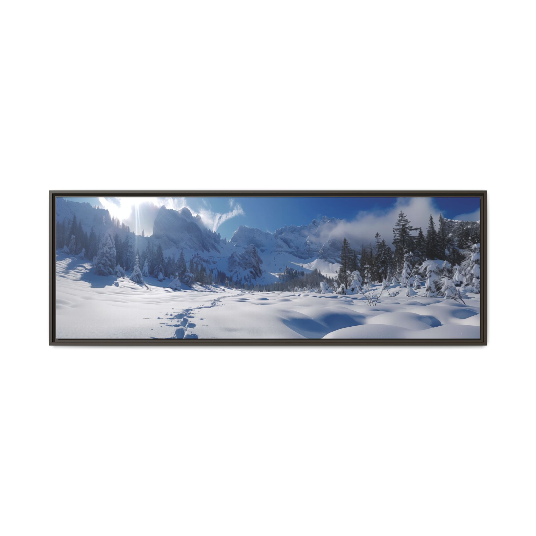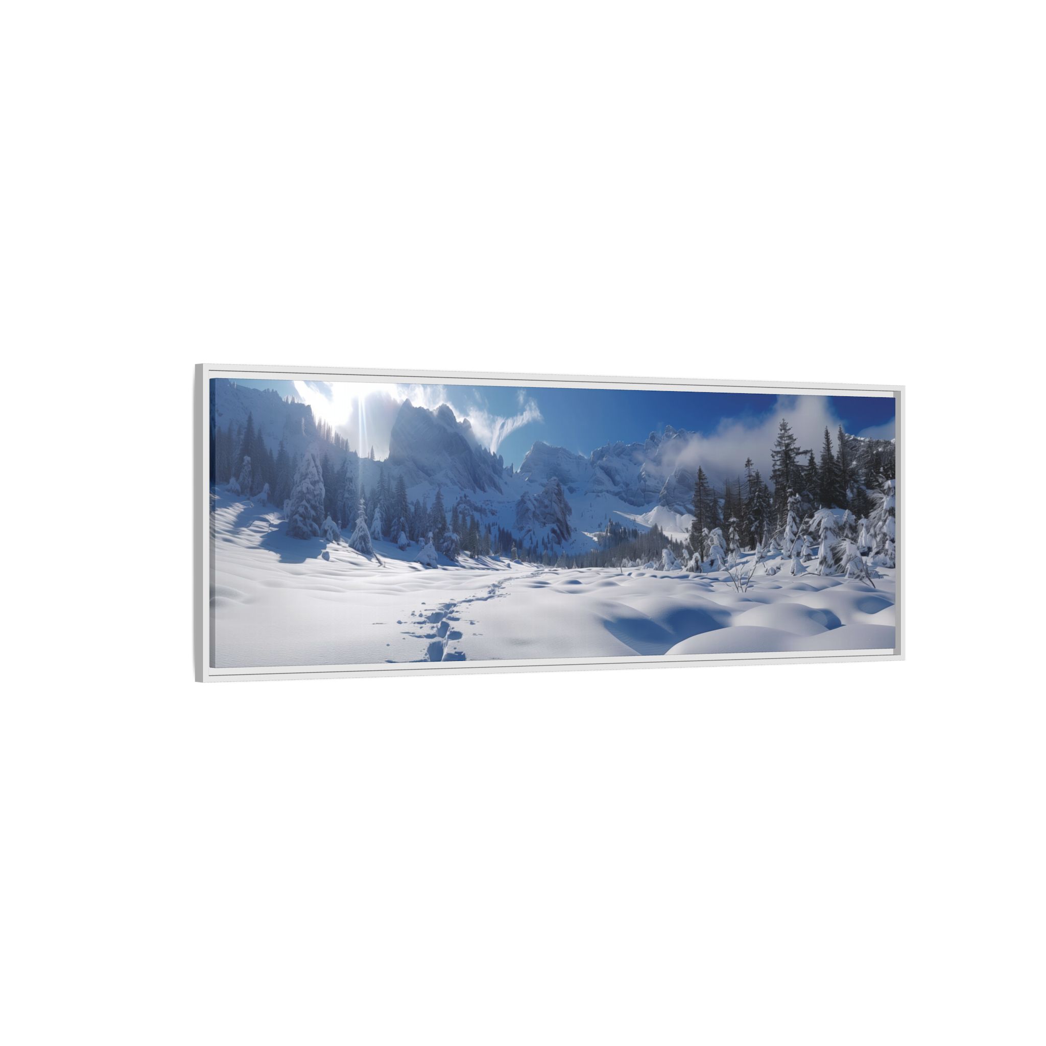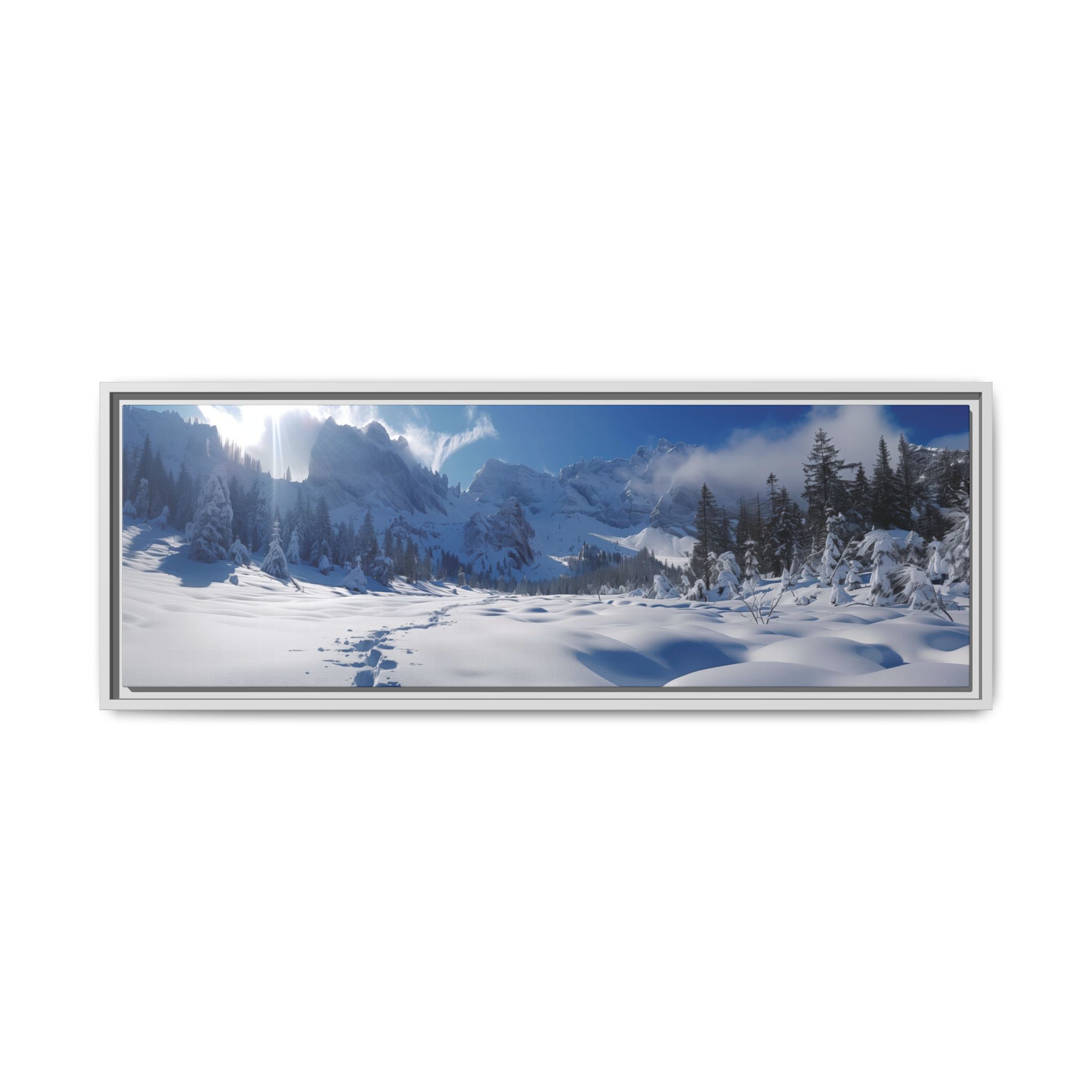 An open valley with deep snow and surrounded by mountains. Animal tracks lead forward to surrounding forests . Perfect for nature lovers and those seeking a touch of tranquility in their home decor. Ideal for Christmas, winter season, and wildlife enthusiasts.