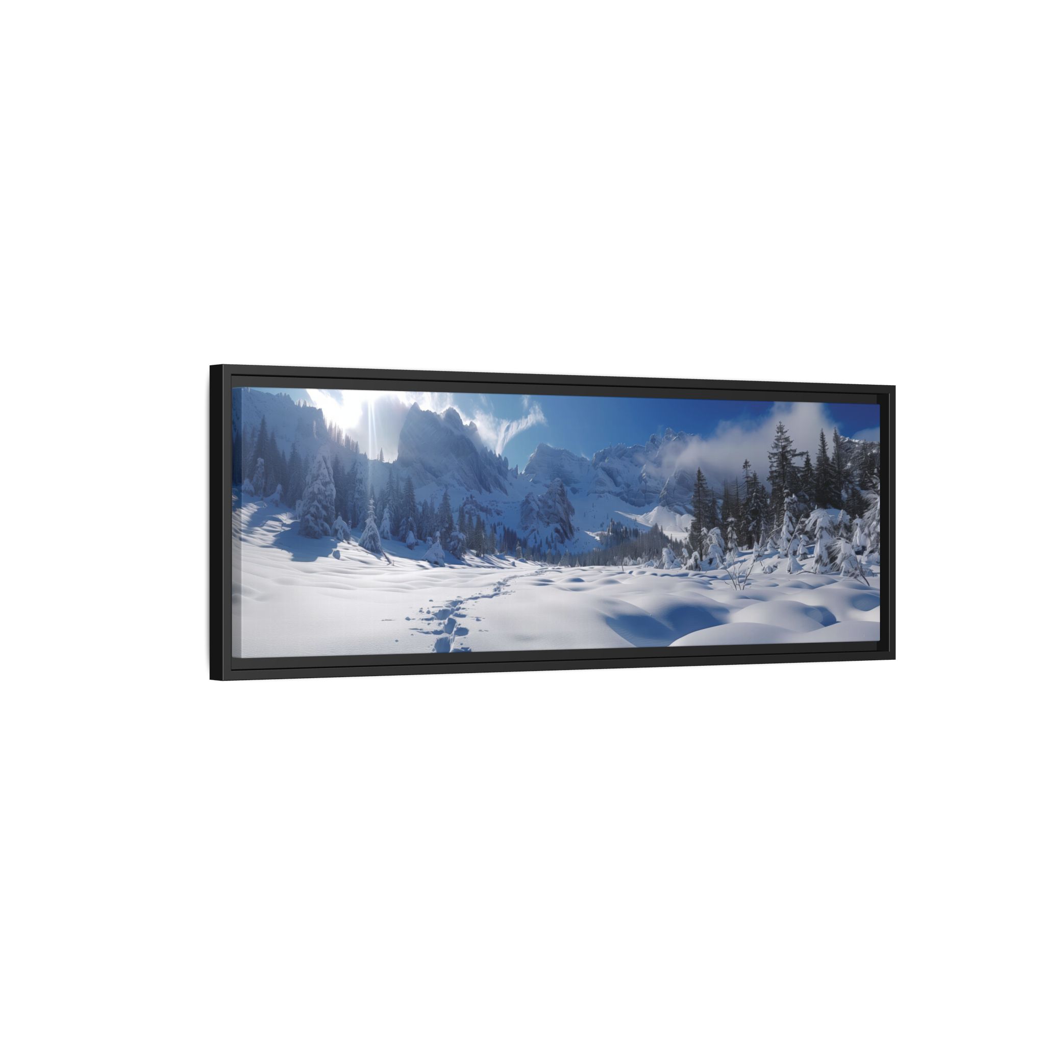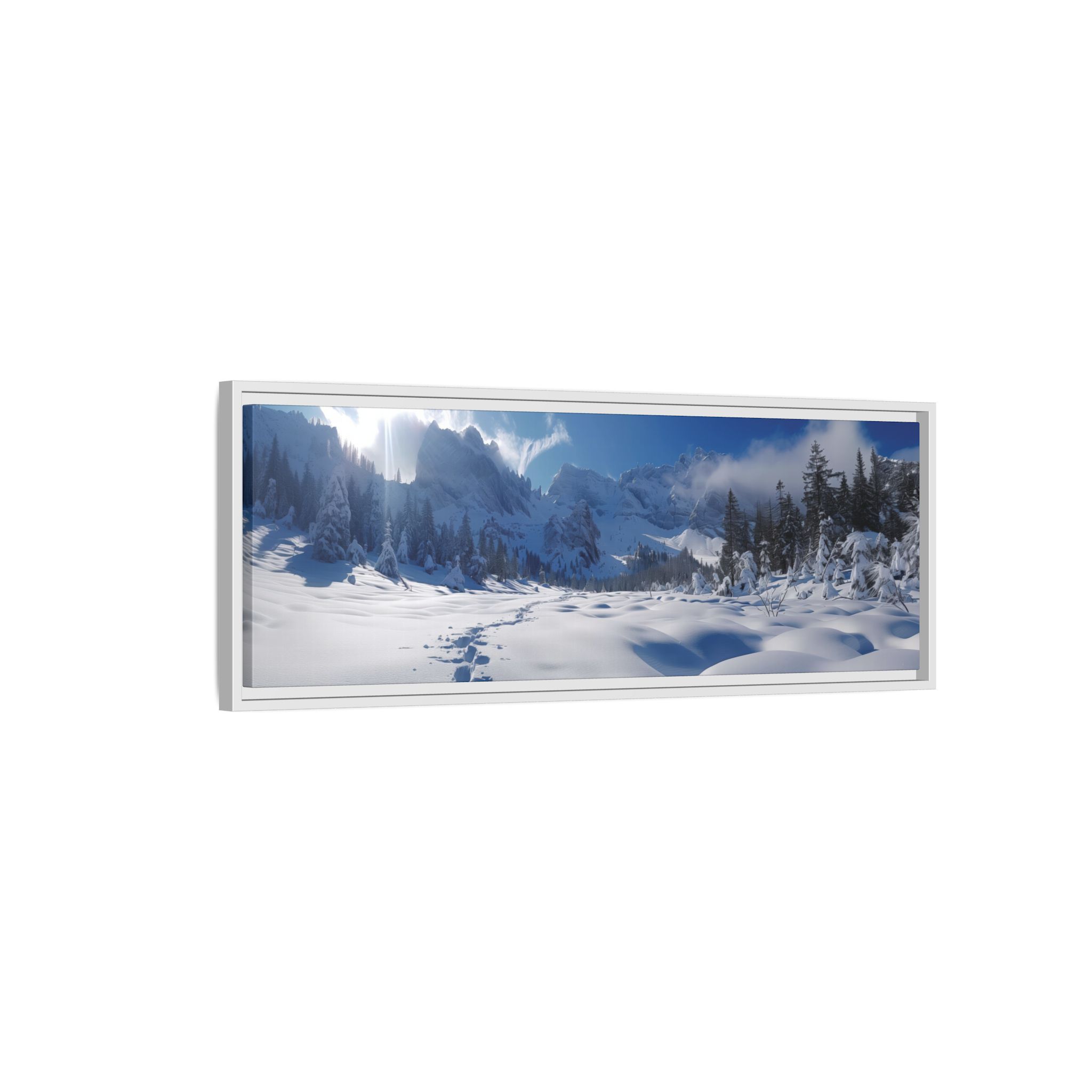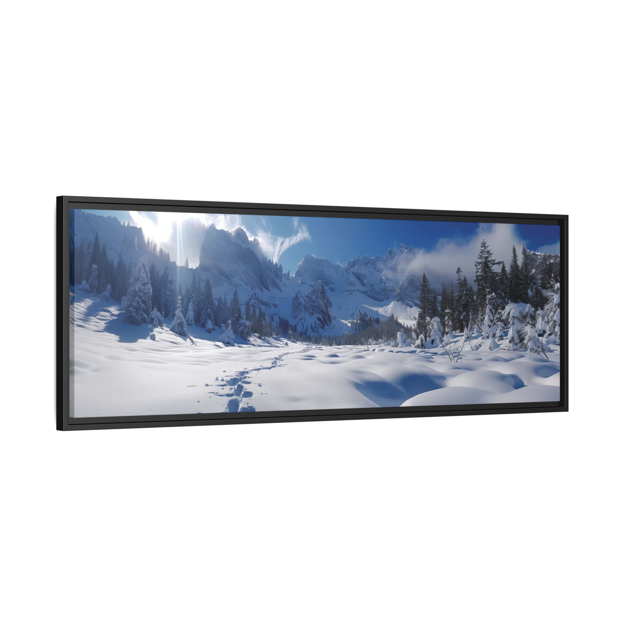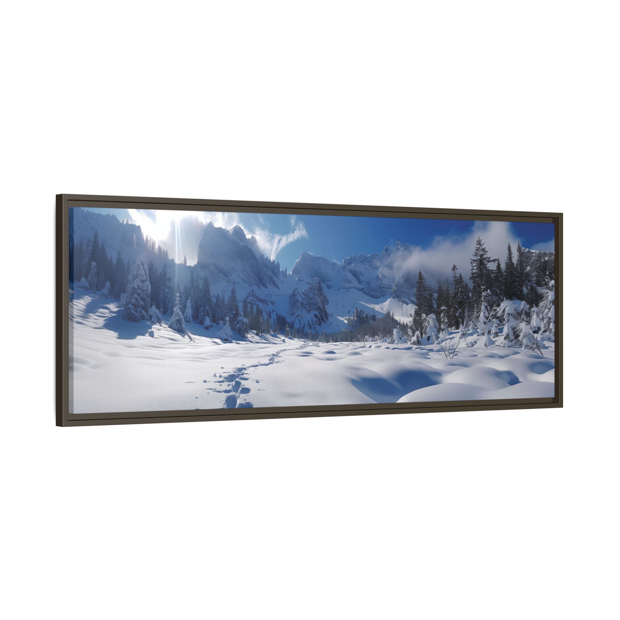 An open valley with deep snow and surrounded by mountains. Animal tracks lead forward to surrounding forests . Perfect for nature lovers and those seeking a touch of tranquility in their home decor. Ideal for Christmas, winter season, and wildlife enthusiasts.