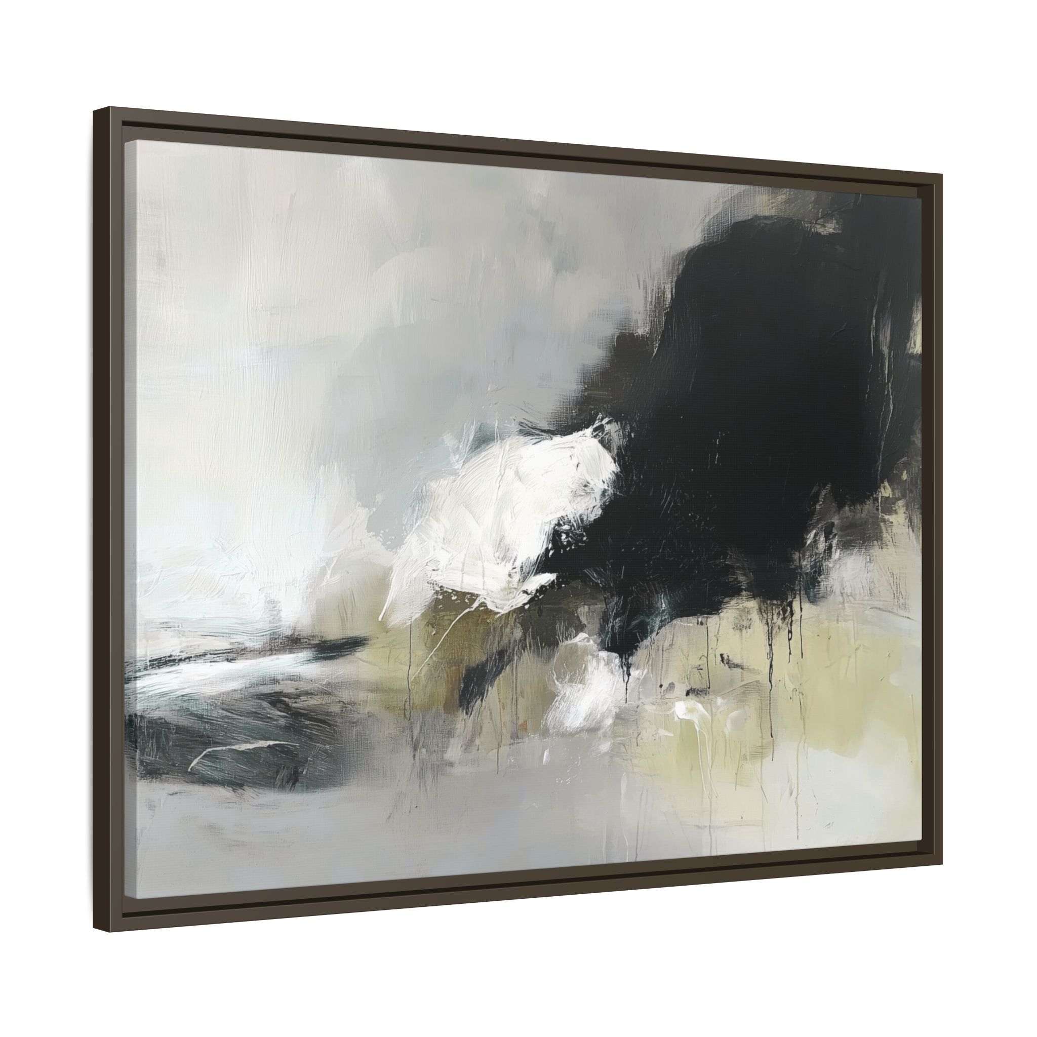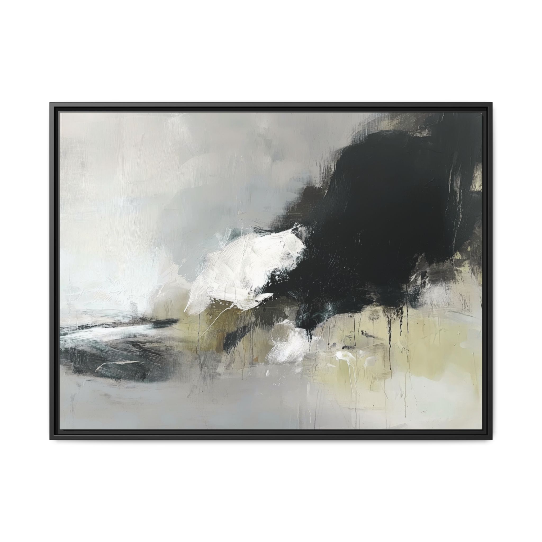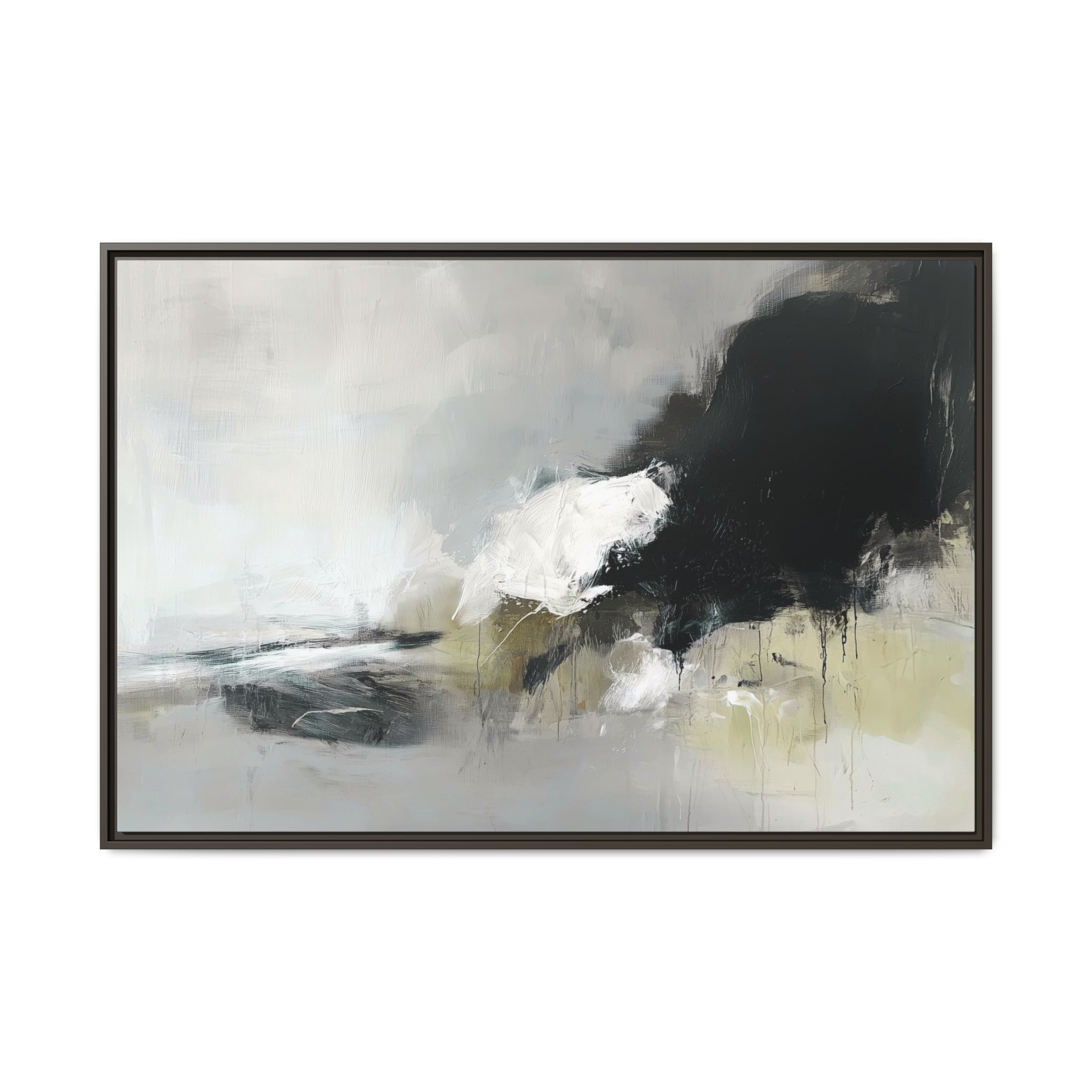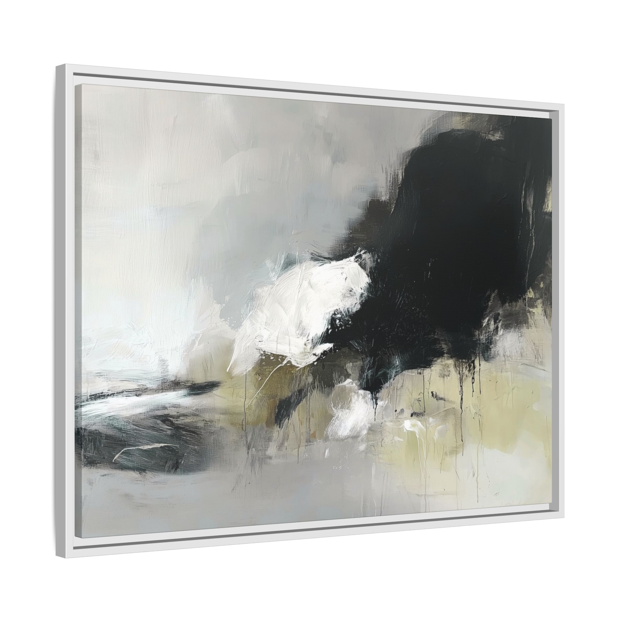 An abstract painting with soft, neutral tones, atmospheric in nature, featuring large brush strokes and multilevel detail. A minimalist, monochromatic style with a hint of blush colour. The painting leaves space for the viewer to imagine a scene depicted by white and black shapes on top and blurry edges and borders. This custom framed canvas print provides a serene and artistic vibe, perfect for decoraters and art enthusiasts. Ideal for home decor, gifting on birthdays, anniversaries, and housewarmings.