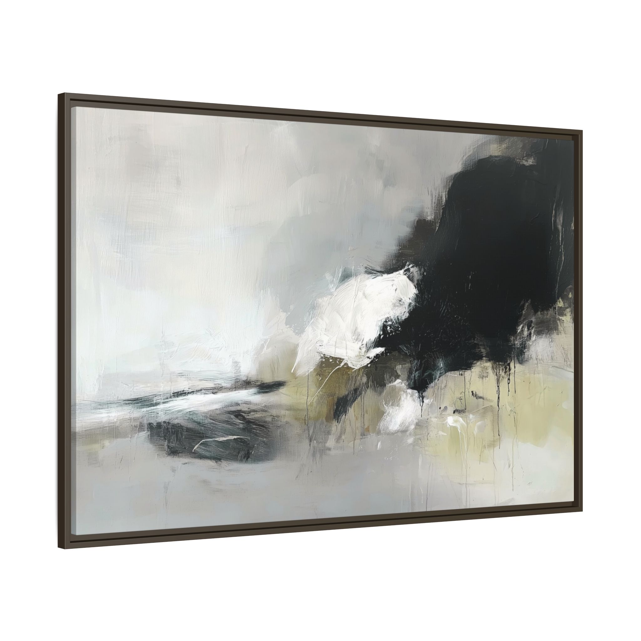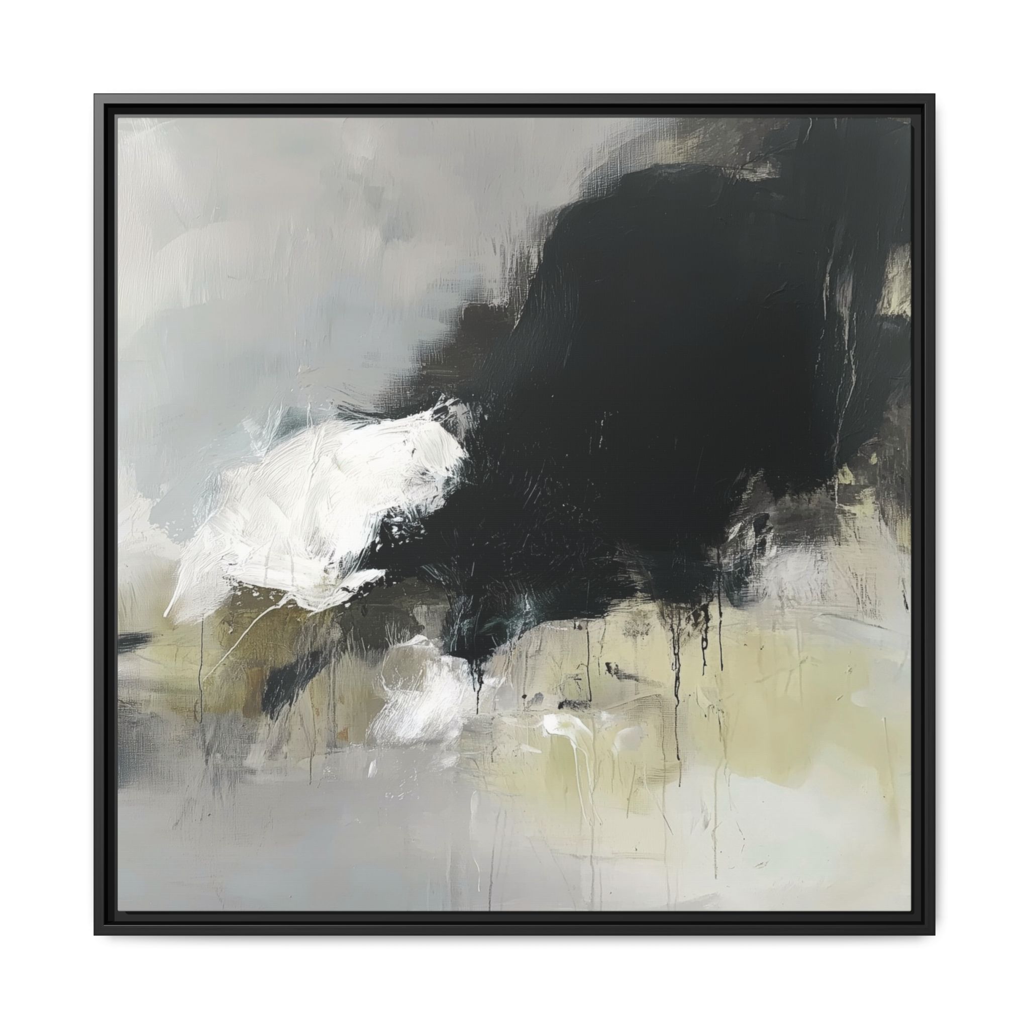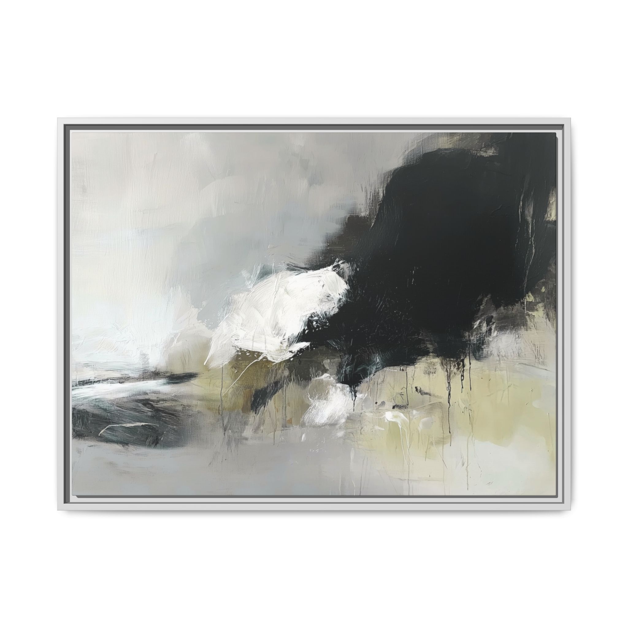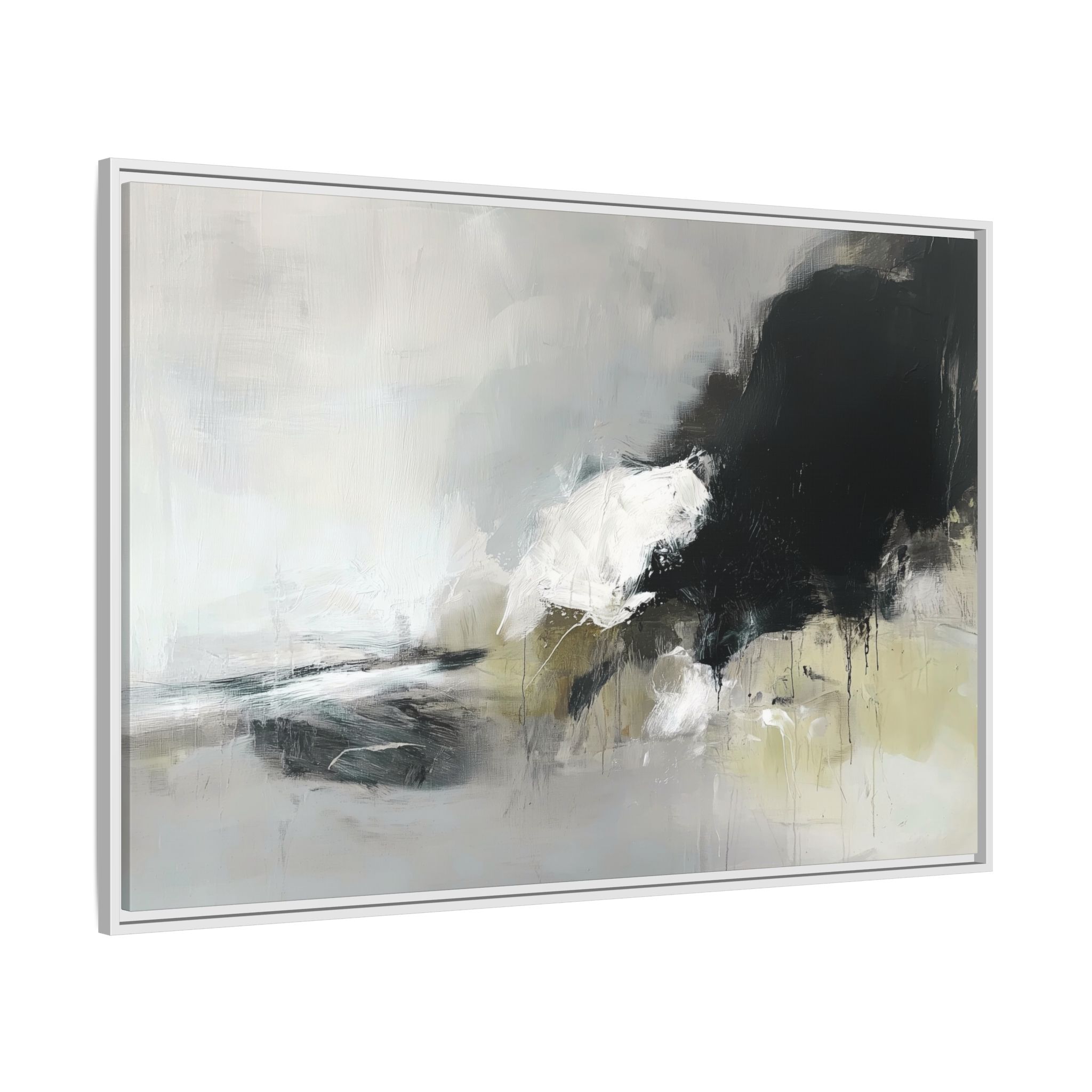 An abstract painting with soft, neutral tones, atmospheric in nature, featuring large brush strokes and multilevel detail. A minimalist, monochromatic style with a hint of blush colour. The painting leaves space for the viewer to imagine a scene depicted by white and black shapes on top and blurry edges and borders. This custom framed canvas print provides a serene and artistic vibe, perfect for decoraters and art enthusiasts. Ideal for home decor, gifting on birthdays, anniversaries, and housewarmings.