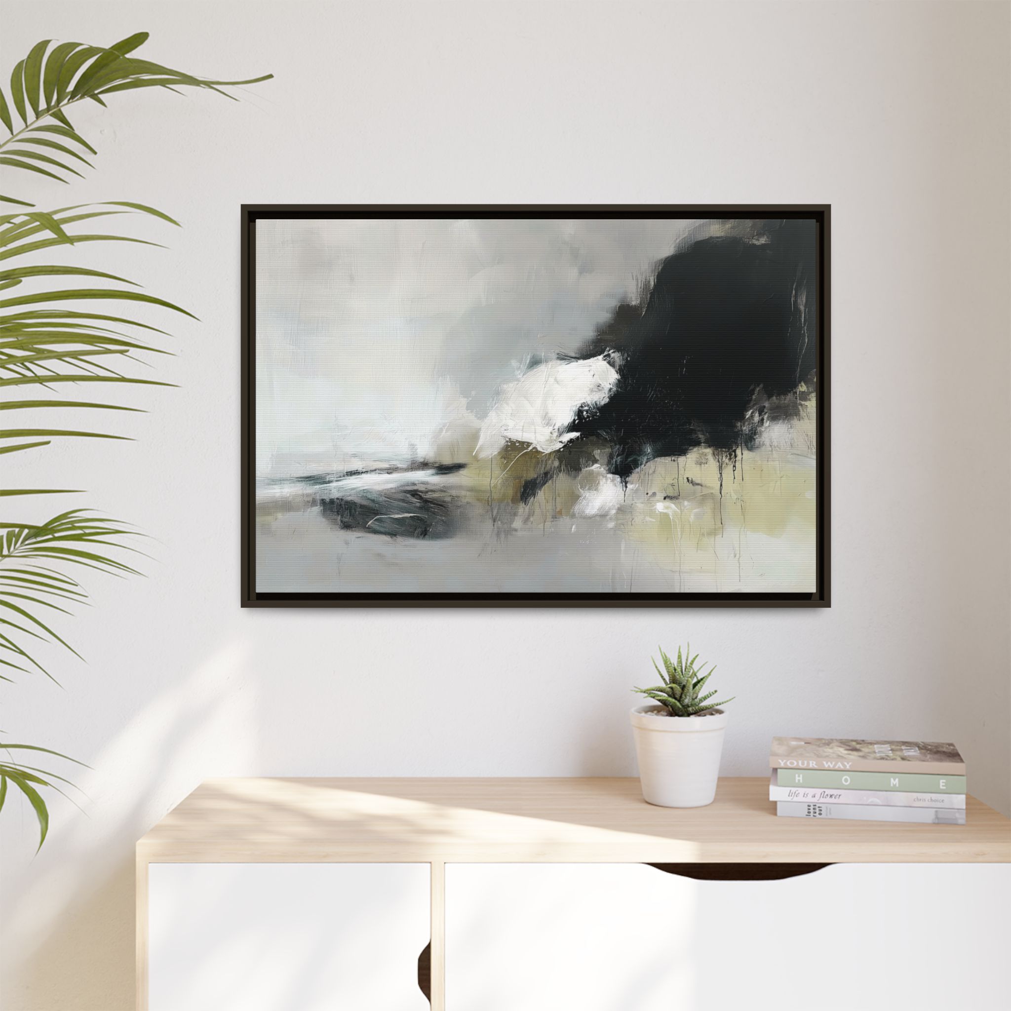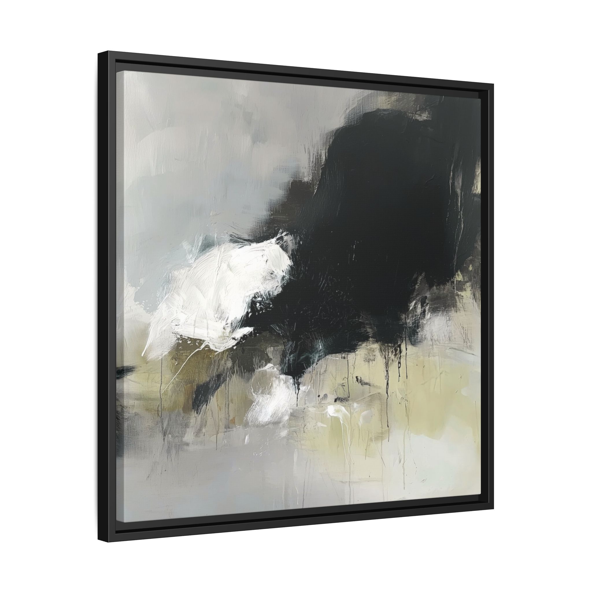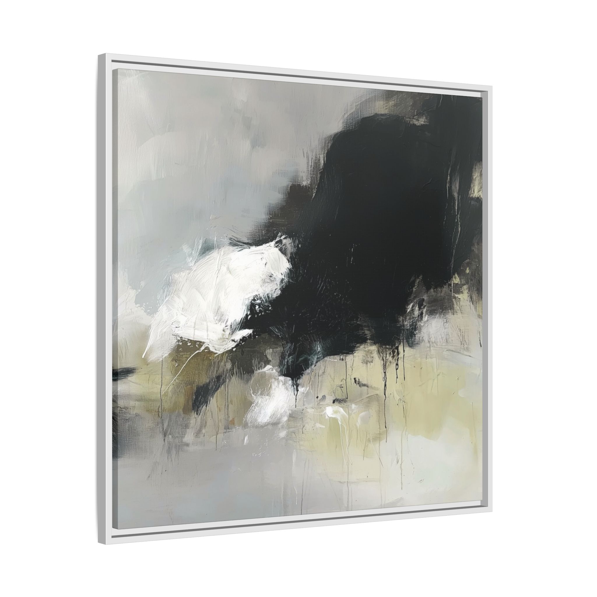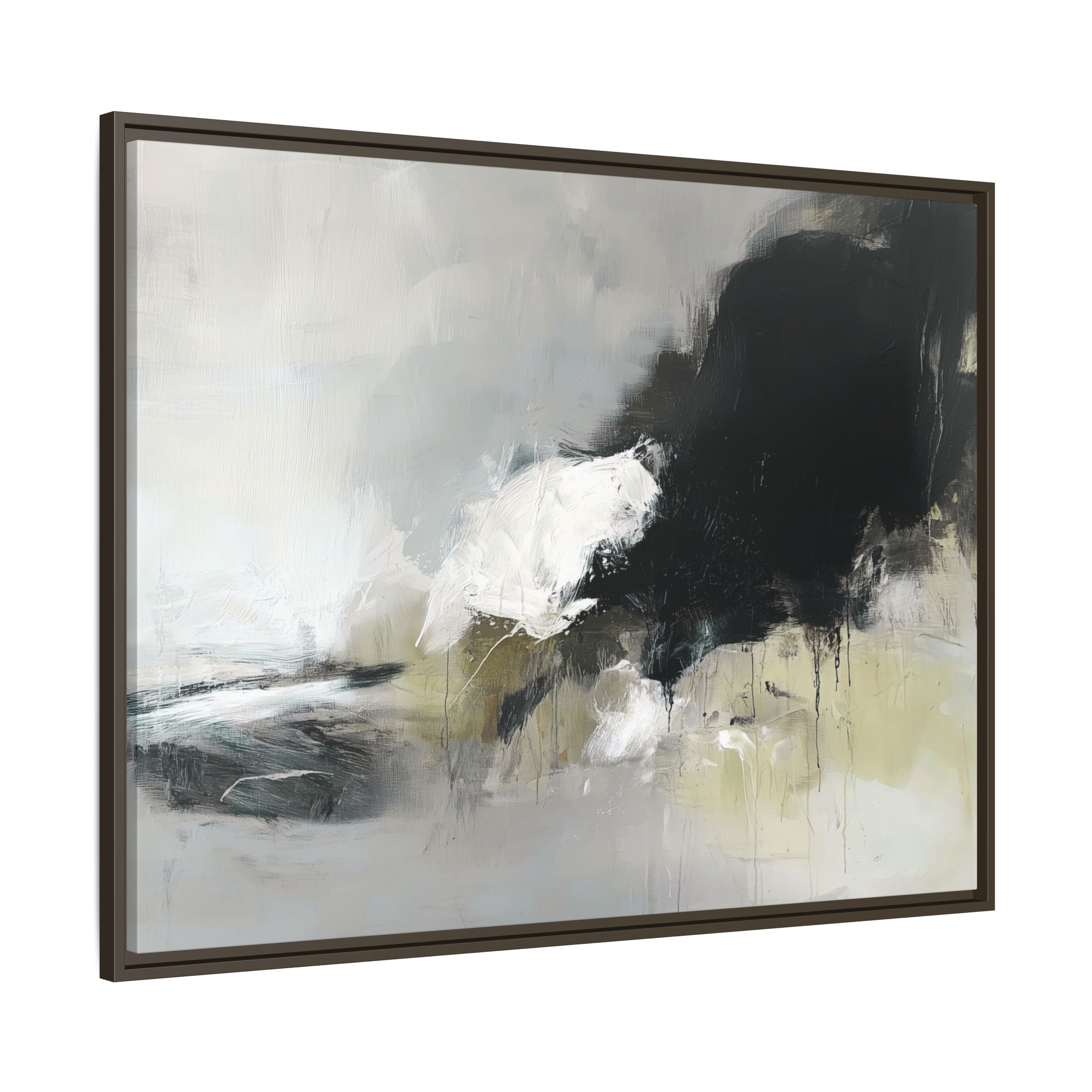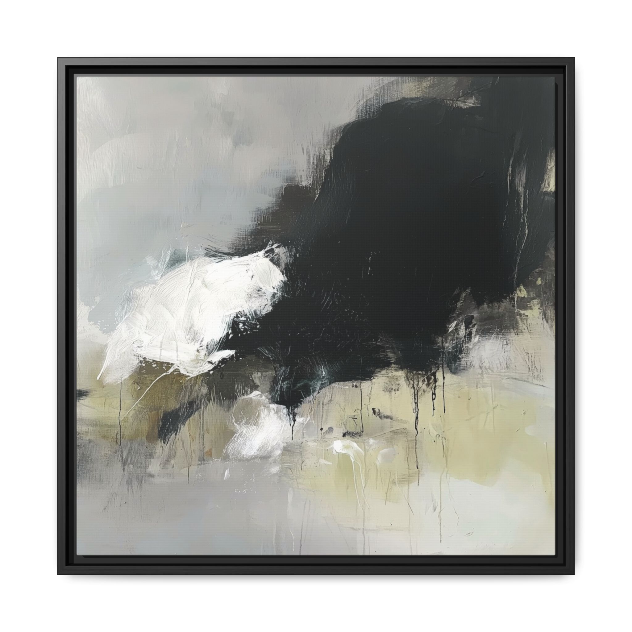 An abstract painting with soft, neutral tones, atmospheric in nature, featuring large brush strokes and multilevel detail. A minimalist, monochromatic style with a hint of blush colour. The painting leaves space for the viewer to imagine a scene depicted by white and black shapes on top and blurry edges and borders. This custom framed canvas print provides a serene and artistic vibe, perfect for decoraters and art enthusiasts. Ideal for home decor, gifting on birthdays, anniversaries, and housewarmings.