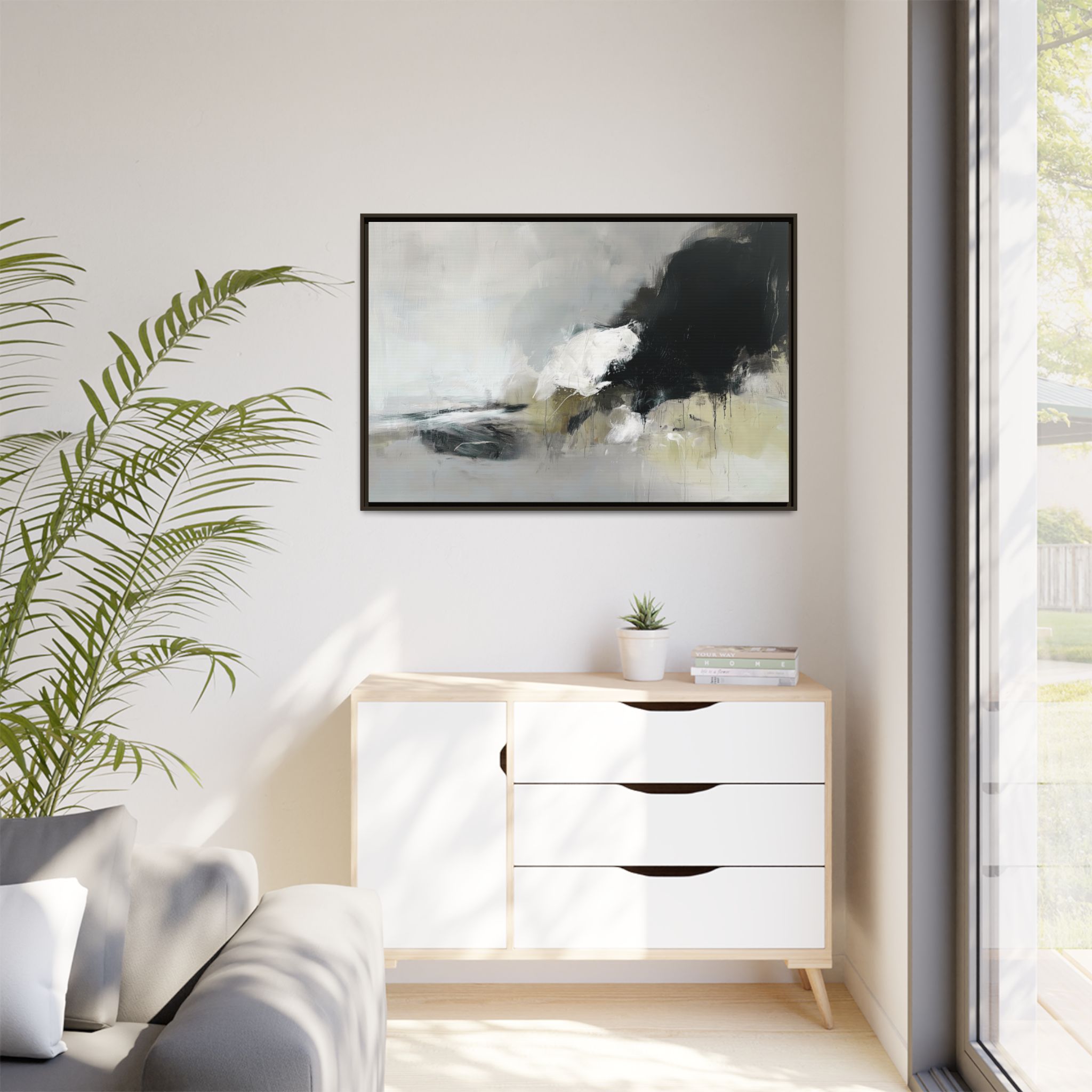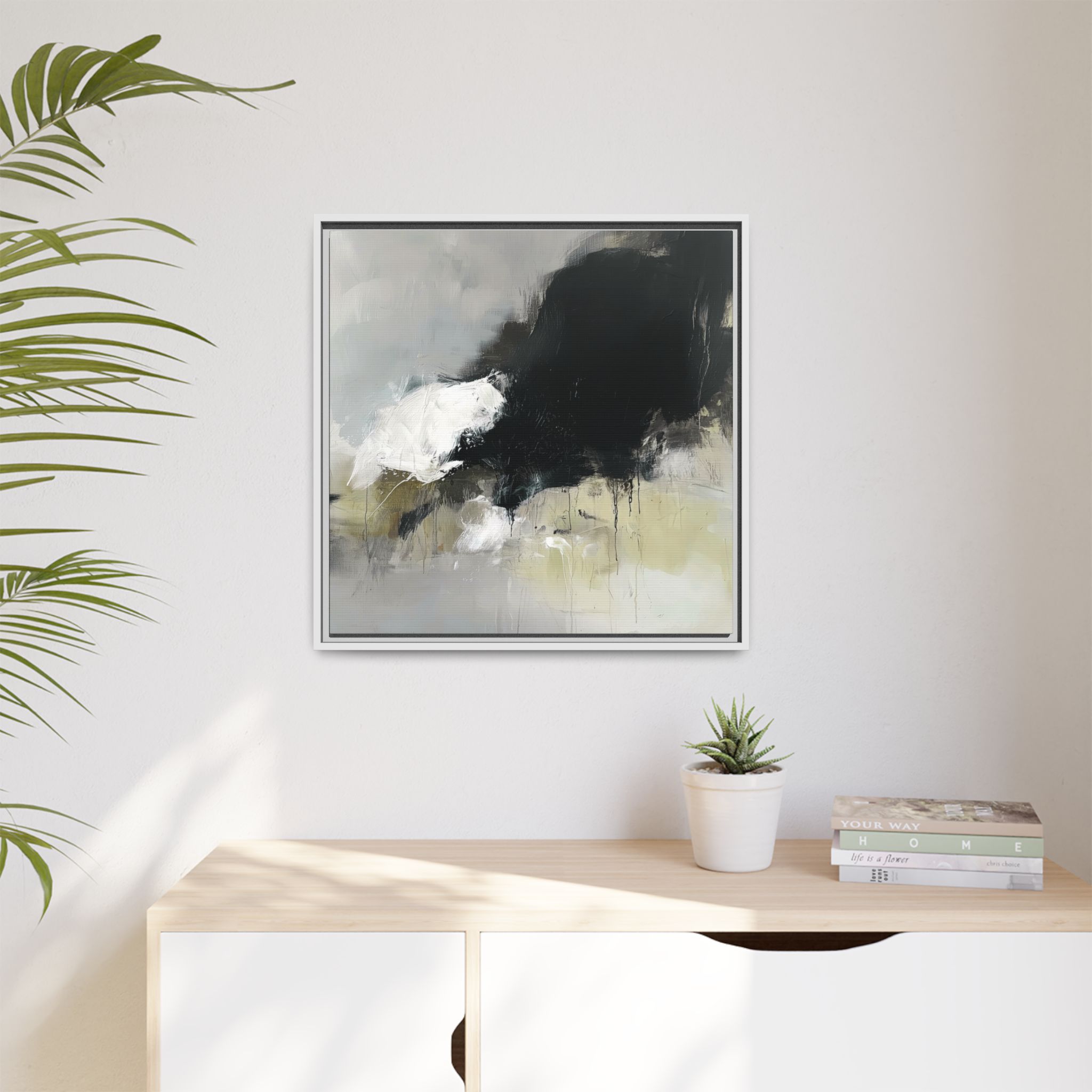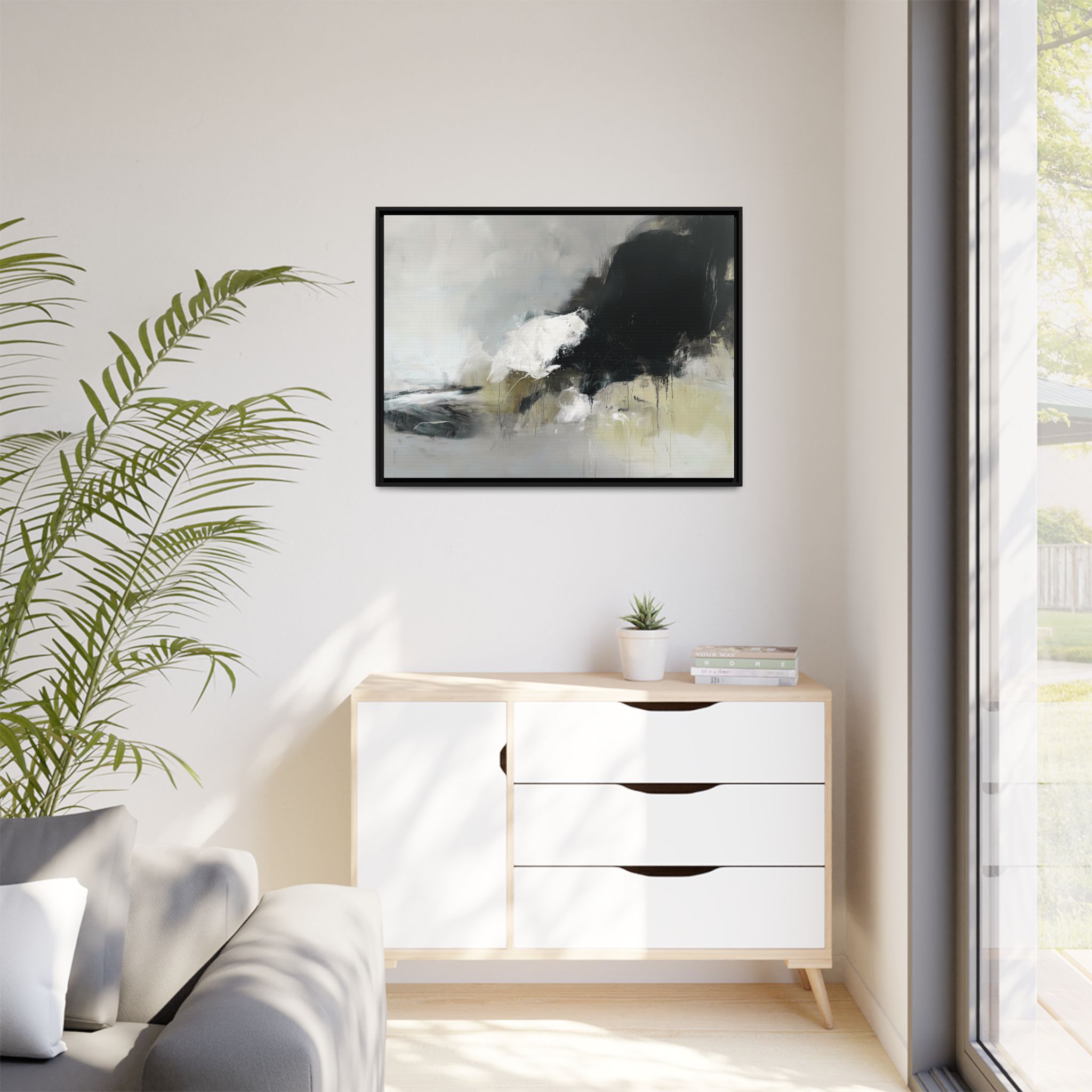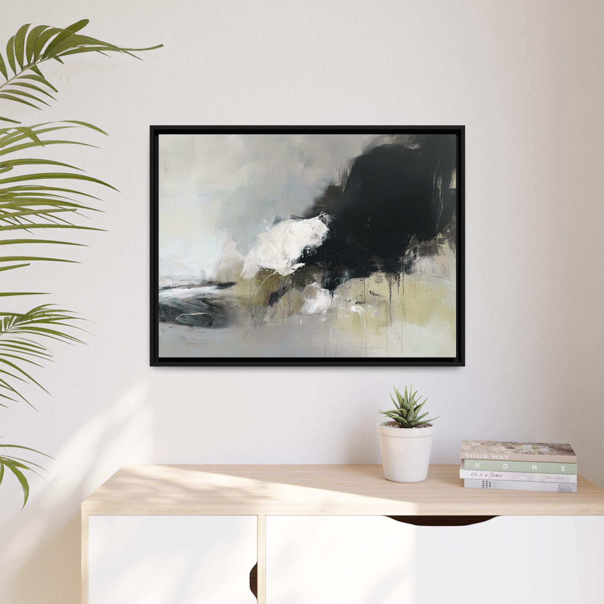 An abstract painting with soft, neutral tones, atmospheric in nature, featuring large brush strokes and multilevel detail. A minimalist, monochromatic style with a hint of blush colour. The painting leaves space for the viewer to imagine a scene depicted by white and black shapes on top and blurry edges and borders. This custom framed canvas print provides a serene and artistic vibe, perfect for decoraters and art enthusiasts. Ideal for home decor, gifting on birthdays, anniversaries, and housewarmings.