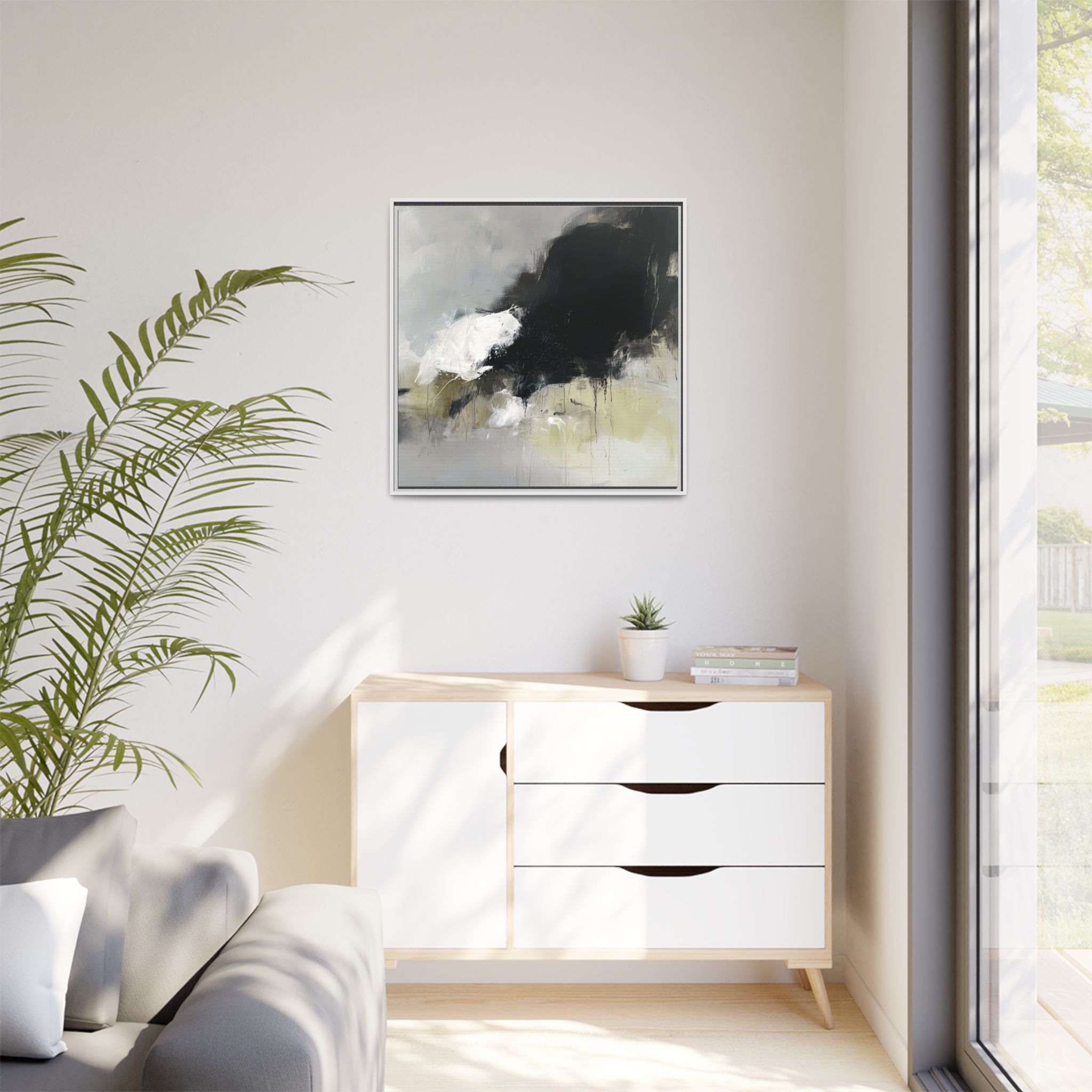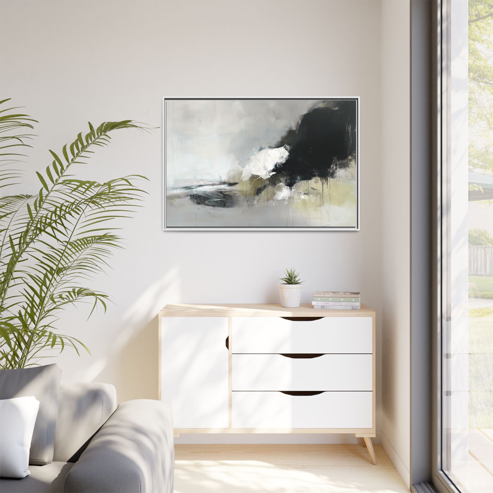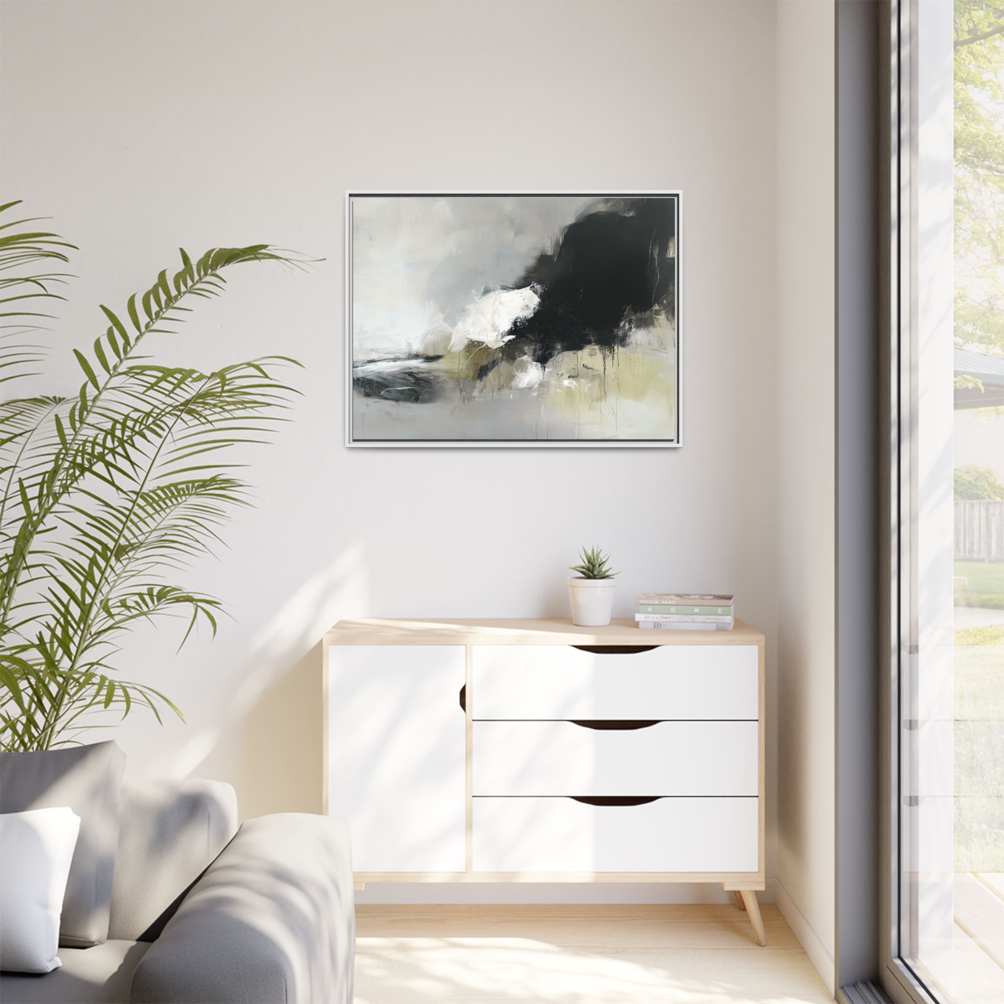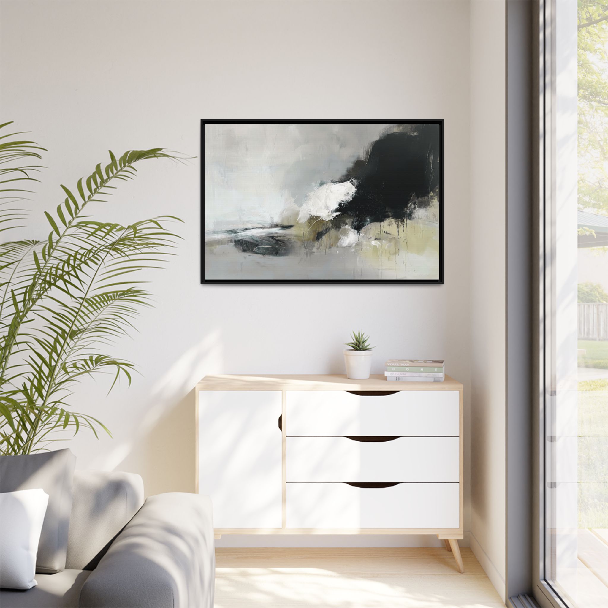 An abstract painting with soft, neutral tones, atmospheric in nature, featuring large brush strokes and multilevel detail. A minimalist, monochromatic style with a hint of blush colour. The painting leaves space for the viewer to imagine a scene depicted by white and black shapes on top and blurry edges and borders. This custom framed canvas print provides a serene and artistic vibe, perfect for decoraters and art enthusiasts. Ideal for home decor, gifting on birthdays, anniversaries, and housewarmings.