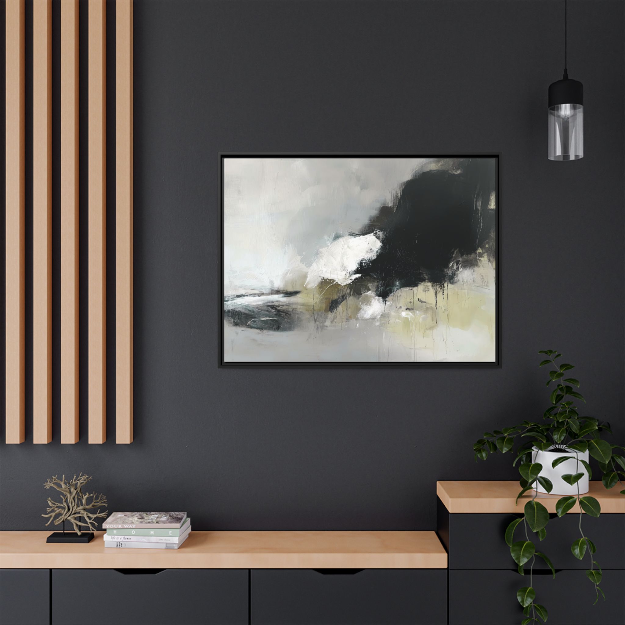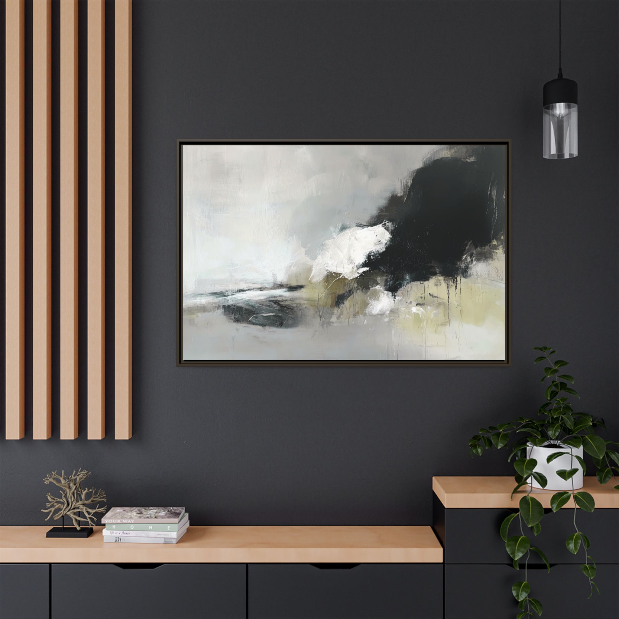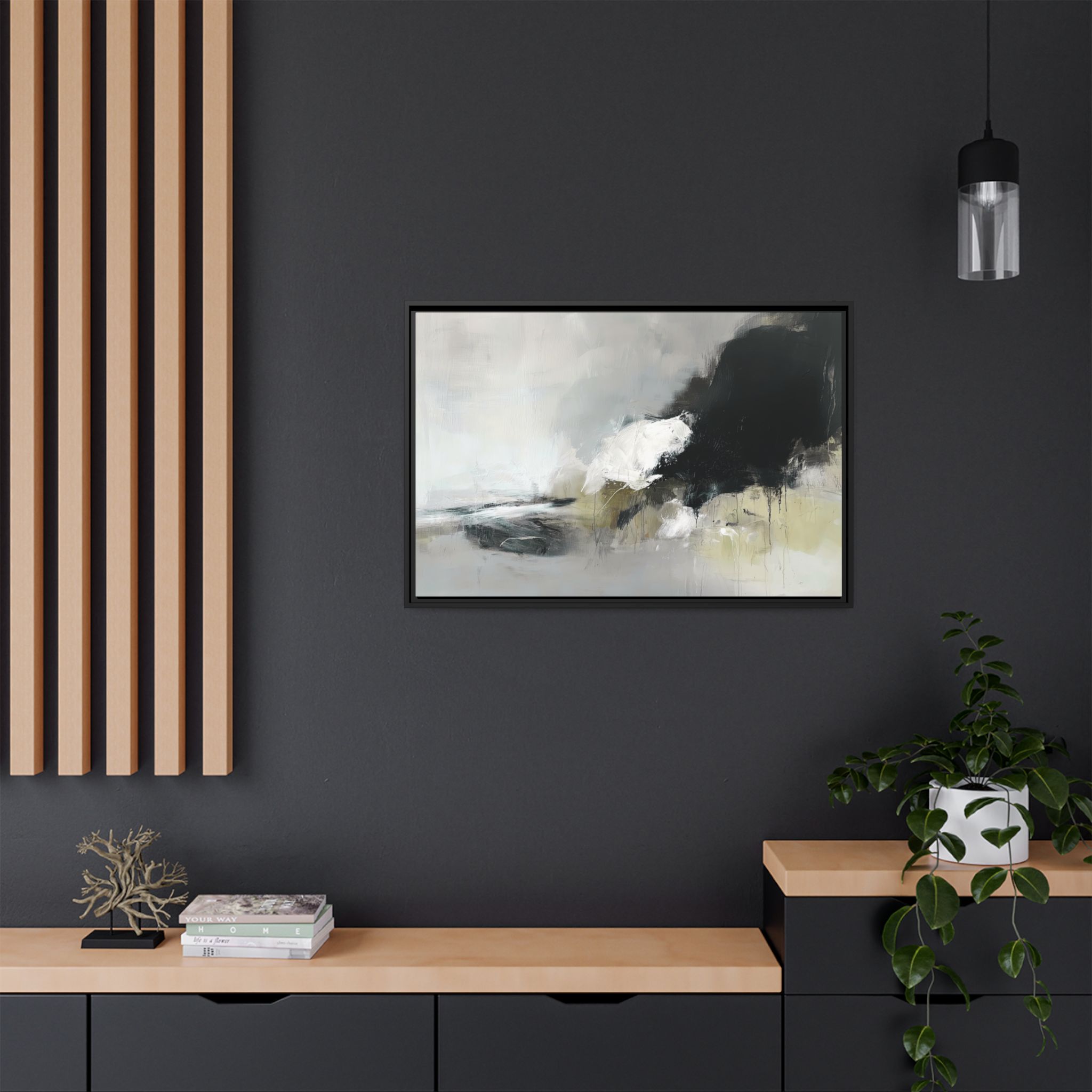 Custom digitally printed artwork on a quality canvas. .Every print in a black pinewood frame will look sleek and beautiful in any interior. The artwork will be printed on the cotton-polyester canvas with a special proprietary coating to make sure it stays vibrant for ages. Environmentally-conscious – it’s made from sustainably sourced materials (Forest Stewardship Council certified) and custom printed on demand no warehouse stocks and no waste. Choose between the designer specified sizes. The sawtooth hanging hardware is already attached.