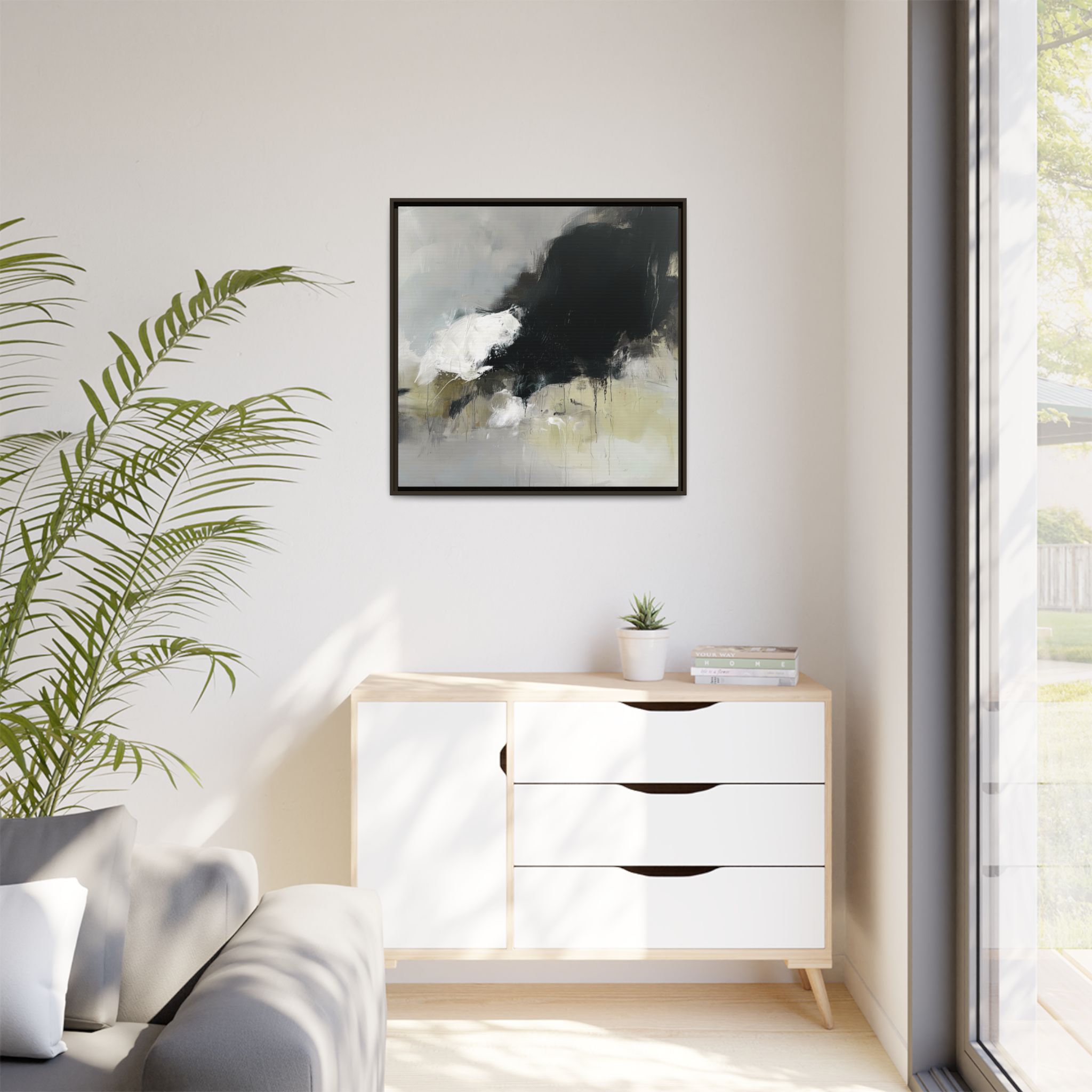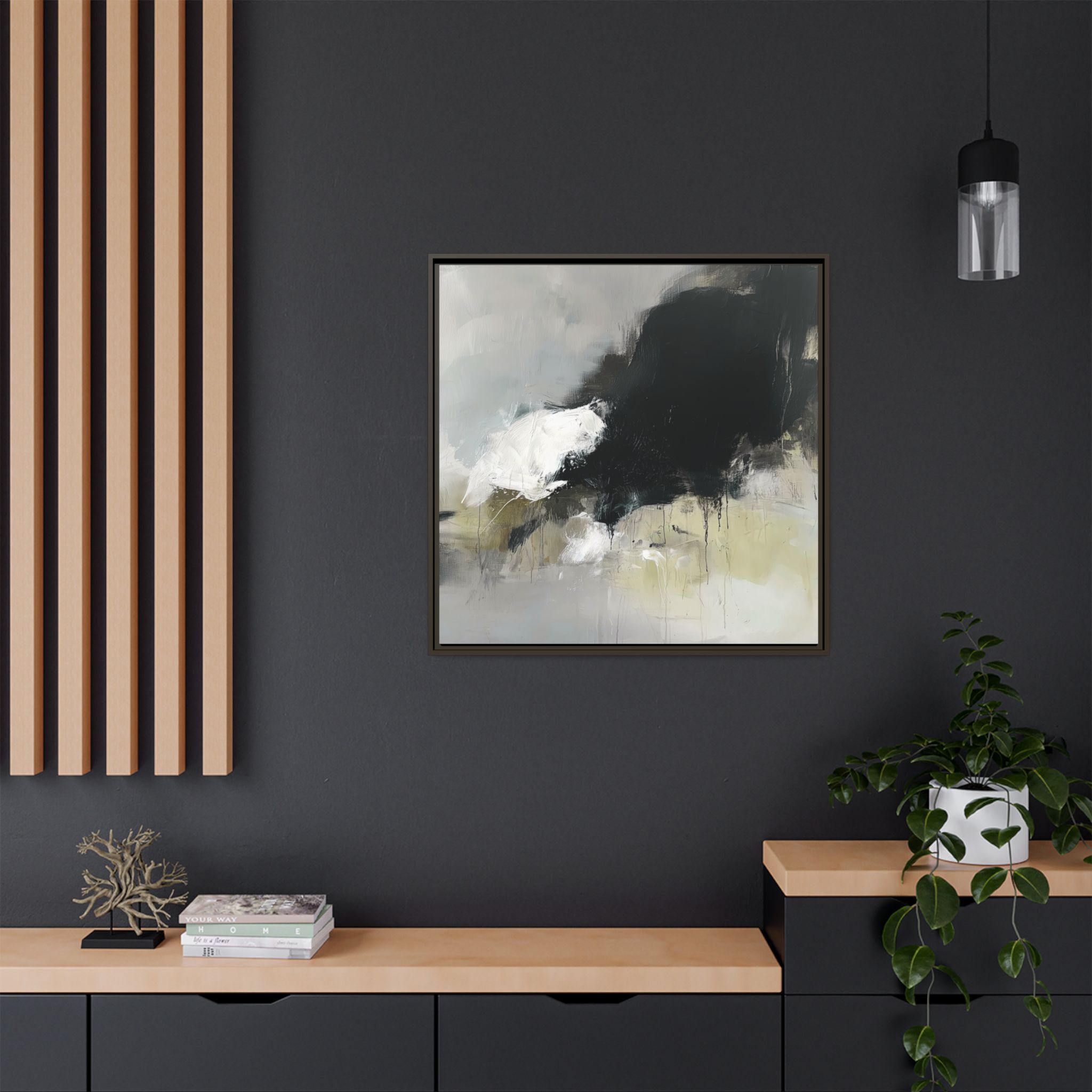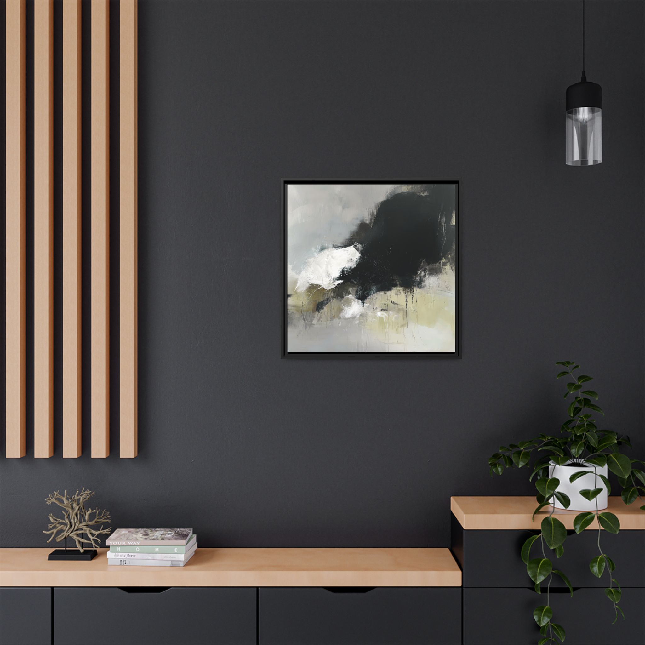 Custom digitally printed artwork on a quality canvas. .Every print in a black pinewood frame will look sleek and beautiful in any interior. The artwork will be printed on the cotton-polyester canvas with a special proprietary coating to make sure it stays vibrant for ages. Environmentally-conscious – it’s made from sustainably sourced materials (Forest Stewardship Council certified) and custom printed on demand no warehouse stocks and no waste. Choose between the designer specified sizes. The sawtooth hanging hardware is already attached.