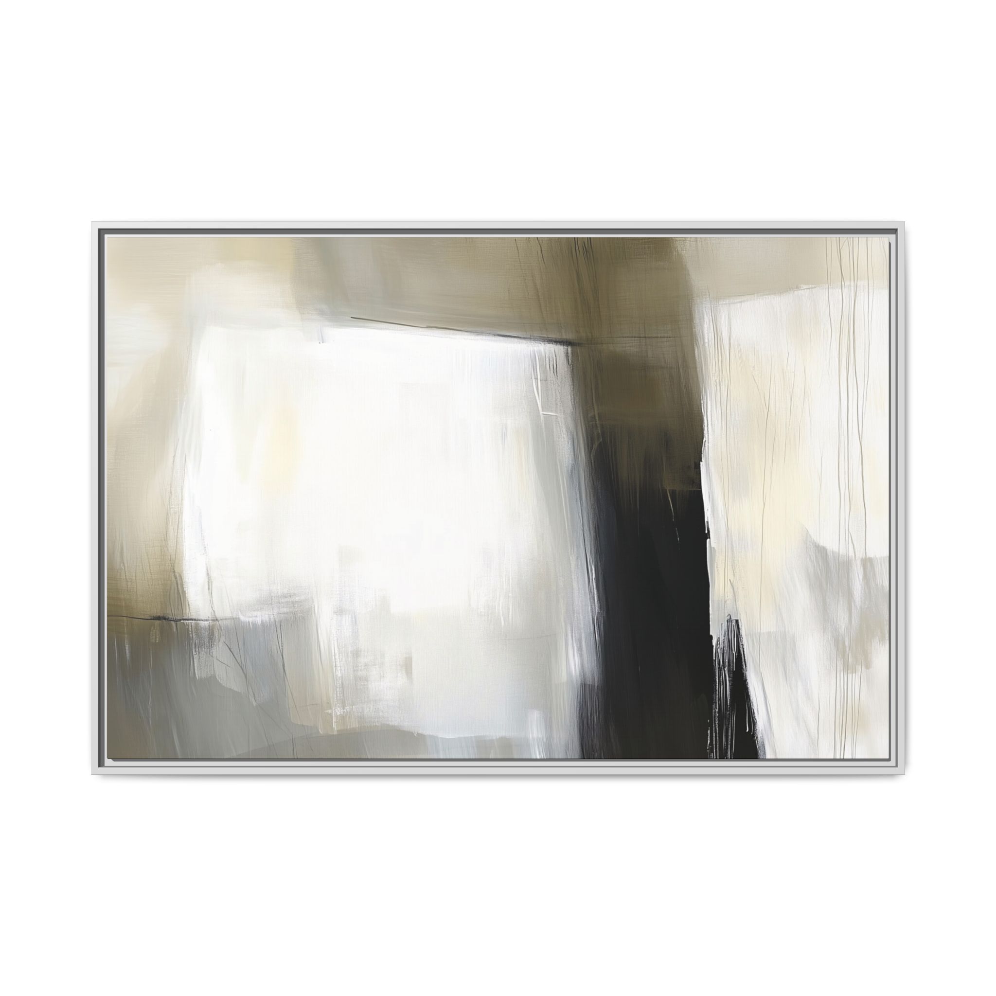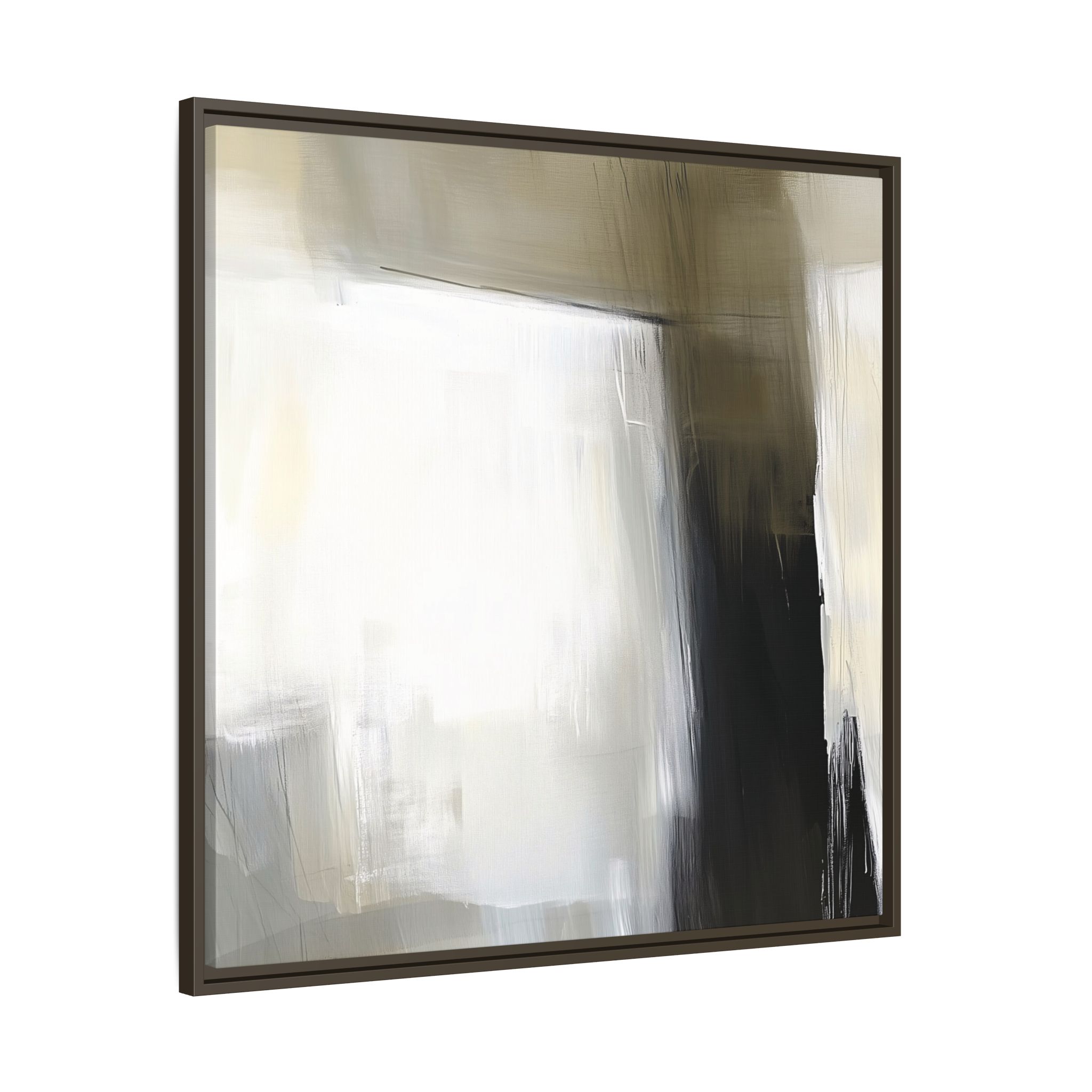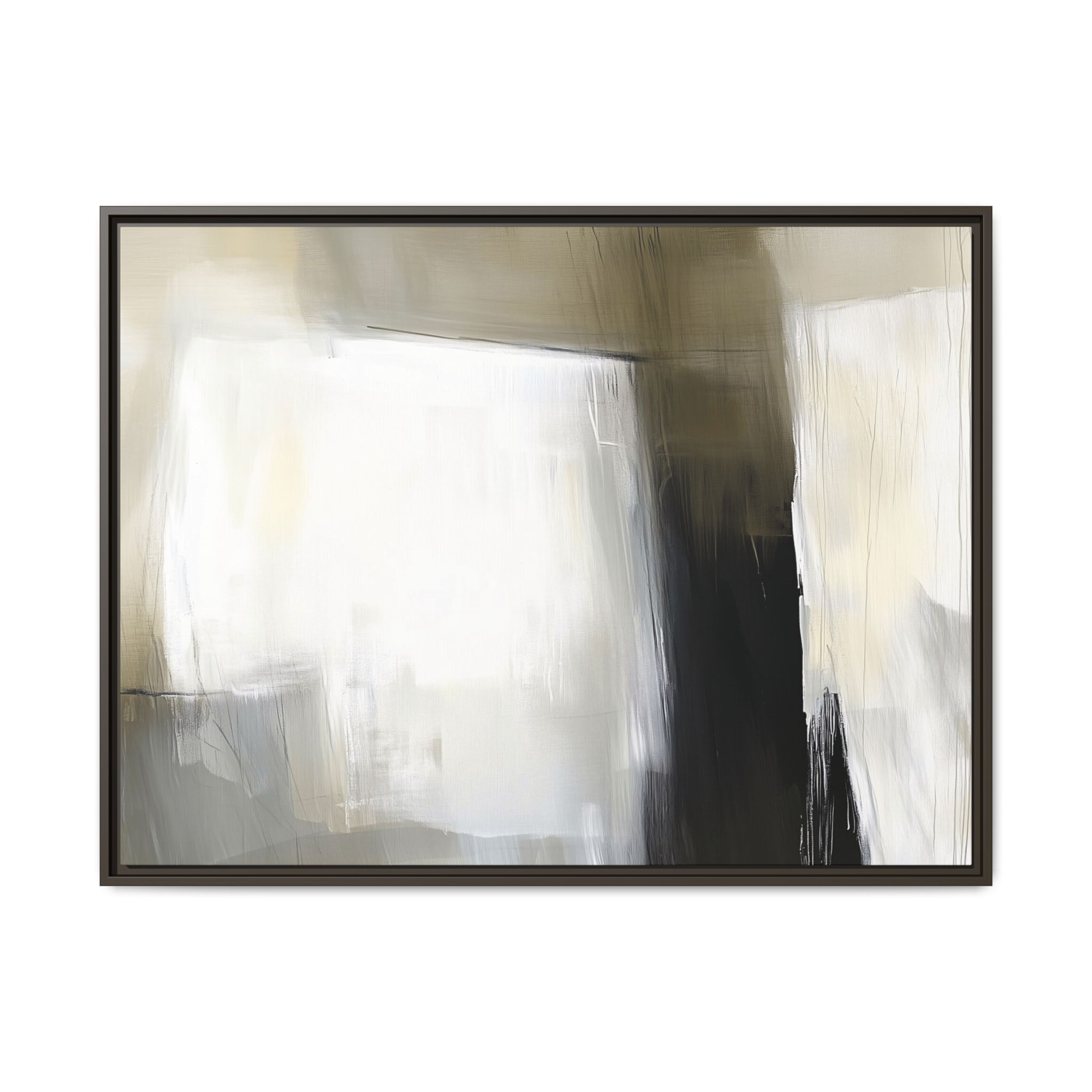 A minimalist abstract canvas print featuring brushed brown, olive and cream shapes, thin lines, flat lighting, brush strokes, and subtle color transitions. This artwork gives a modern and sophisticated vibe, perfect for contemporary home decor enthusiasts and art lovers. Ideal for adding a touch of elegance to living rooms, bedrooms, or home offices. Relevant for gift-giving occasions like housewarming parties, birthdays, and holidays.