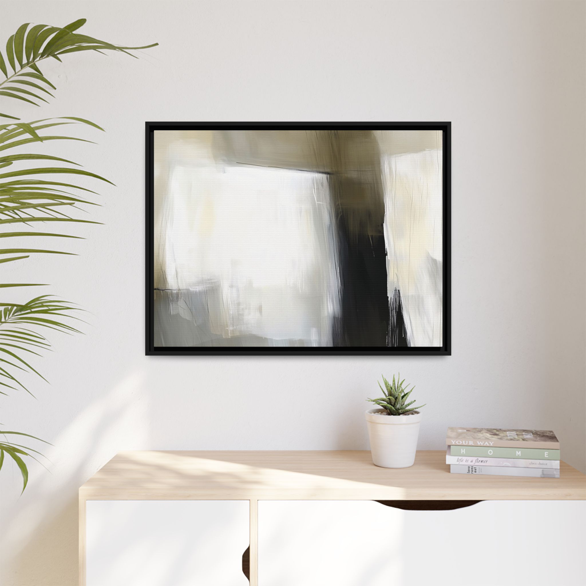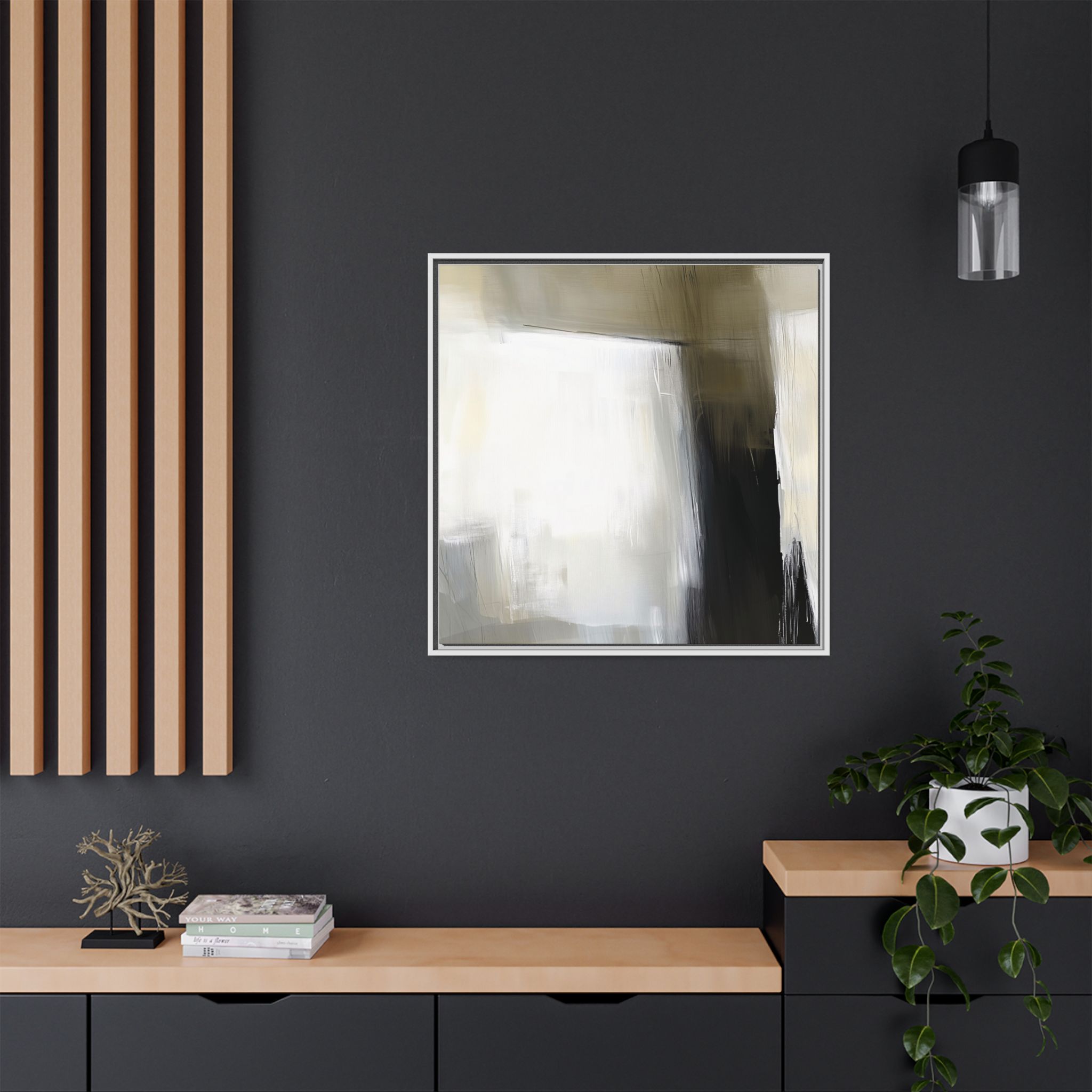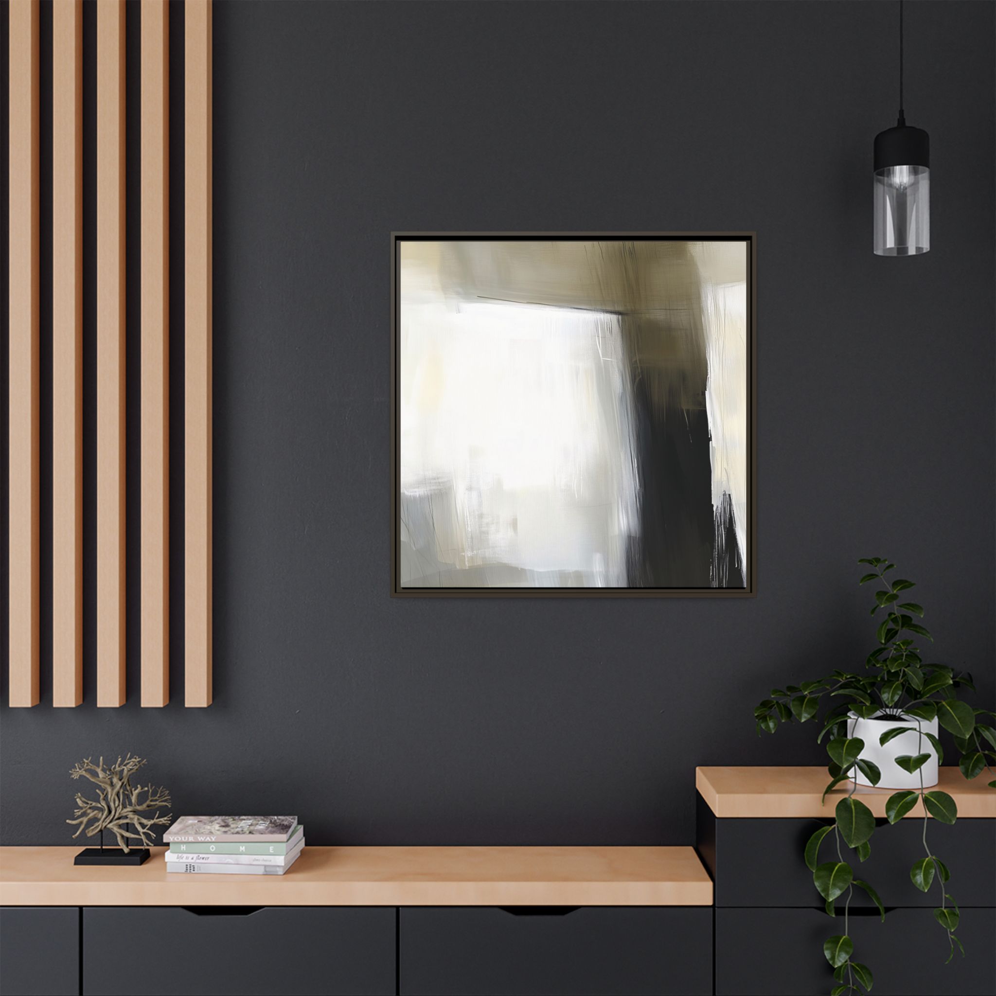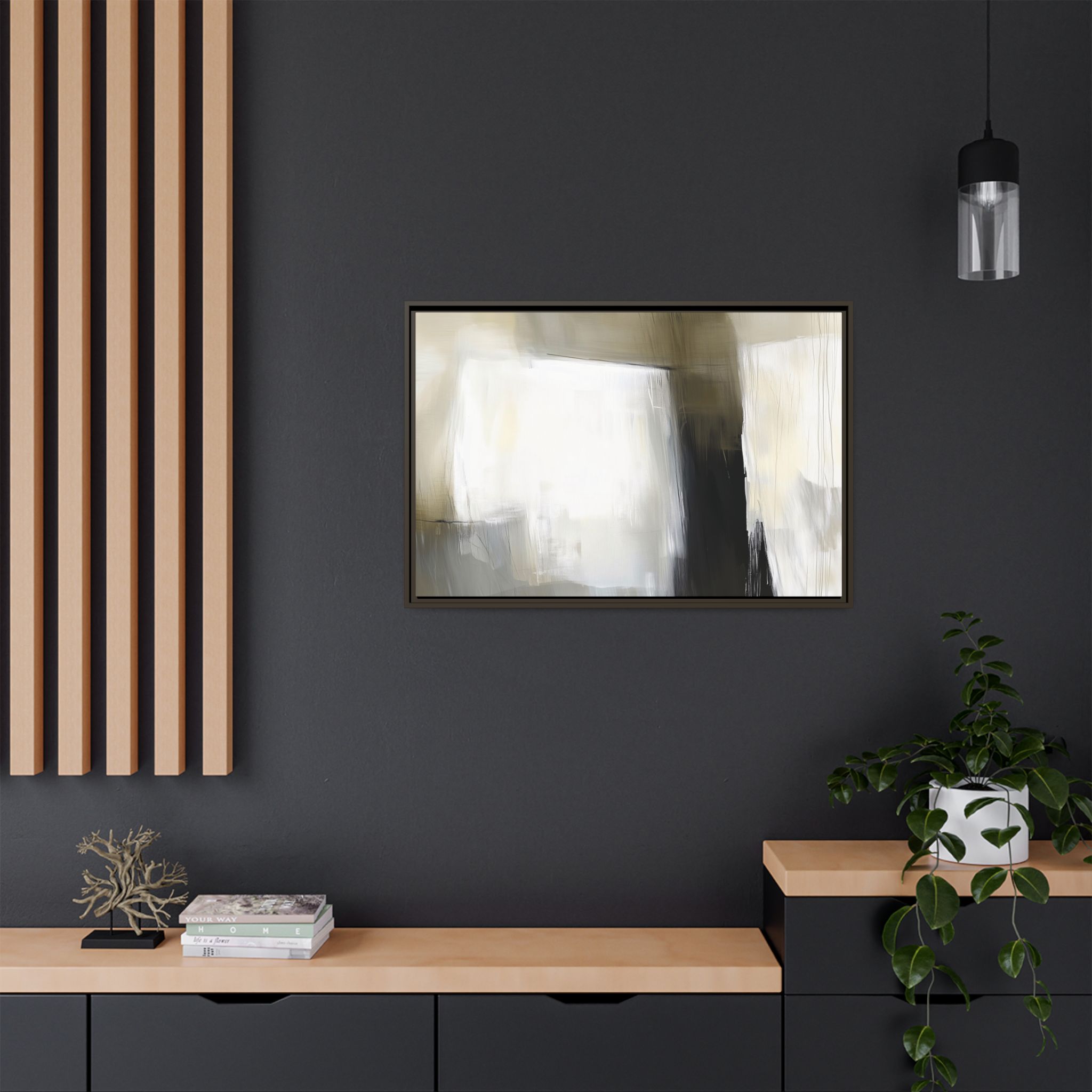 Custom digitally printed artwork on a quality canvas. .Every print in a black pinewood frame will look sleek and beautiful in any interior. The artwork will be printed on the cotton-polyester canvas with a special proprietary coating to make sure it stays vibrant for ages. Environmentally-conscious – it’s made from sustainably sourced materials (Forest Stewardship Council certified) and custom printed on demand no warehouse stocks and no waste. Choose between the designer specified sizes. The sawtooth hanging hardware is already attached.