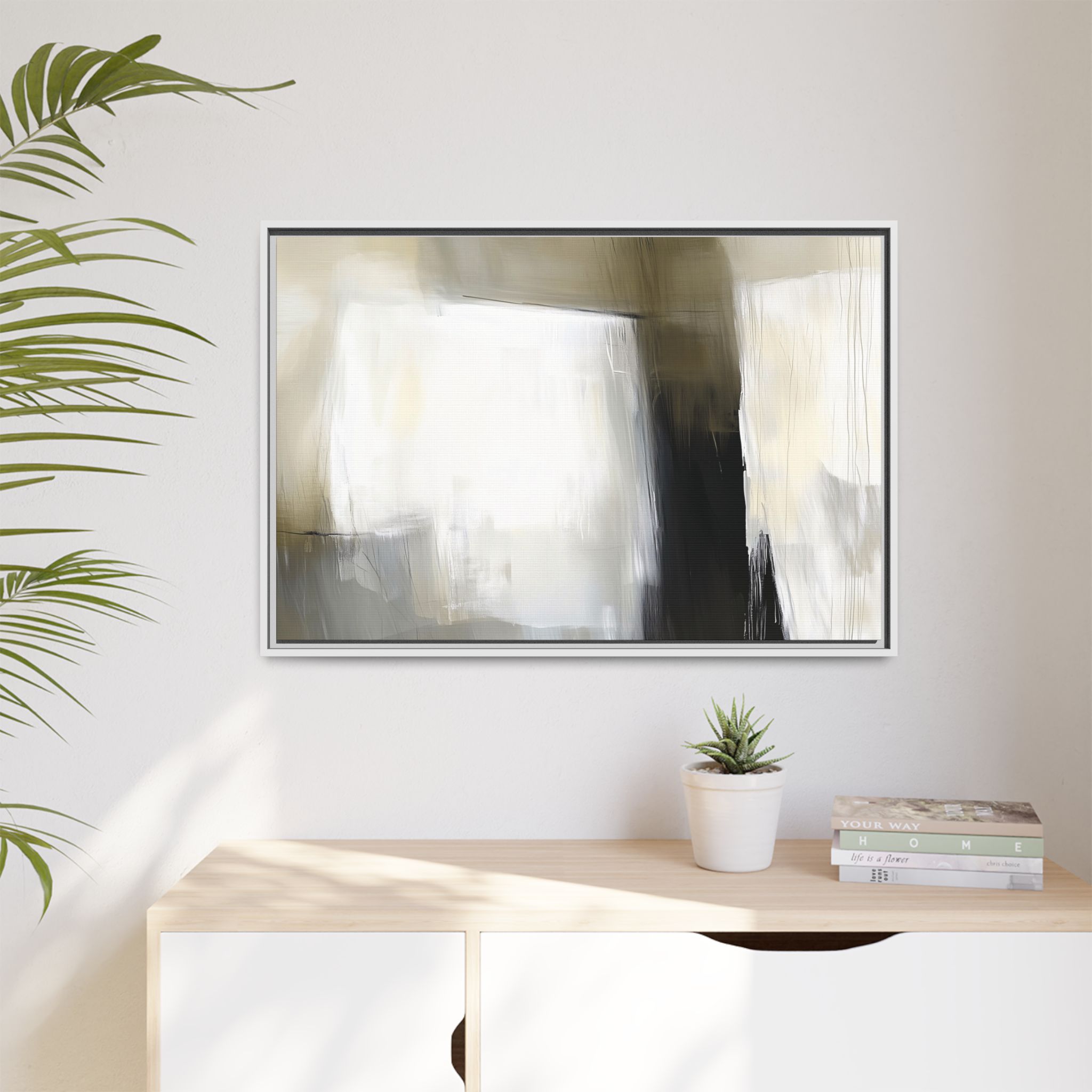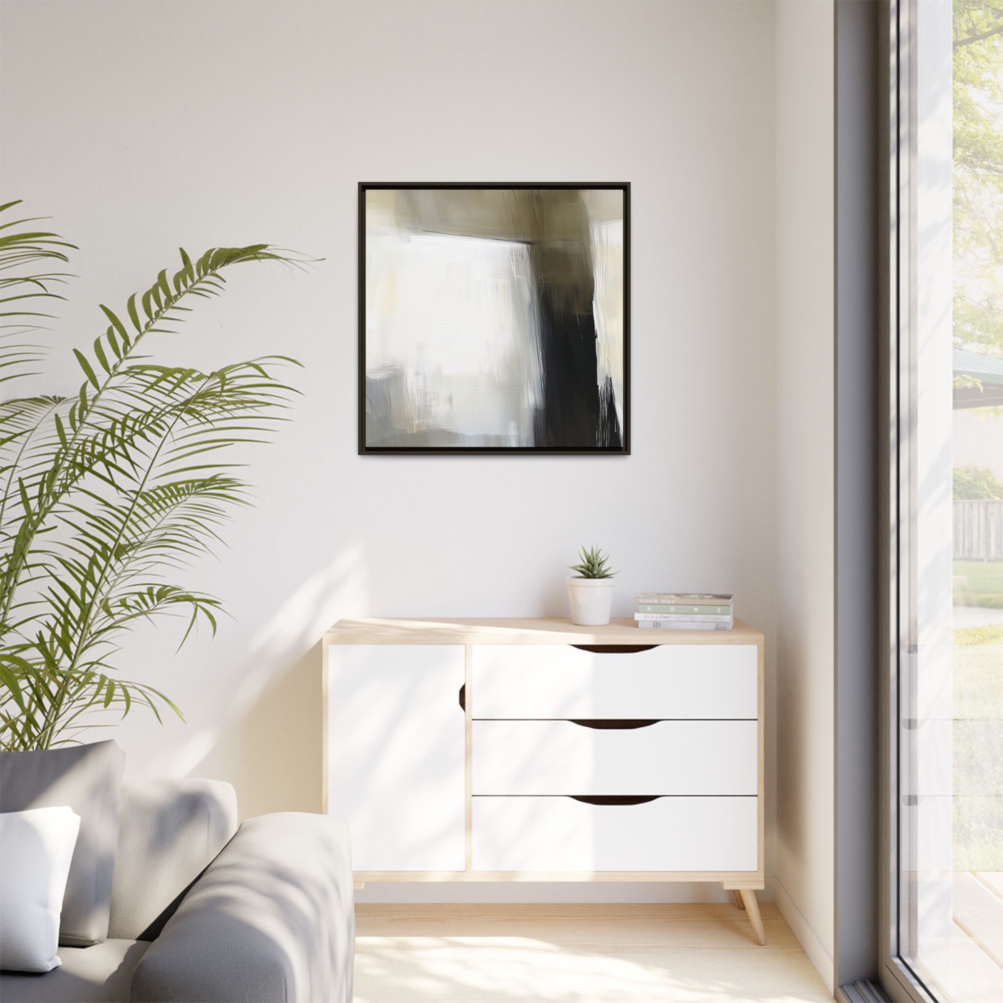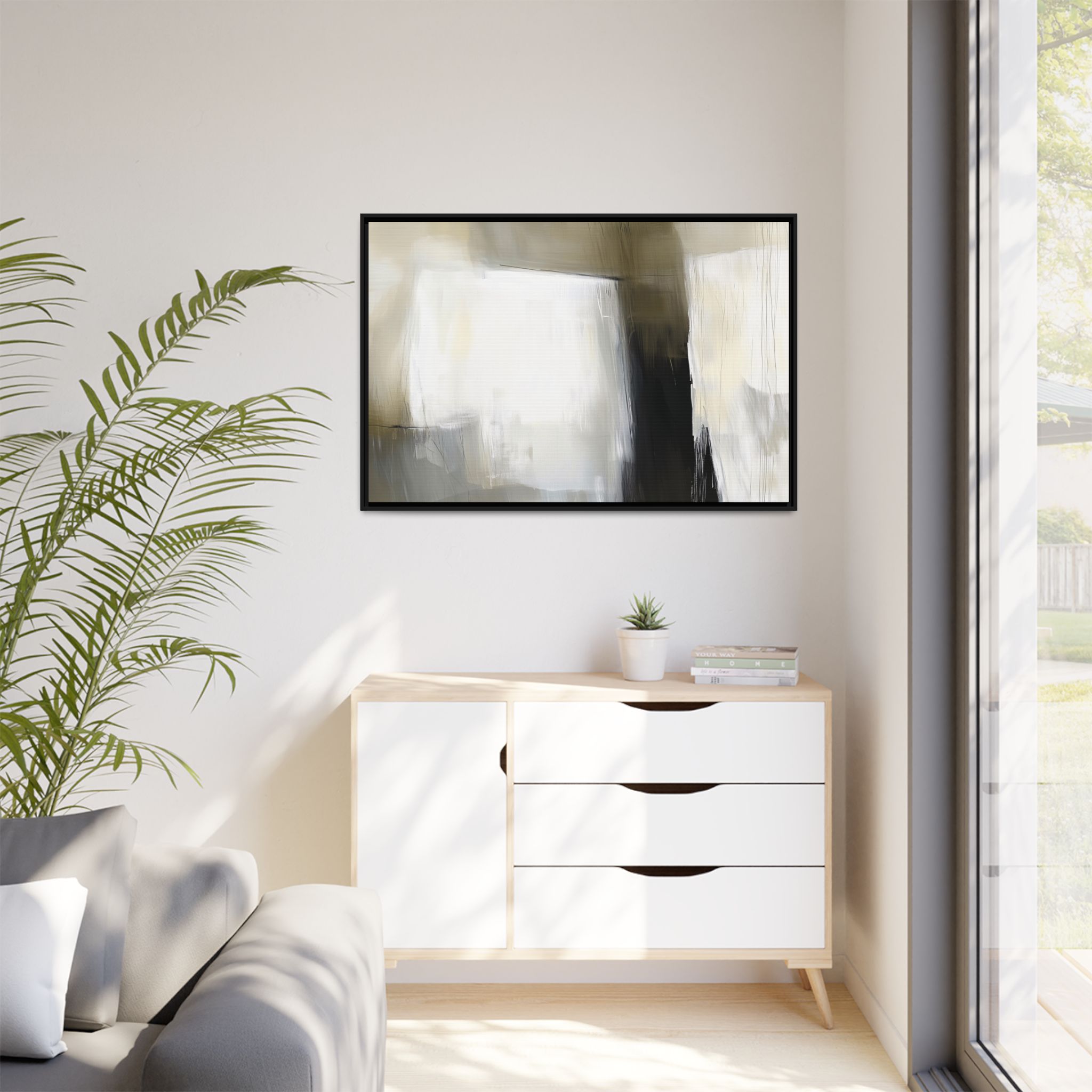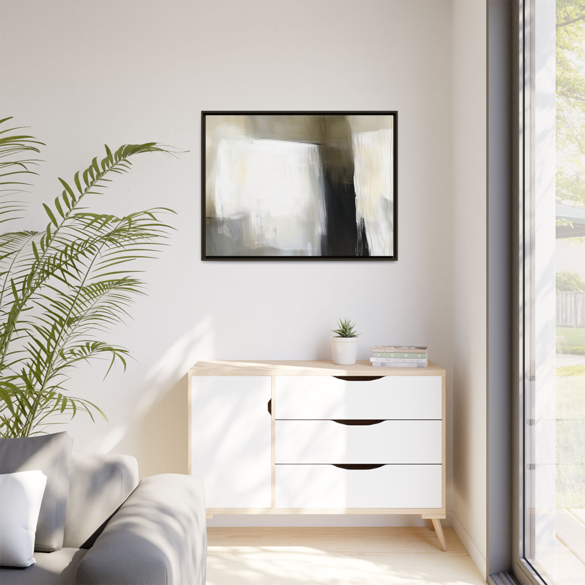 Custom digitally printed artwork on a quality canvas. .Every print in a black pinewood frame will look sleek and beautiful in any interior. The artwork will be printed on the cotton-polyester canvas with a special proprietary coating to make sure it stays vibrant for ages. Environmentally-conscious – it’s made from sustainably sourced materials (Forest Stewardship Council certified) and custom printed on demand no warehouse stocks and no waste. Choose between the designer specified sizes. The sawtooth hanging hardware is already attached.