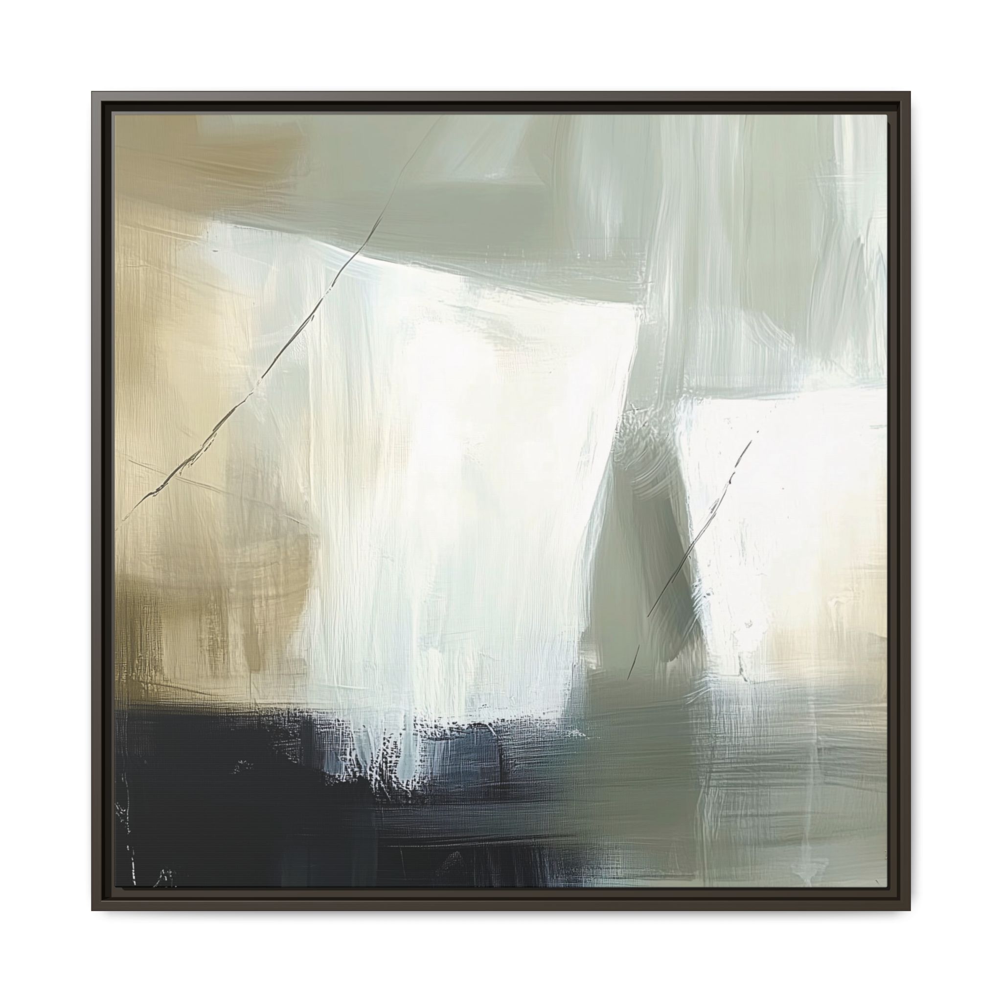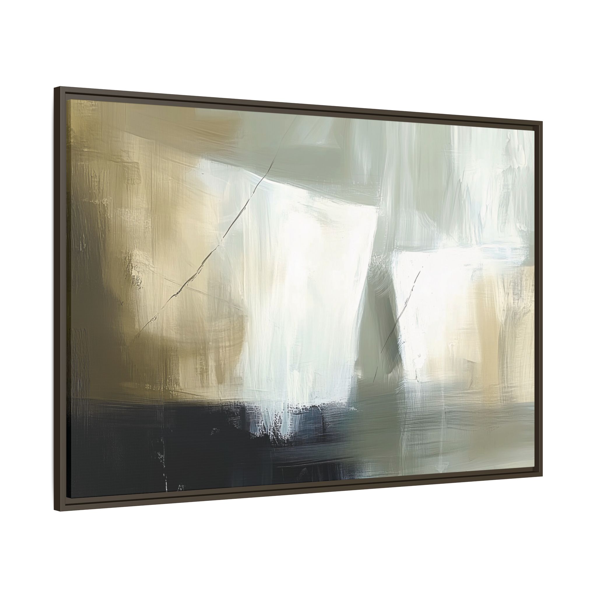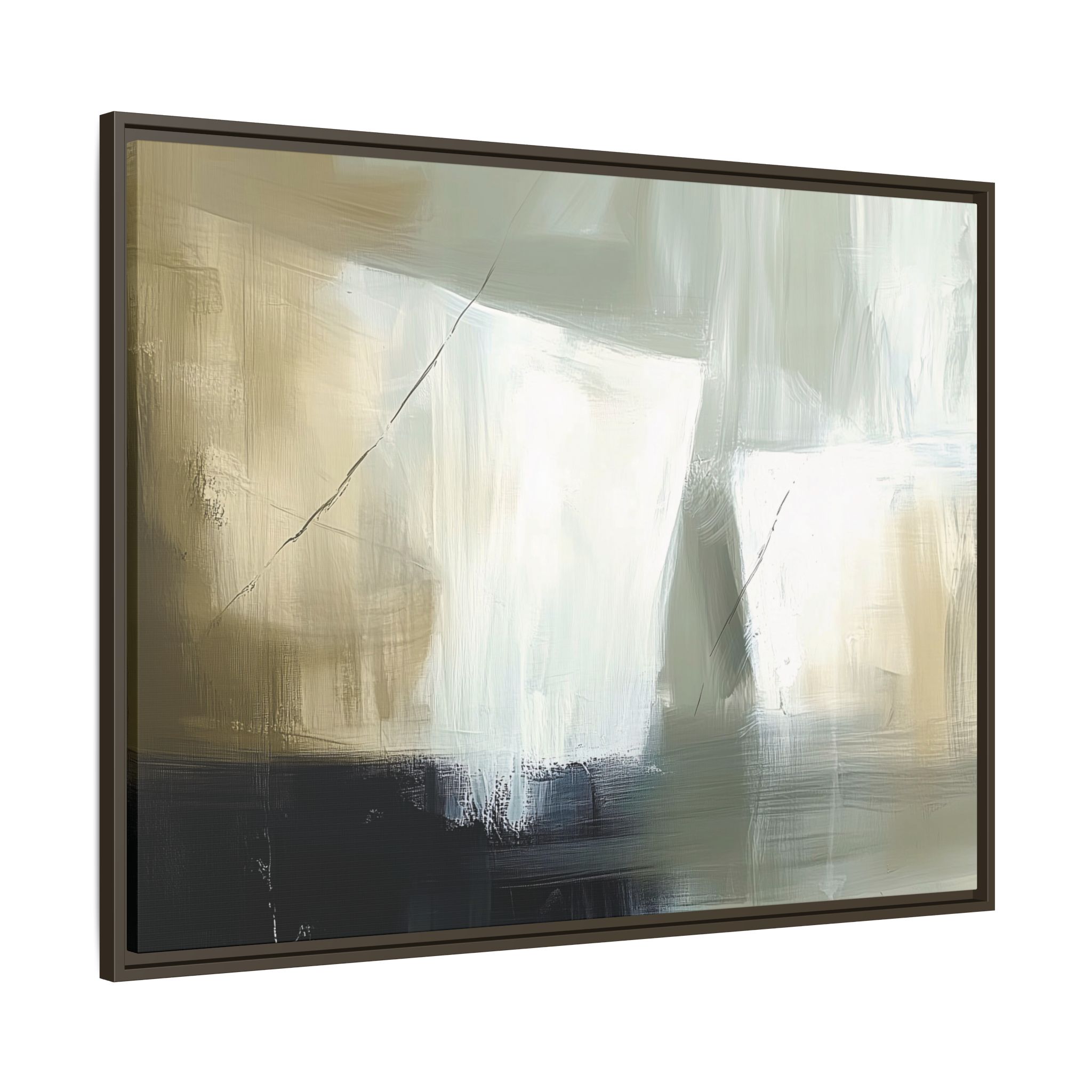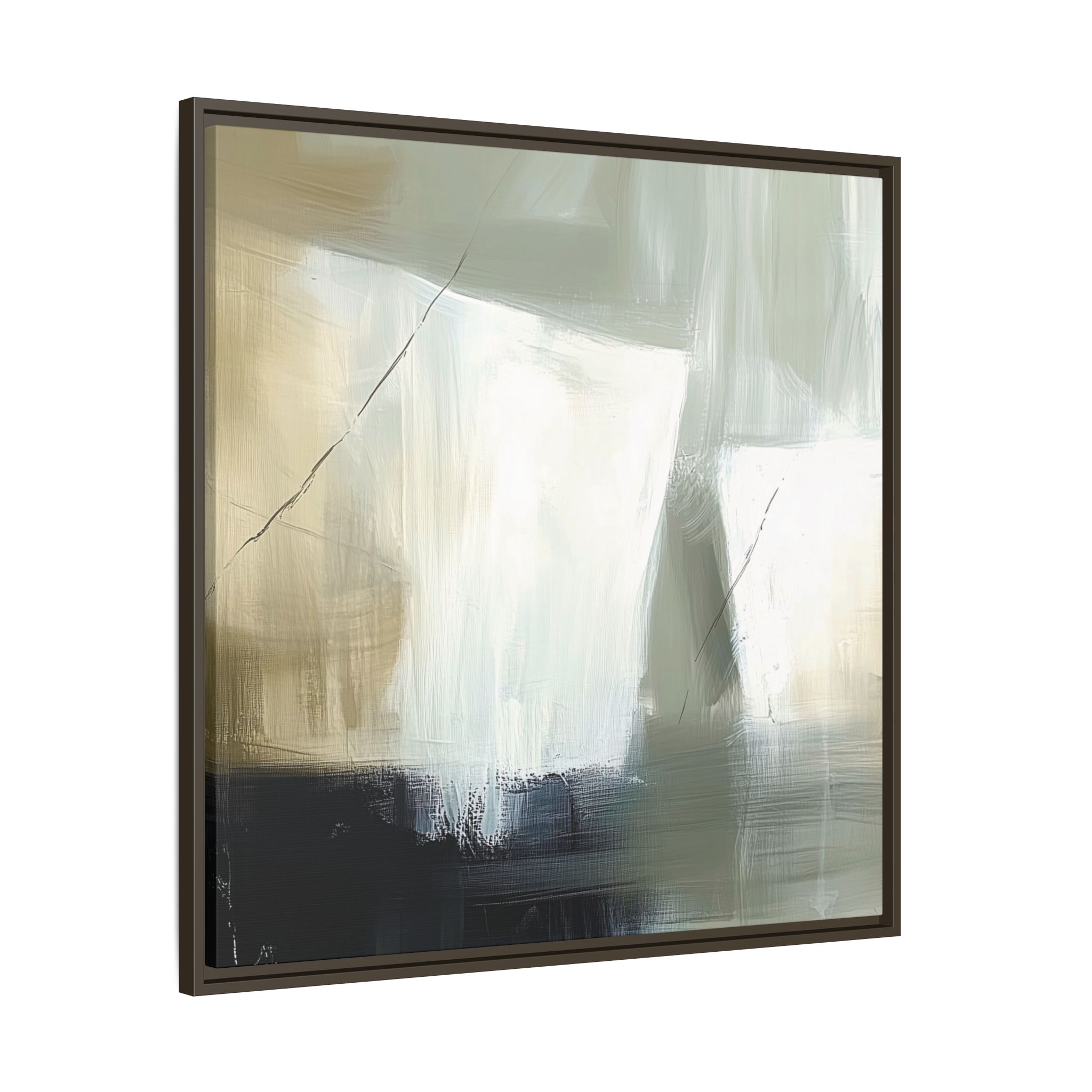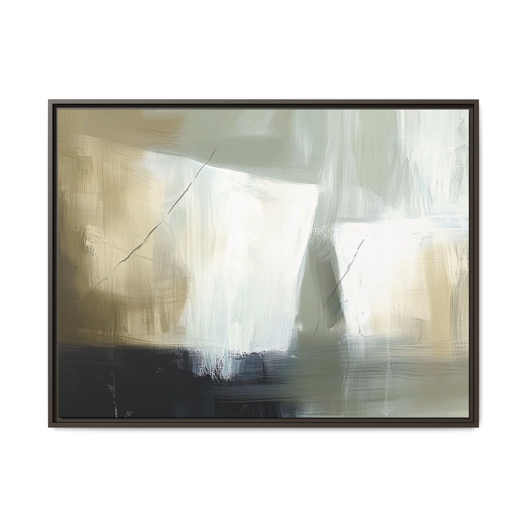 A minimalist abstract canvas print featuring brushed brown, olive and cream shapes, thin lines, flat lighting, brush strokes, and subtle color transitions. This artwork gives a modern and sophisticated vibe, perfect for contemporary home decor enthusiasts and art lovers. Ideal for adding a touch of elegance to living rooms, bedrooms, or home offices. Relevant for gift-giving occasions like housewarming parties, birthdays, and holidays.