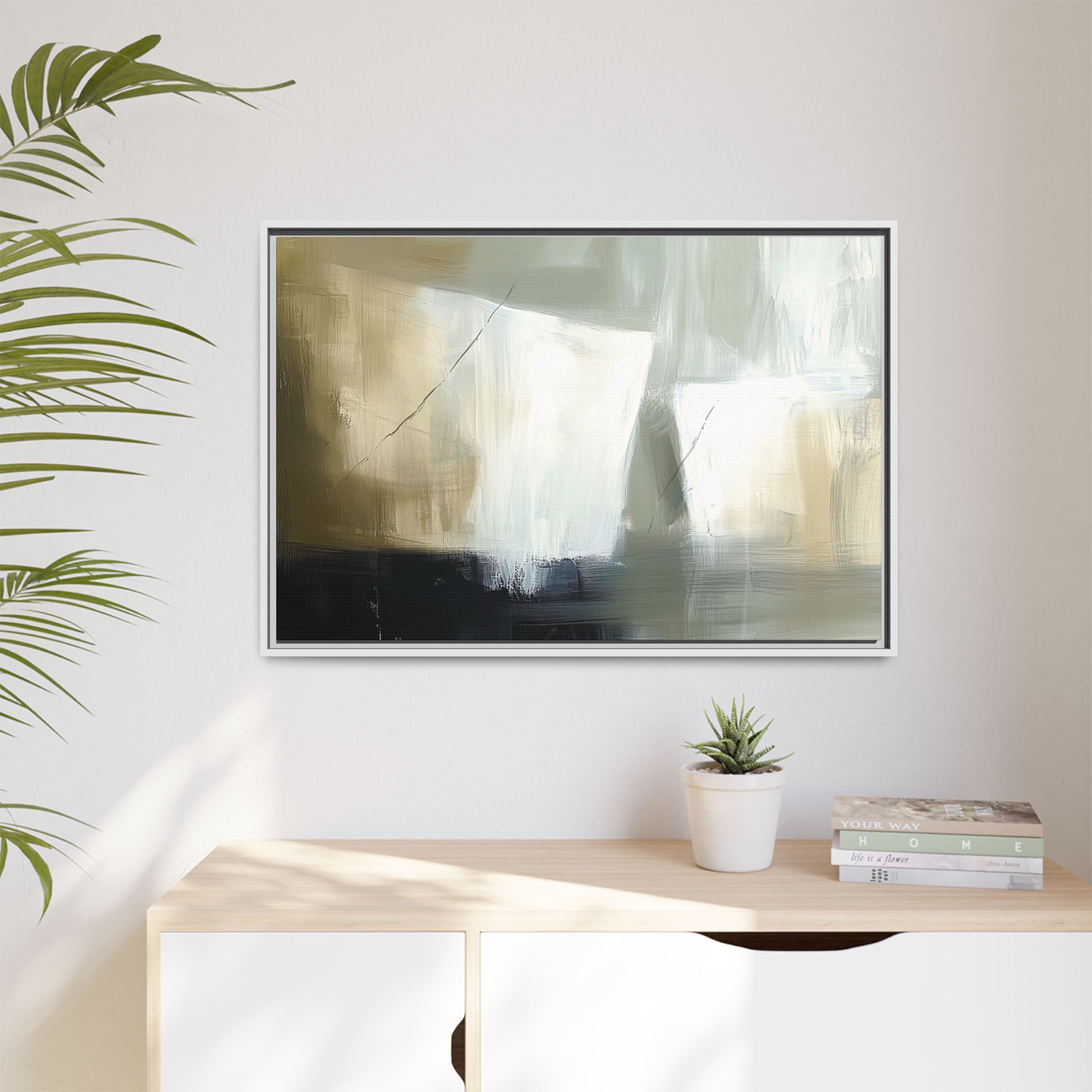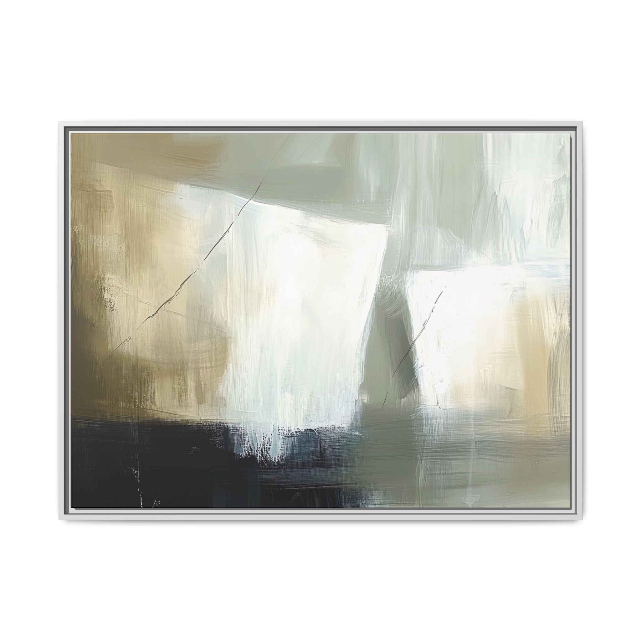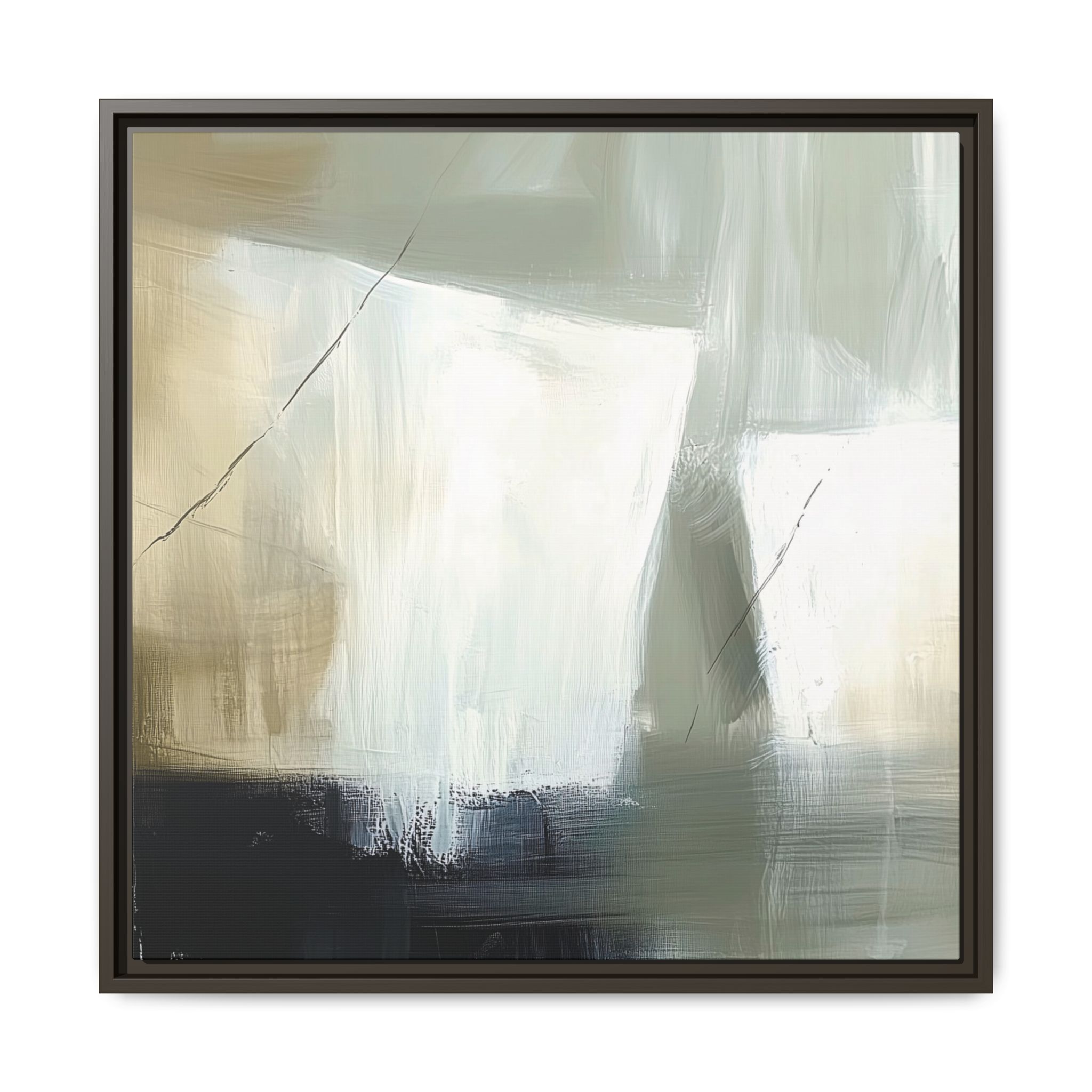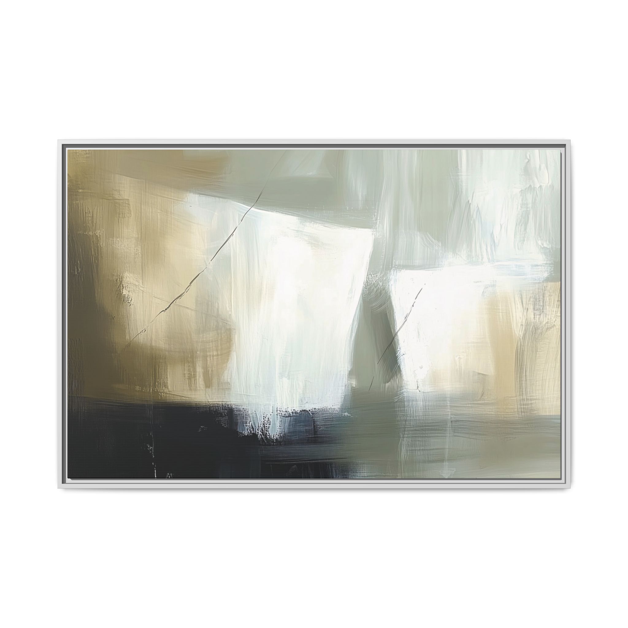 A minimalist abstract canvas print featuring brushed brown, olive and cream shapes, thin lines, flat lighting, brush strokes, and subtle color transitions. This artwork gives a modern and sophisticated vibe, perfect for contemporary home decor enthusiasts and art lovers. Ideal for adding a touch of elegance to living rooms, bedrooms, or home offices. Relevant for gift-giving occasions like housewarming parties, birthdays, and holidays.