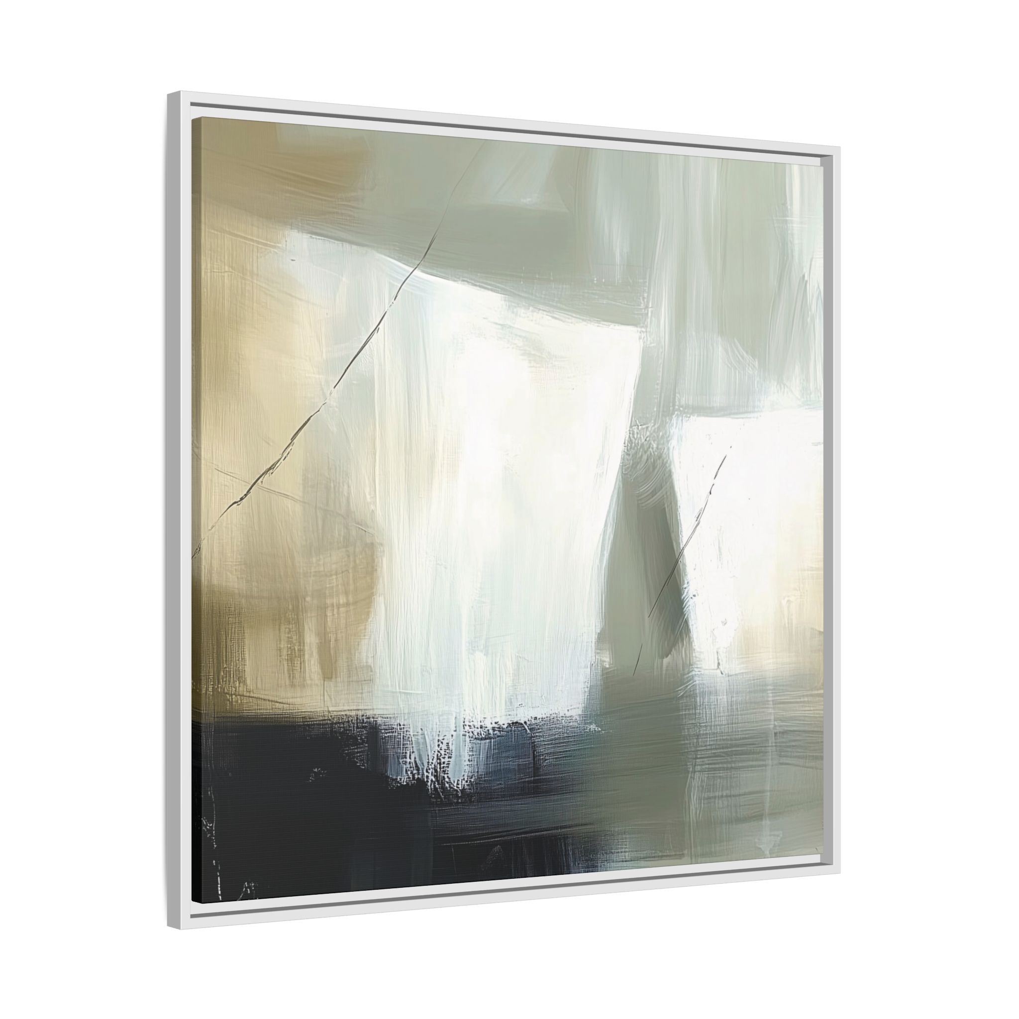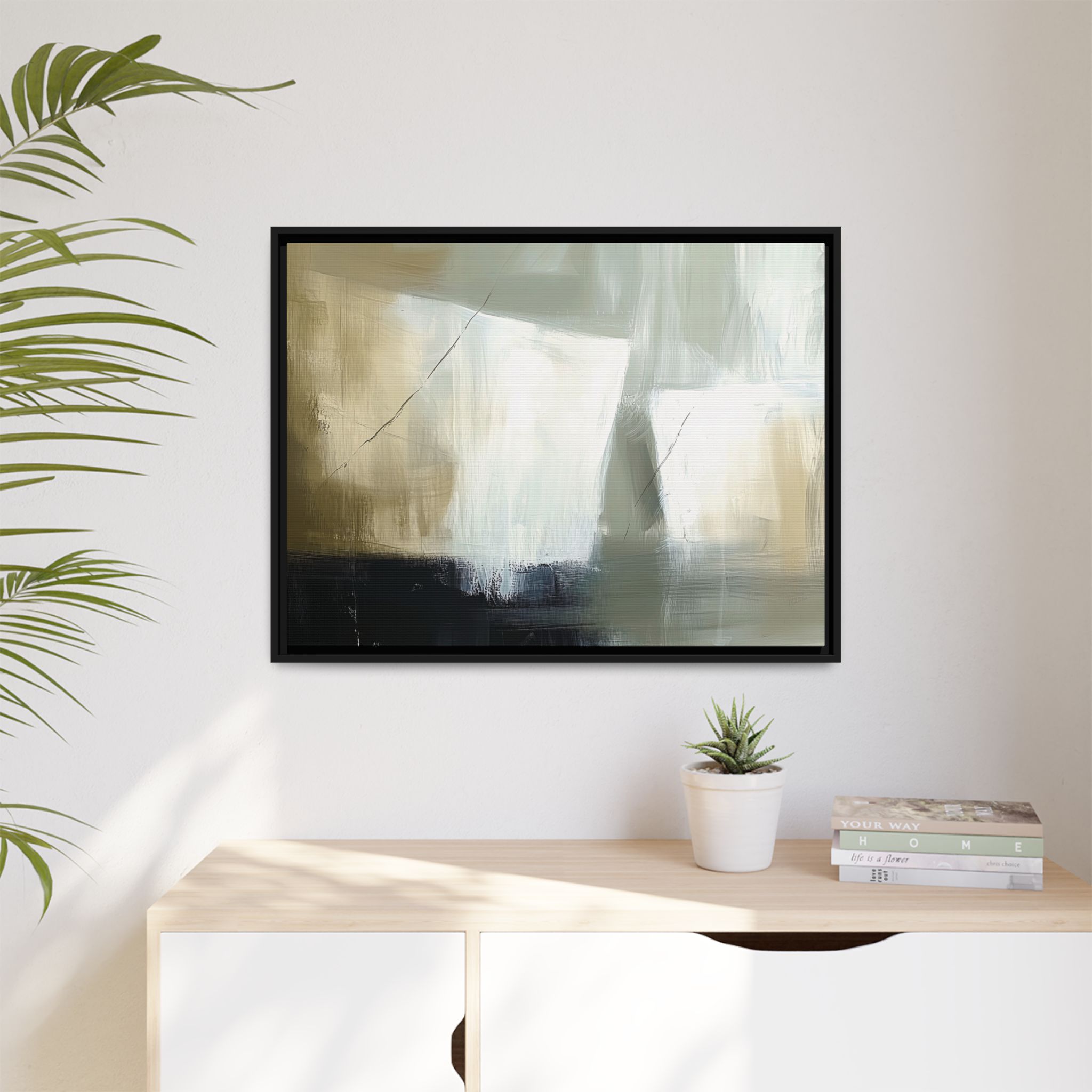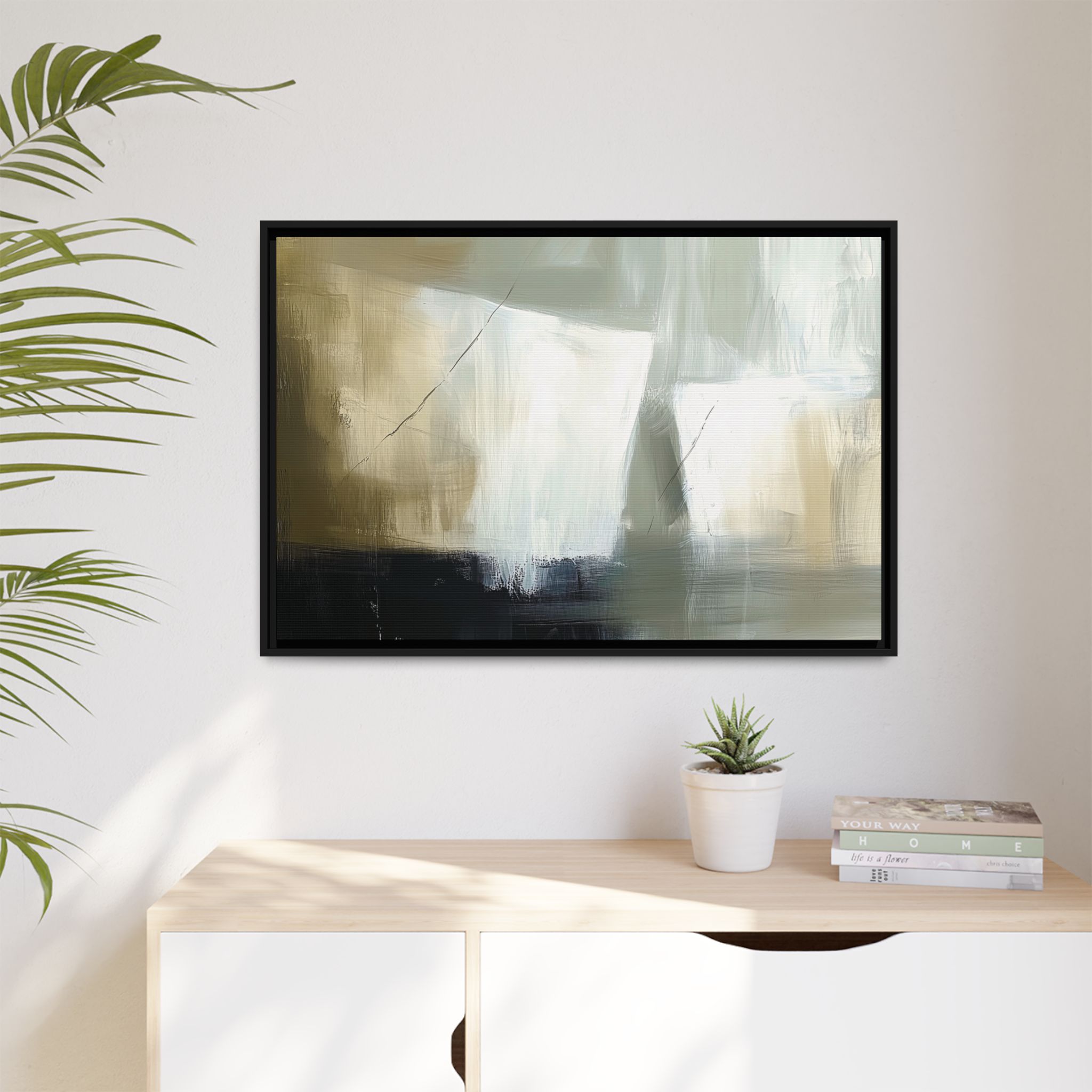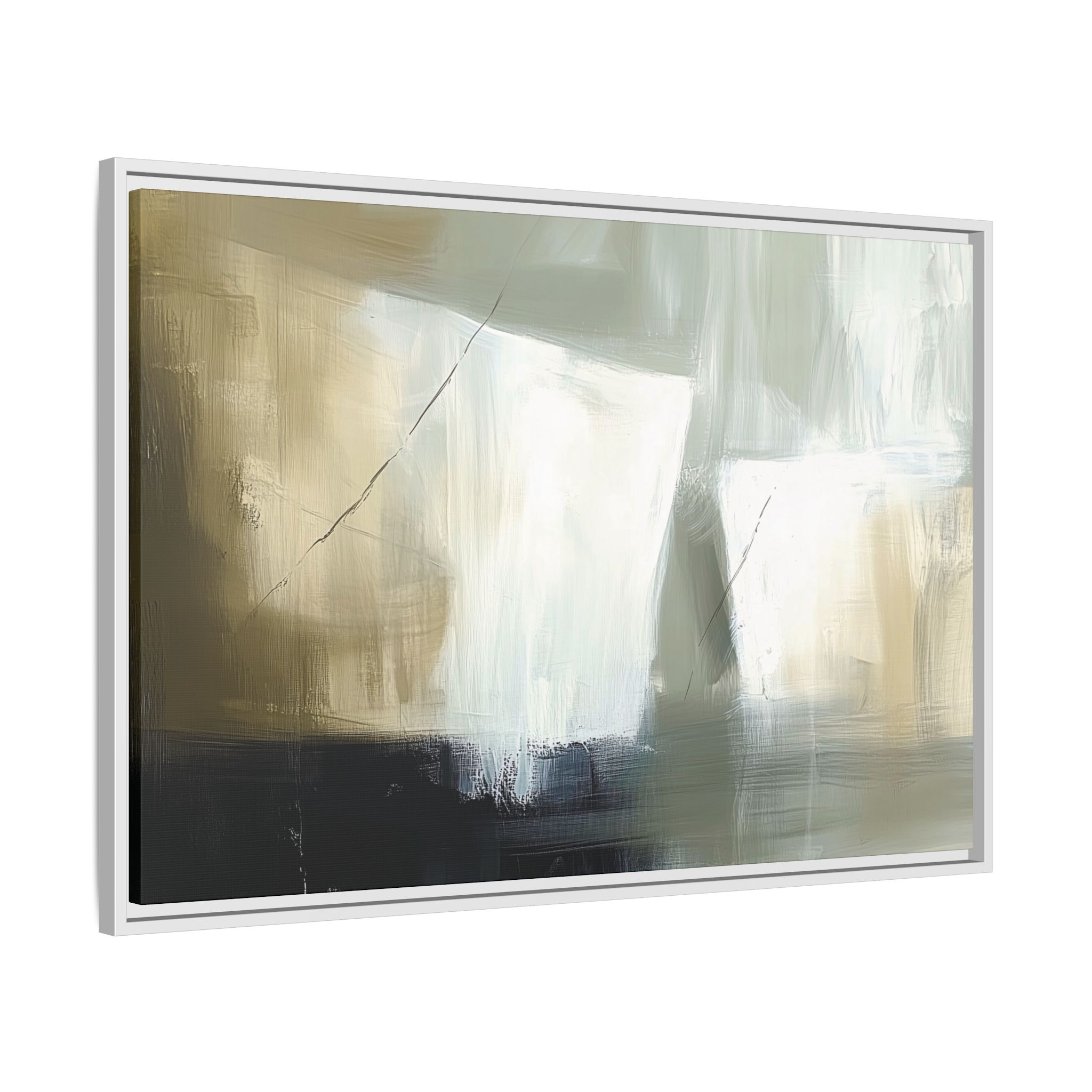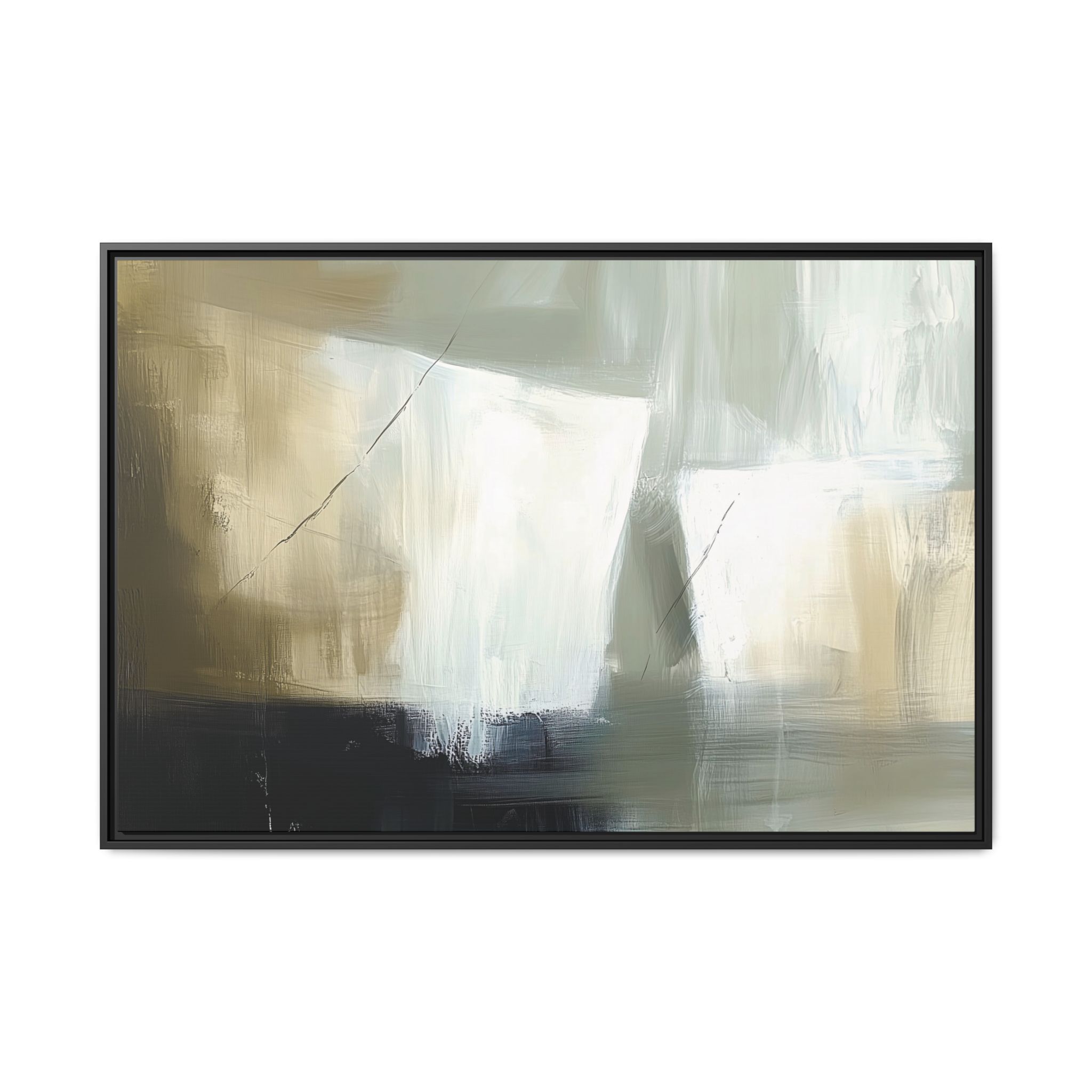 A minimalist abstract canvas print featuring brushed brown, olive and cream shapes, thin lines, flat lighting, brush strokes, and subtle color transitions. This artwork gives a modern and sophisticated vibe, perfect for contemporary home decor enthusiasts and art lovers. Ideal for adding a touch of elegance to living rooms, bedrooms, or home offices. Relevant for gift-giving occasions like housewarming parties, birthdays, and holidays.