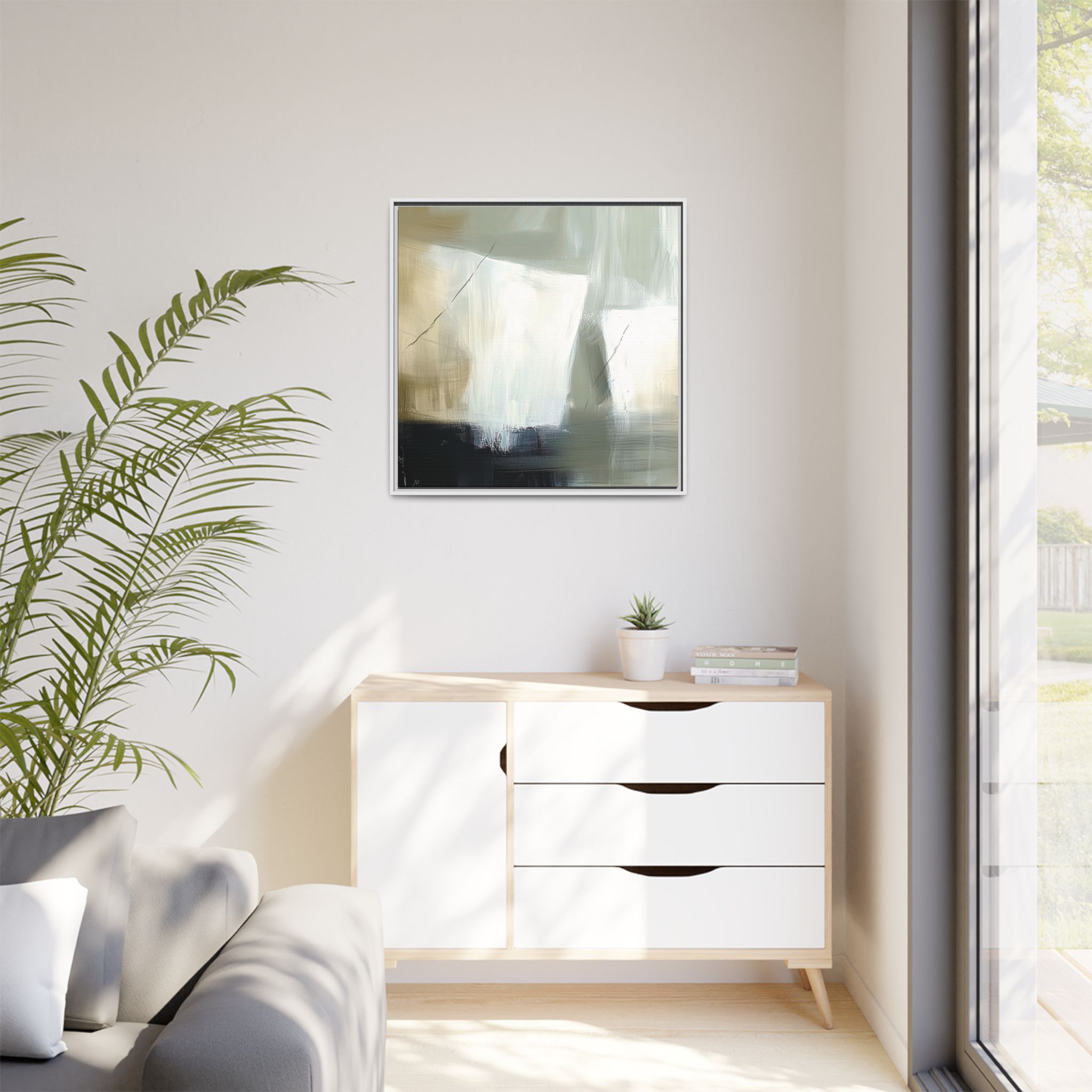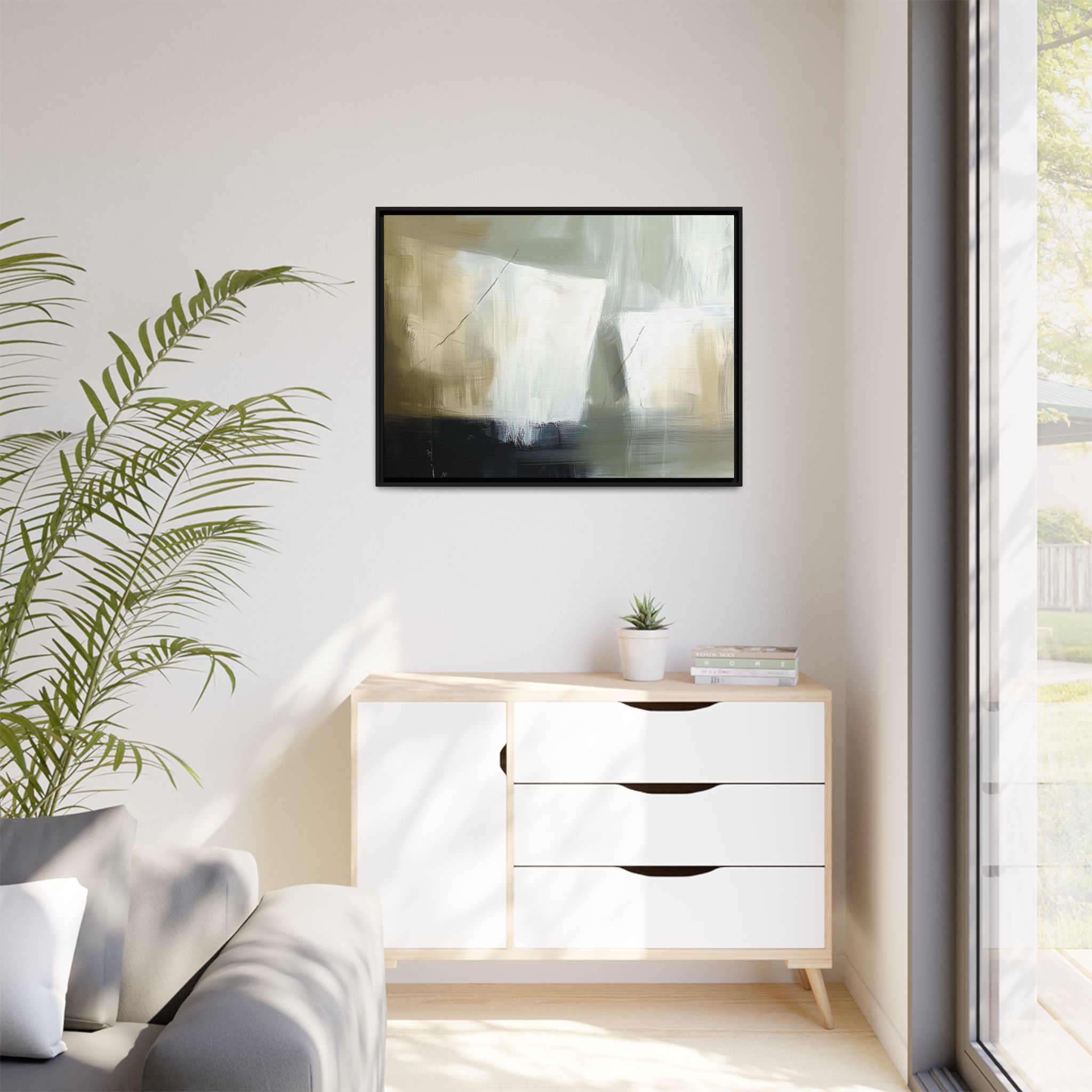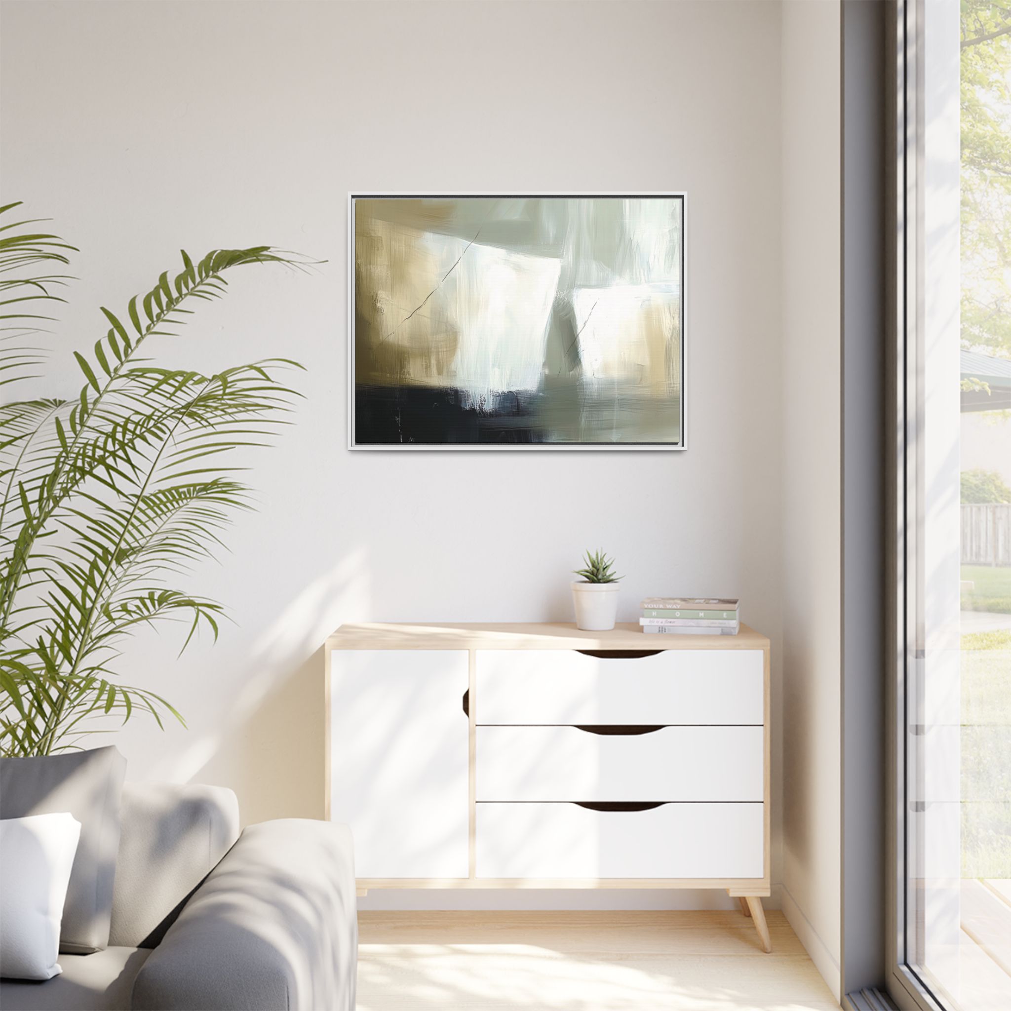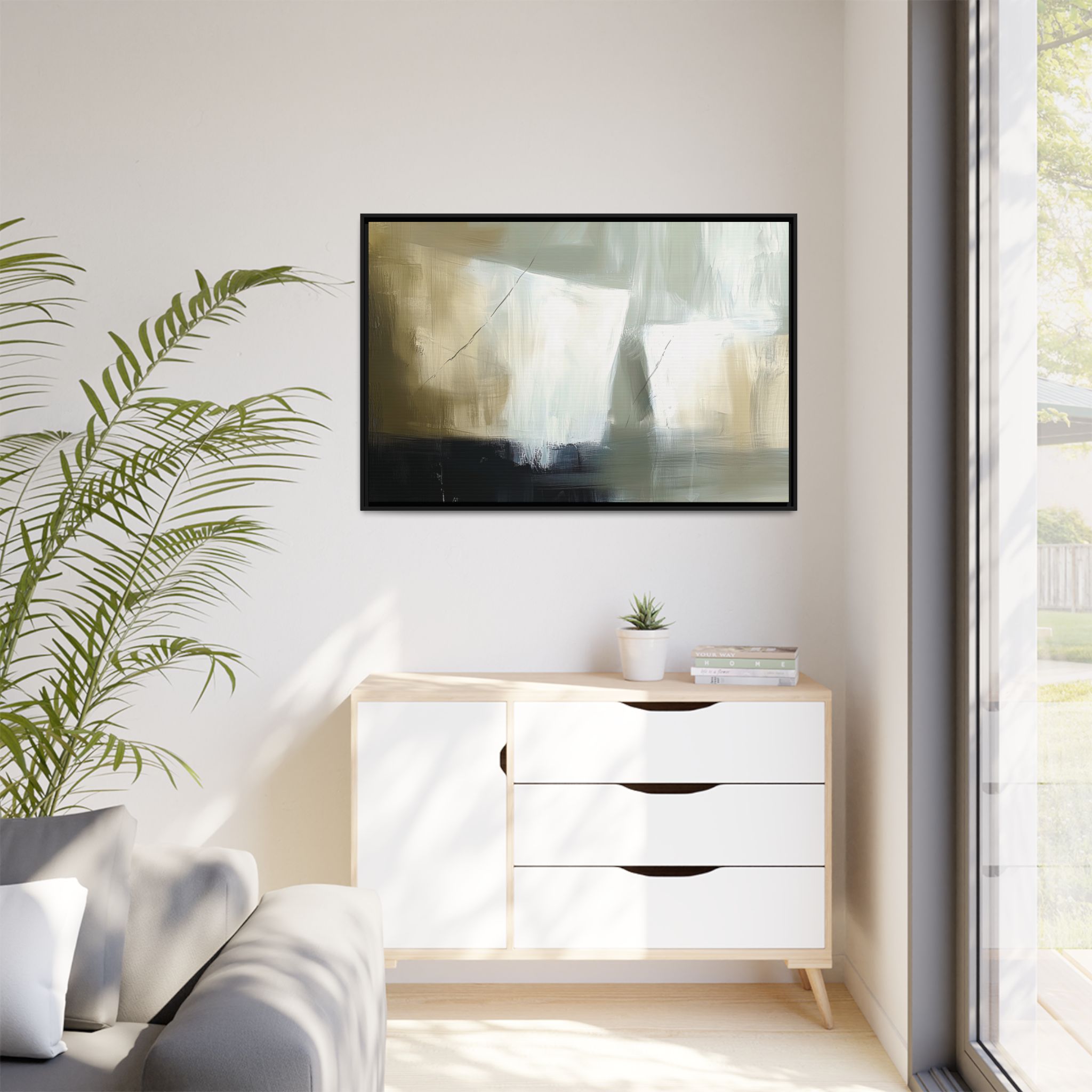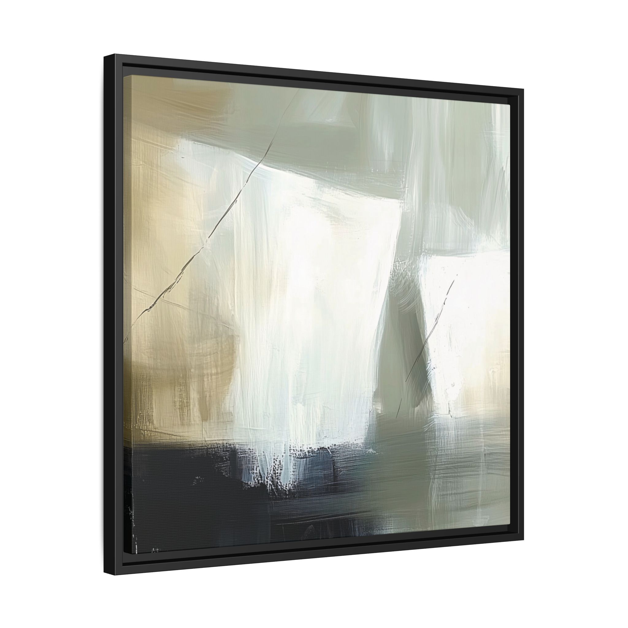 A minimalist abstract canvas print featuring brushed brown, olive and cream shapes, thin lines, flat lighting, brush strokes, and subtle color transitions. This artwork gives a modern and sophisticated vibe, perfect for contemporary home decor enthusiasts and art lovers. Ideal for adding a touch of elegance to living rooms, bedrooms, or home offices. Relevant for gift-giving occasions like housewarming parties, birthdays, and holidays.