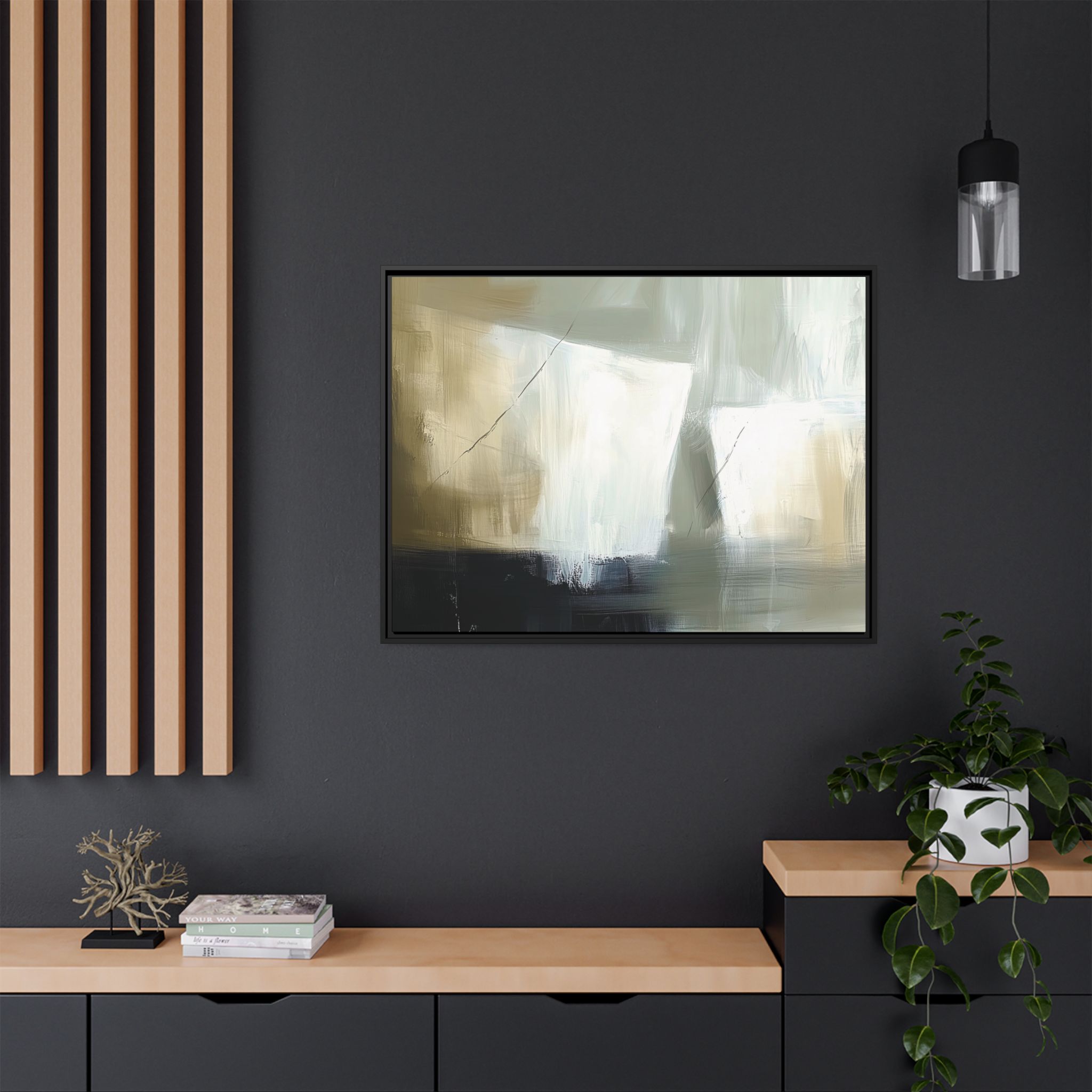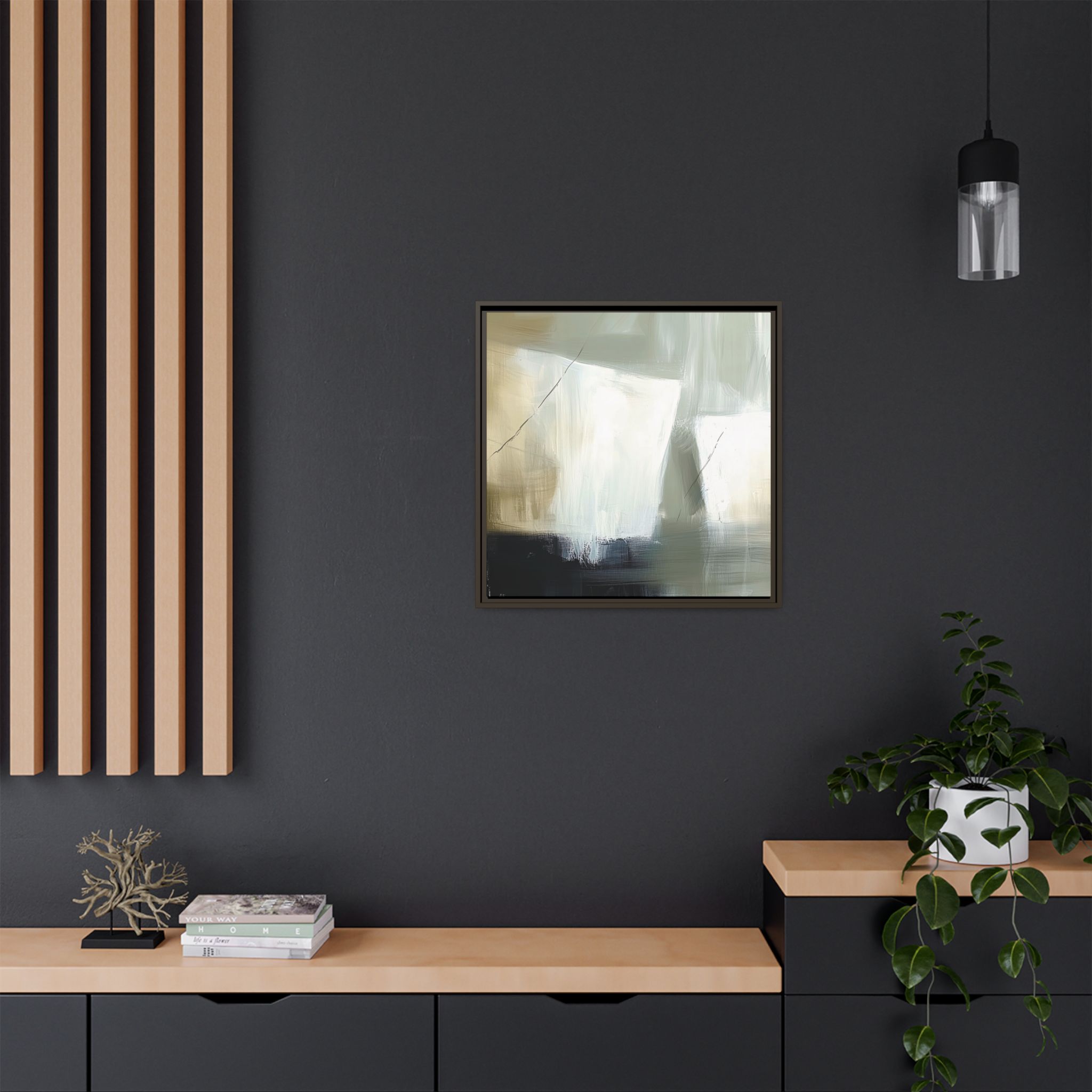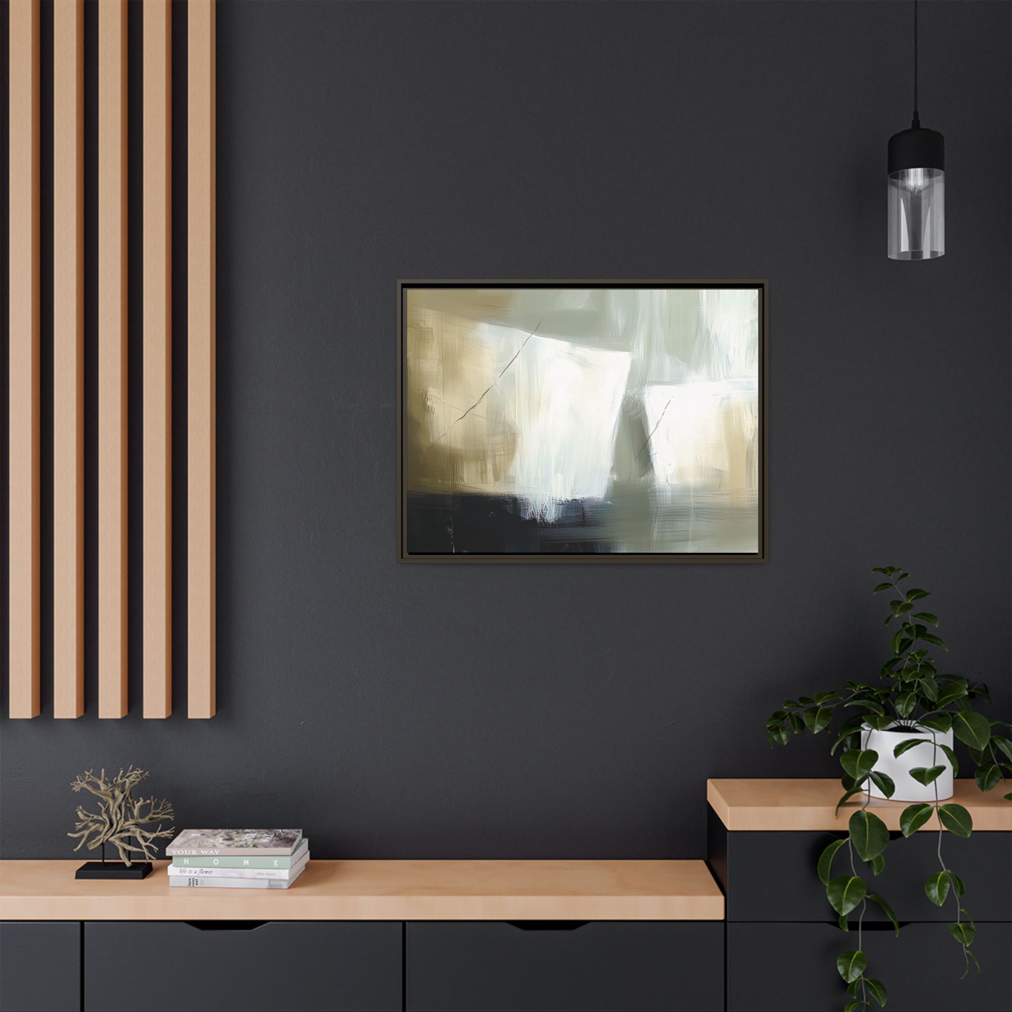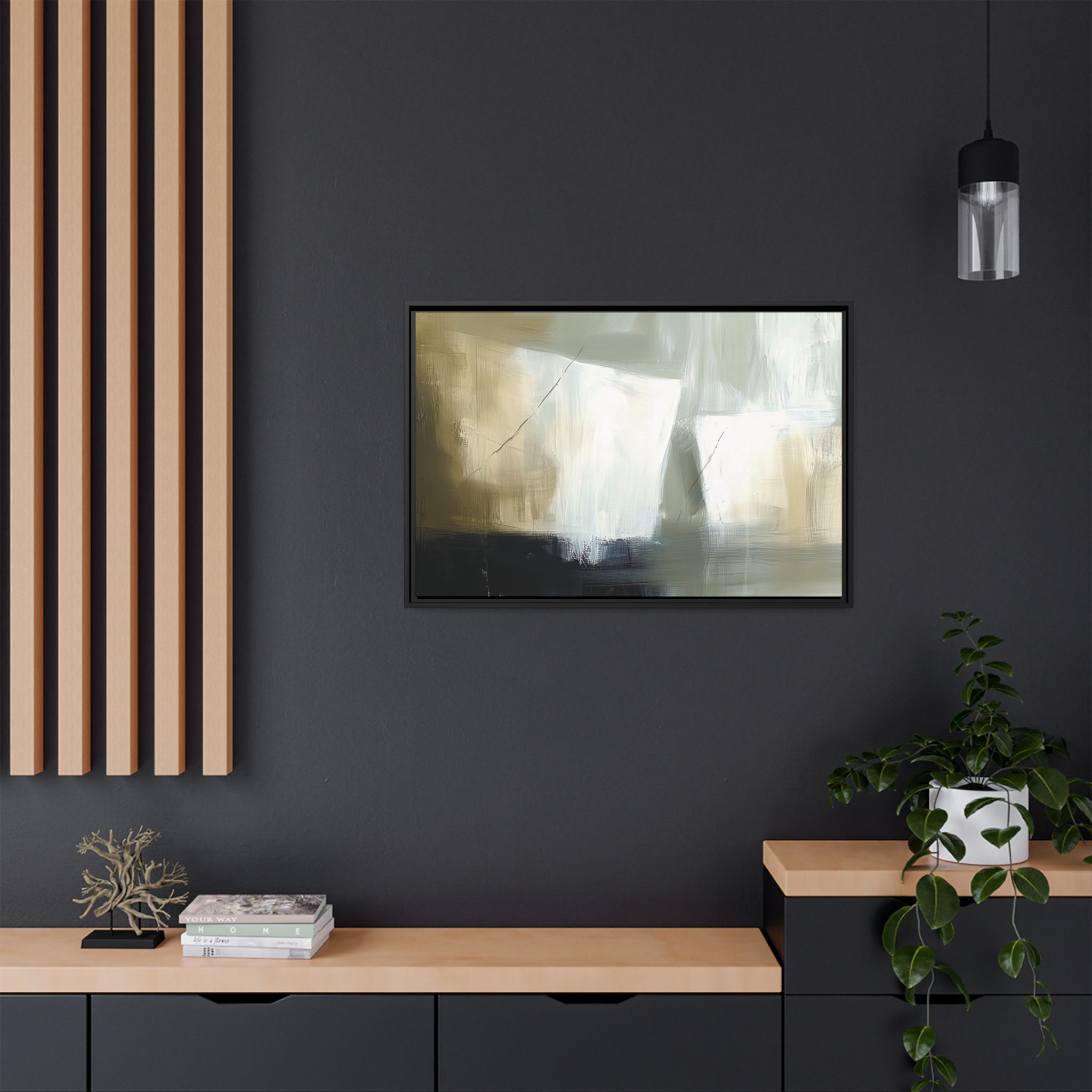 Custom digitally printed artwork on a quality canvas. .Every print in a black pinewood frame will look sleek and beautiful in any interior. The artwork will be printed on the cotton-polyester canvas with a special proprietary coating to make sure it stays vibrant for ages. Environmentally-conscious – it’s made from sustainably sourced materials (Forest Stewardship Council certified) and custom printed on demand no warehouse stocks and no waste. Choose between the designer specified sizes. The sawtooth hanging hardware is already attached.