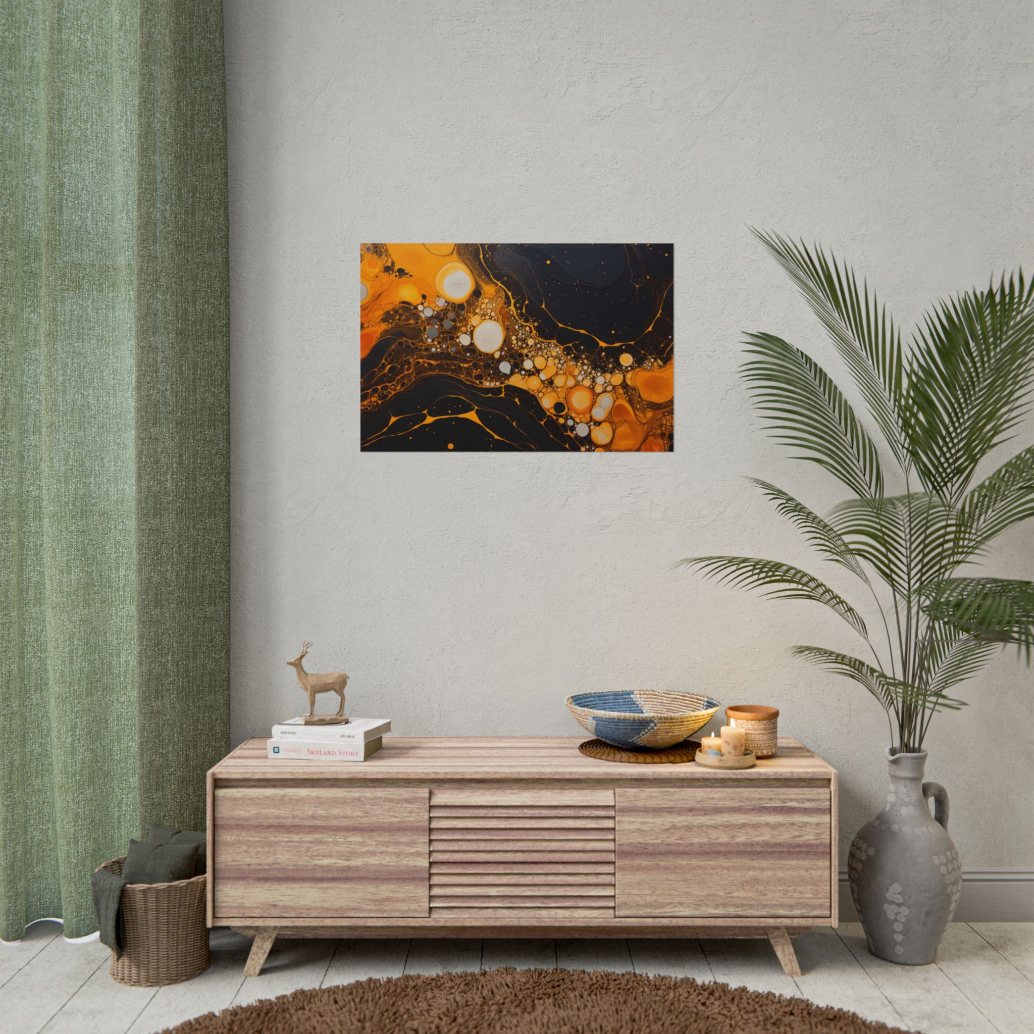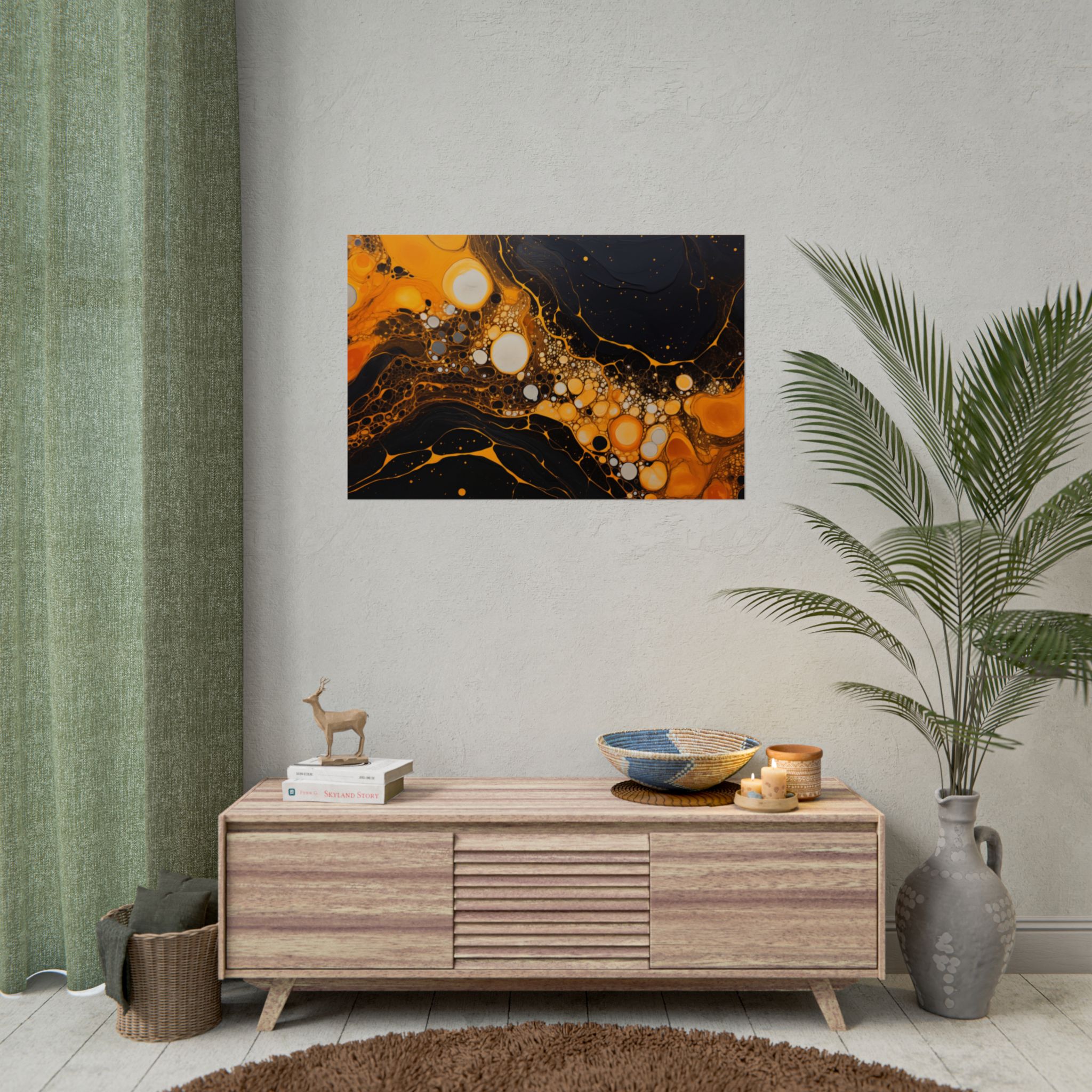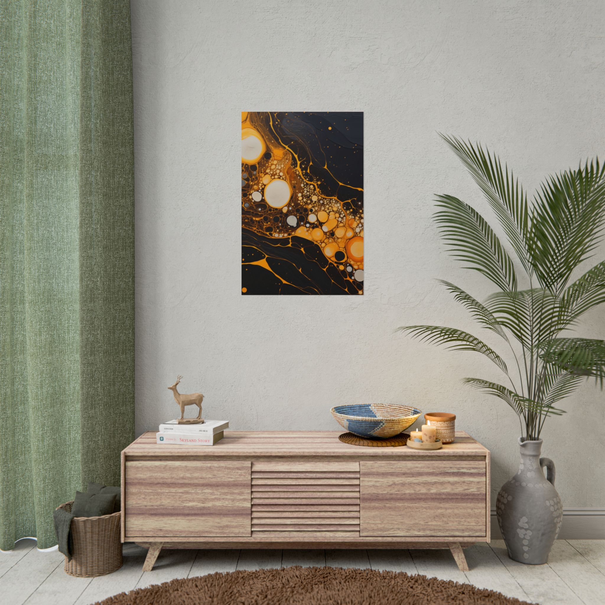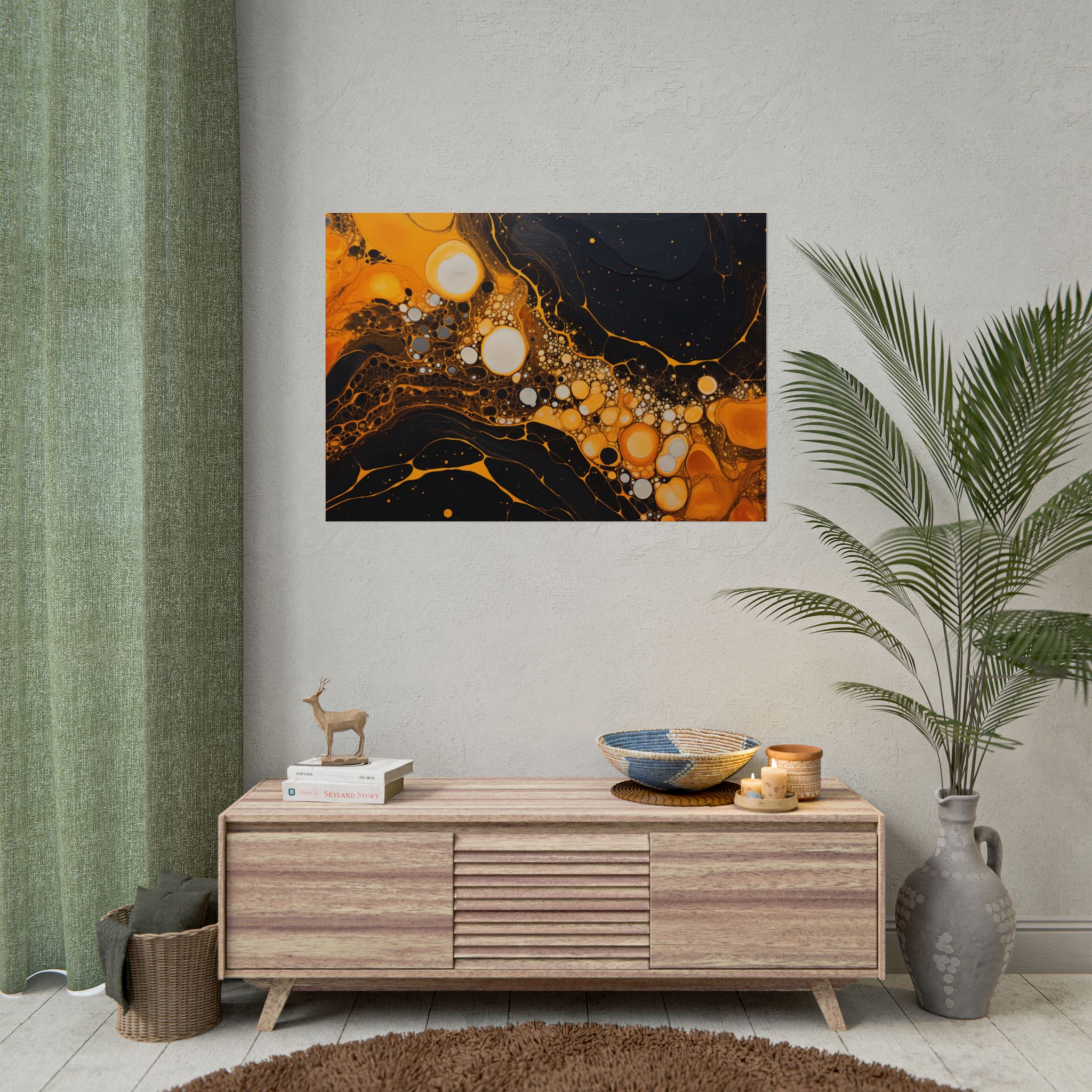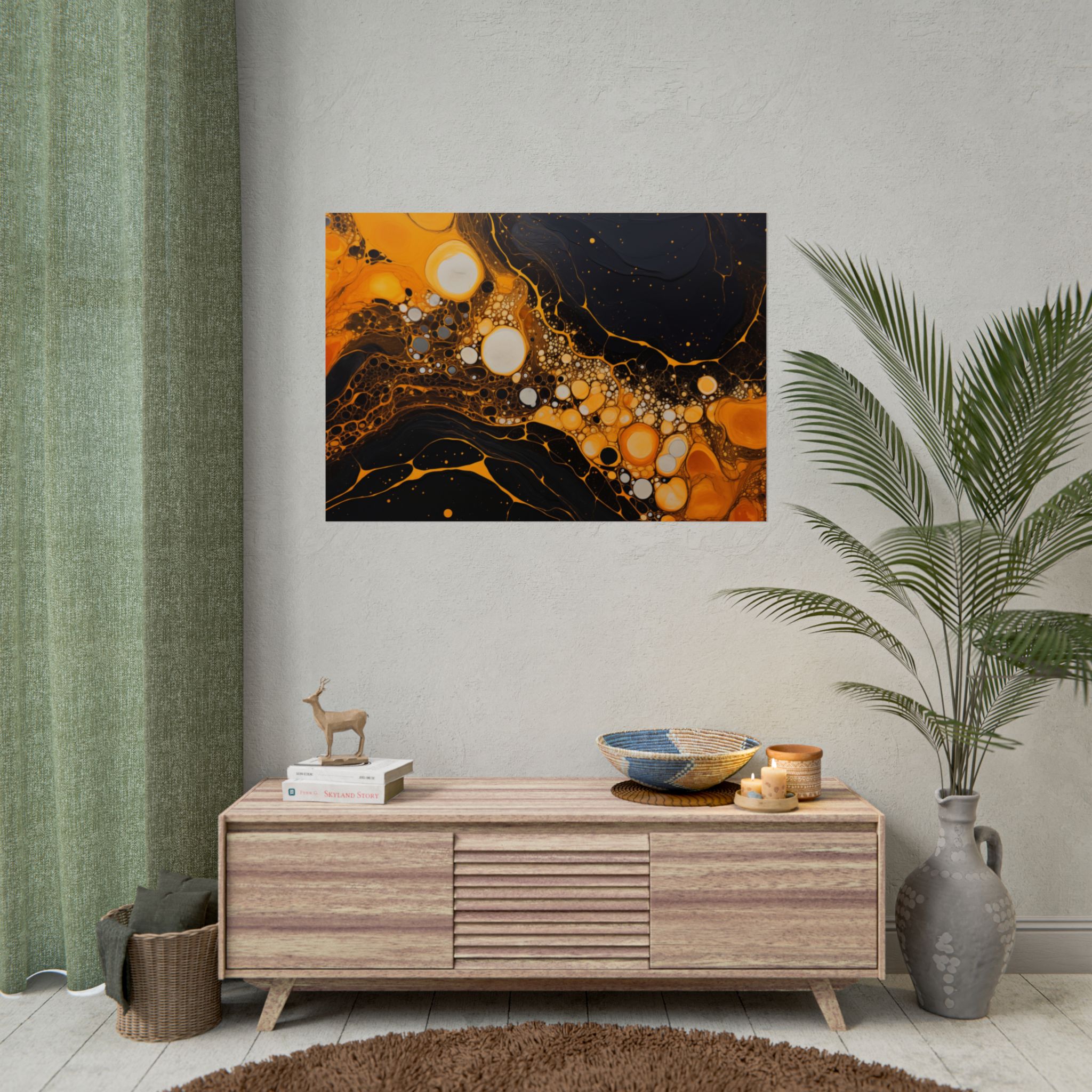 Elevate your space with this black, white, and yellow abstract art print featuring flowing liquid shapes and splashes of color. The intricate patterns and textures give depth and dimension, perfect for adding an artistic touch to any room. Ideal for art enthusiasts and home decor lovers, this canvas is a great addition to celebrations like birthdays, housewarmings, or art appreciation events.