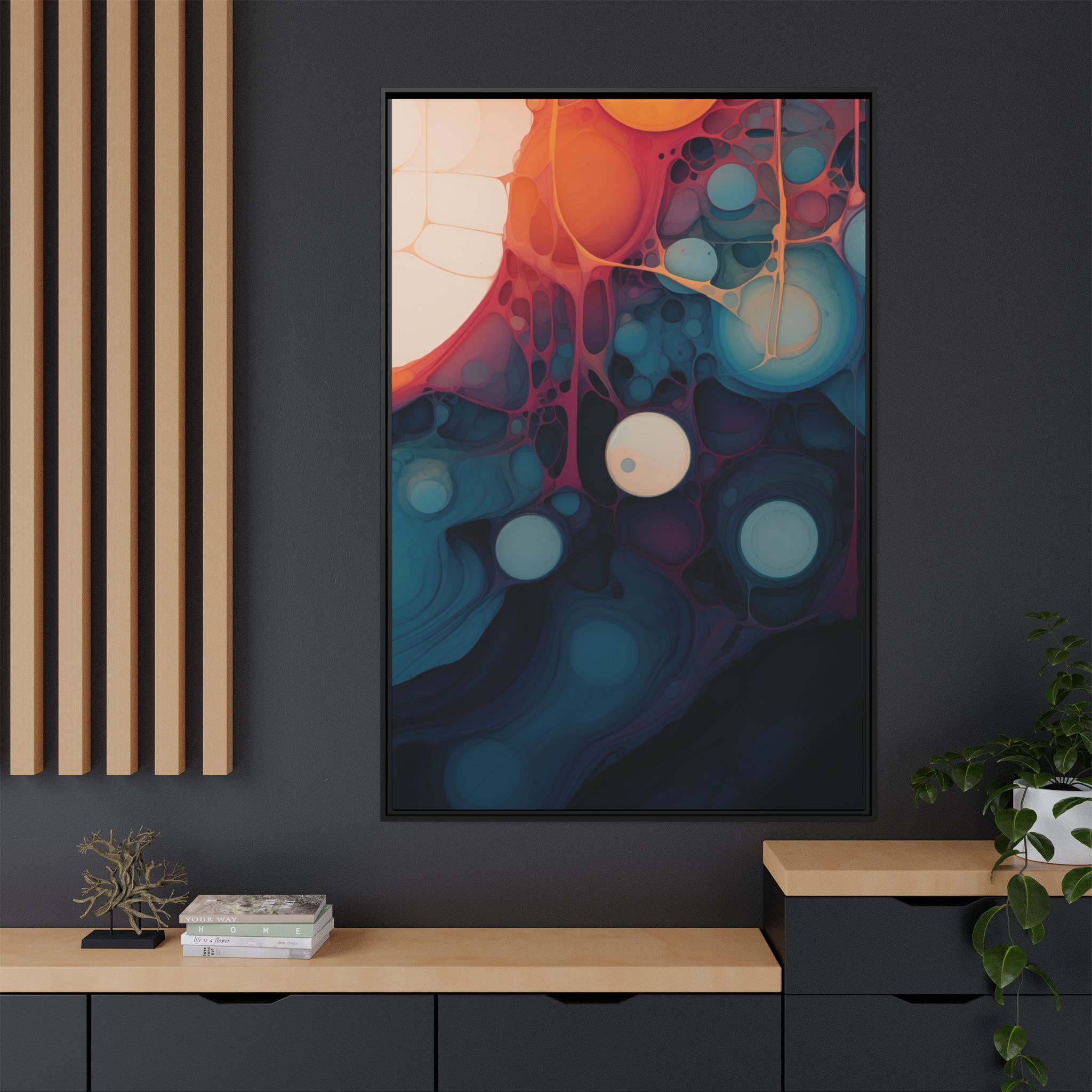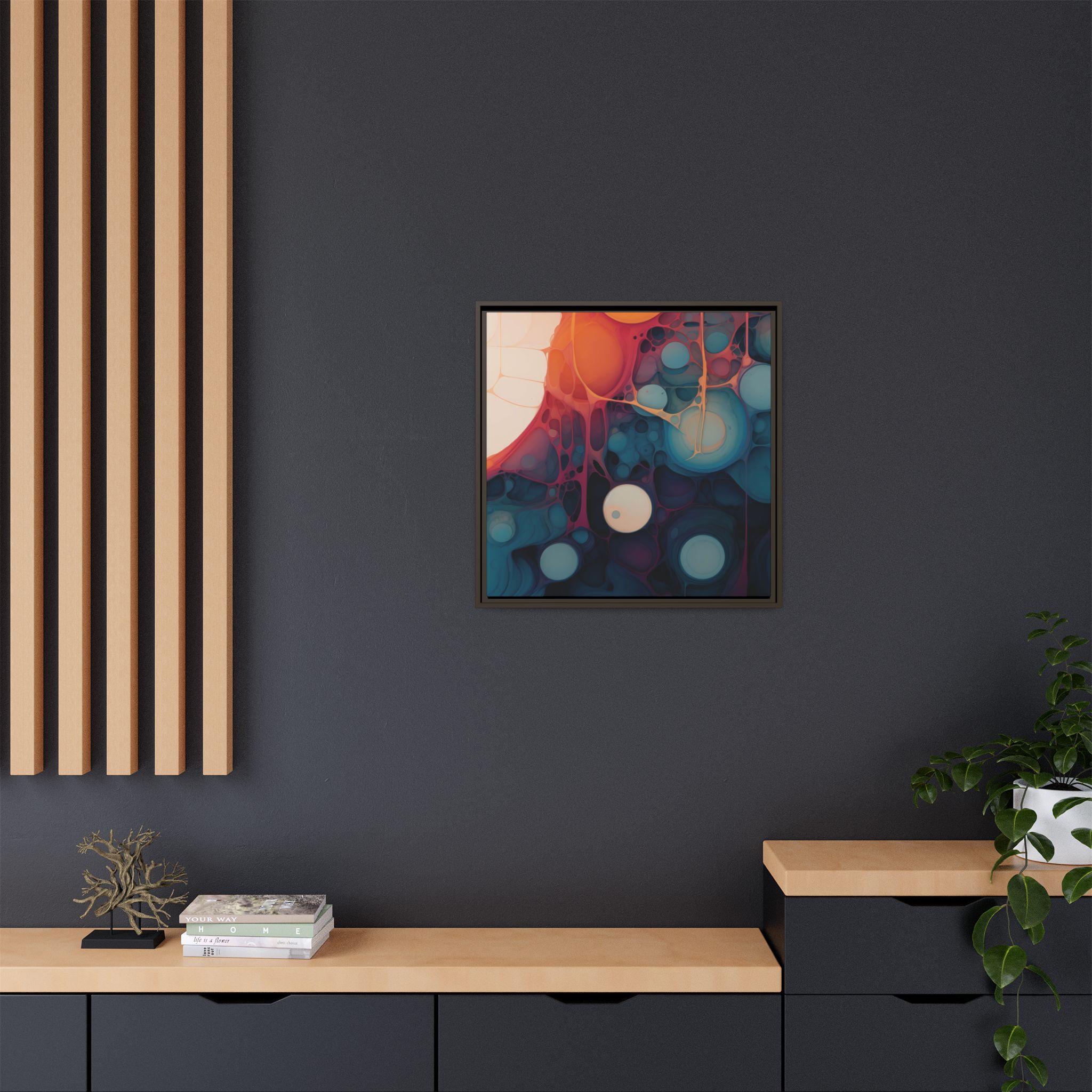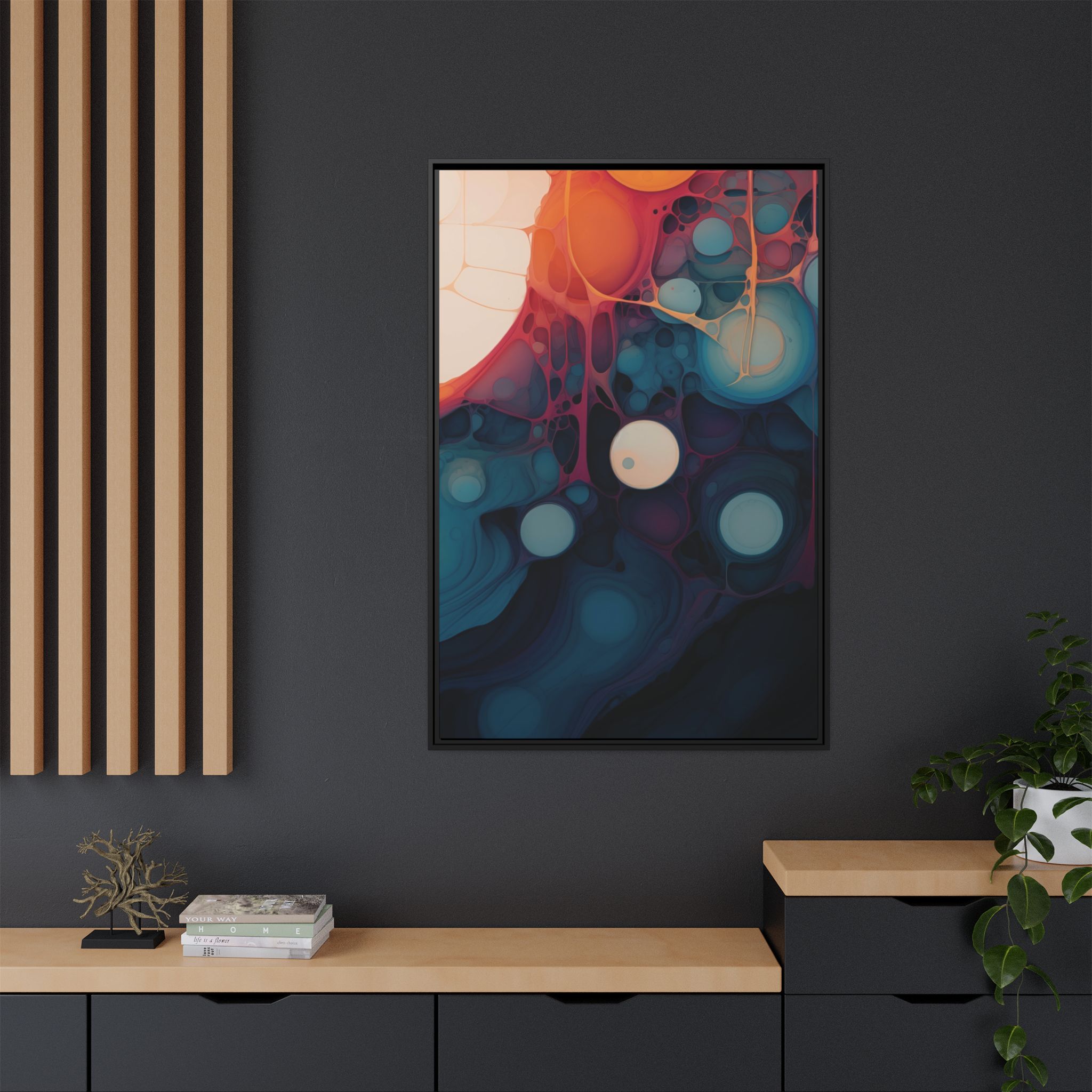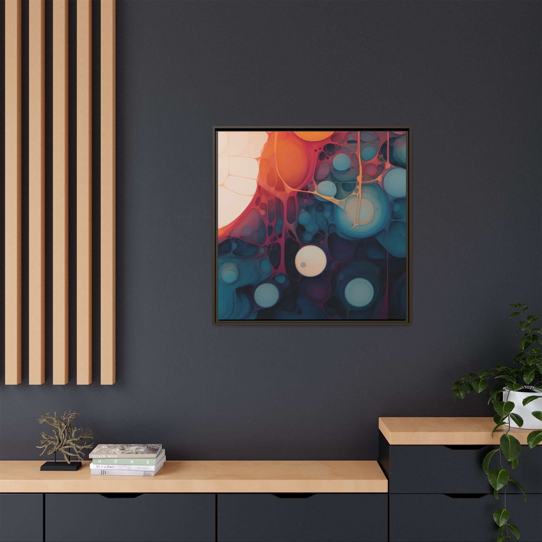 Custom digitally printed artwork on a quality canvas. .Every print in a black pinewood frame will look sleek and beautiful in any interior. The artwork will be printed on the cotton-polyester canvas with a special proprietary coating to make sure it stays vibrant for ages. Environmentally-conscious – it’s made from sustainably sourced materials (Forest Stewardship Council certified) and custom printed on demand no warehouse stocks and no waste. Choose between the designer specified sizes. The sawtooth hanging hardware is already attached.