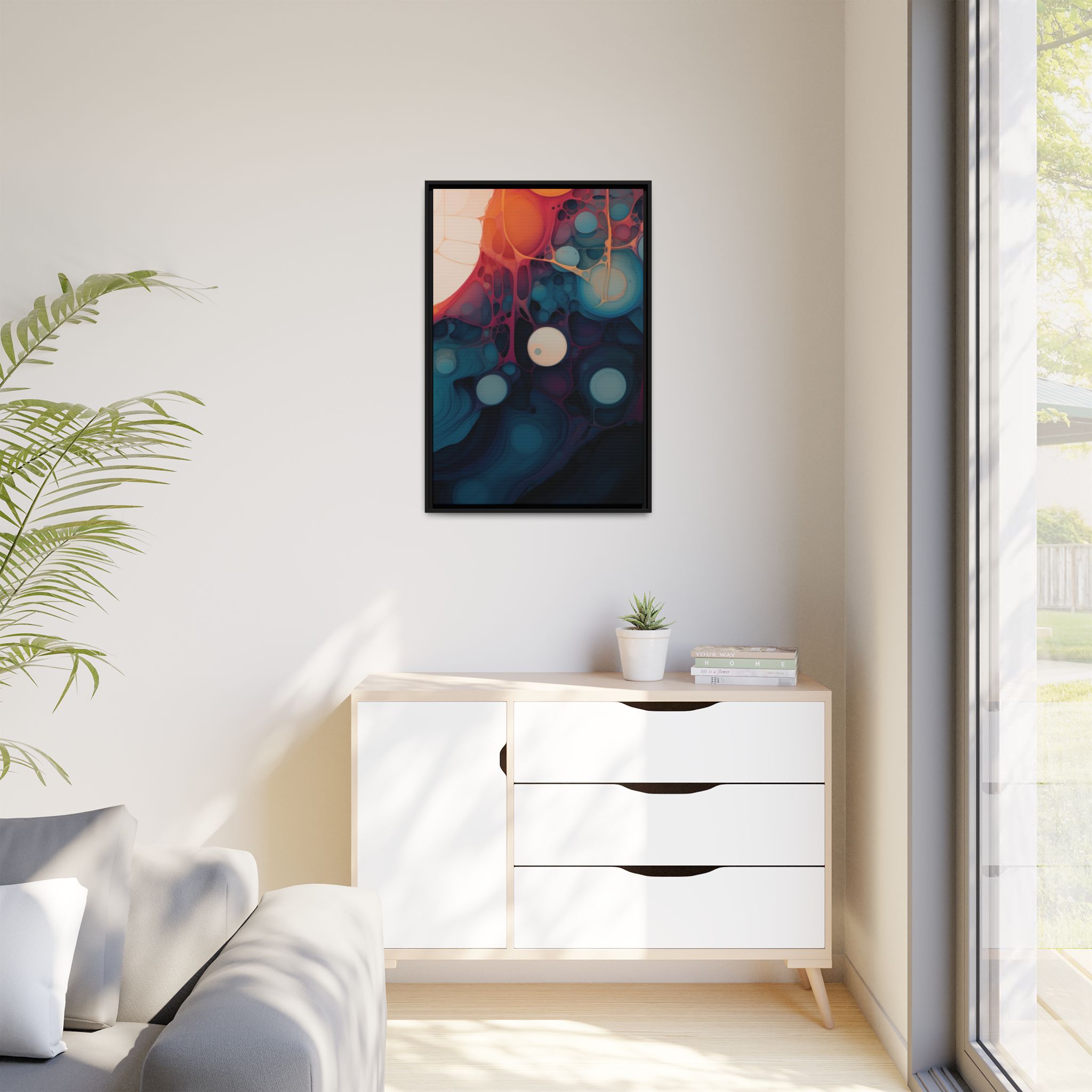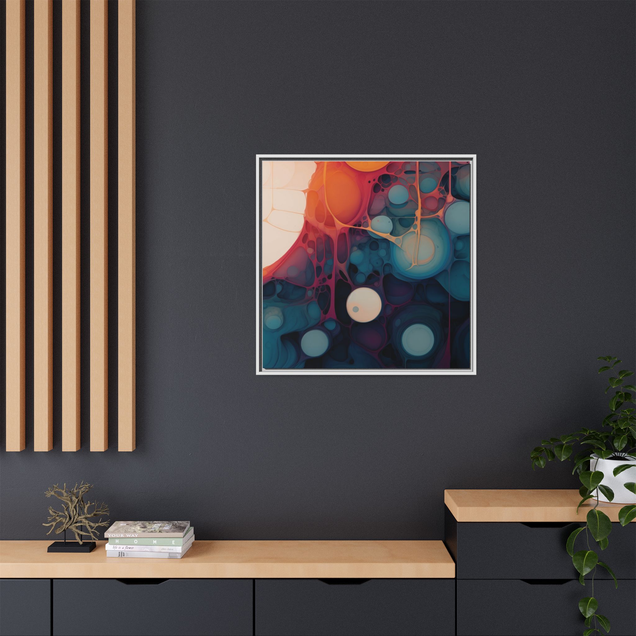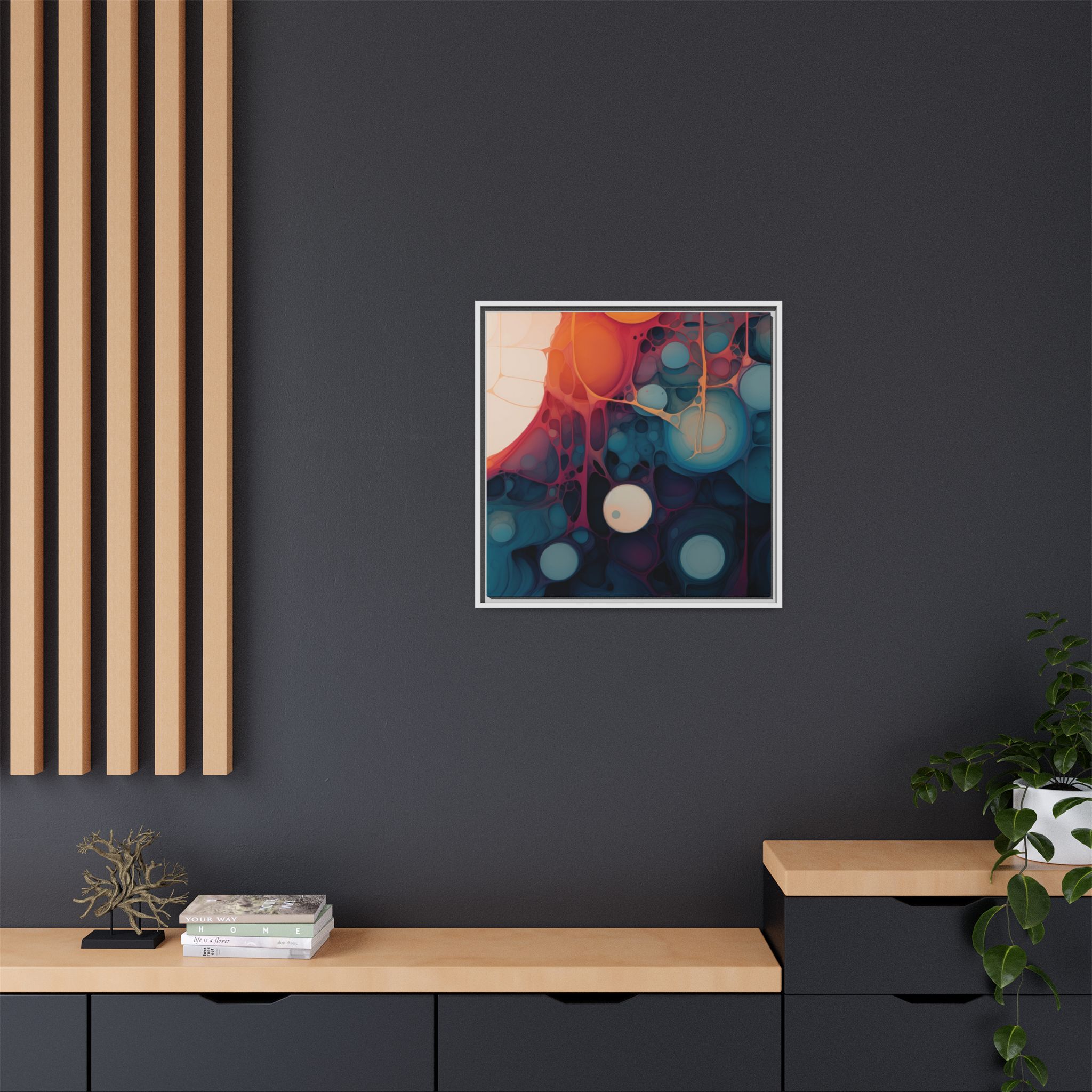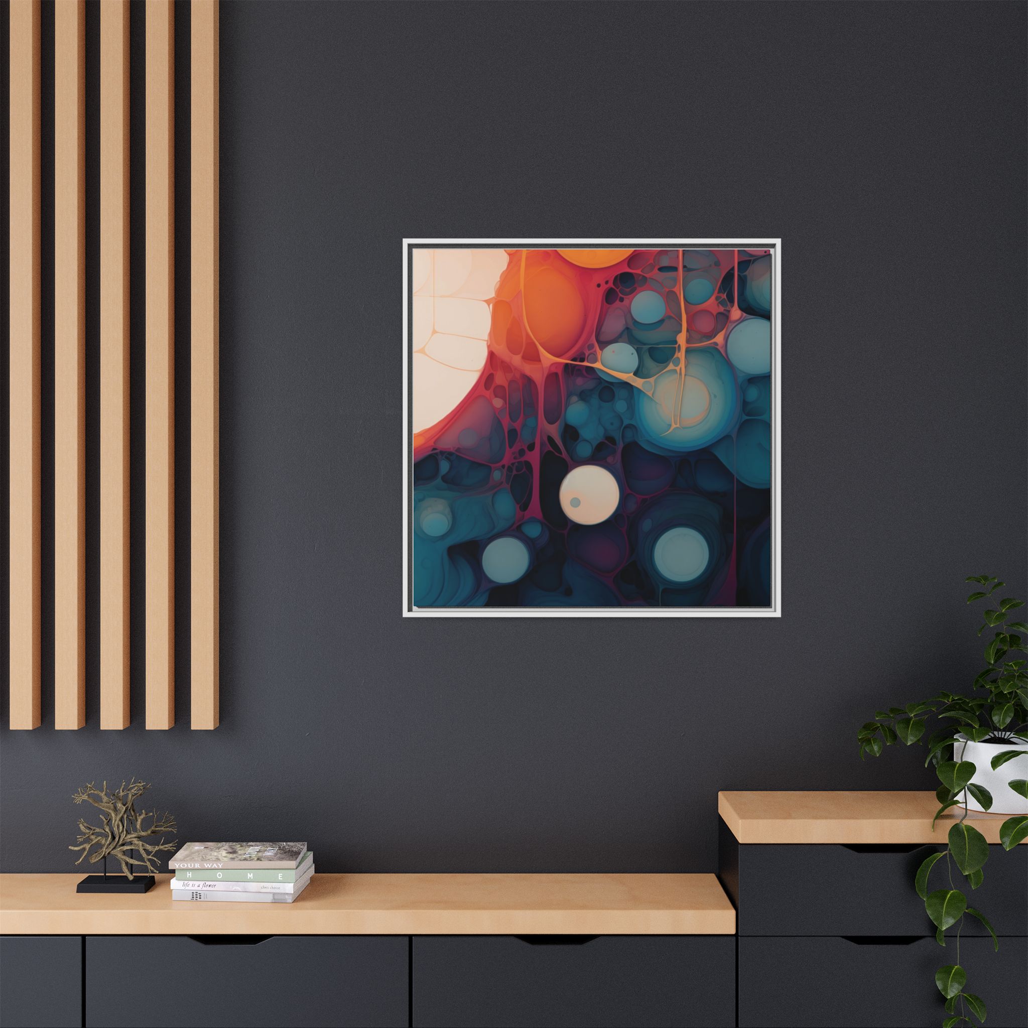 Custom digitally printed artwork on a quality canvas. .Every print in a black pinewood frame will look sleek and beautiful in any interior. The artwork will be printed on the cotton-polyester canvas with a special proprietary coating to make sure it stays vibrant for ages. Environmentally-conscious – it’s made from sustainably sourced materials (Forest Stewardship Council certified) and custom printed on demand no warehouse stocks and no waste. Choose between the designer specified sizes. The sawtooth hanging hardware is already attached.