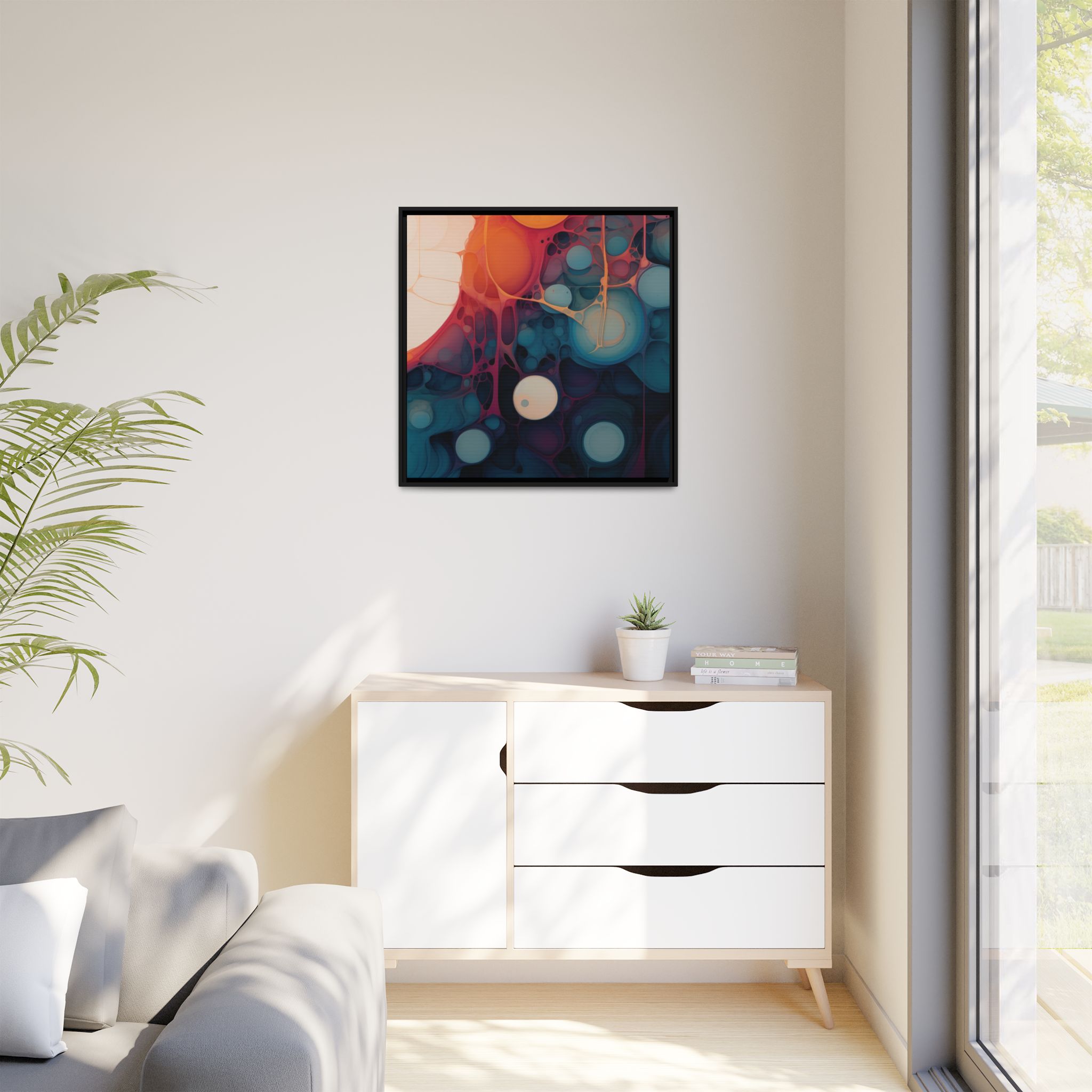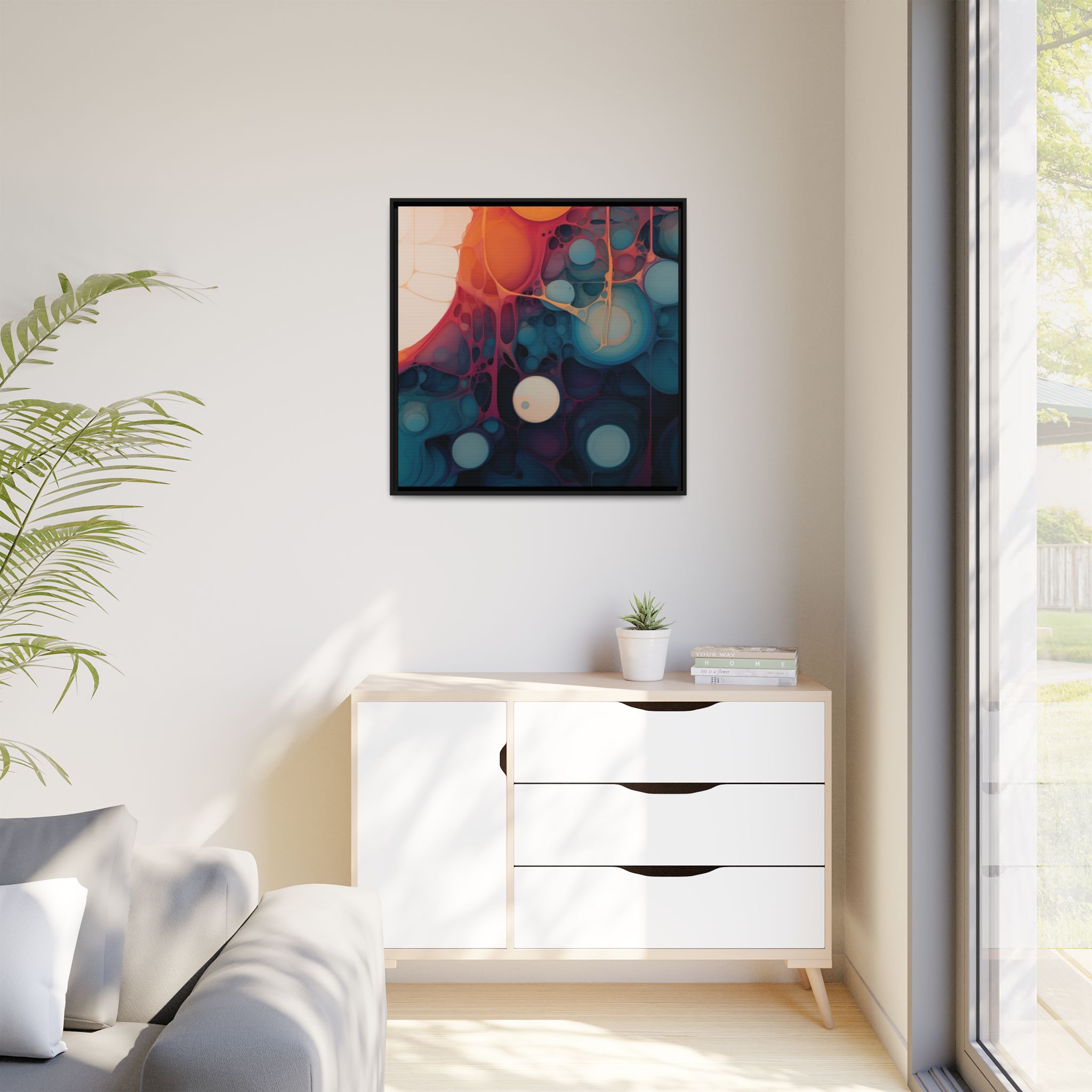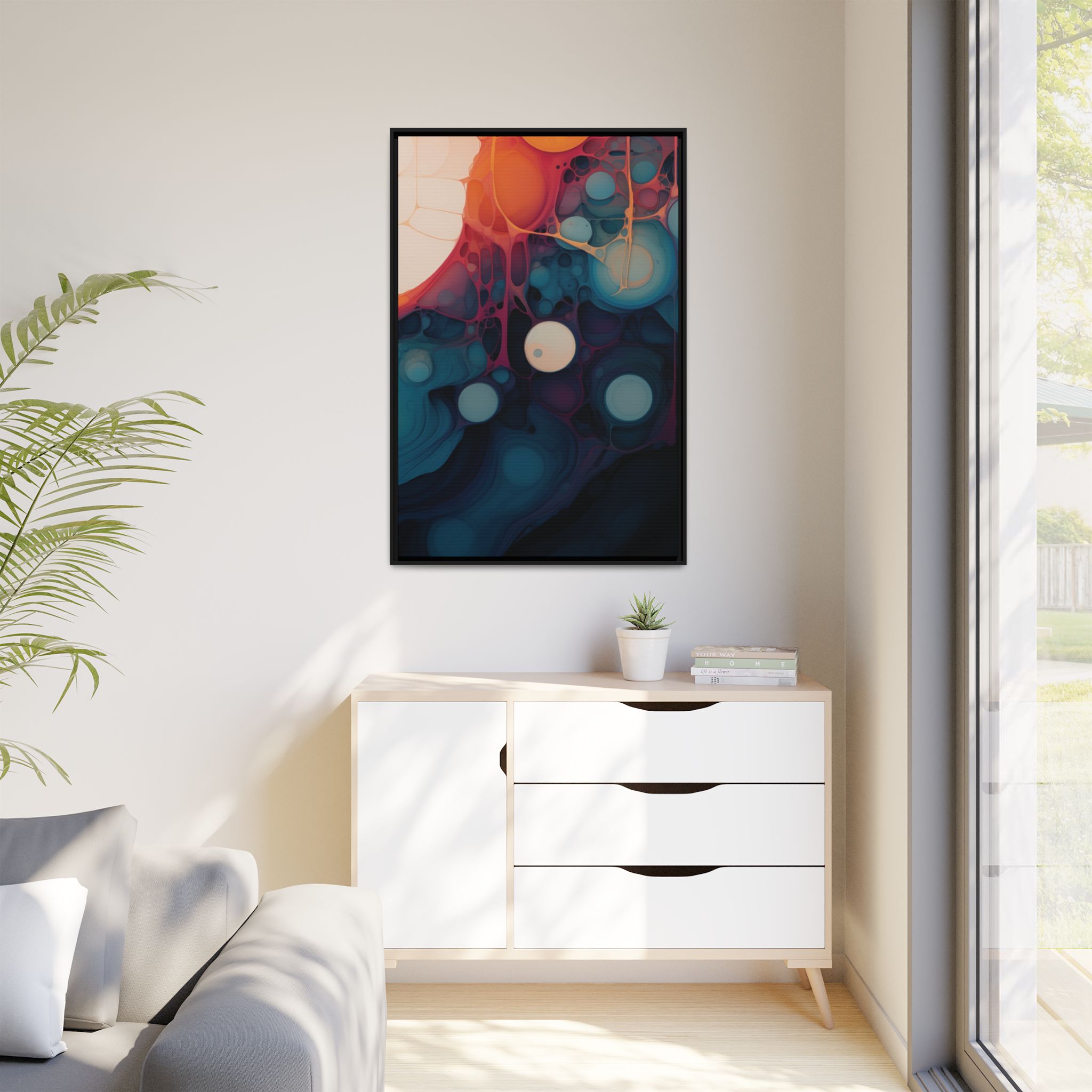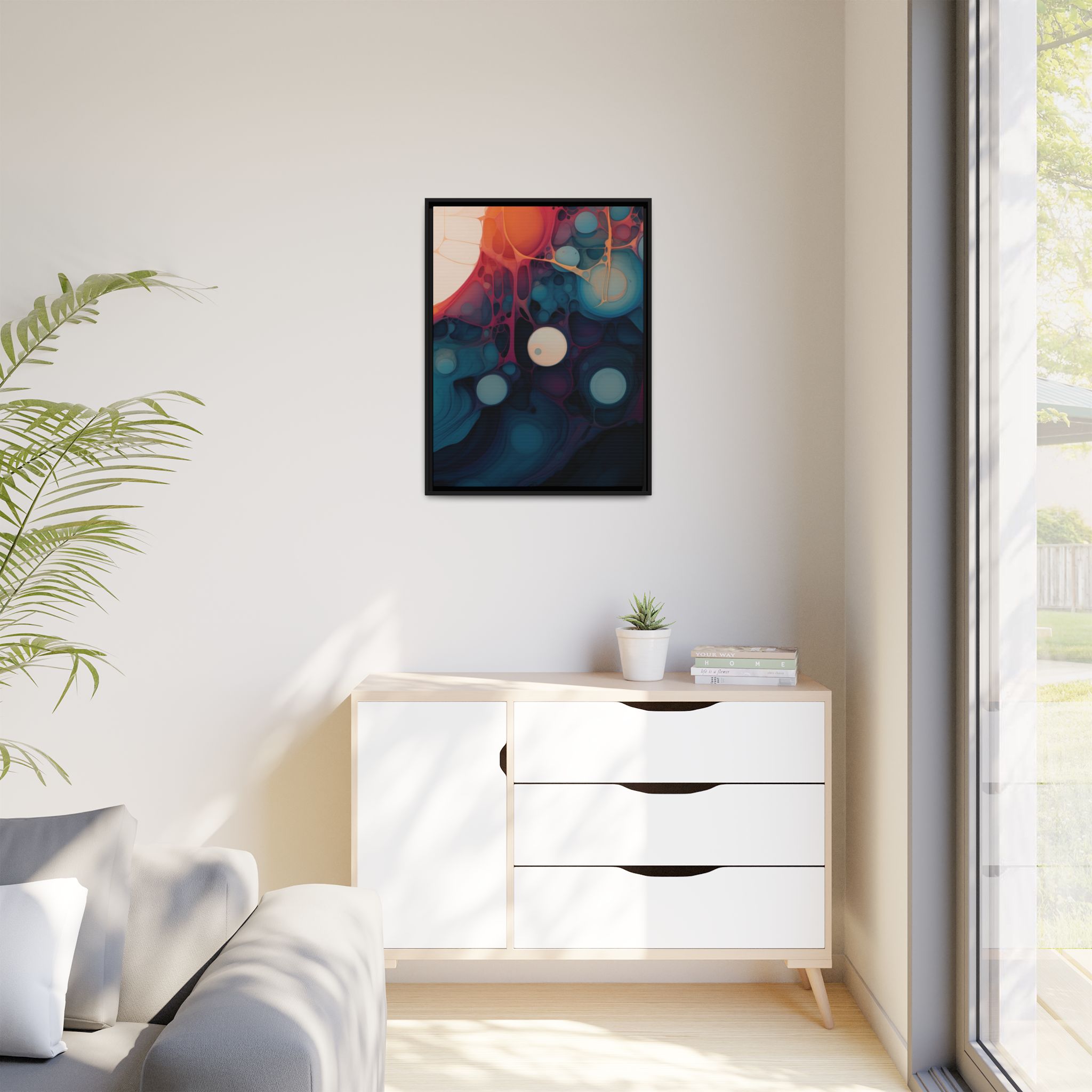 Custom digitally printed artwork on a quality canvas. .Every print in a black pinewood frame will look sleek and beautiful in any interior. The artwork will be printed on the cotton-polyester canvas with a special proprietary coating to make sure it stays vibrant for ages. Environmentally-conscious – it’s made from sustainably sourced materials (Forest Stewardship Council certified) and custom printed on demand no warehouse stocks and no waste. Choose between the designer specified sizes. The sawtooth hanging hardware is already attached.
