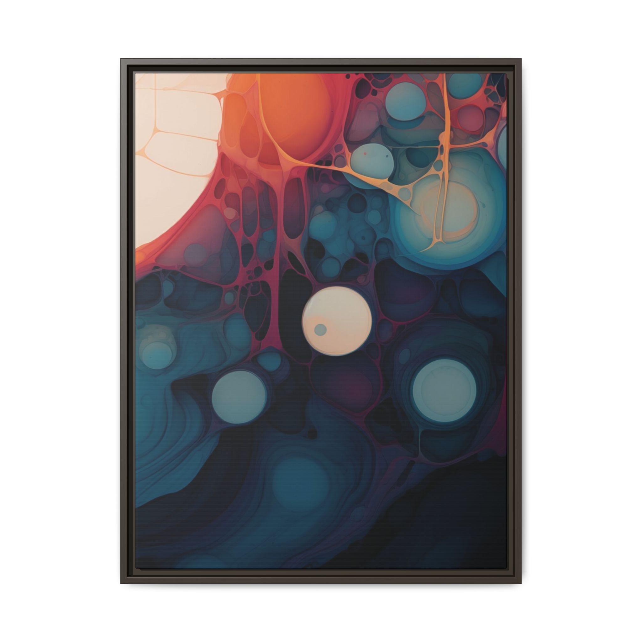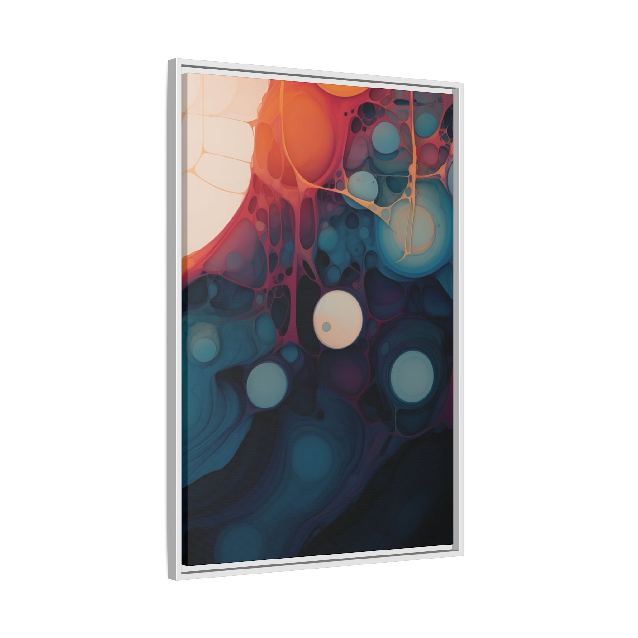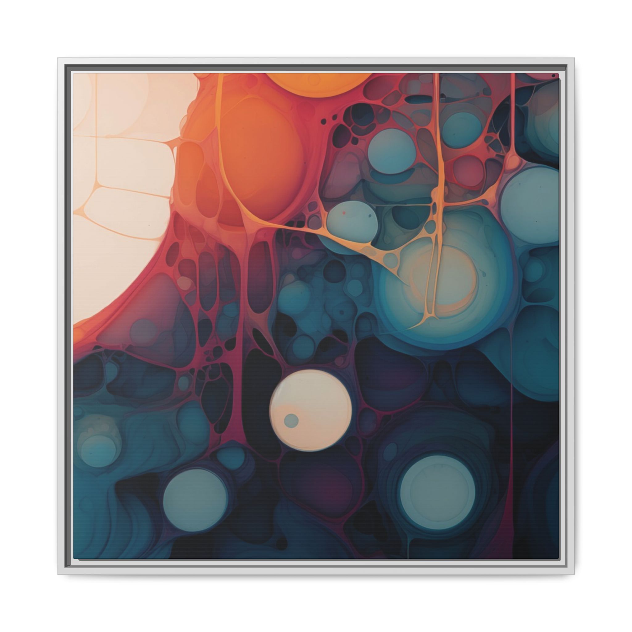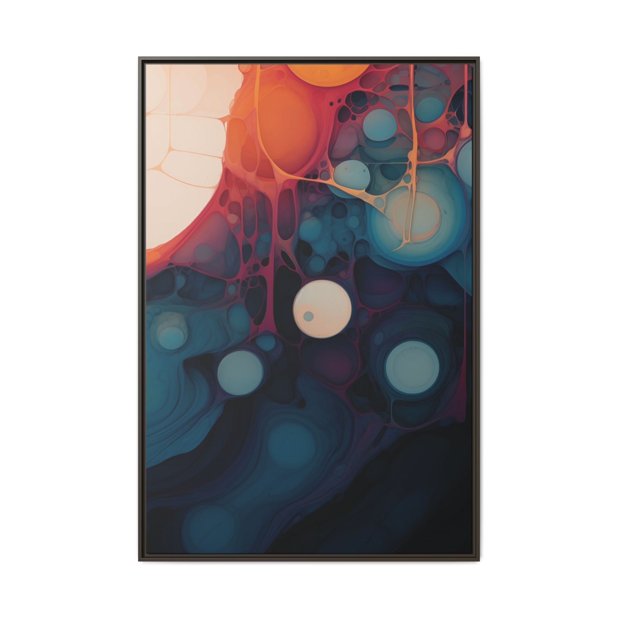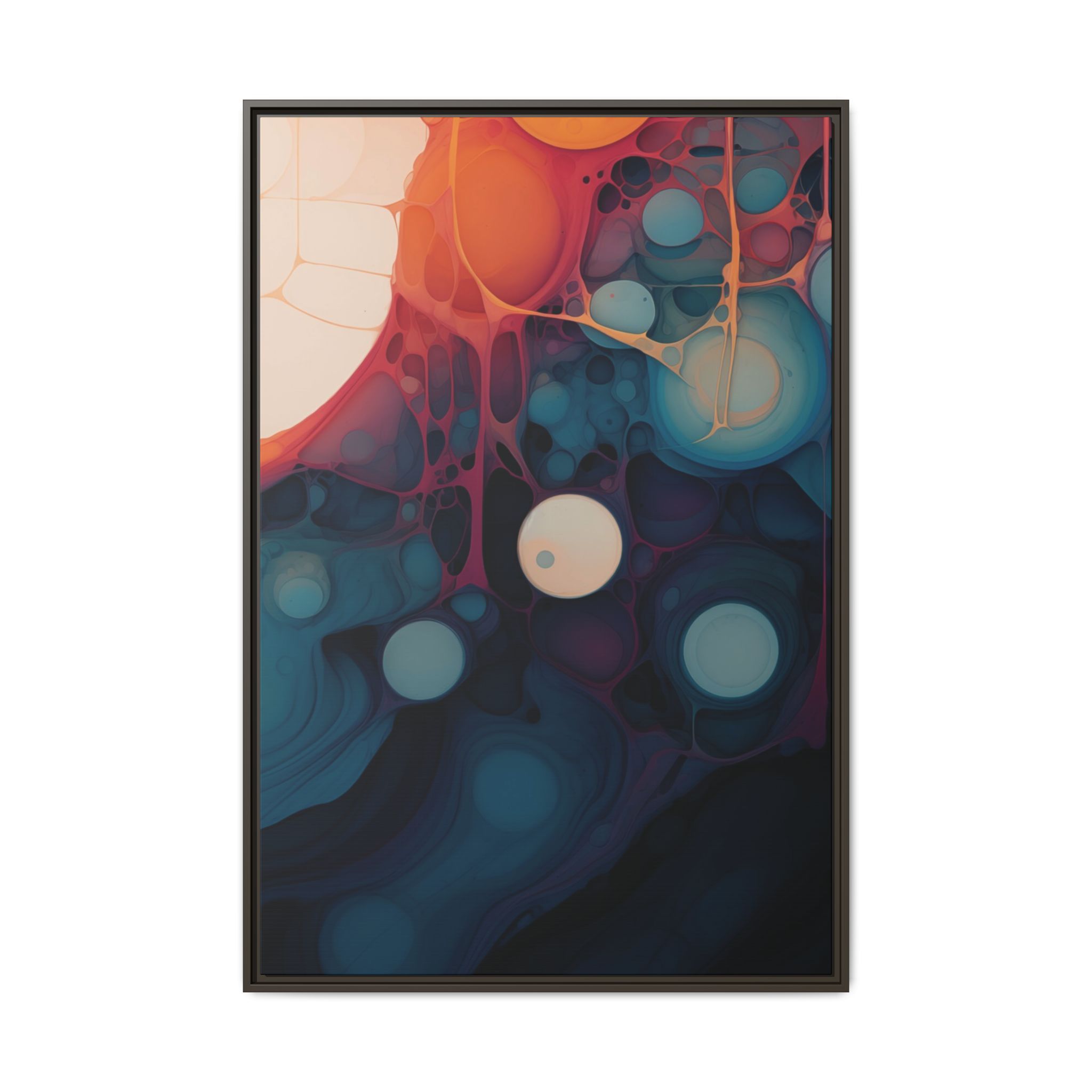 This canvas print features an abstract painting of an orange, blue, and teal gradient with large bubbles on a white background, giving off a modern and artistic vibe. Perfect for art enthusiasts or individuals looking to add a pop of color to their space, this canvas print is ideal for home decor, gifting, or special occasions like birthdays or housewarmings.