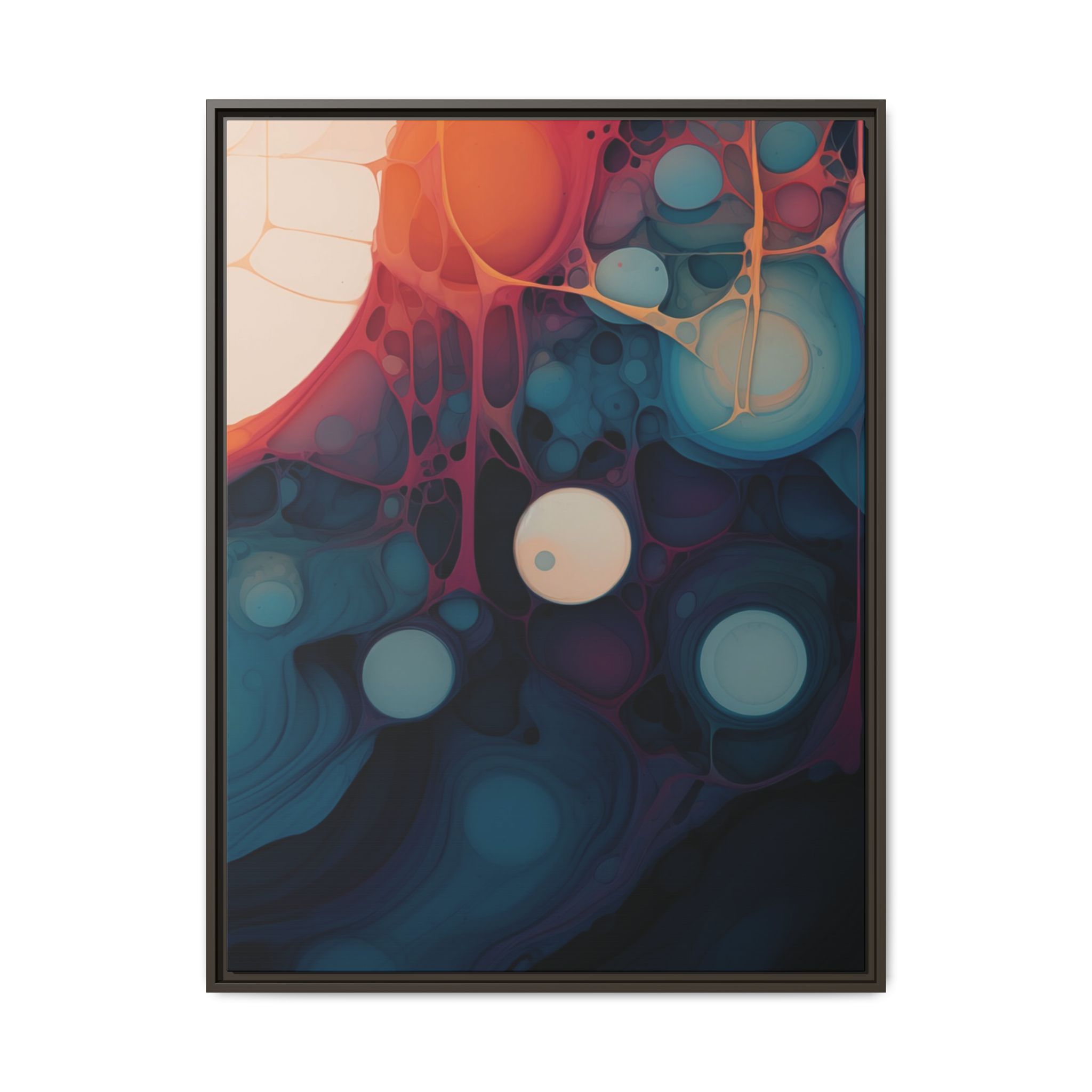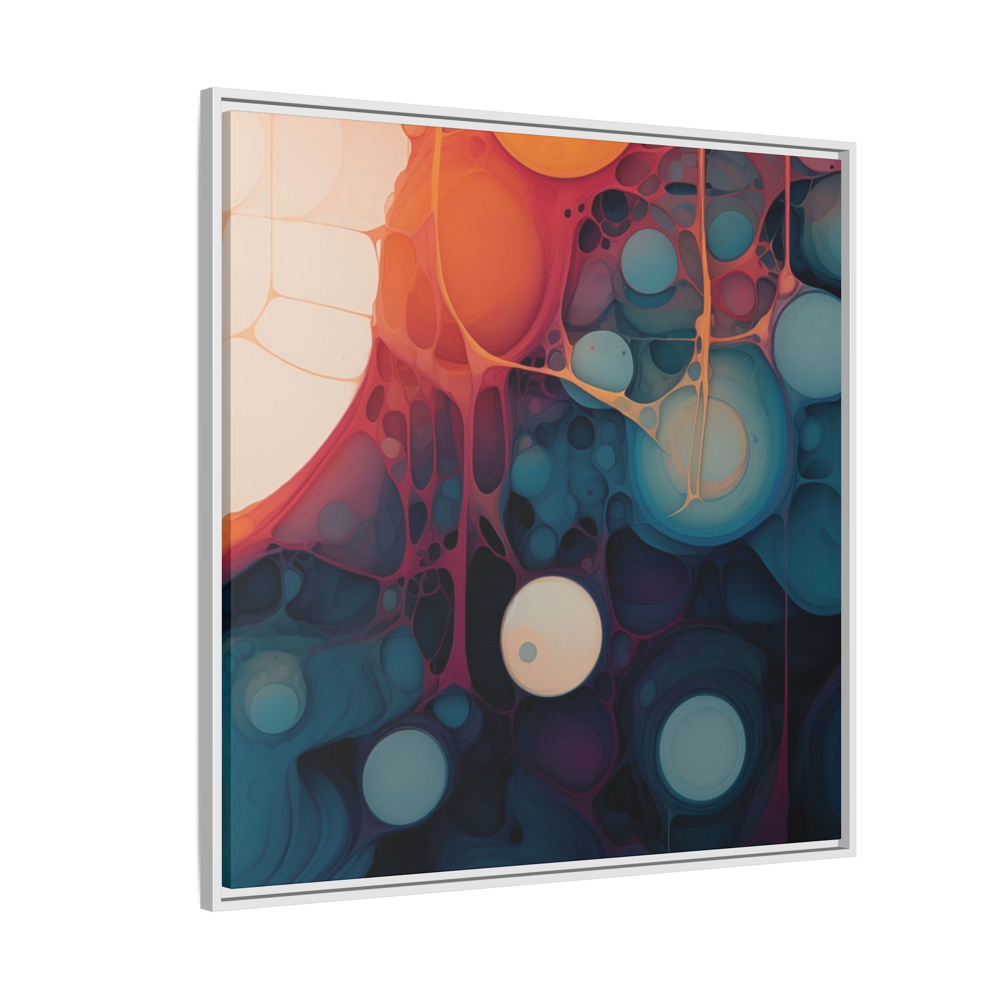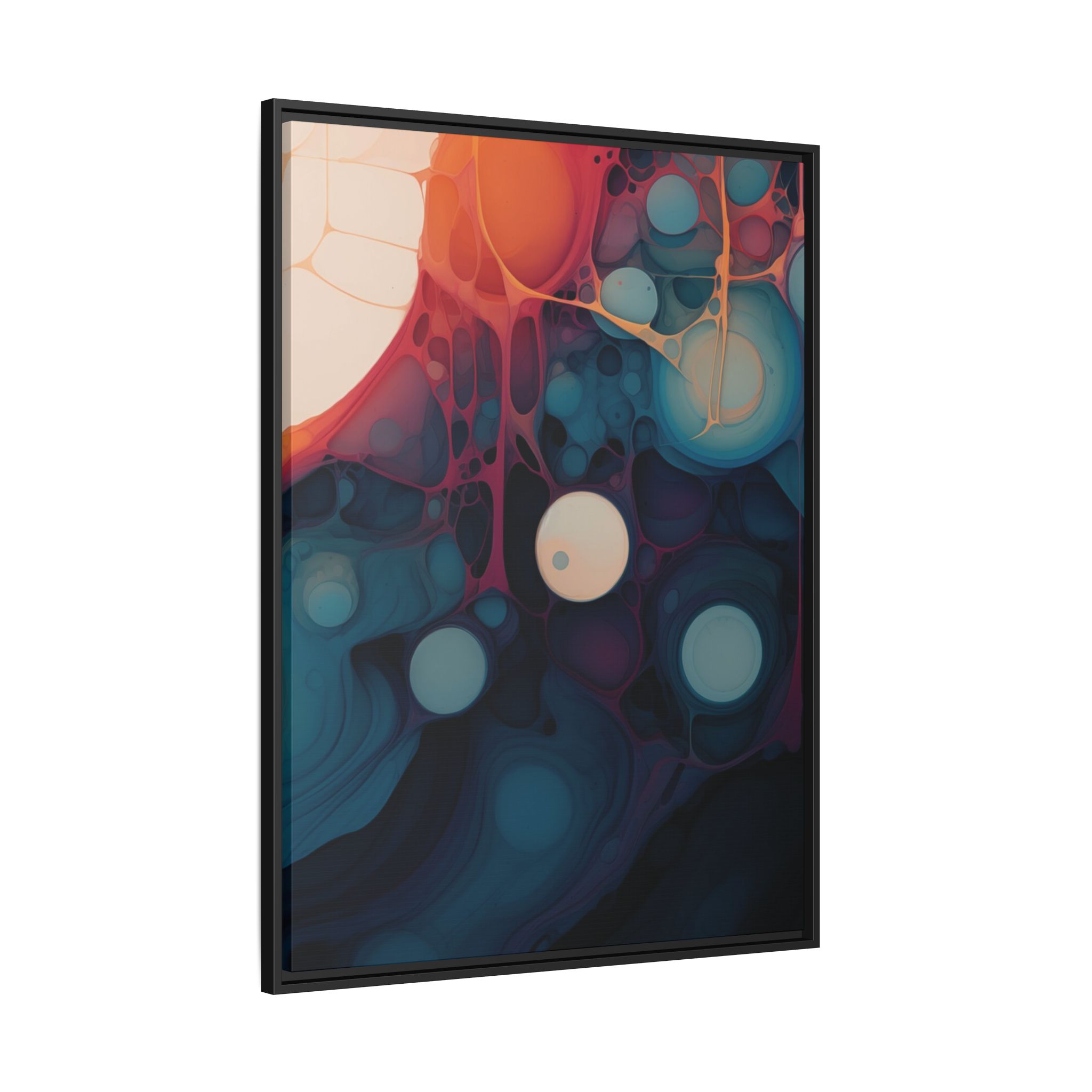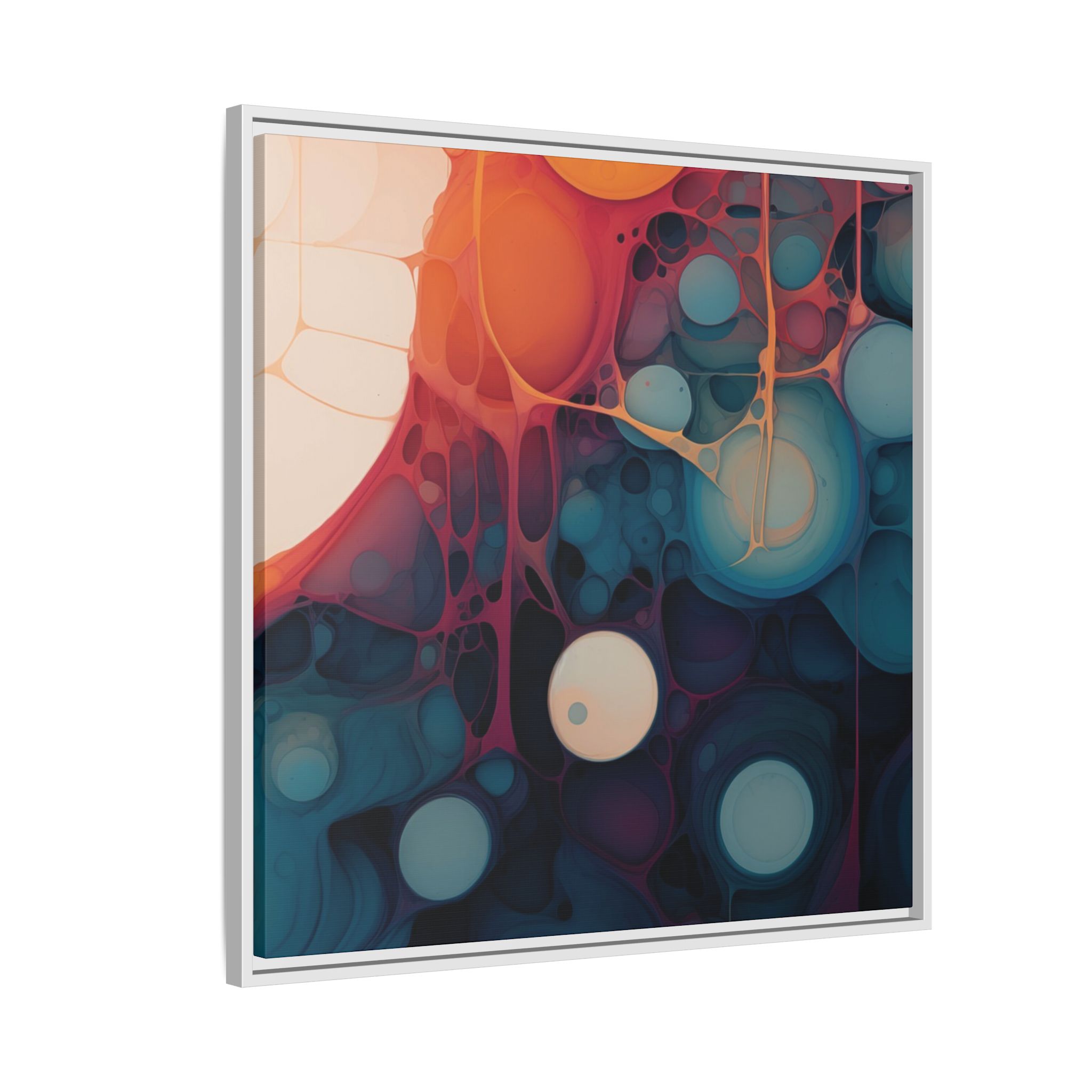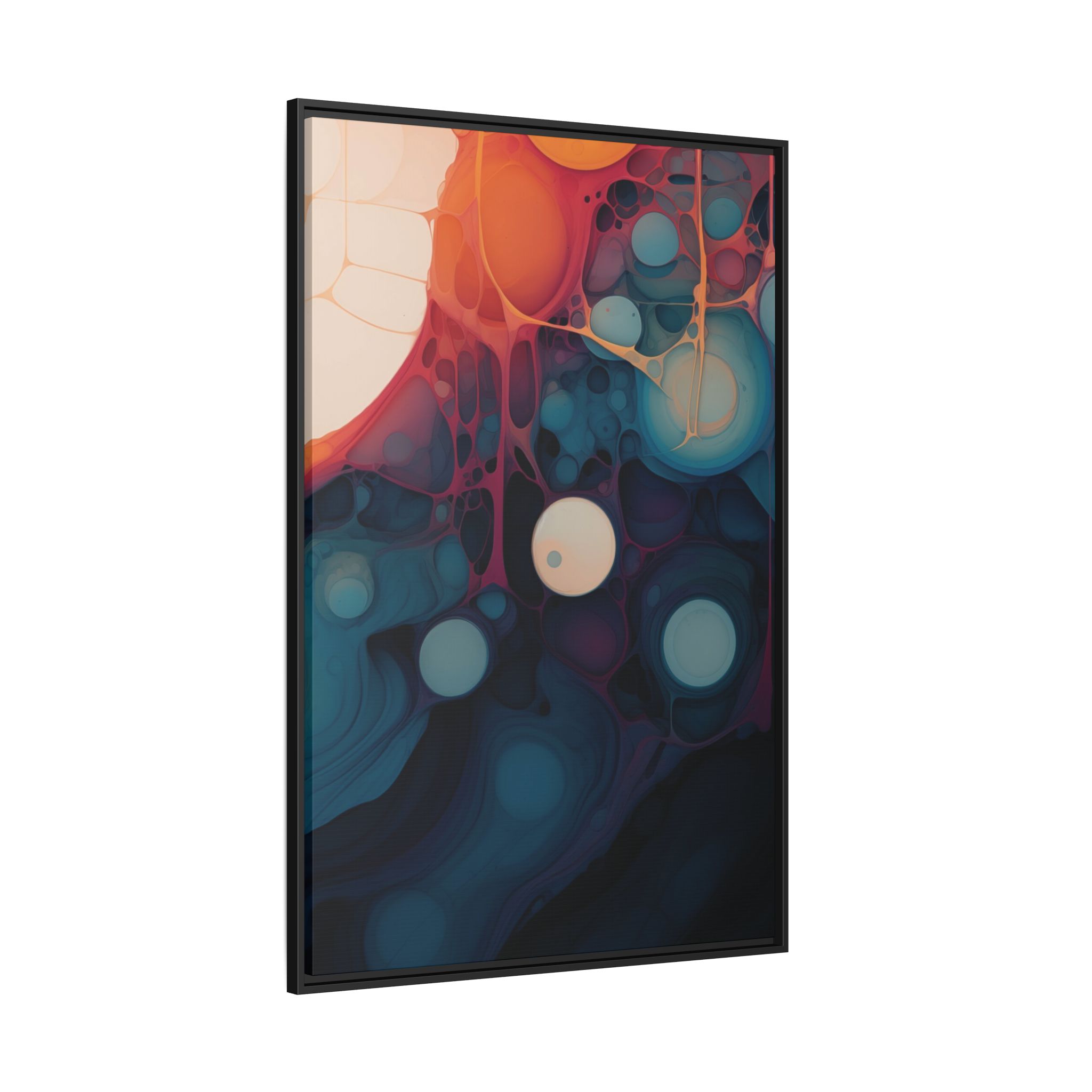 This canvas print features an abstract painting of an orange, blue, and teal gradient with large bubbles on a white background, giving off a modern and artistic vibe. Perfect for art enthusiasts or individuals looking to add a pop of color to their space, this canvas print is ideal for home decor, gifting, or special occasions like birthdays or housewarmings.