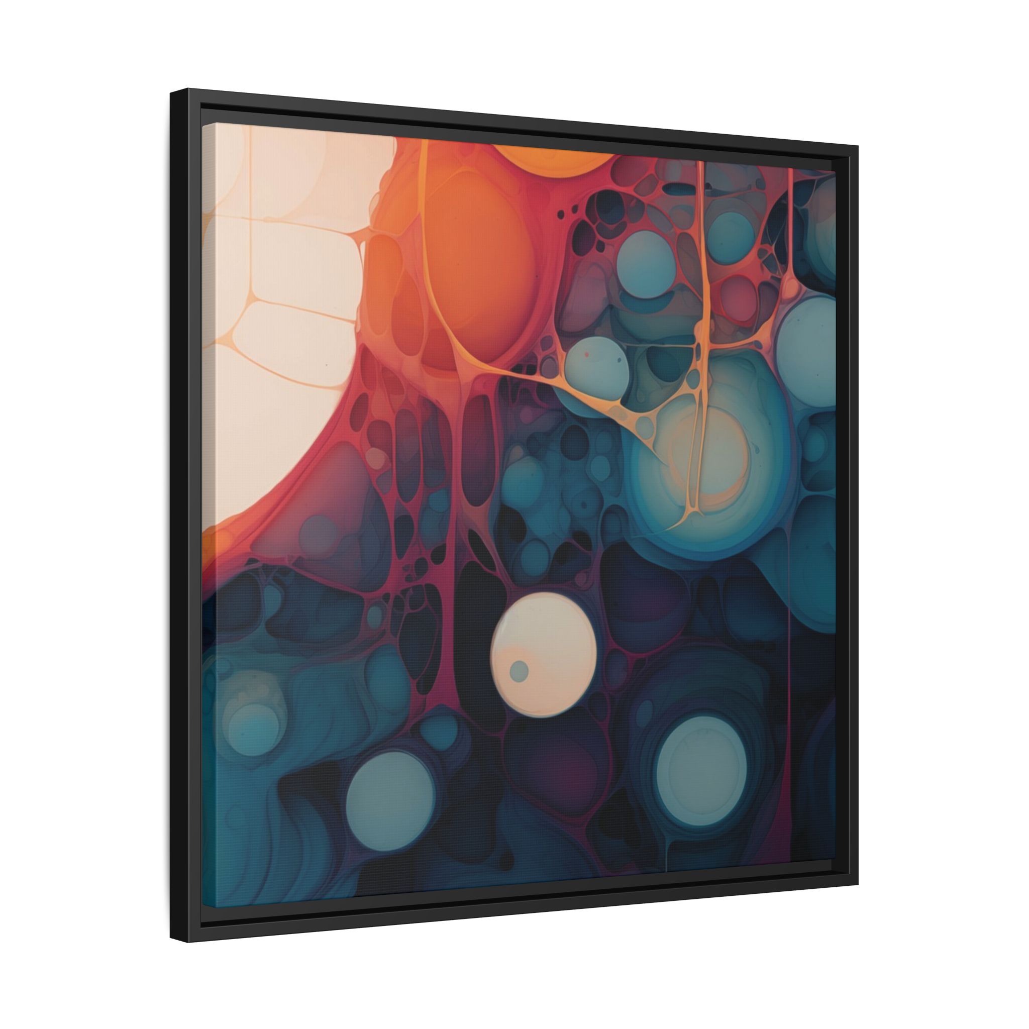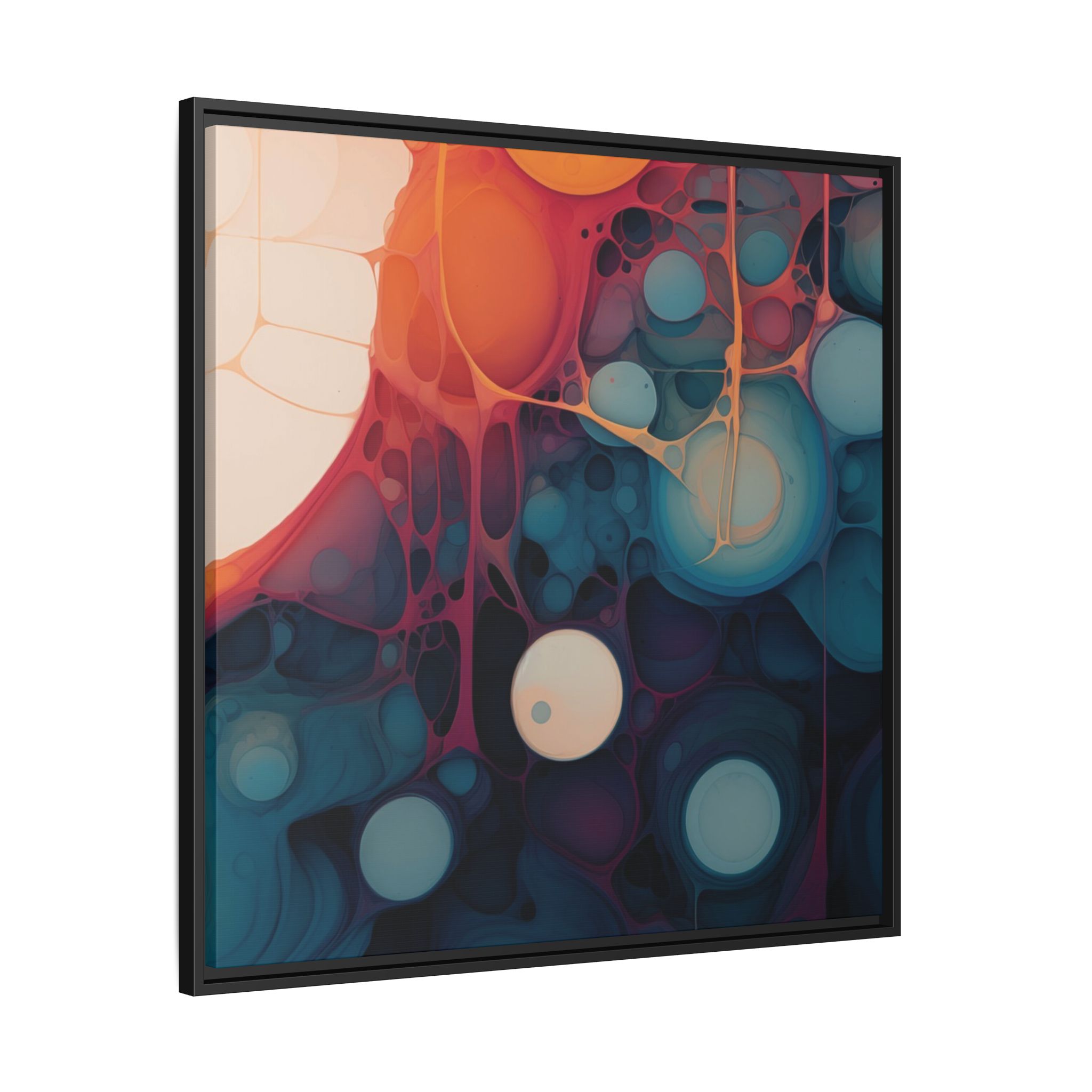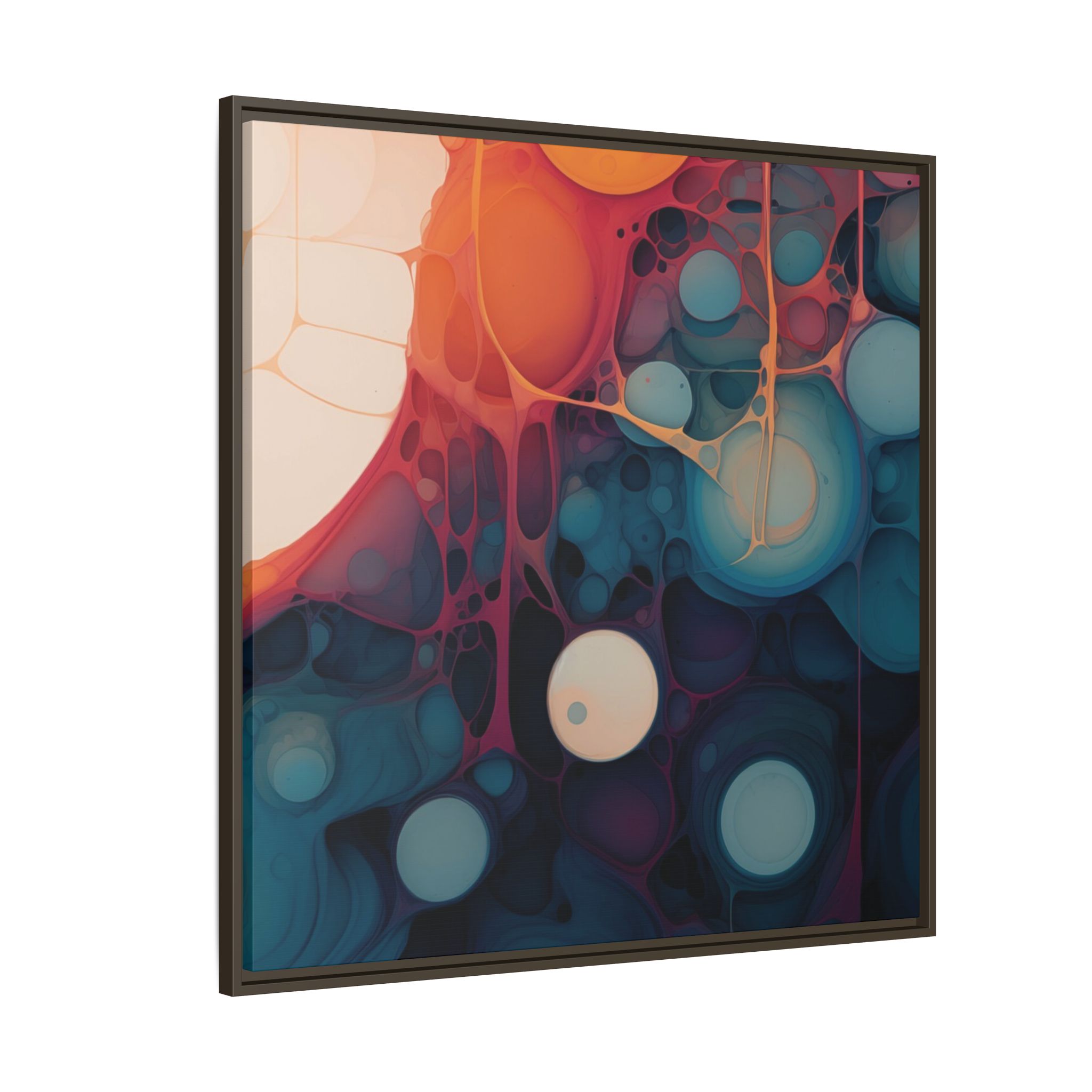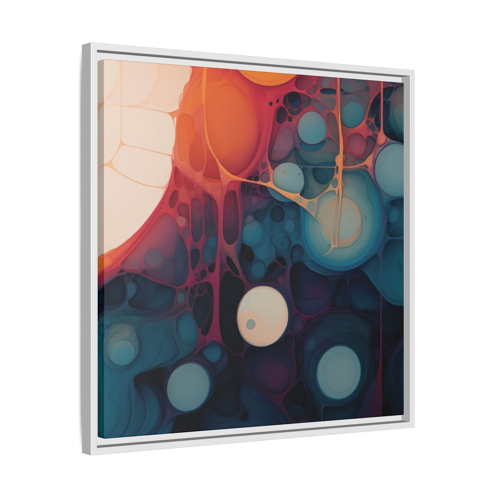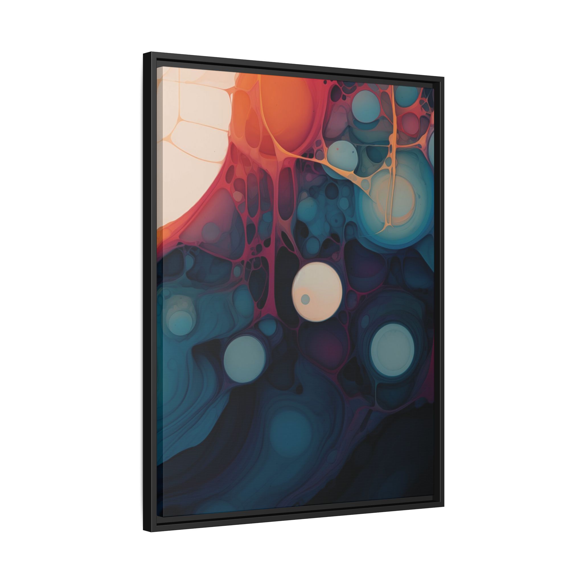 This canvas print features an abstract painting of an orange, blue, and teal gradient with large bubbles on a white background, giving off a modern and artistic vibe. Perfect for art enthusiasts or individuals looking to add a pop of color to their space, this canvas print is ideal for home decor, gifting, or special occasions like birthdays or housewarmings.