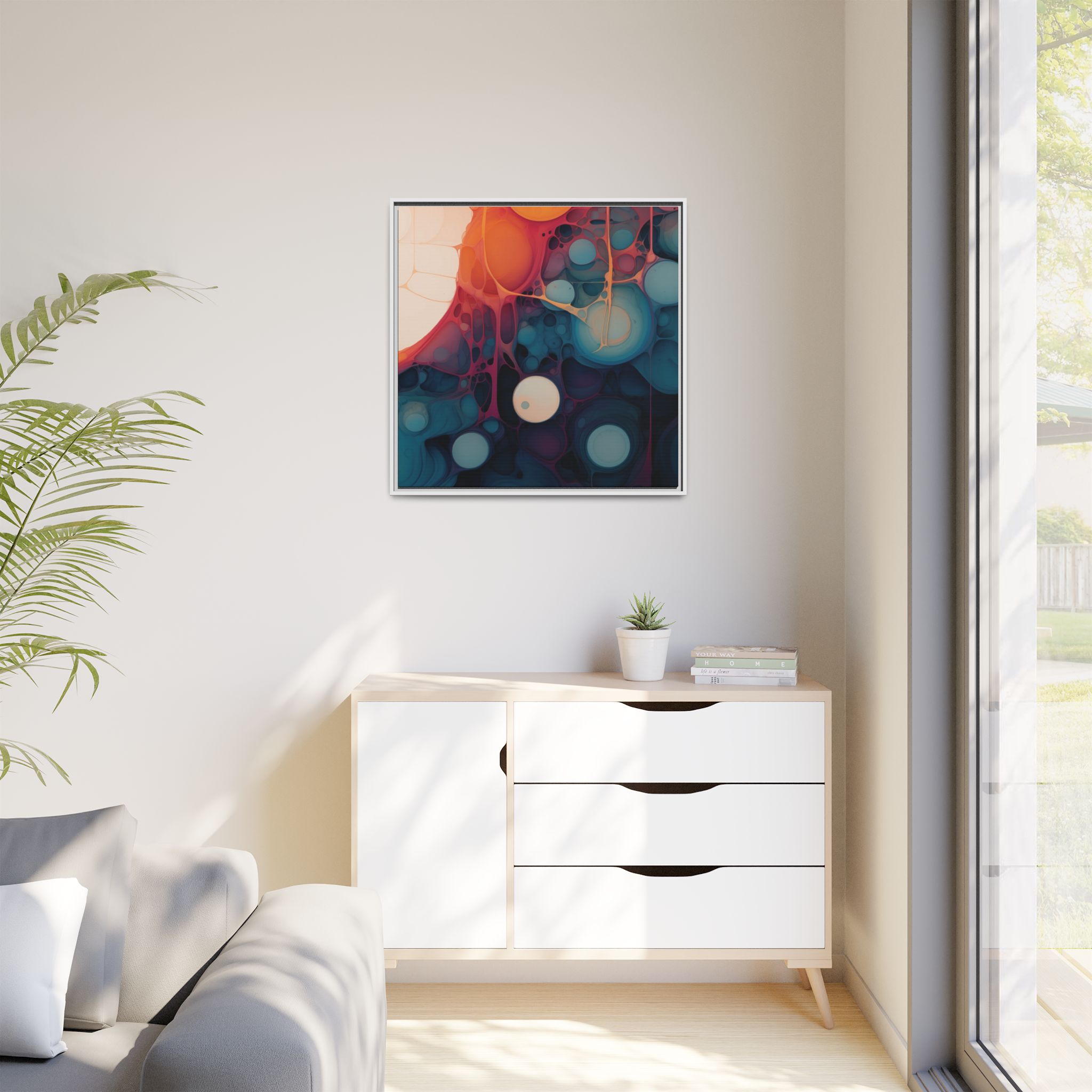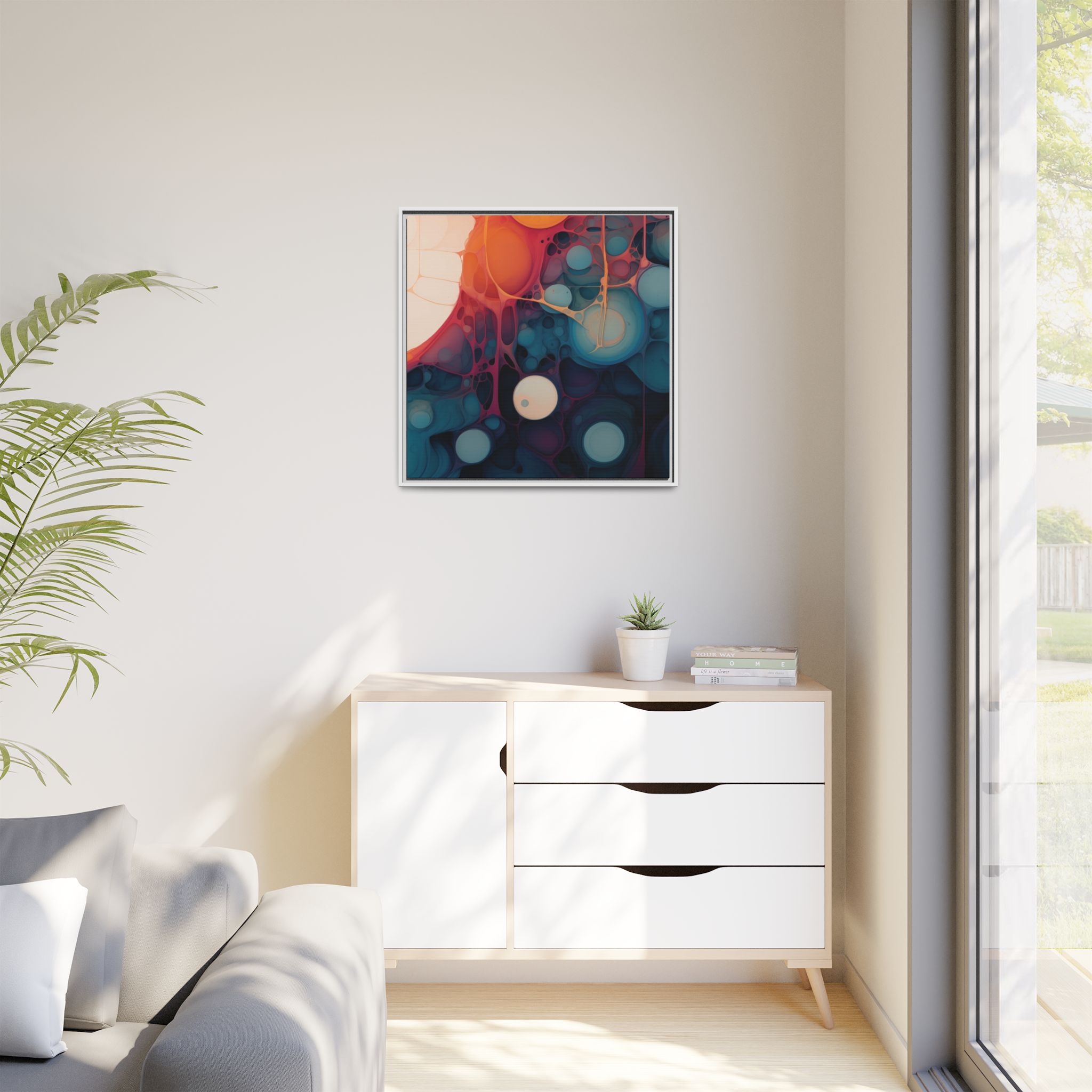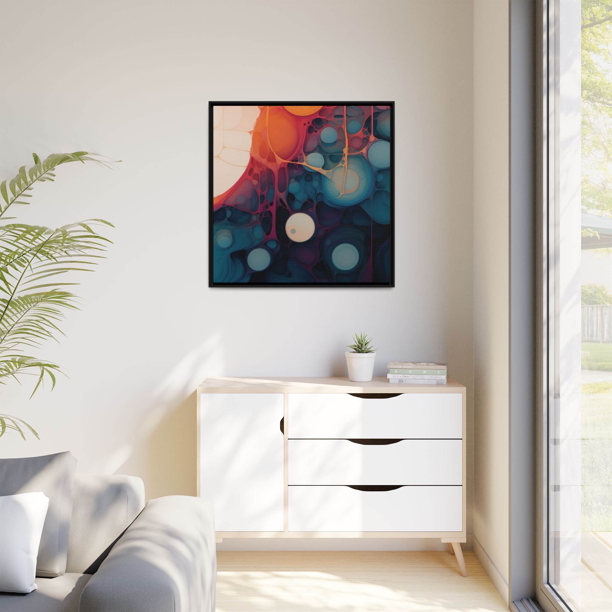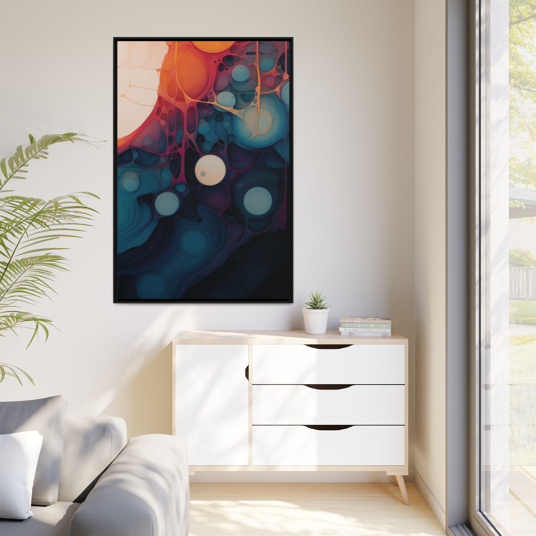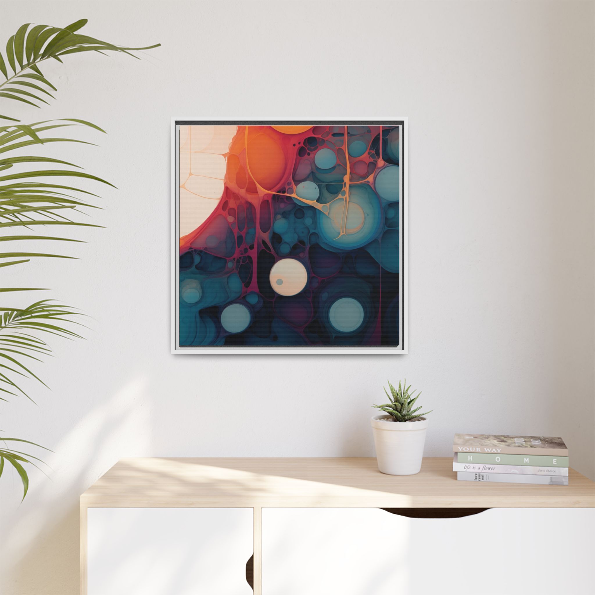 This canvas print features an abstract painting of an orange, blue, and teal gradient with large bubbles on a white background, giving off a modern and artistic vibe. Perfect for art enthusiasts or individuals looking to add a pop of color to their space, this canvas print is ideal for home decor, gifting, or special occasions like birthdays or housewarmings.
