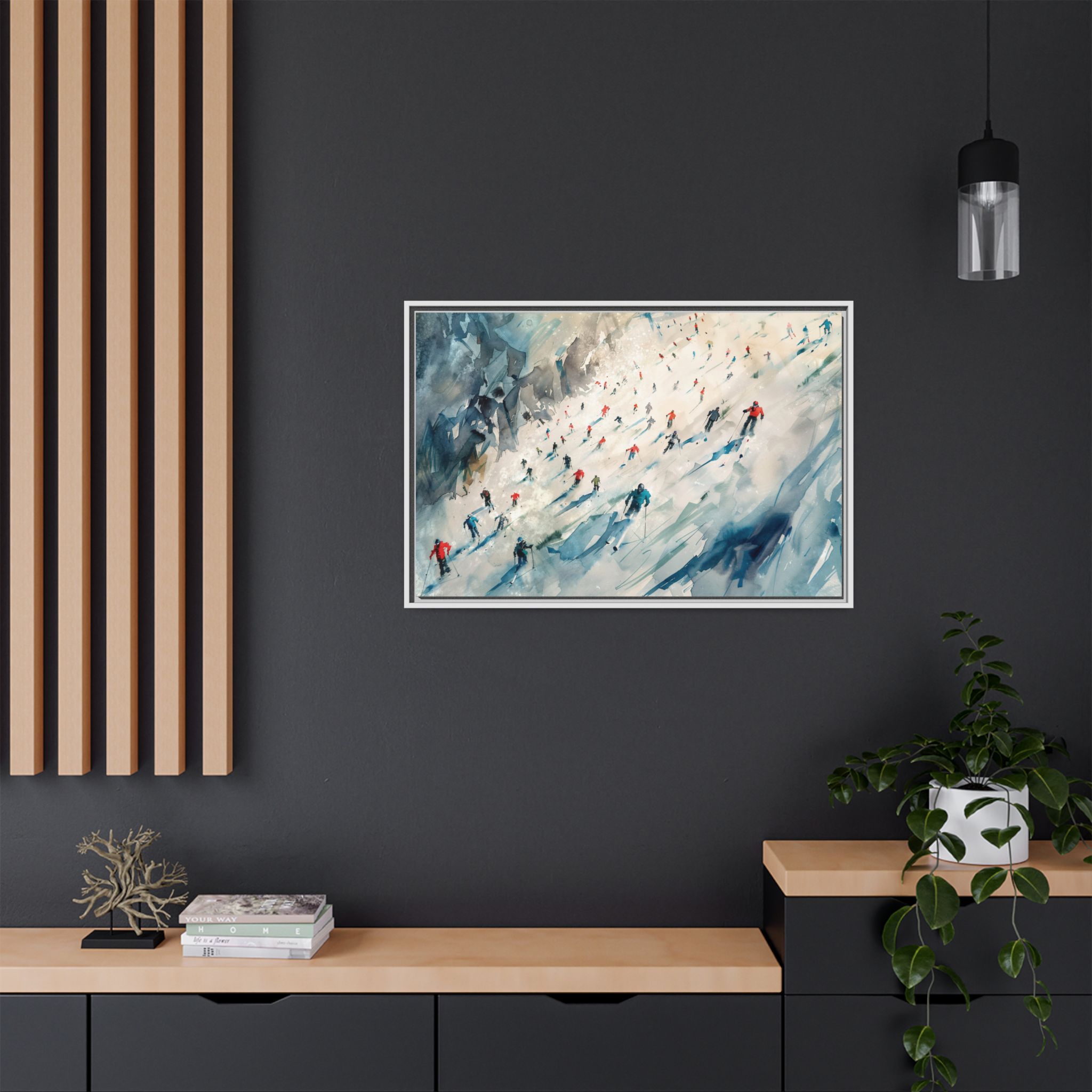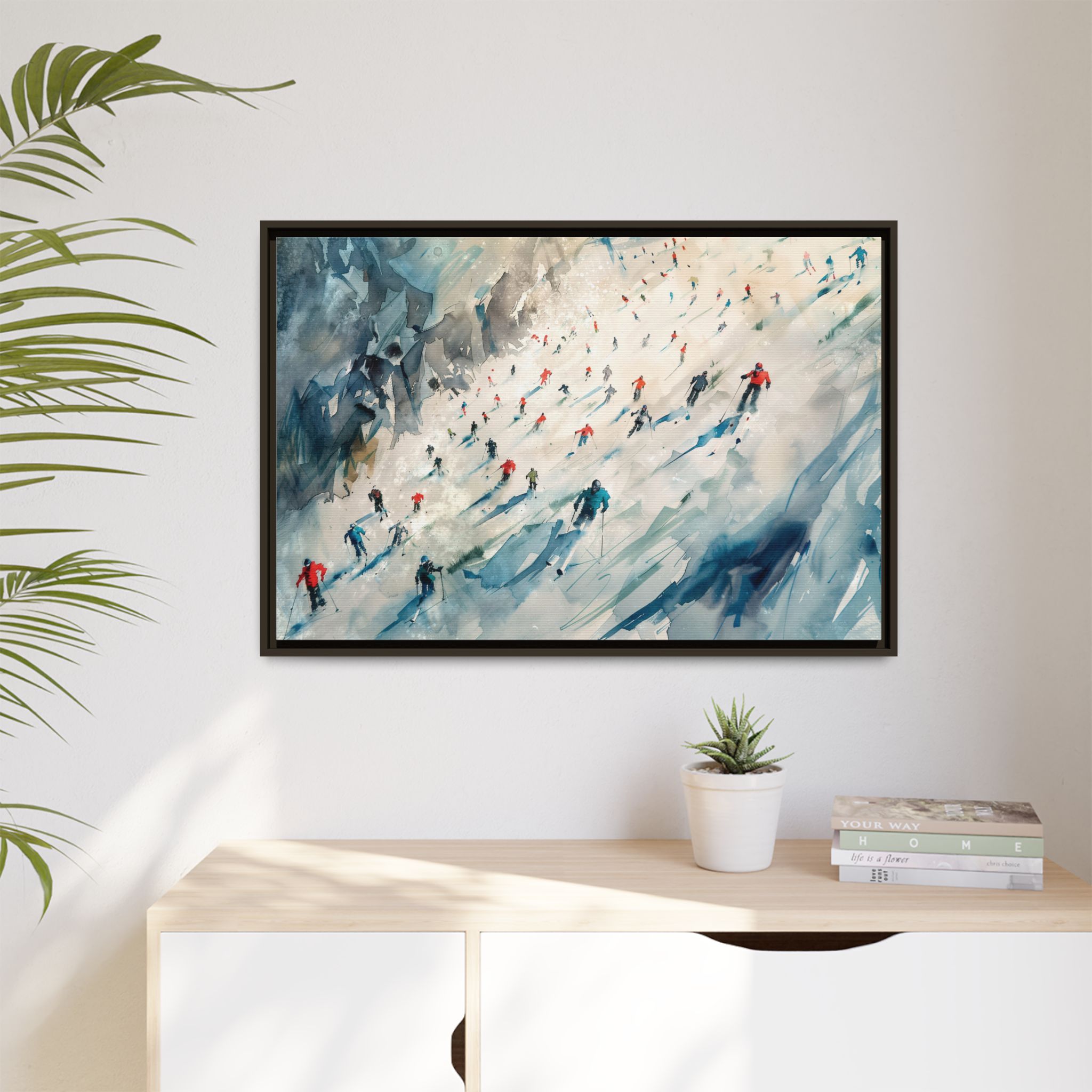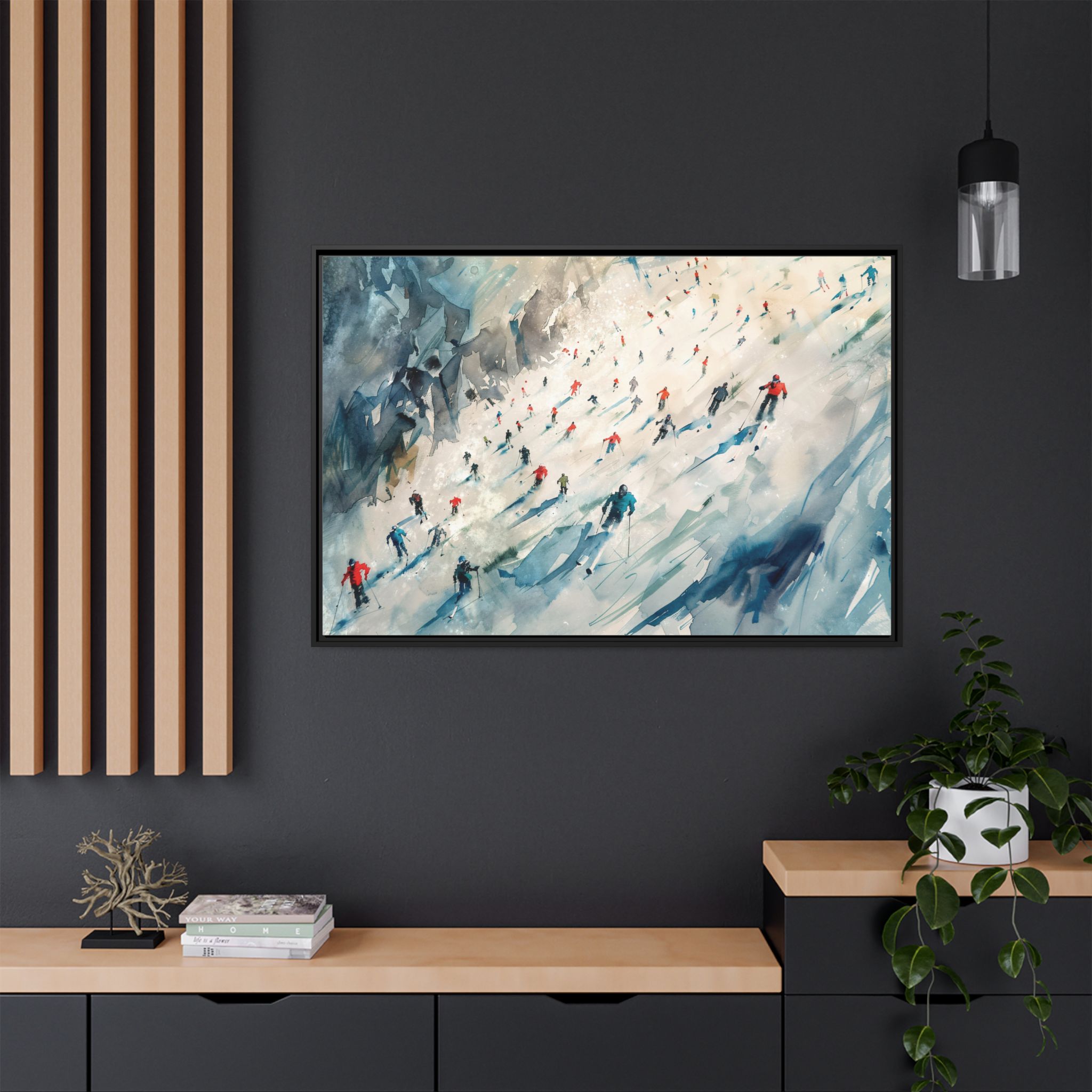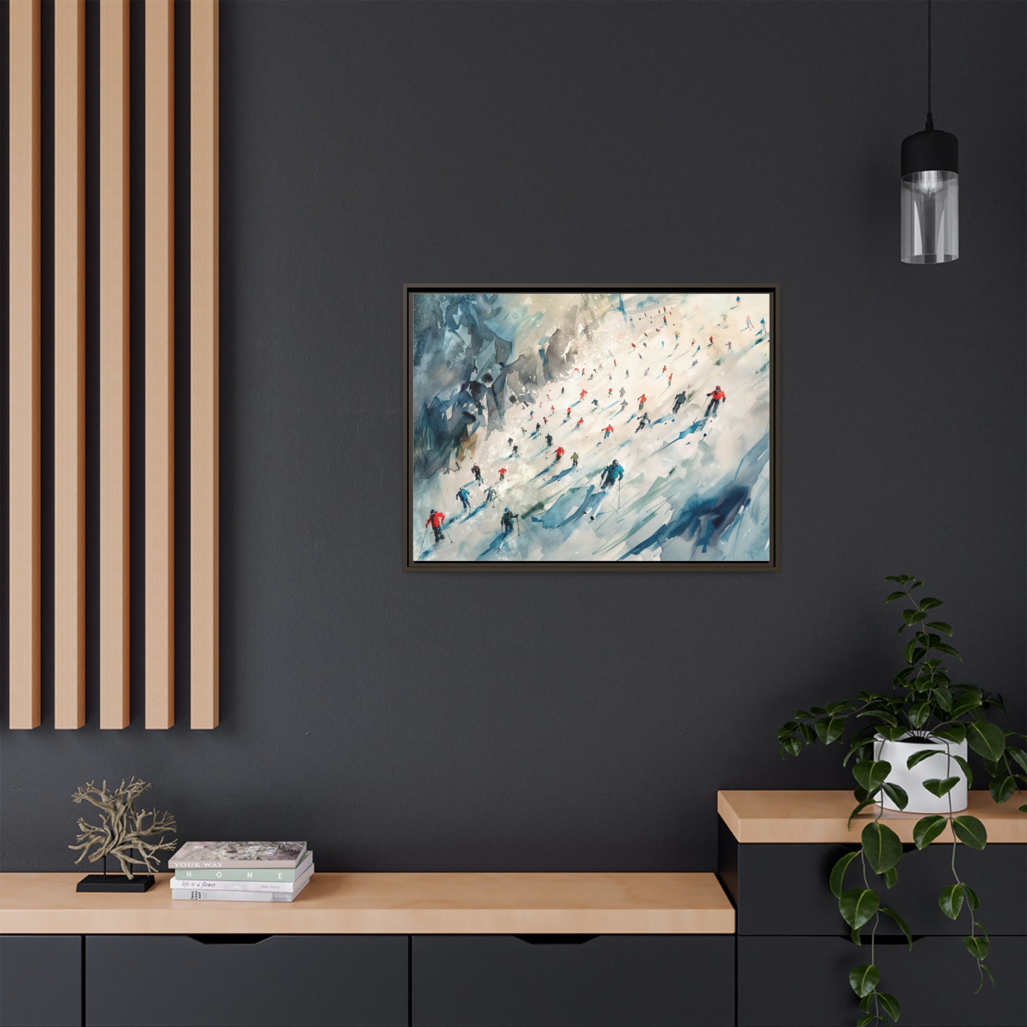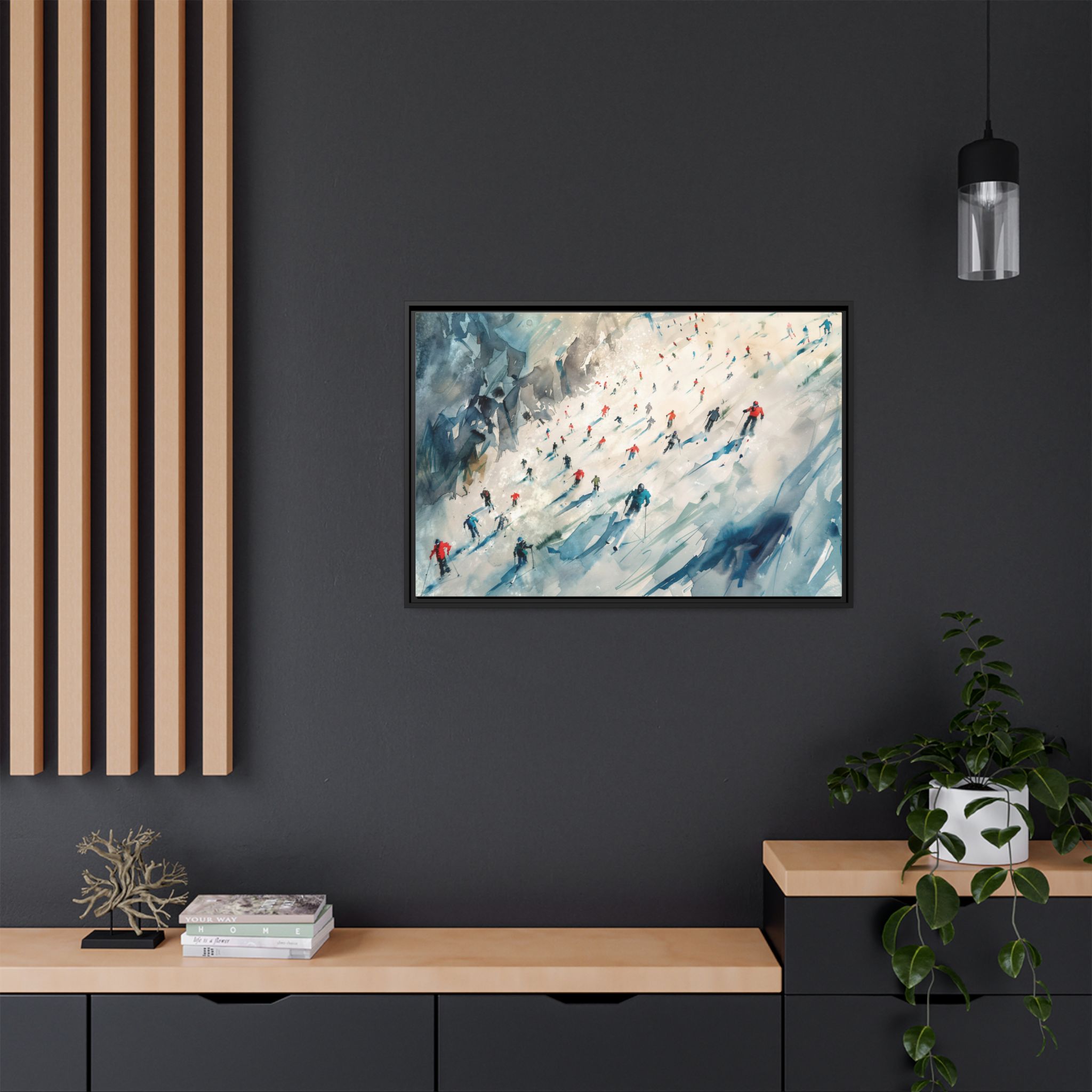 Custom digitally printed artwork on a quality canvas. .Every print in a black pinewood frame will look sleek and beautiful in any interior. The artwork will be printed on the cotton-polyester canvas with a special proprietary coating to make sure it stays vibrant for ages. Environmentally-conscious – it’s made from sustainably sourced materials (Forest Stewardship Council certified) and custom printed on demand no warehouse stocks and no waste. Choose between the designer specified sizes. The sawtooth hanging hardware is already attached.