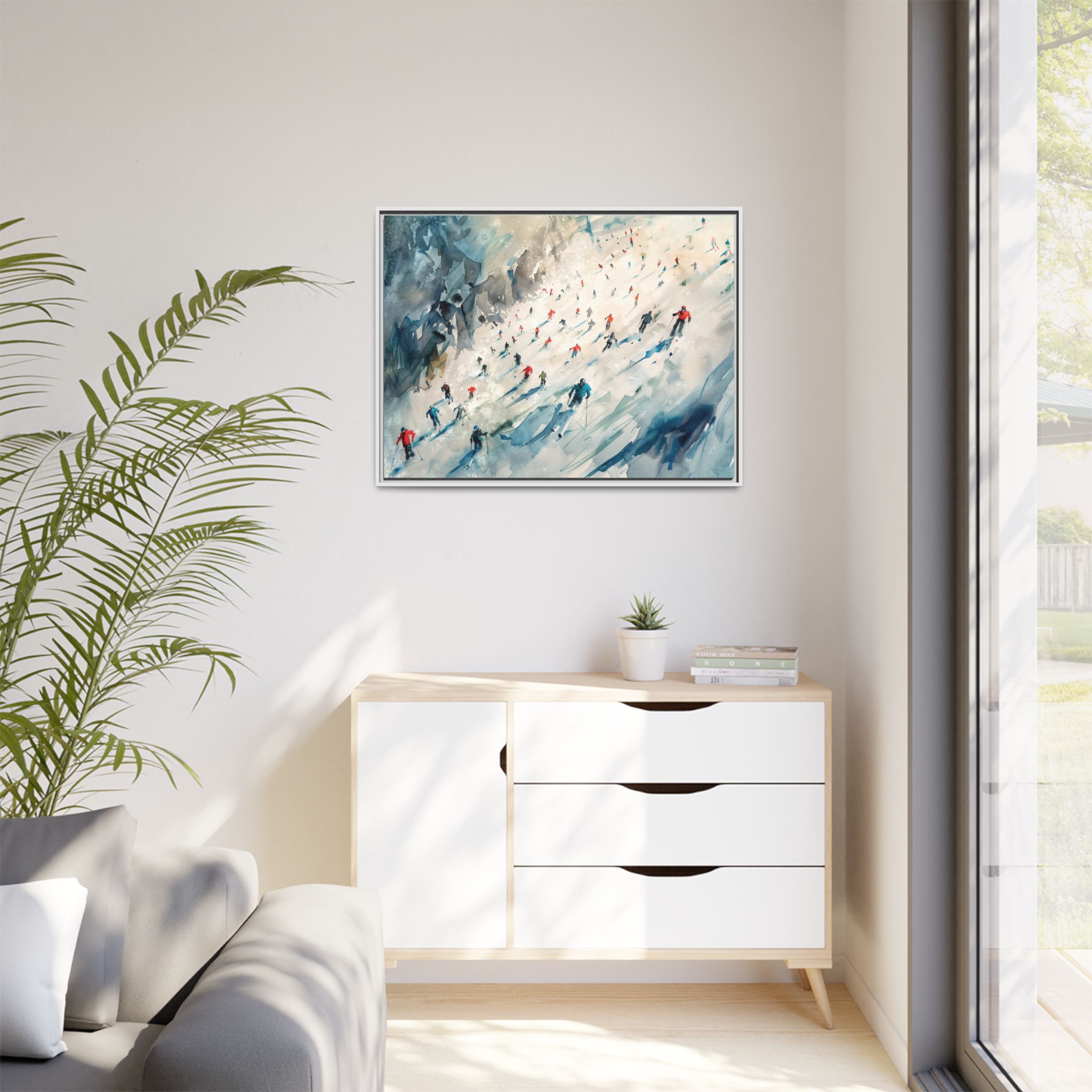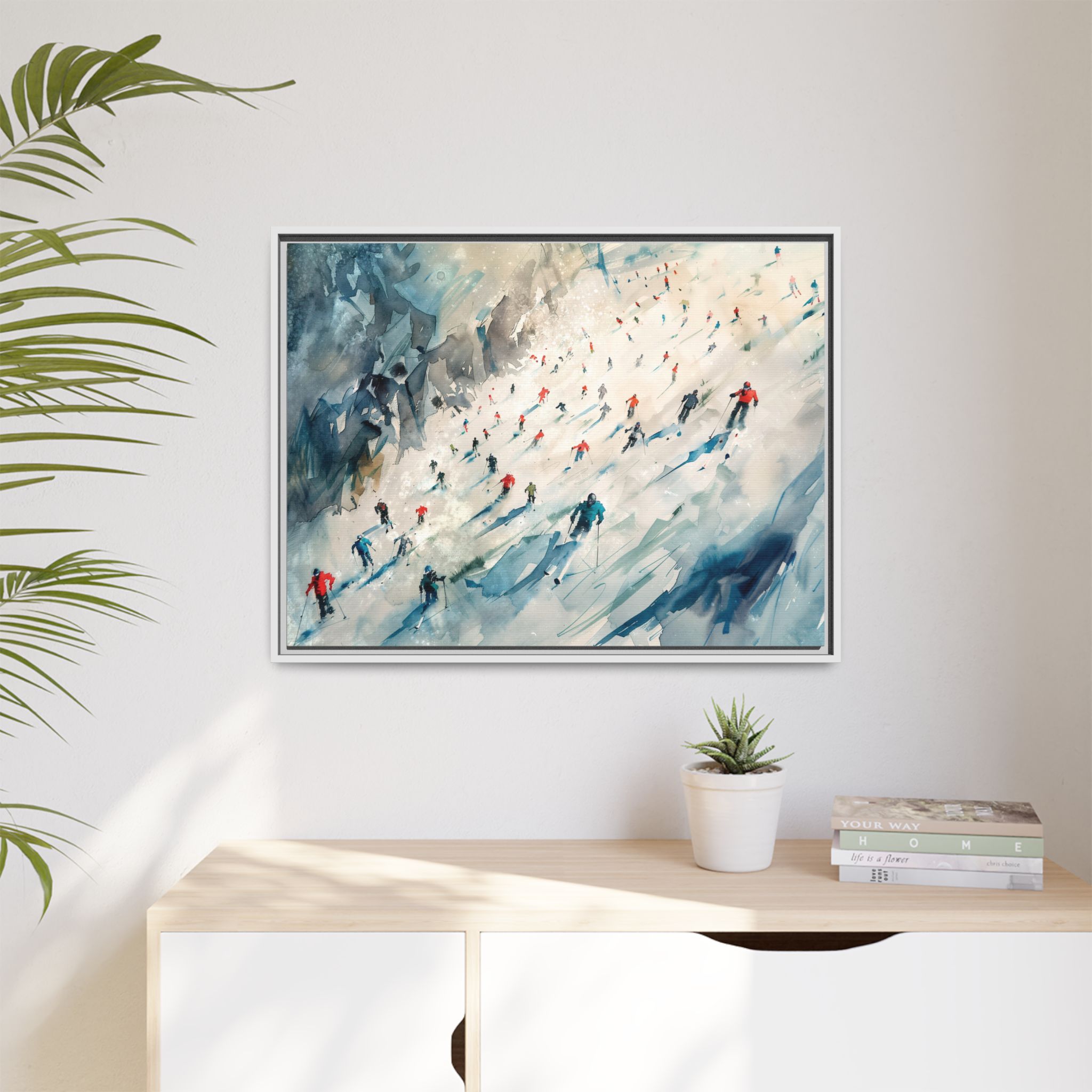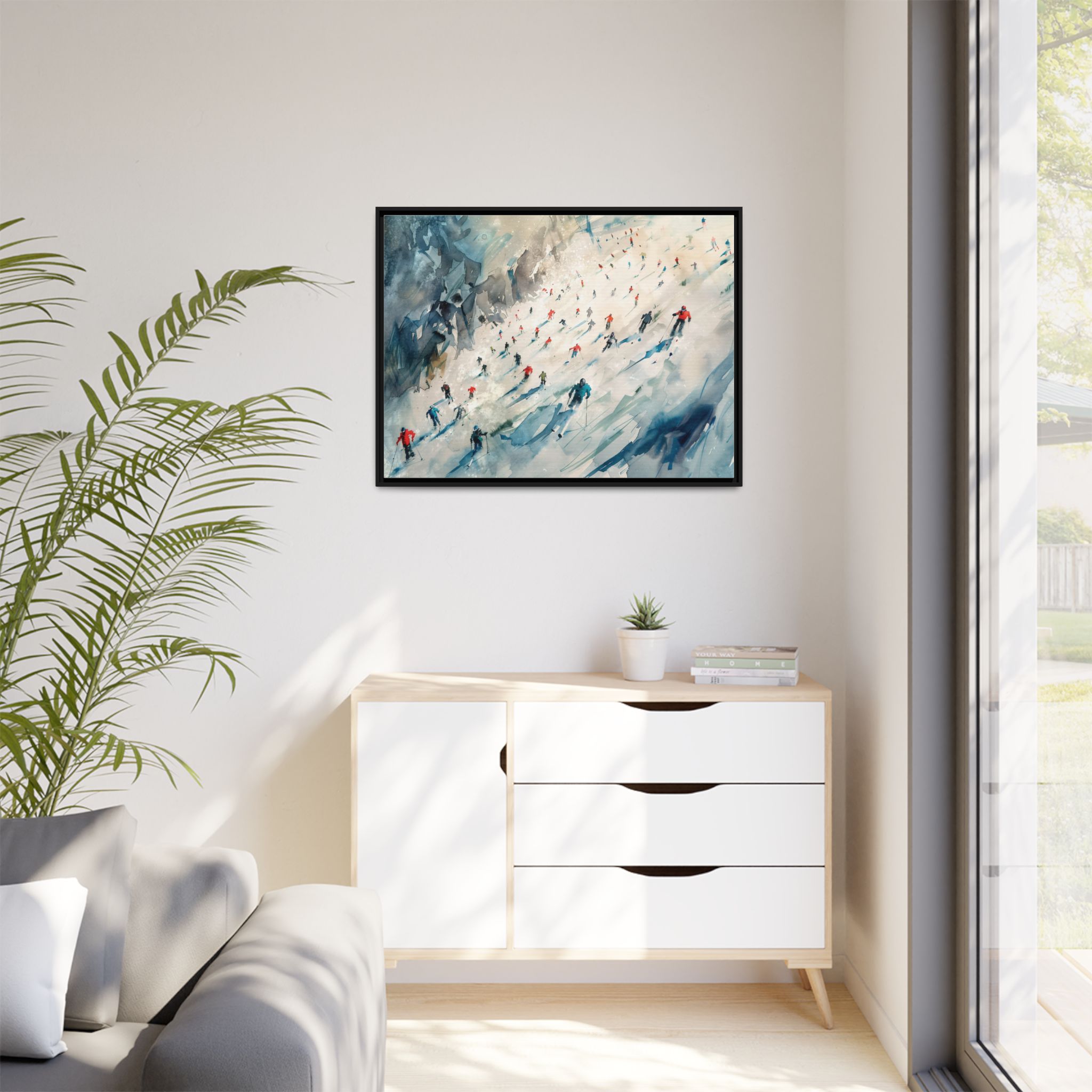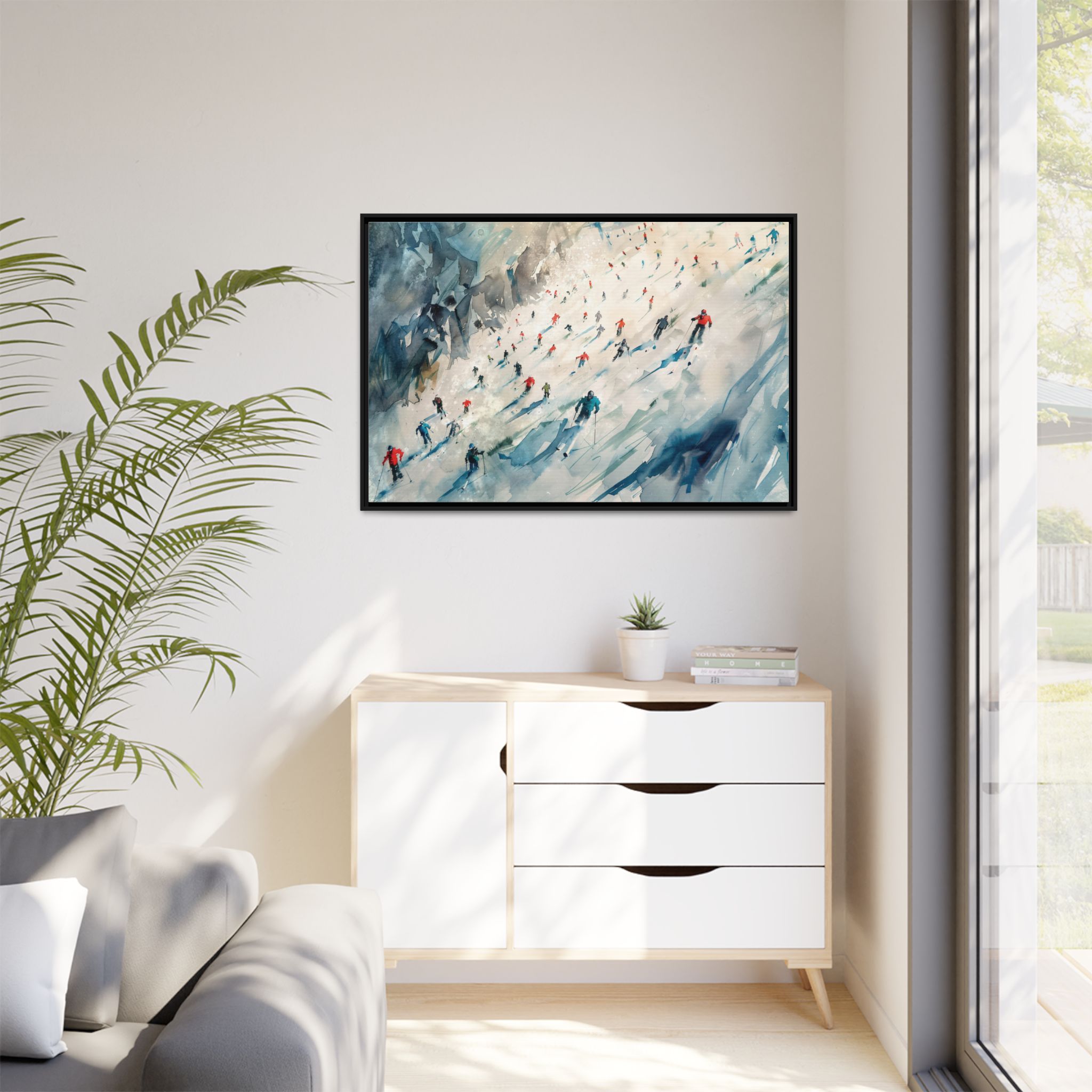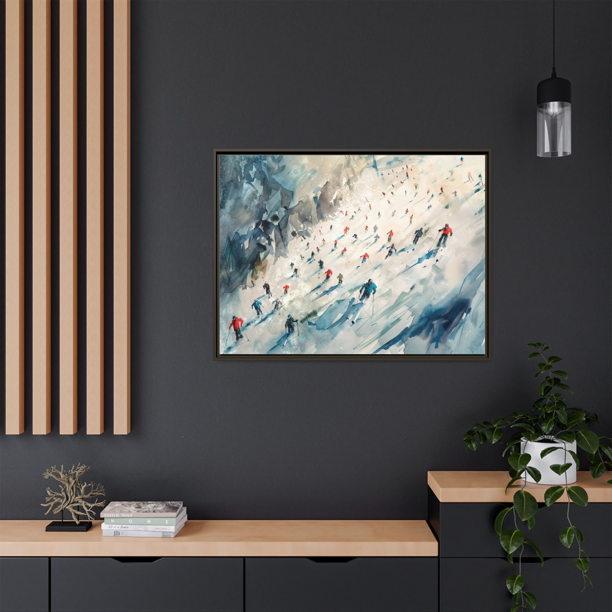 Custom digitally printed artwork on a quality canvas. .Every print in a black pinewood frame will look sleek and beautiful in any interior. The artwork will be printed on the cotton-polyester canvas with a special proprietary coating to make sure it stays vibrant for ages. Environmentally-conscious – it’s made from sustainably sourced materials (Forest Stewardship Council certified) and custom printed on demand no warehouse stocks and no waste. Choose between the designer specified sizes. The sawtooth hanging hardware is already attached.