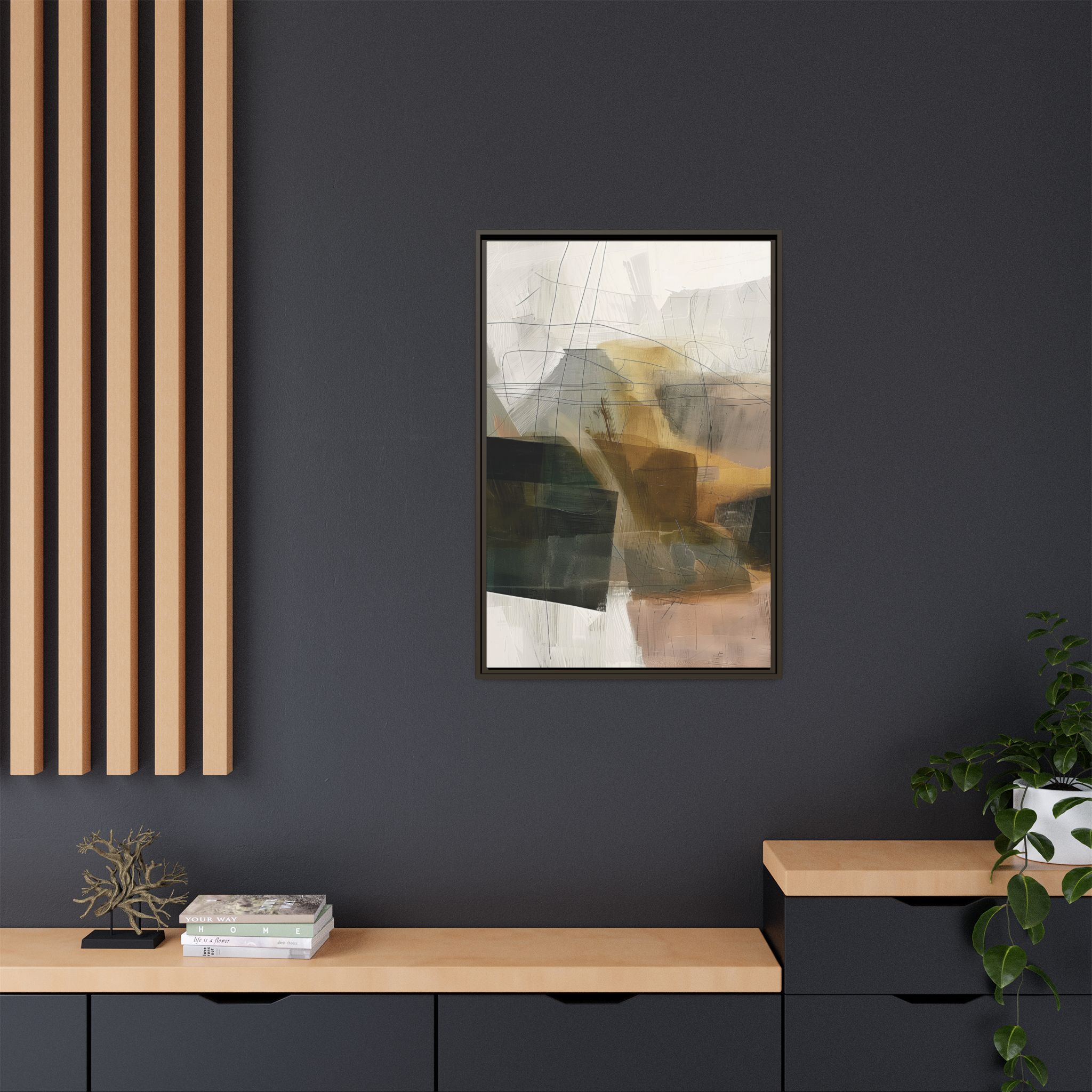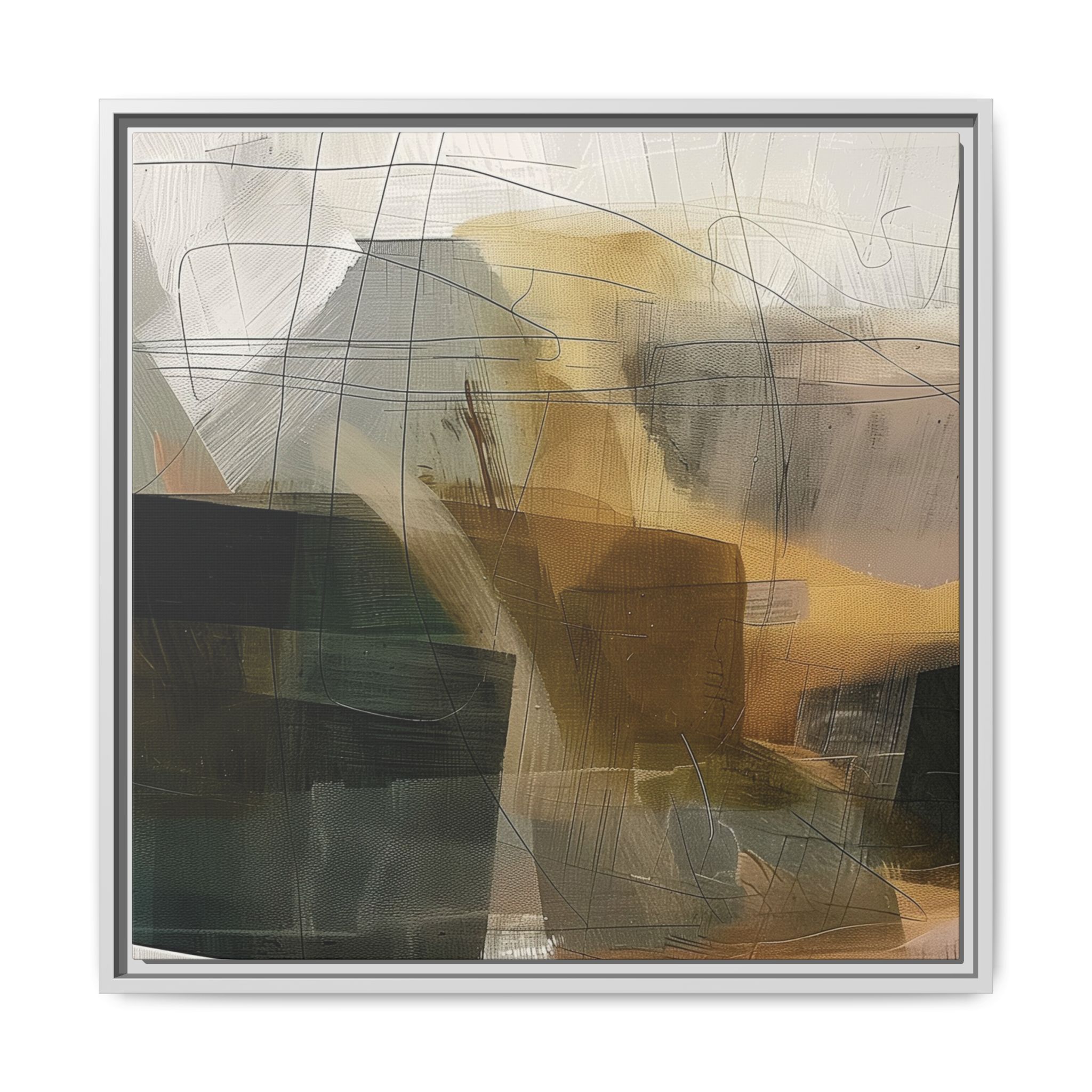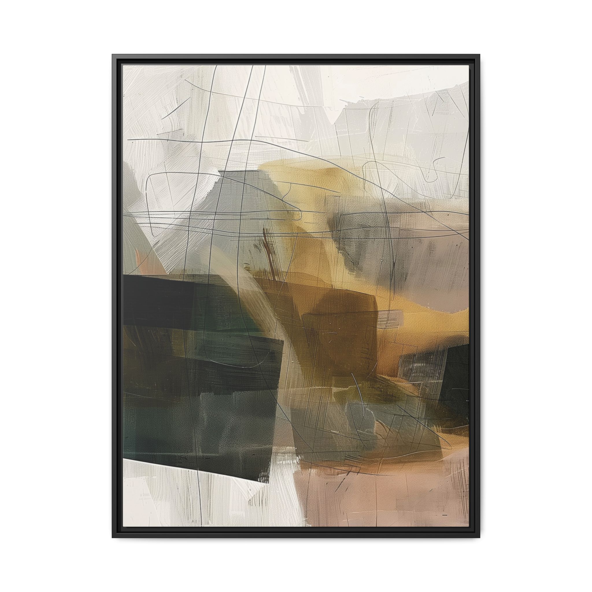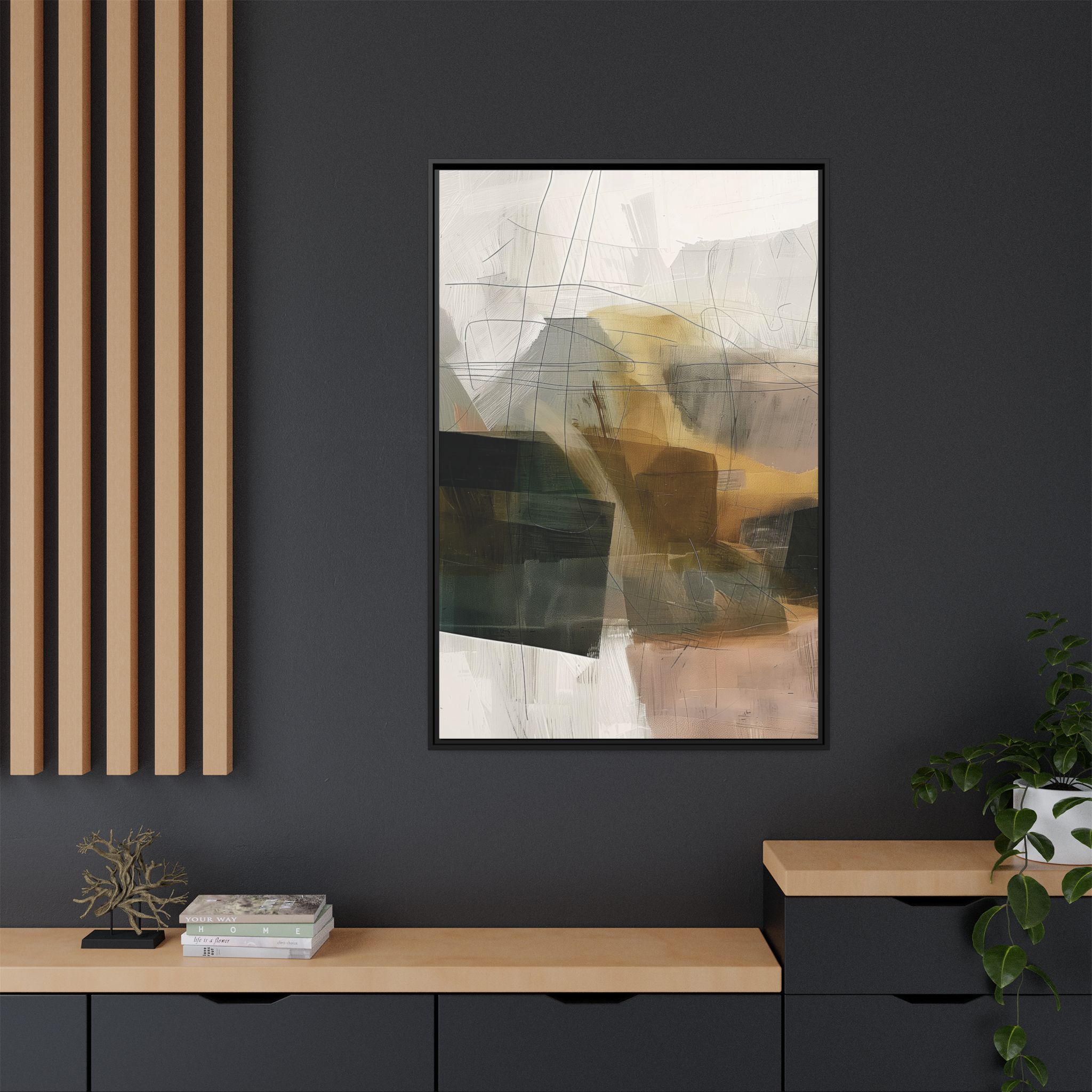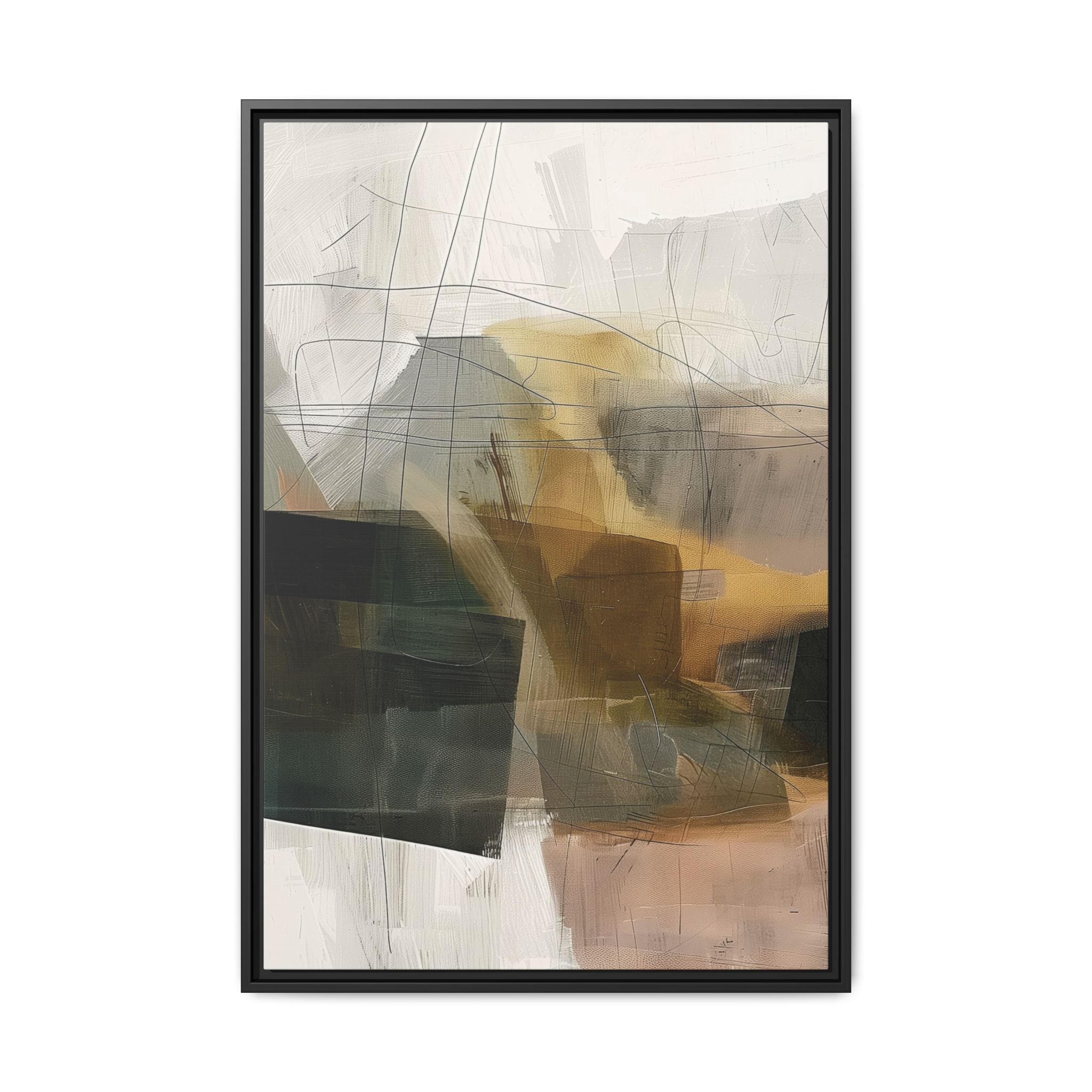 A modern art canvas featuring an abstract composition of shapes and lines, with a soft color palette inspired by nature. This minimalist design with a fresh multilayer feel is perfect for designers looking to add a touch of elegance to their space. The artwork can be rotated and presented in portrait and landscape direction to adapt to your design project. Ideal for home decoration, offices, and as a unique home design gifts.