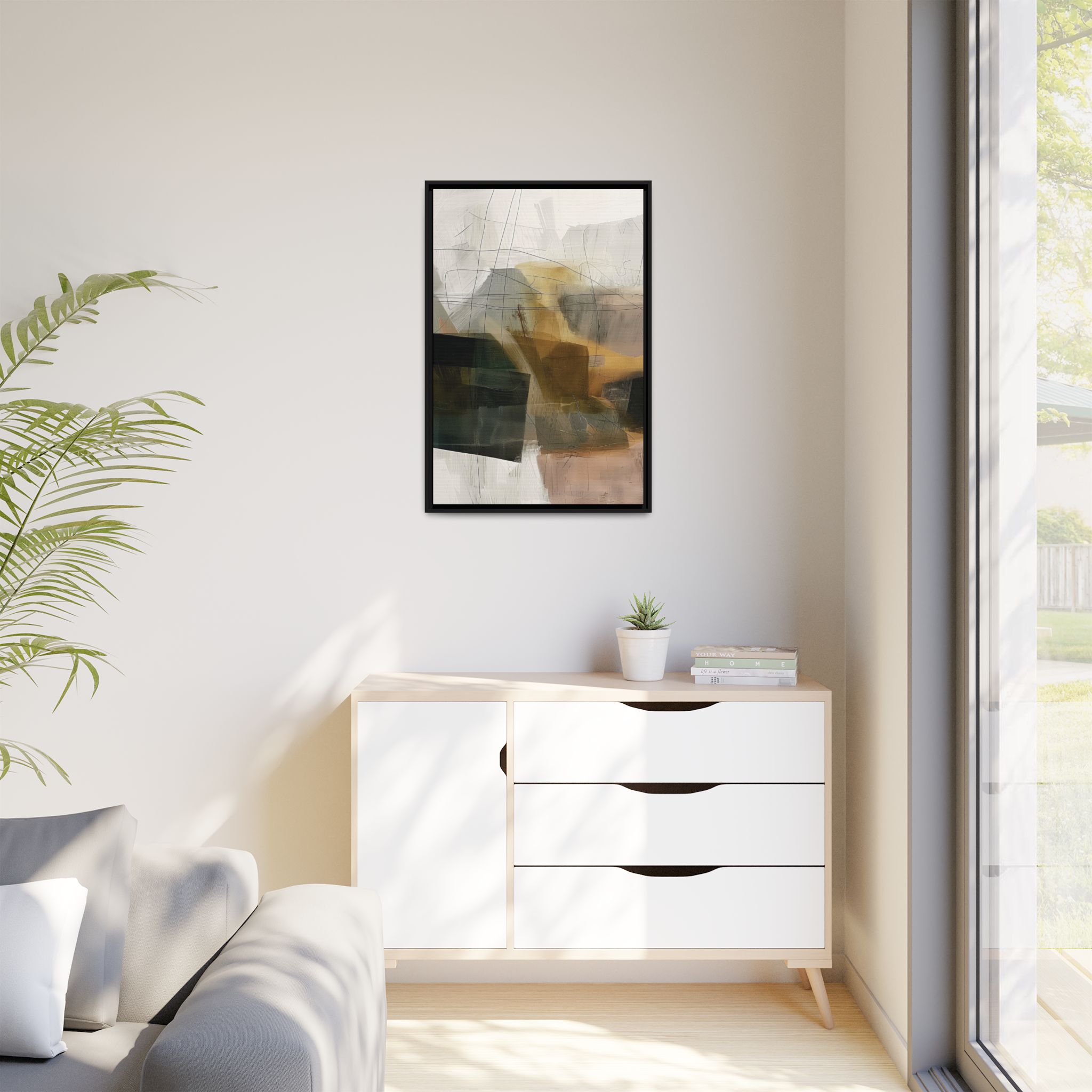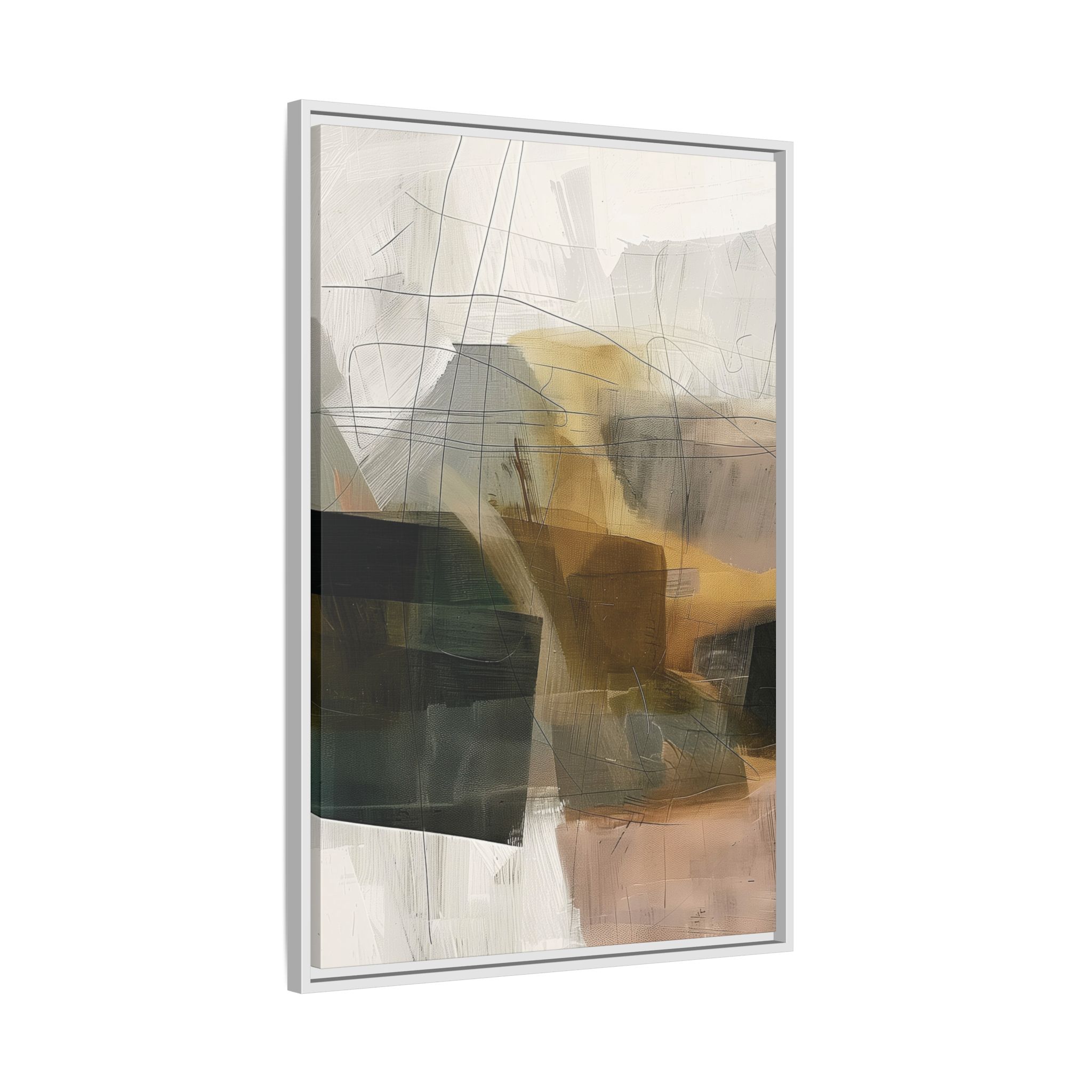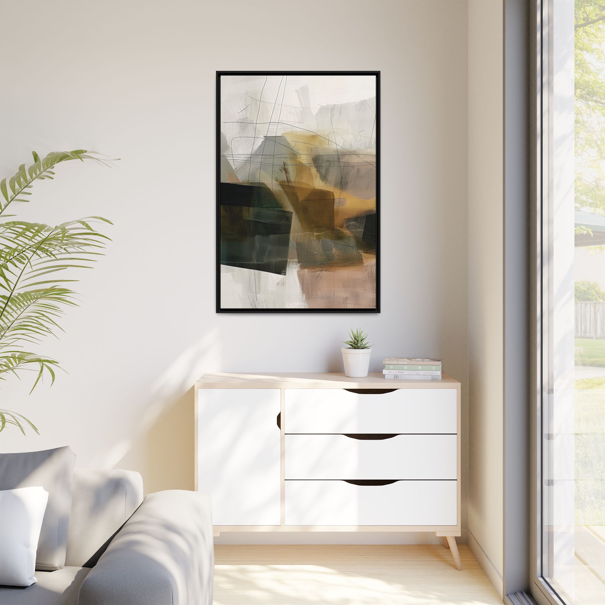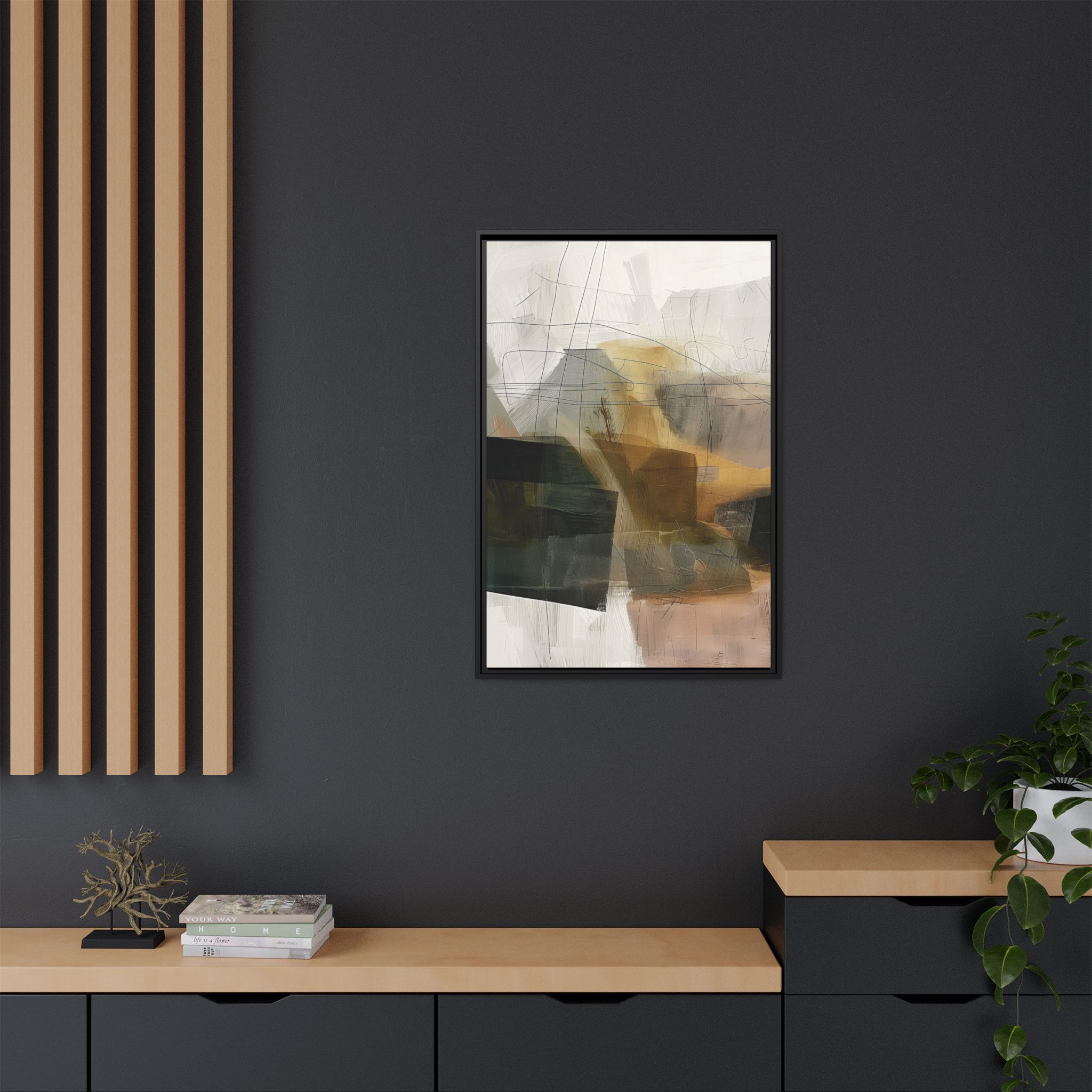 A modern art canvas featuring an abstract composition of shapes and lines, with a soft color palette inspired by nature. This minimalist design with a fresh multilayer feel is perfect for designers looking to add a touch of elegance to their space. The artwork can be rotated and presented in portrait and landscape direction to adapt to your design project. Ideal for home decoration, offices, and as a unique home design gifts.