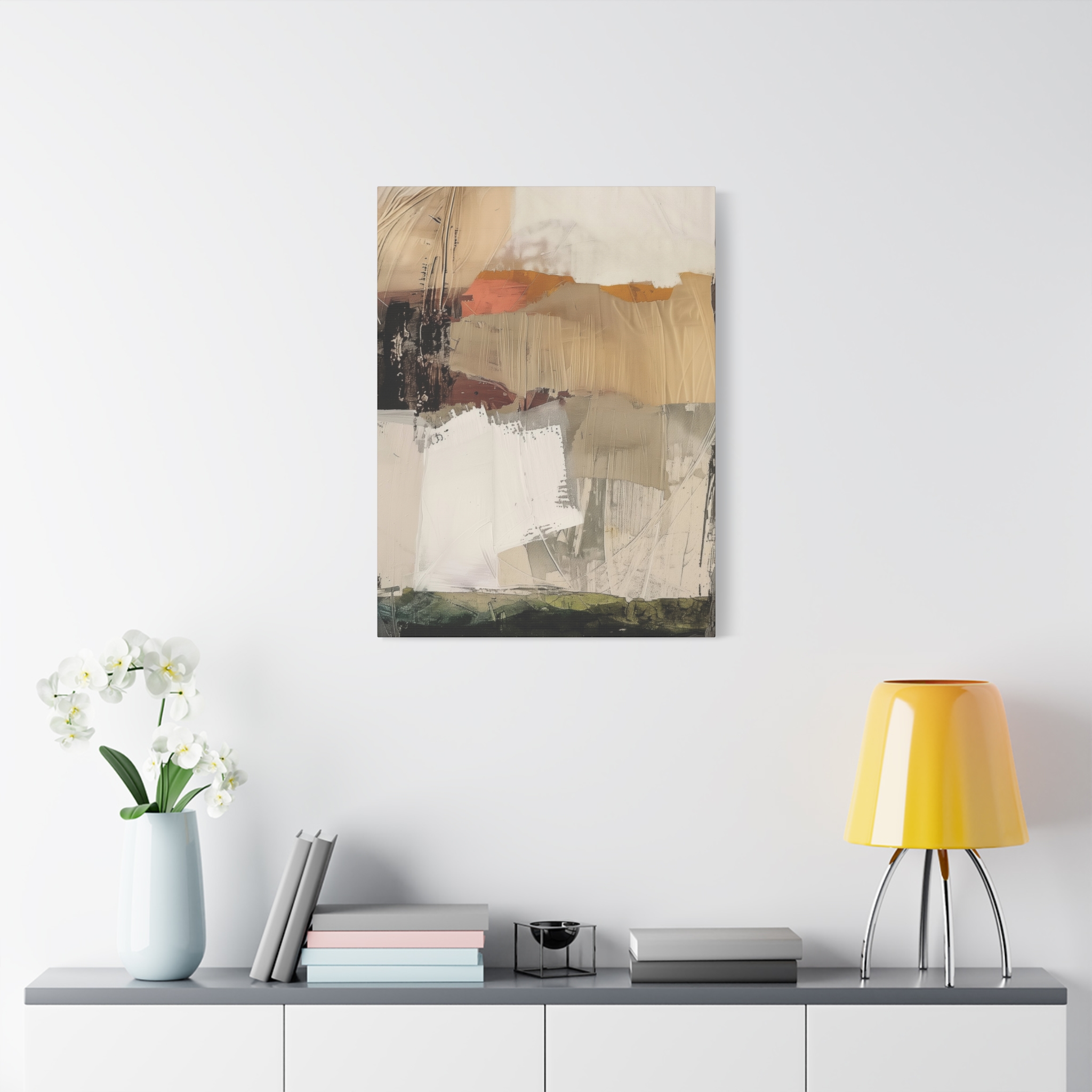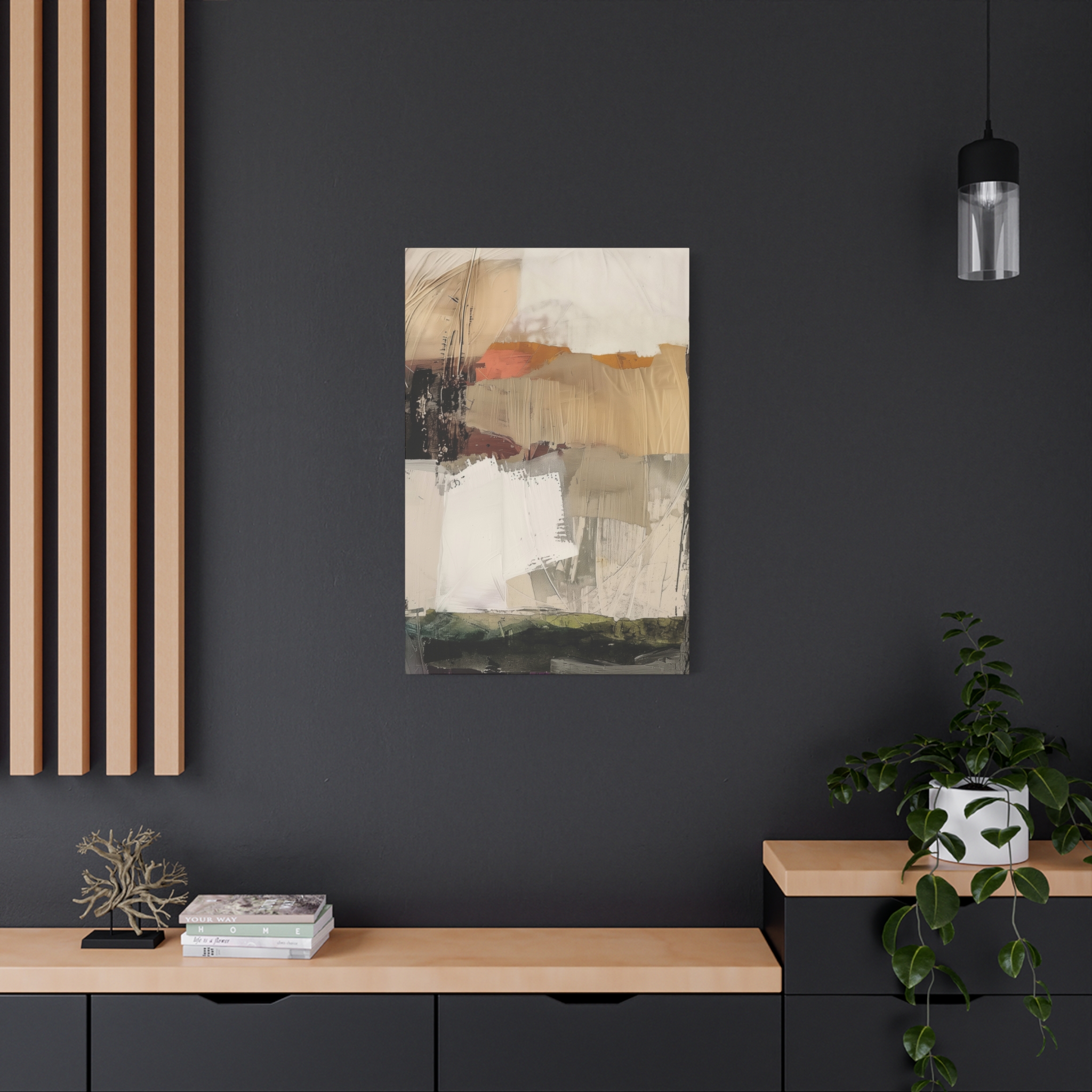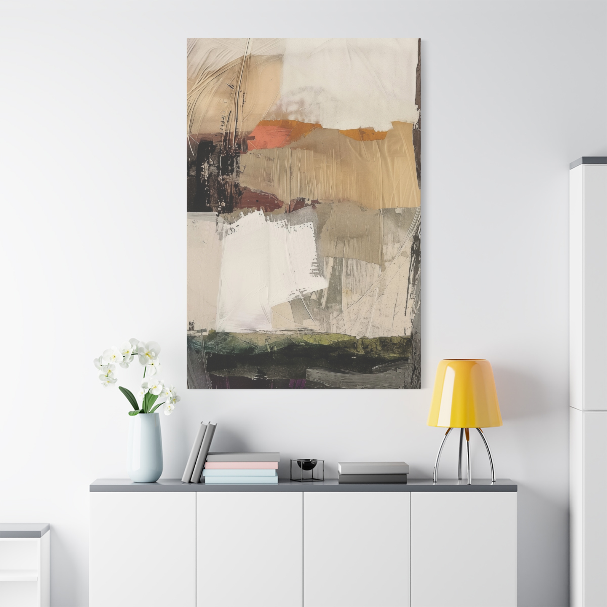 A modern art canvas featuring an abstract composition of shapes and lines, with a soft color palette inspired by nature. This minimalist design with a fresh multilayer feel is perfect for designers looking to add a touch of elegance to their space. The artwork can be rotated and presented in portrait and landscape direction to adapt to your design project. Ideal for home decoration, offices, and as a unique home design gifts.